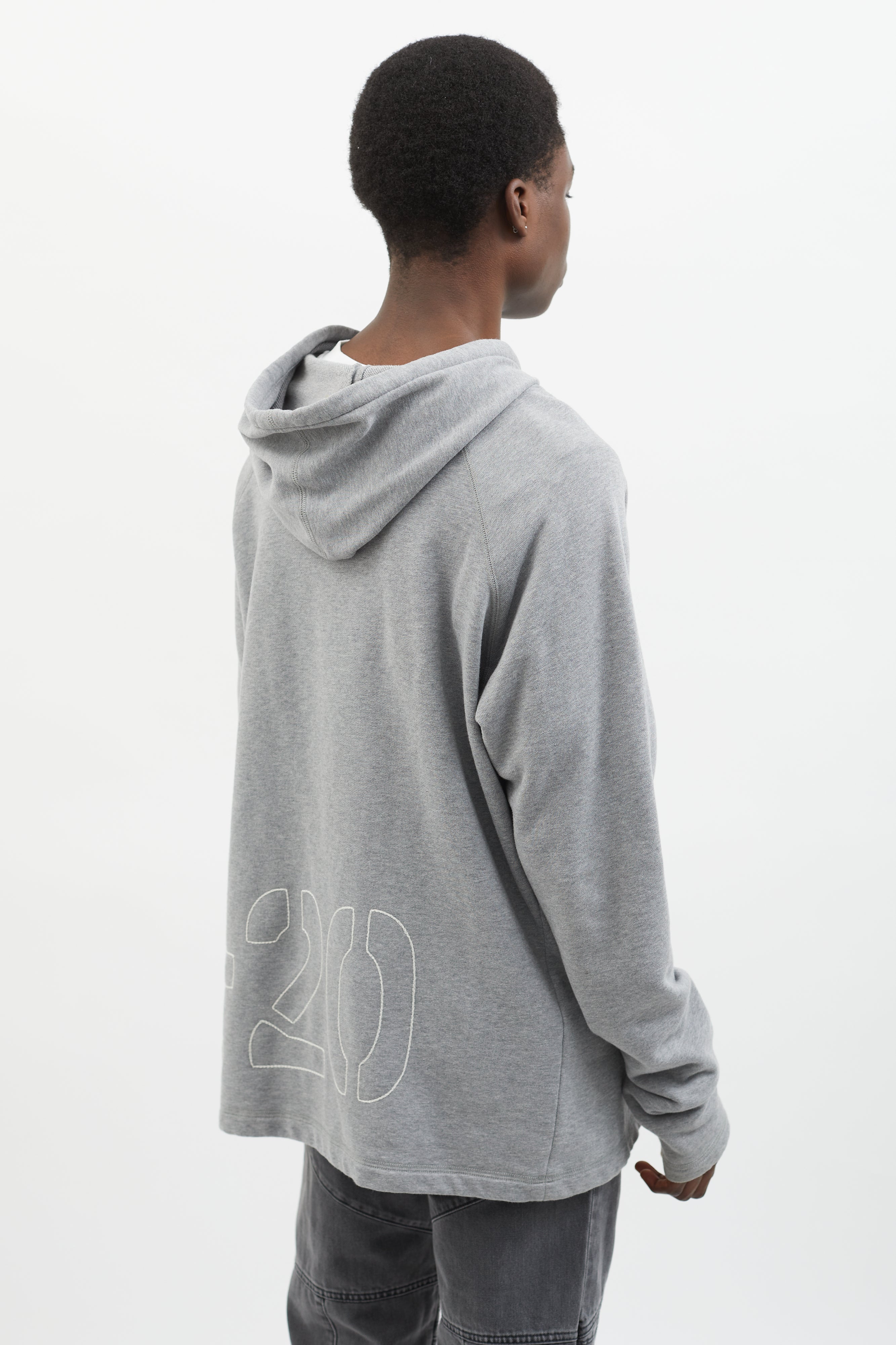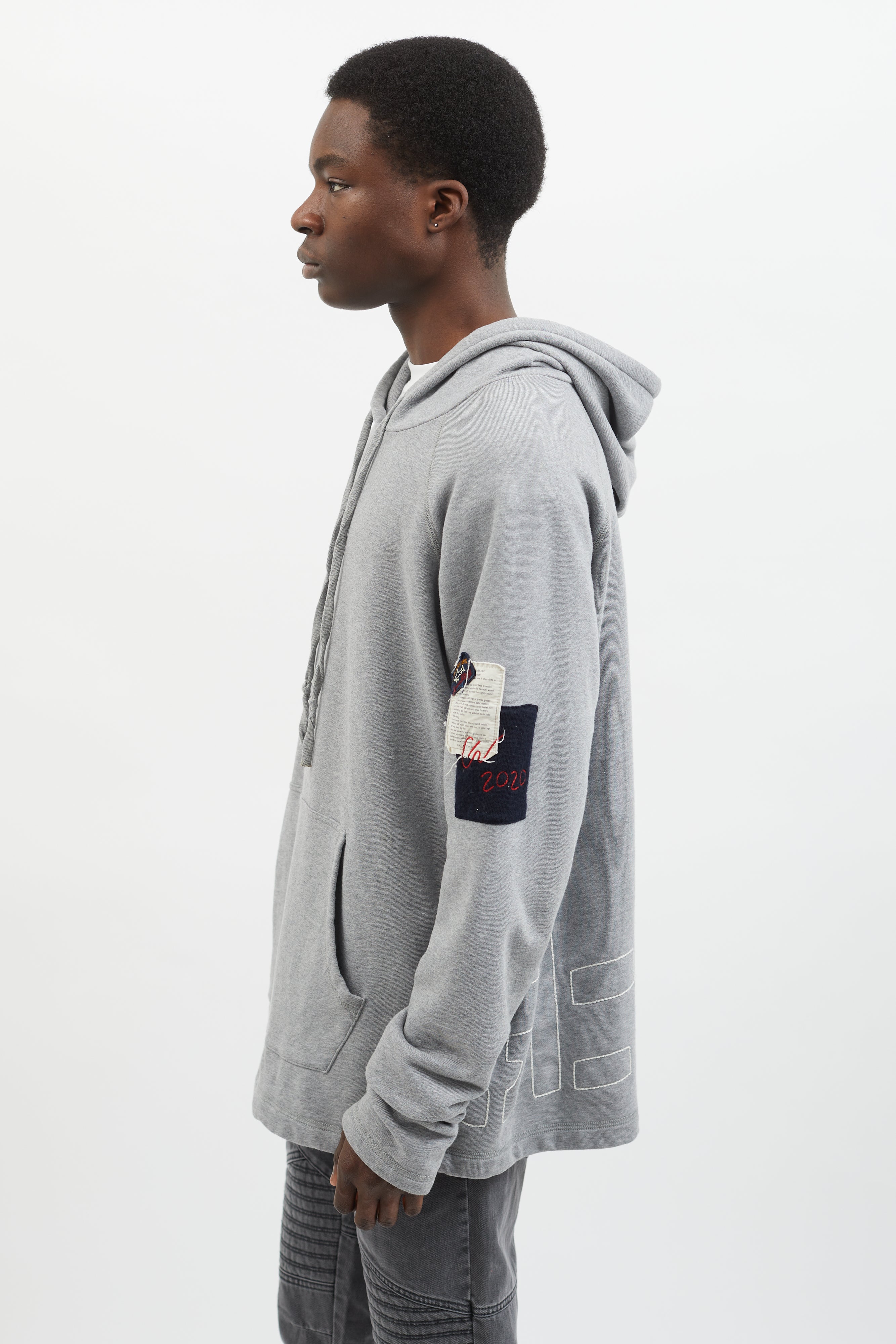 Pre-owned Greg Lauren x Paul Shark hoodie in grey featuring attached hood with drawstring fastener, kangaroo pocket, white embroidered lettering detail at back, and patch embroidery at sleeve.