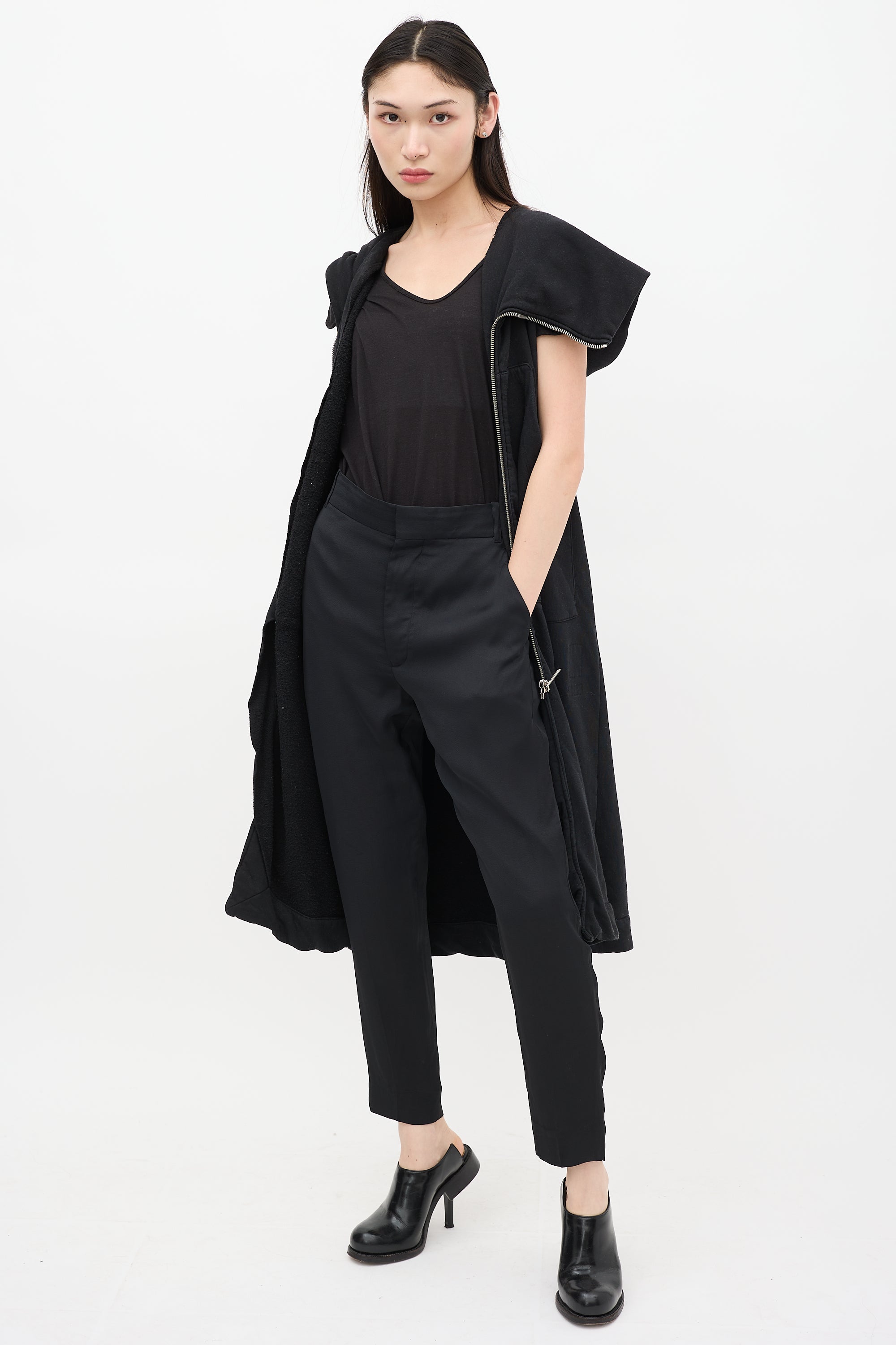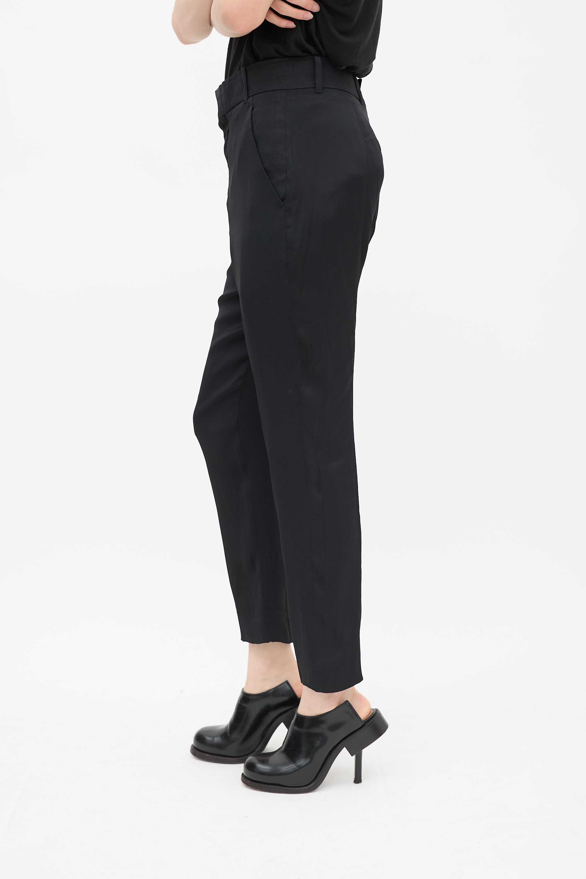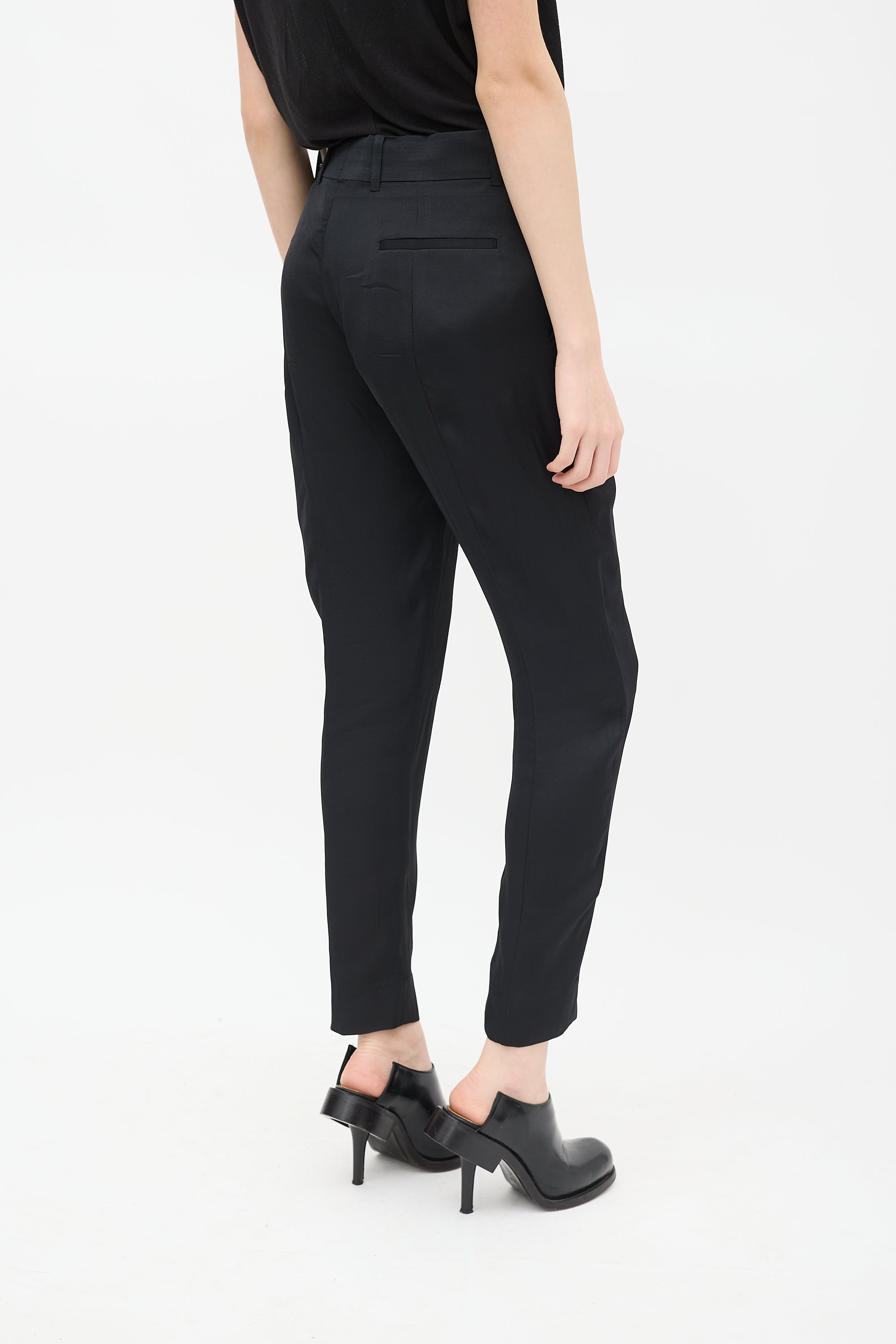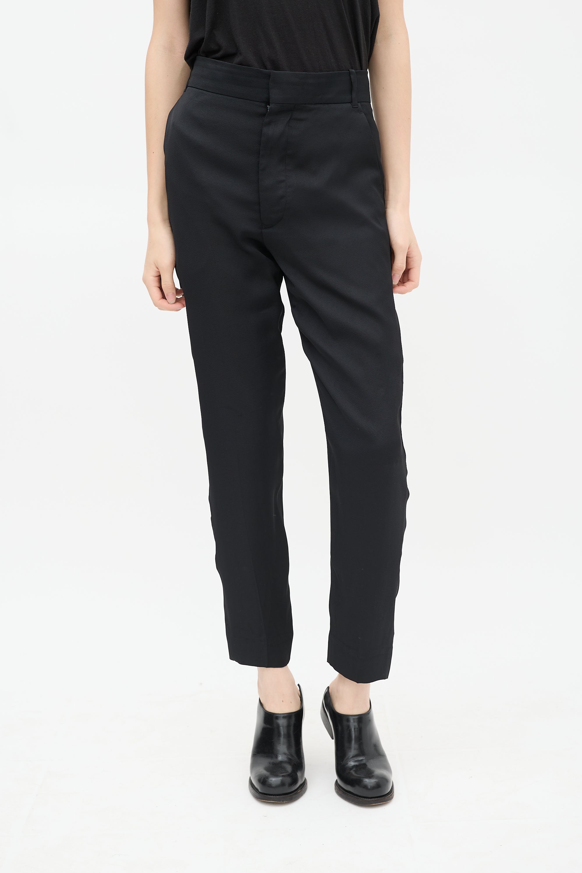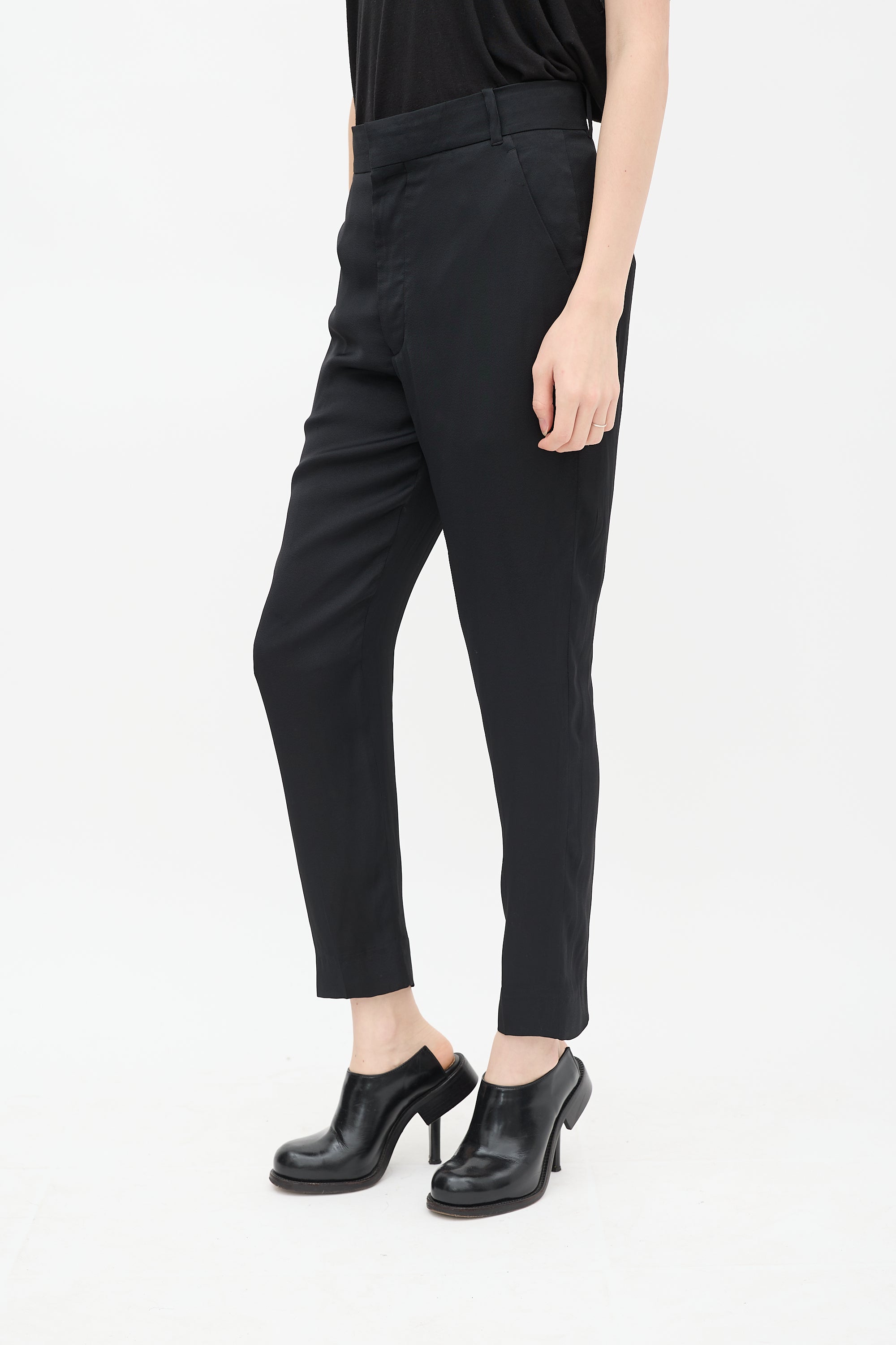Pre-owned Haider Ackermann black trousers featuring belt loops, two slip pockets at hips, one welt pocket at back, tapered leg, and zip fly with hook and eye closure. Clipped to fit model.