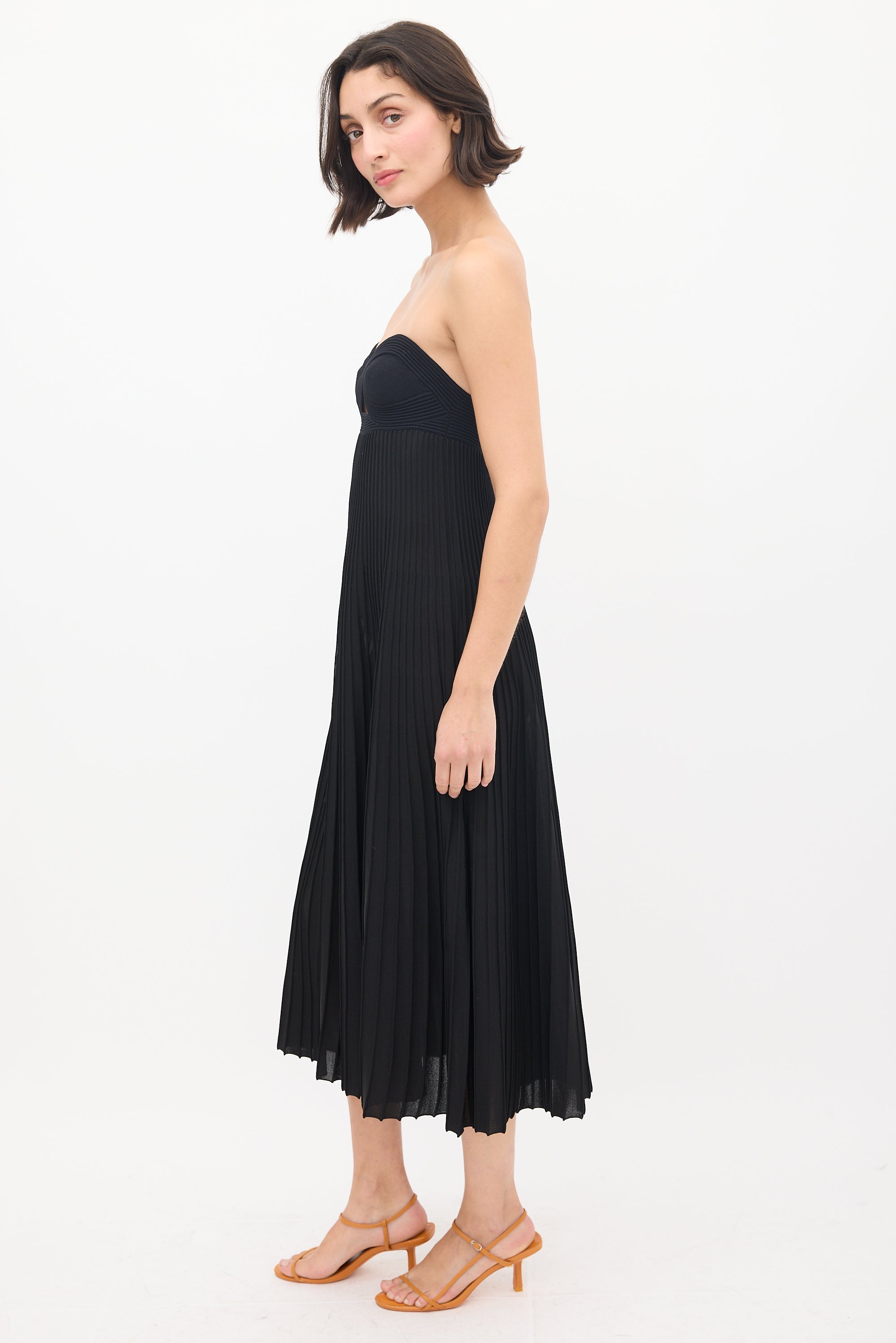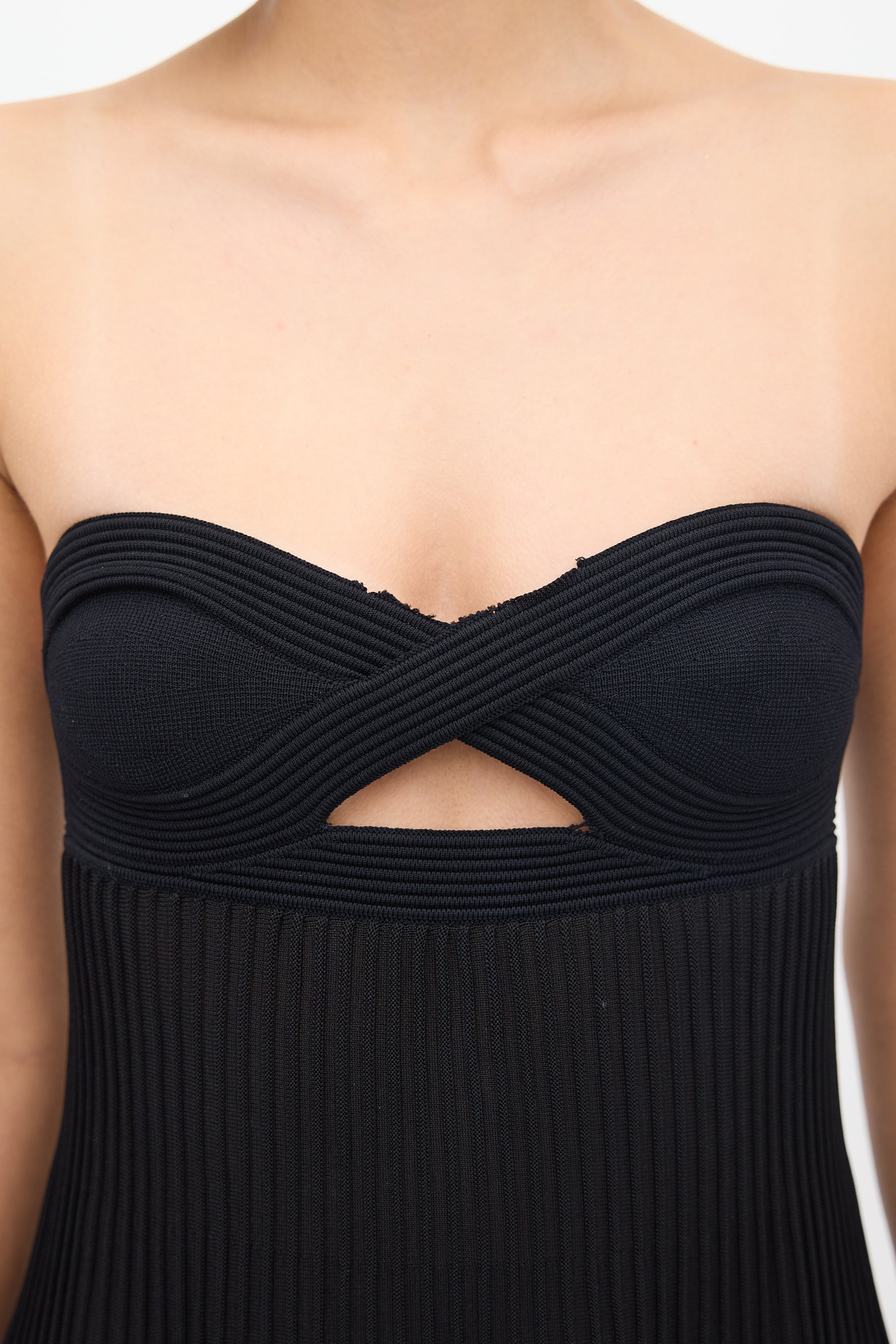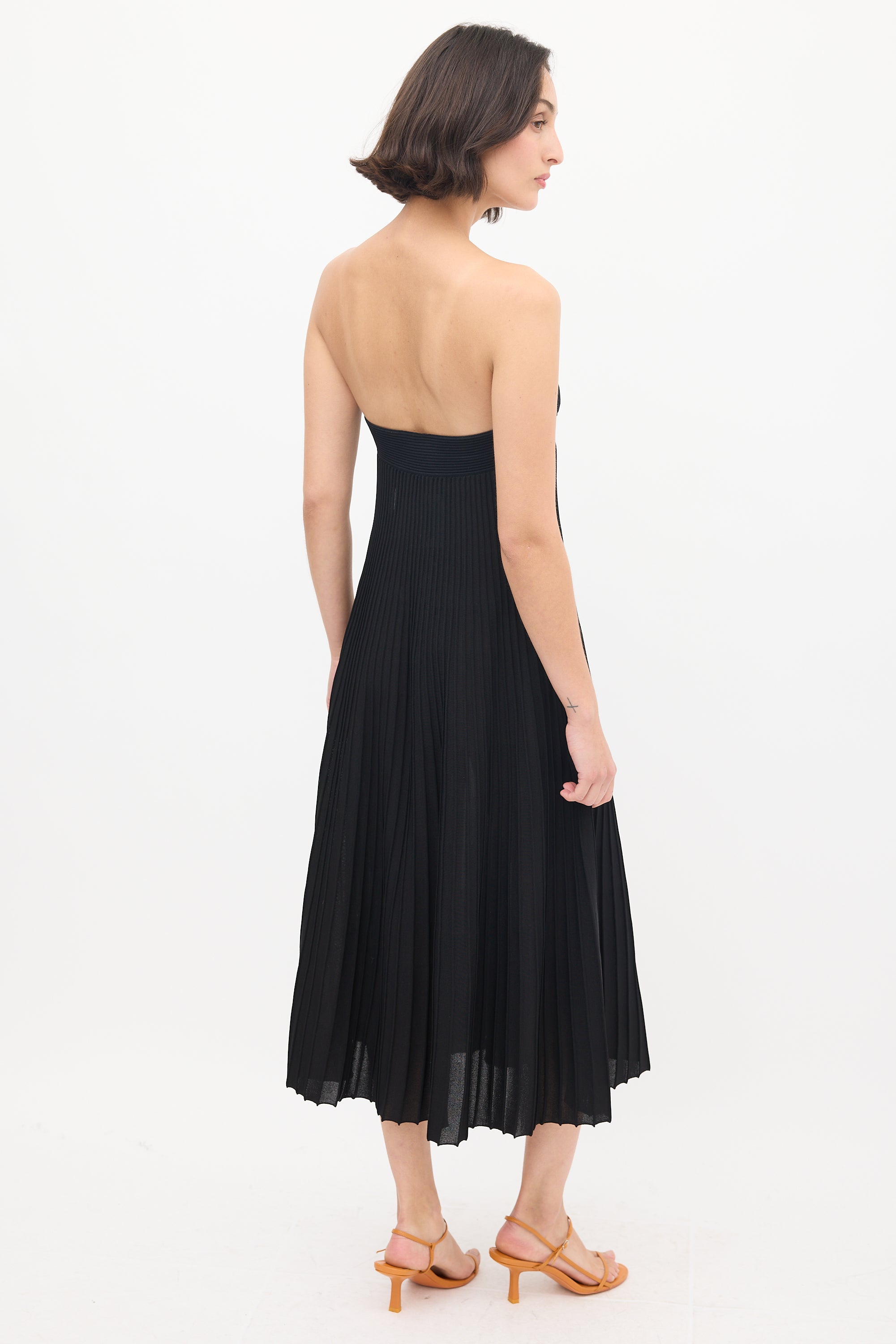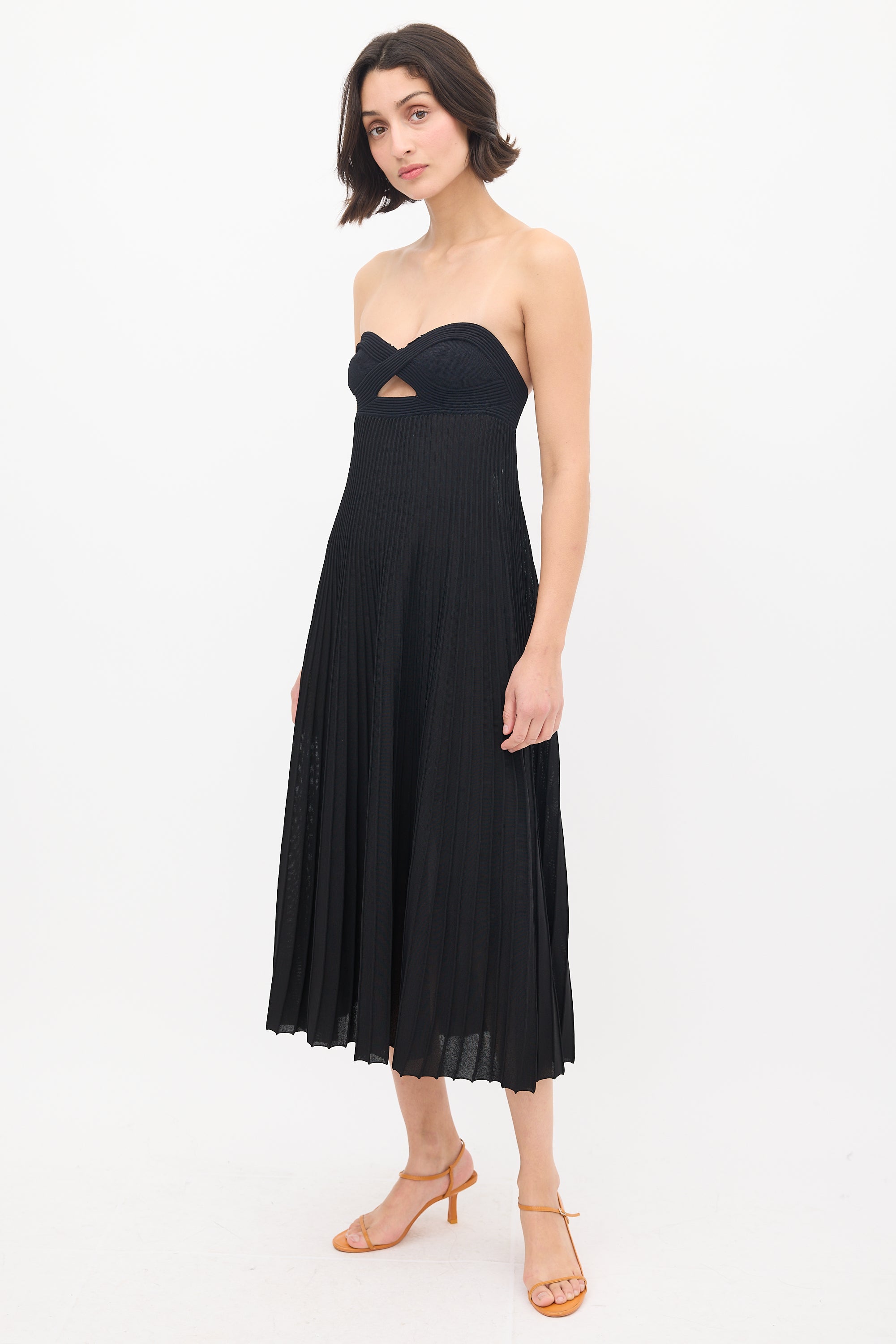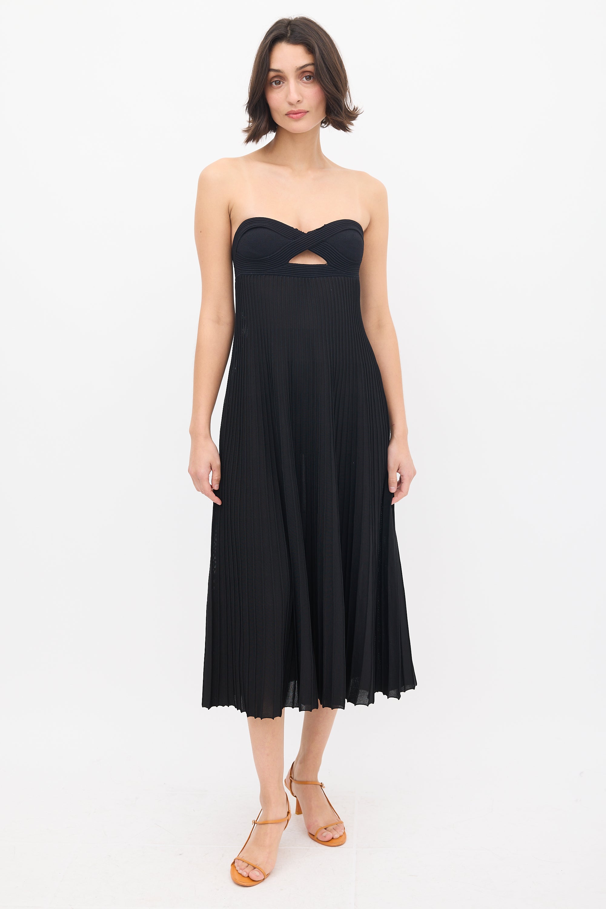 Pre-owned Khaite black ribbed knit Annika strapless midi dress featuring a twist front design with cutout at bust, empire cut, and flared skirt.