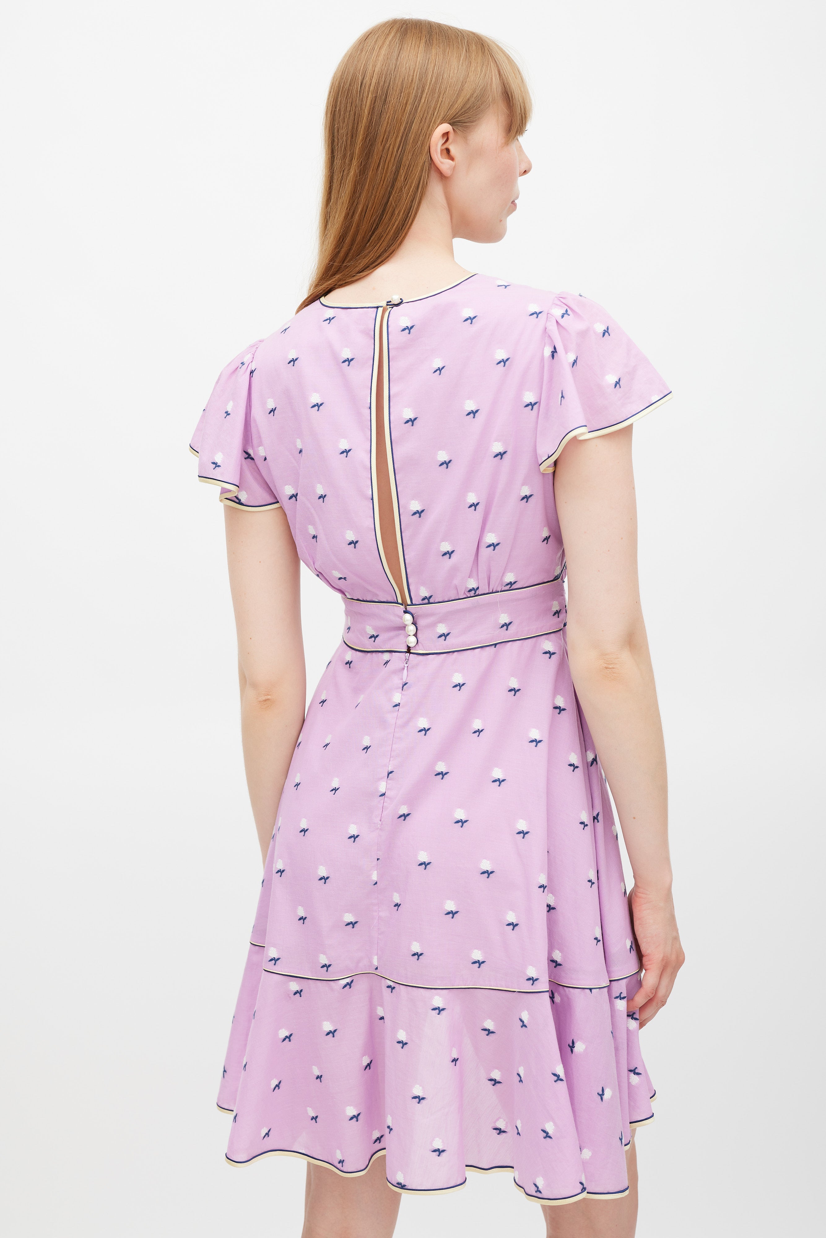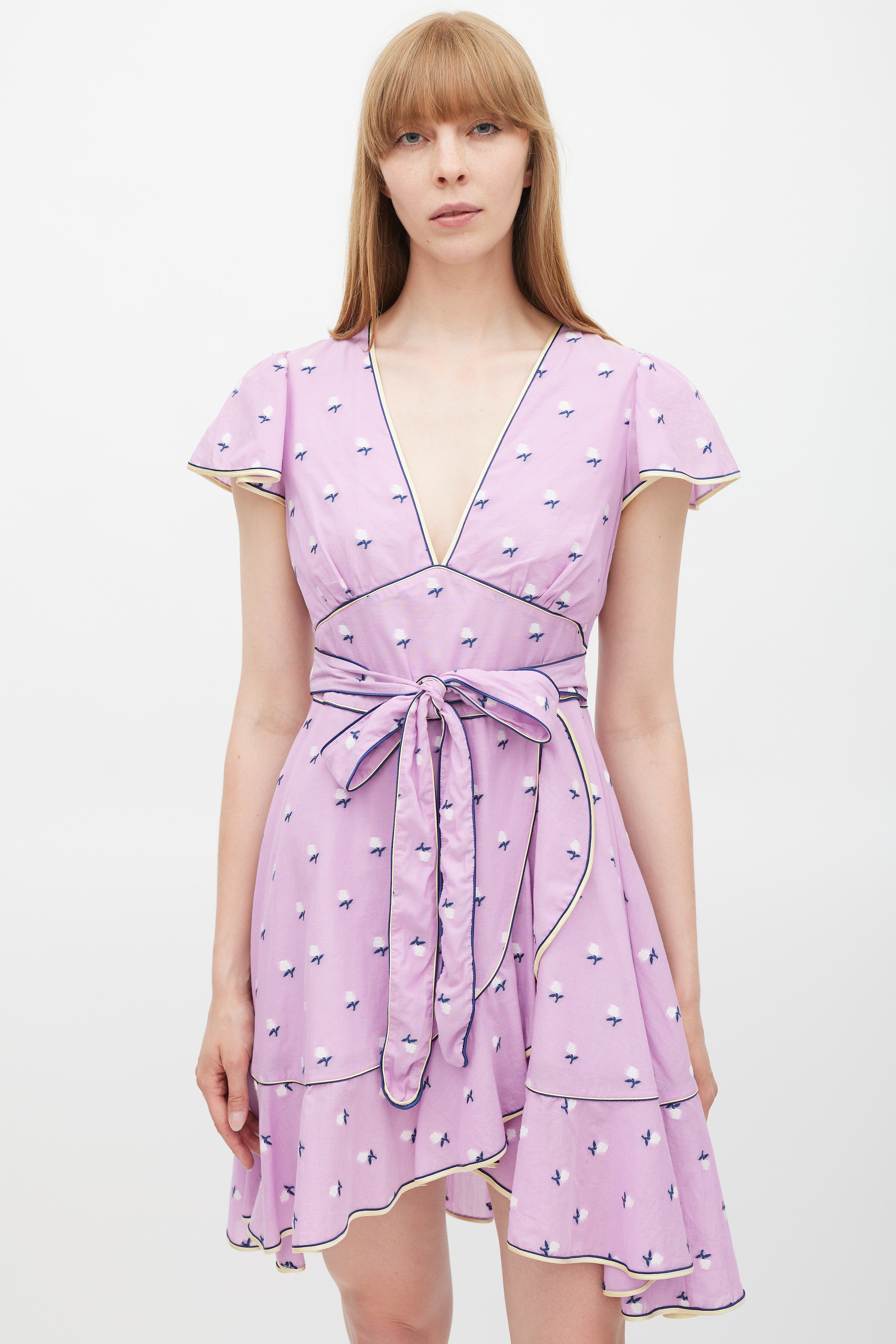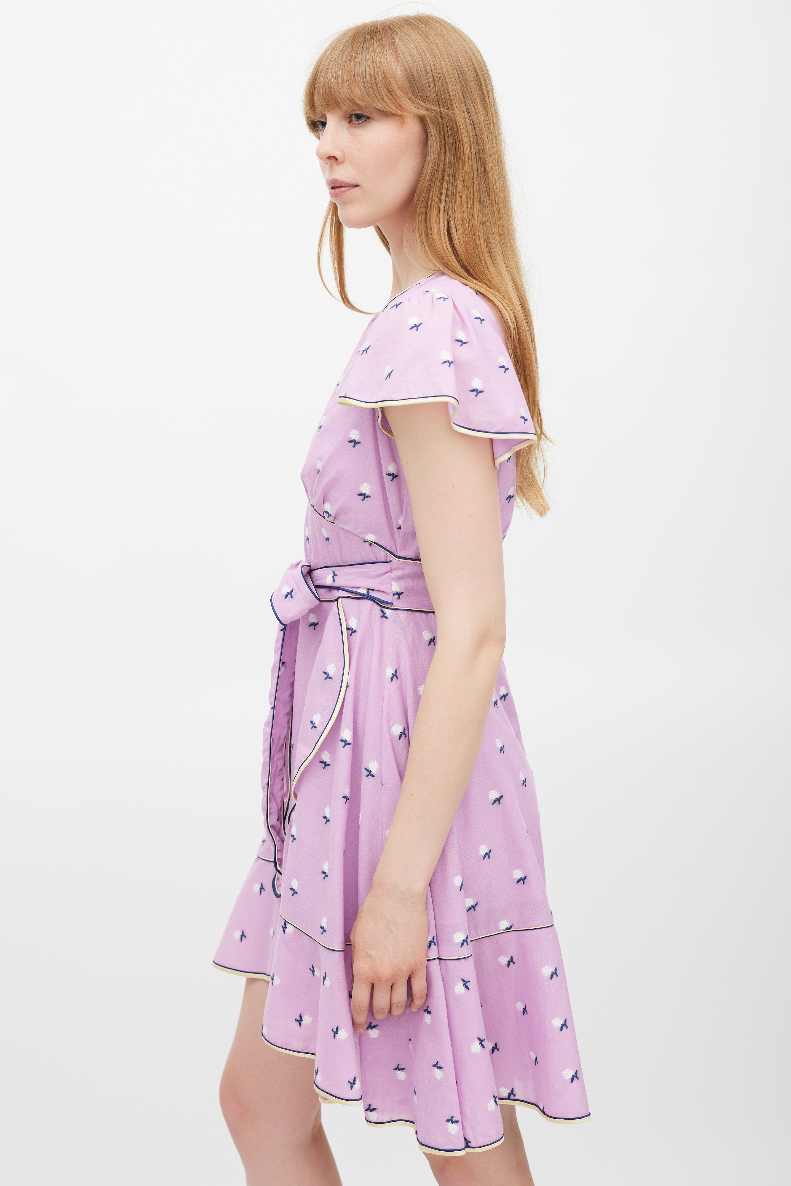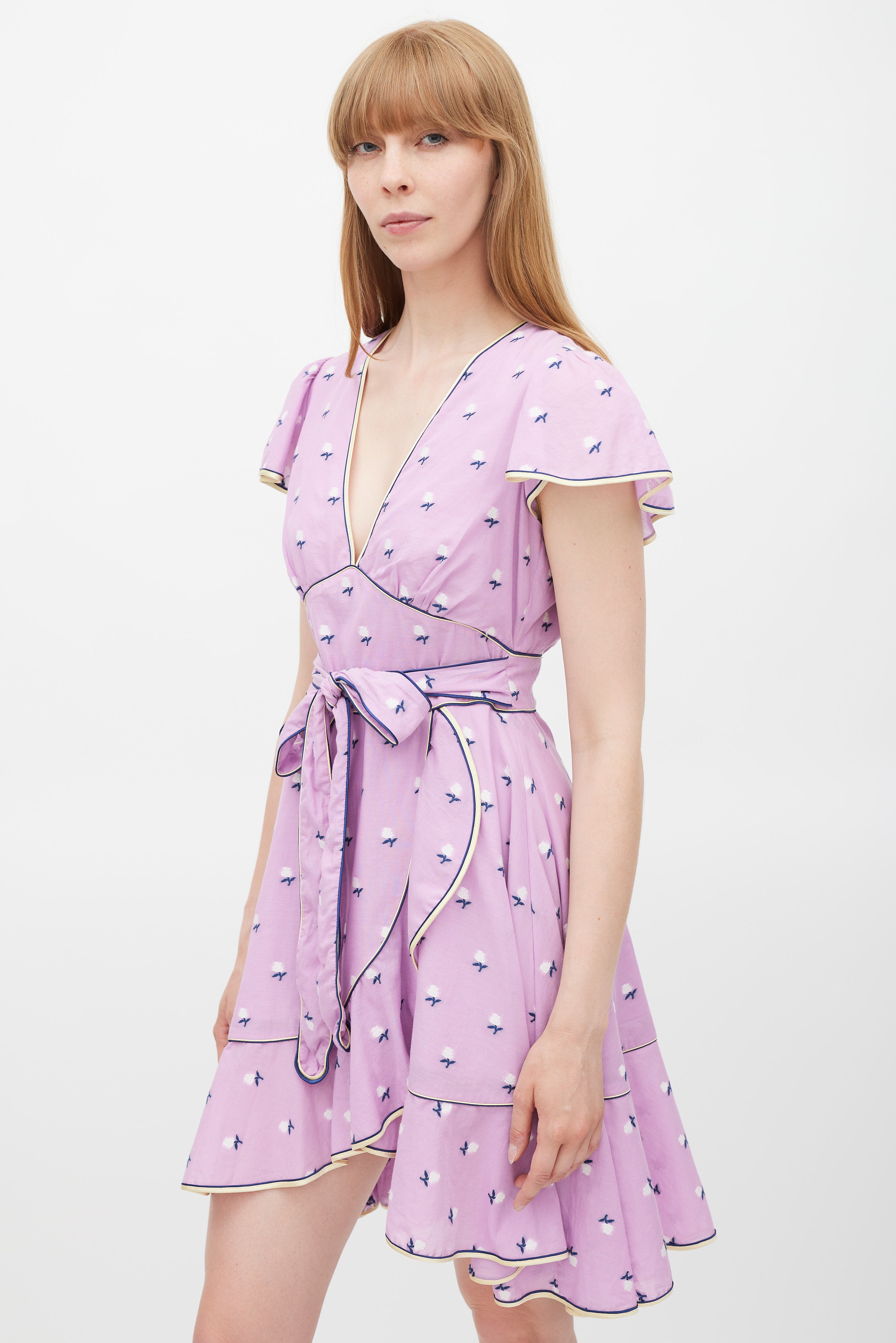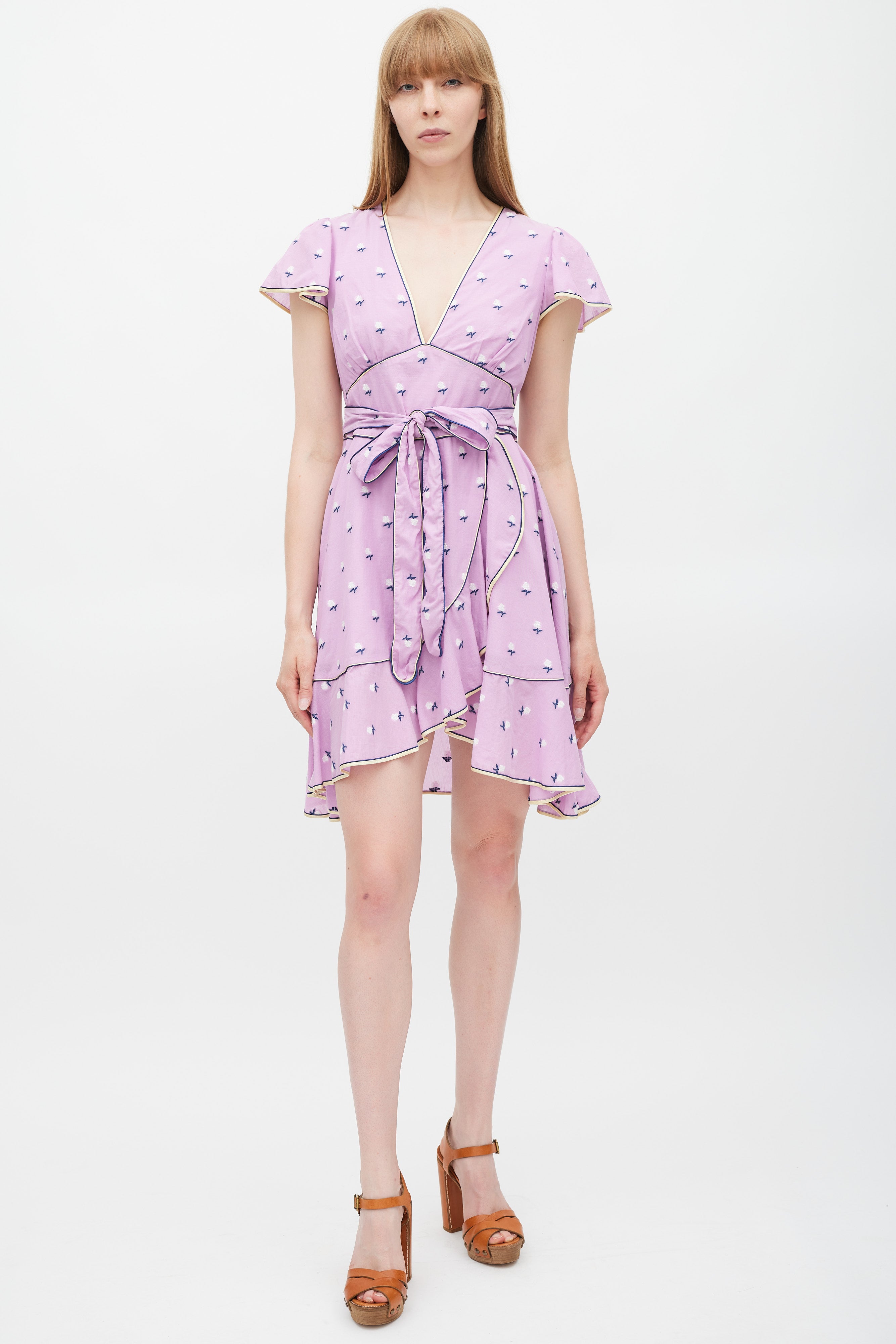 Pre-owned Marc Jacobs purple dress featuring a multicolour floral pattern throughout, V-neckline, cap sleeves, tie belt at waist, ruffled skirt, and zip at back with faux pearl button closure. Lined.