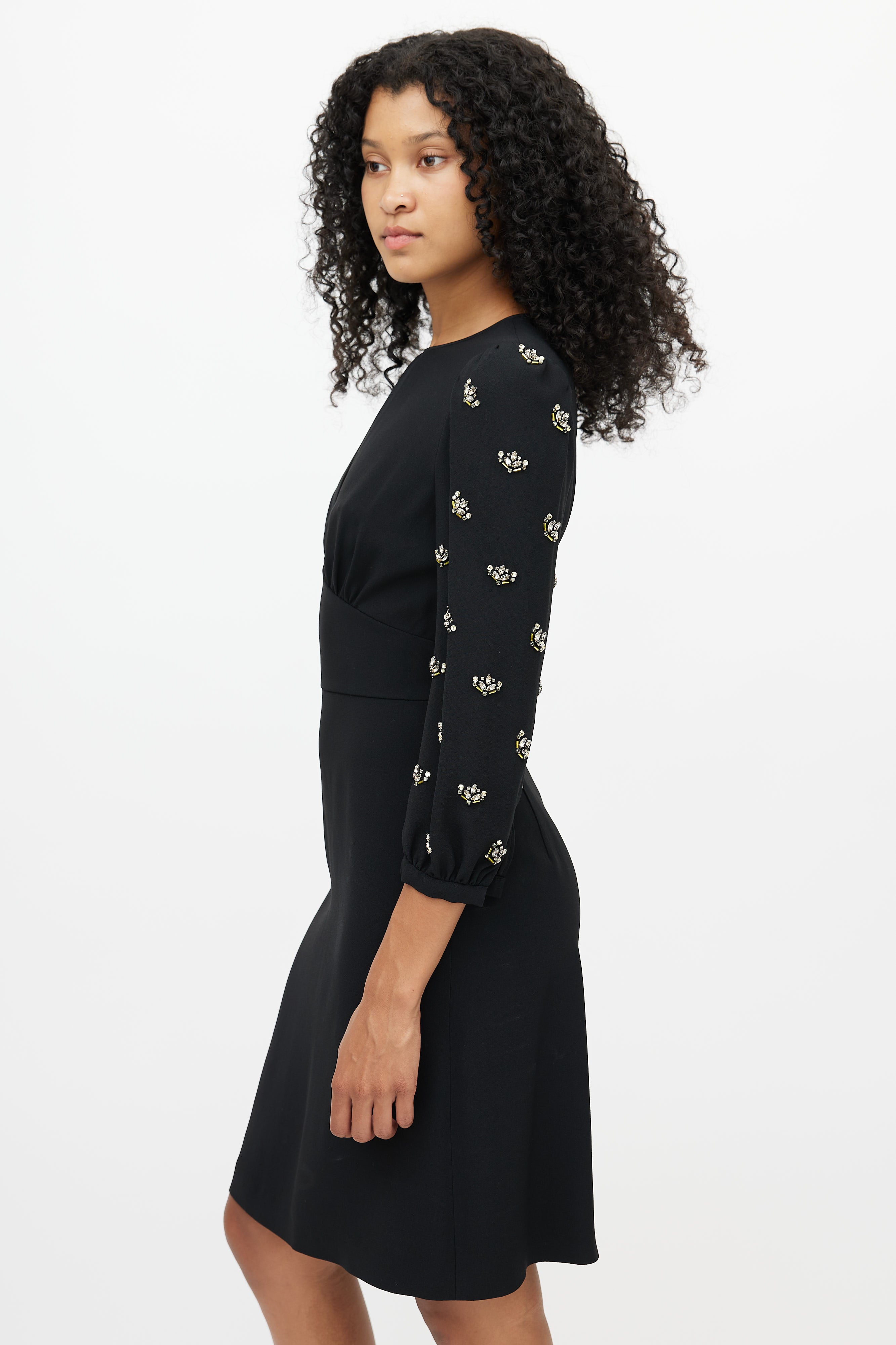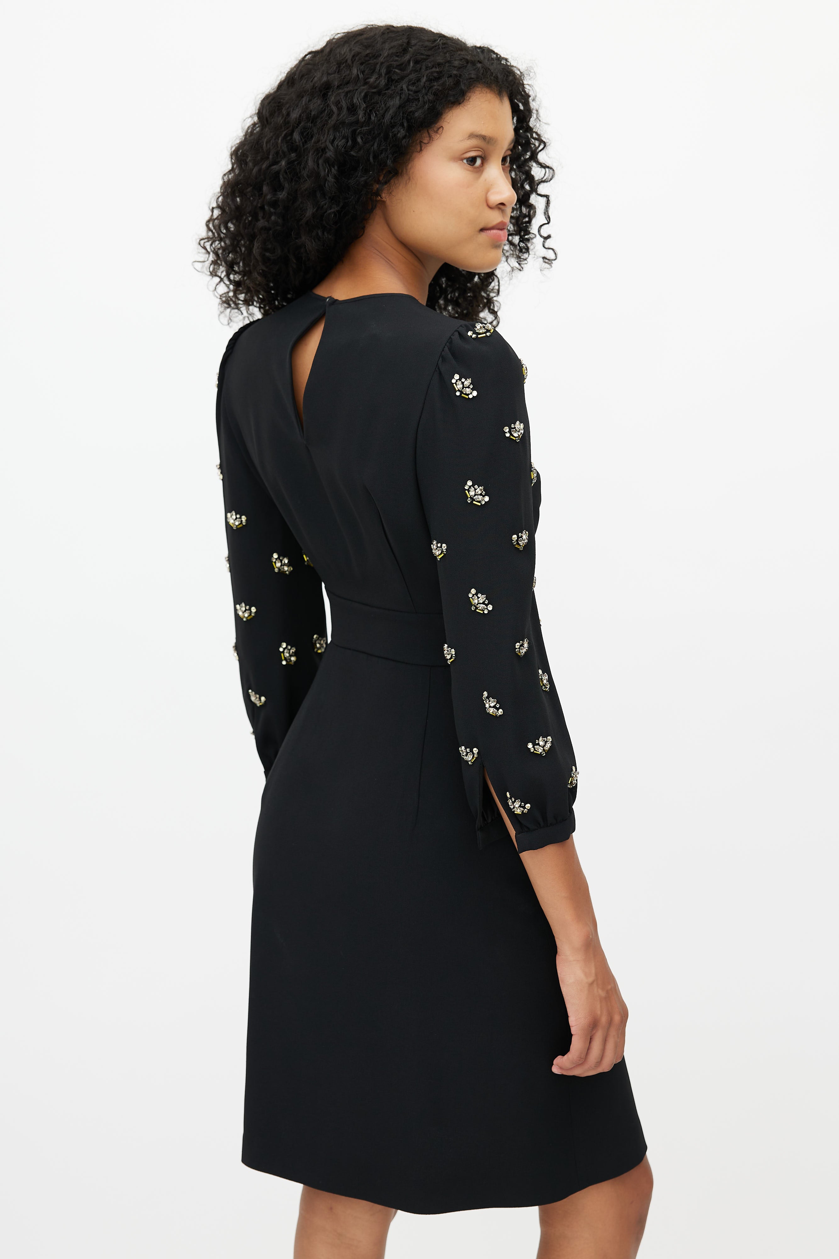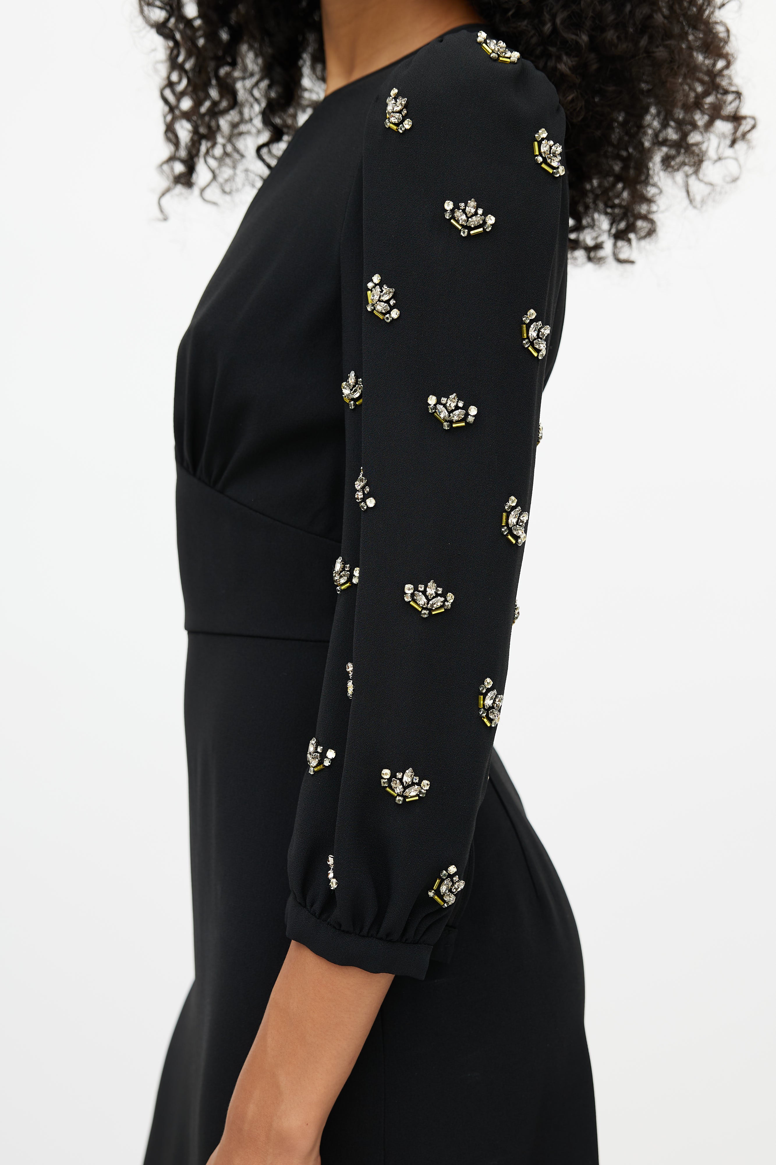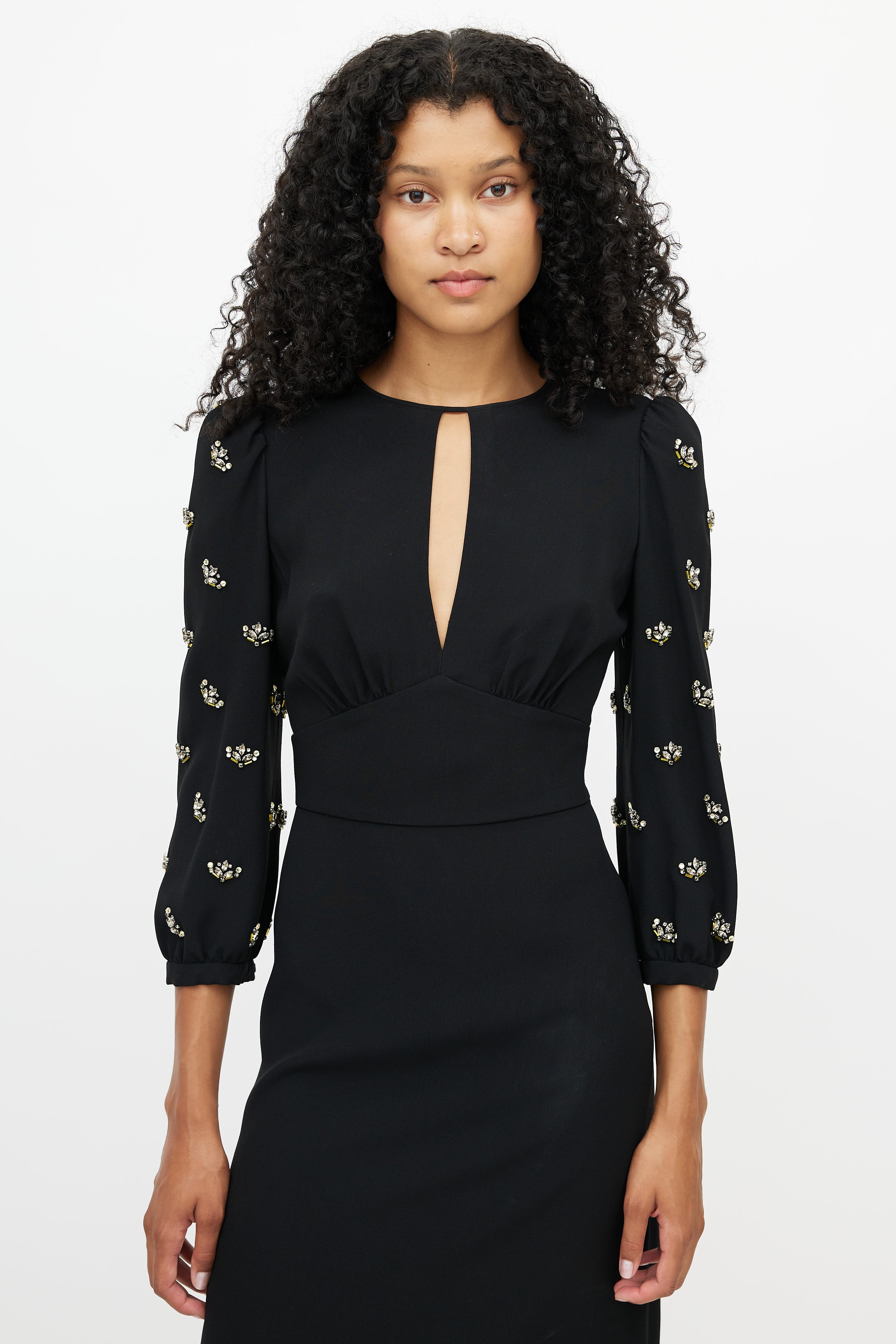 Pre-owned Miu Miu black dress featuring keyhole neckline, bishop sleeves, gem embellishment at sleeves, keyhole back with button fastening, and concealed zip closure at side.