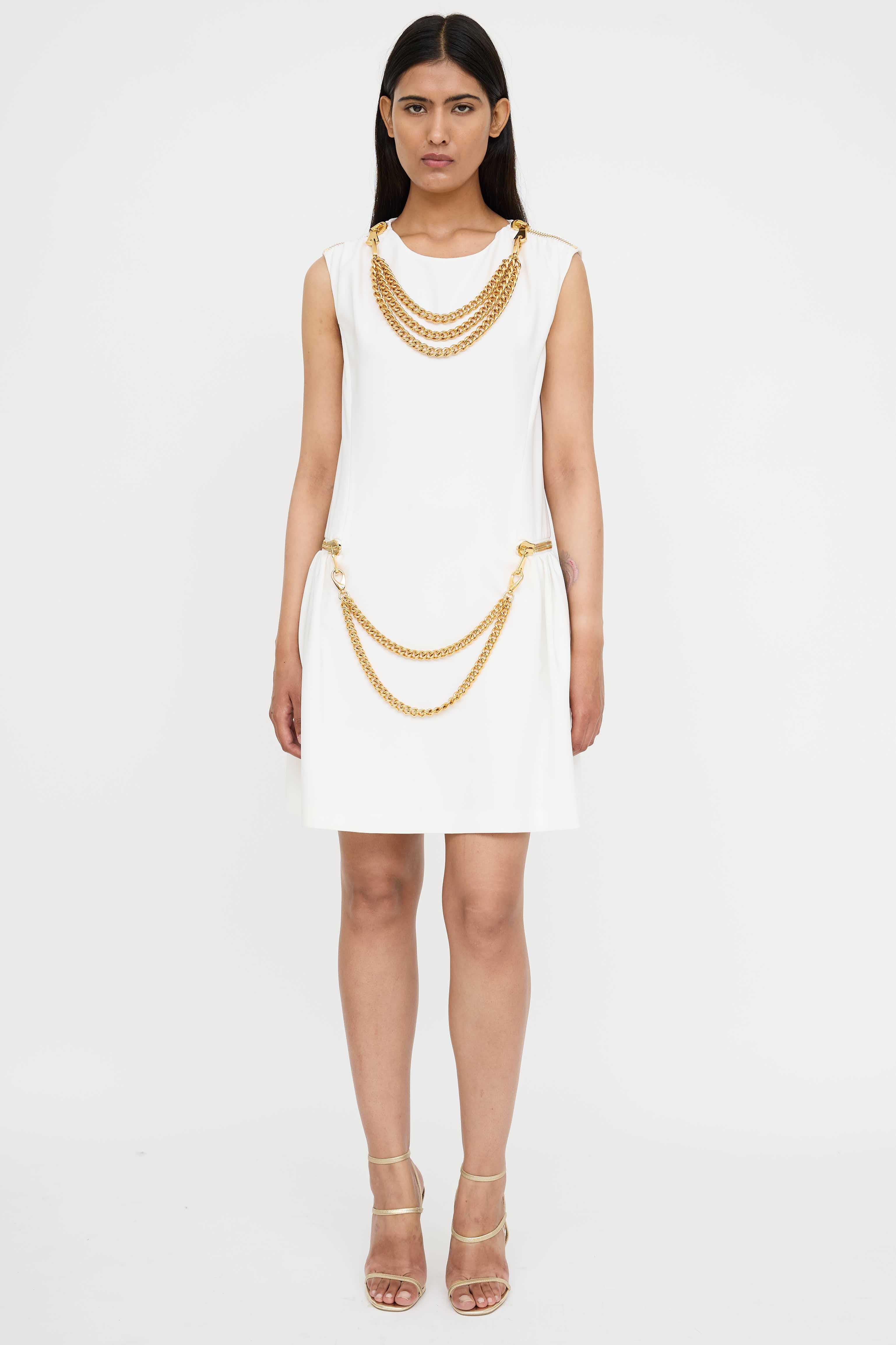 Pre-owned Moschino white and gold sleeveless dress featuring round neckline, zip detail at shoulder and hip, and detachable chain-link detail at waist and at chest, and zip closure at back. Lined.