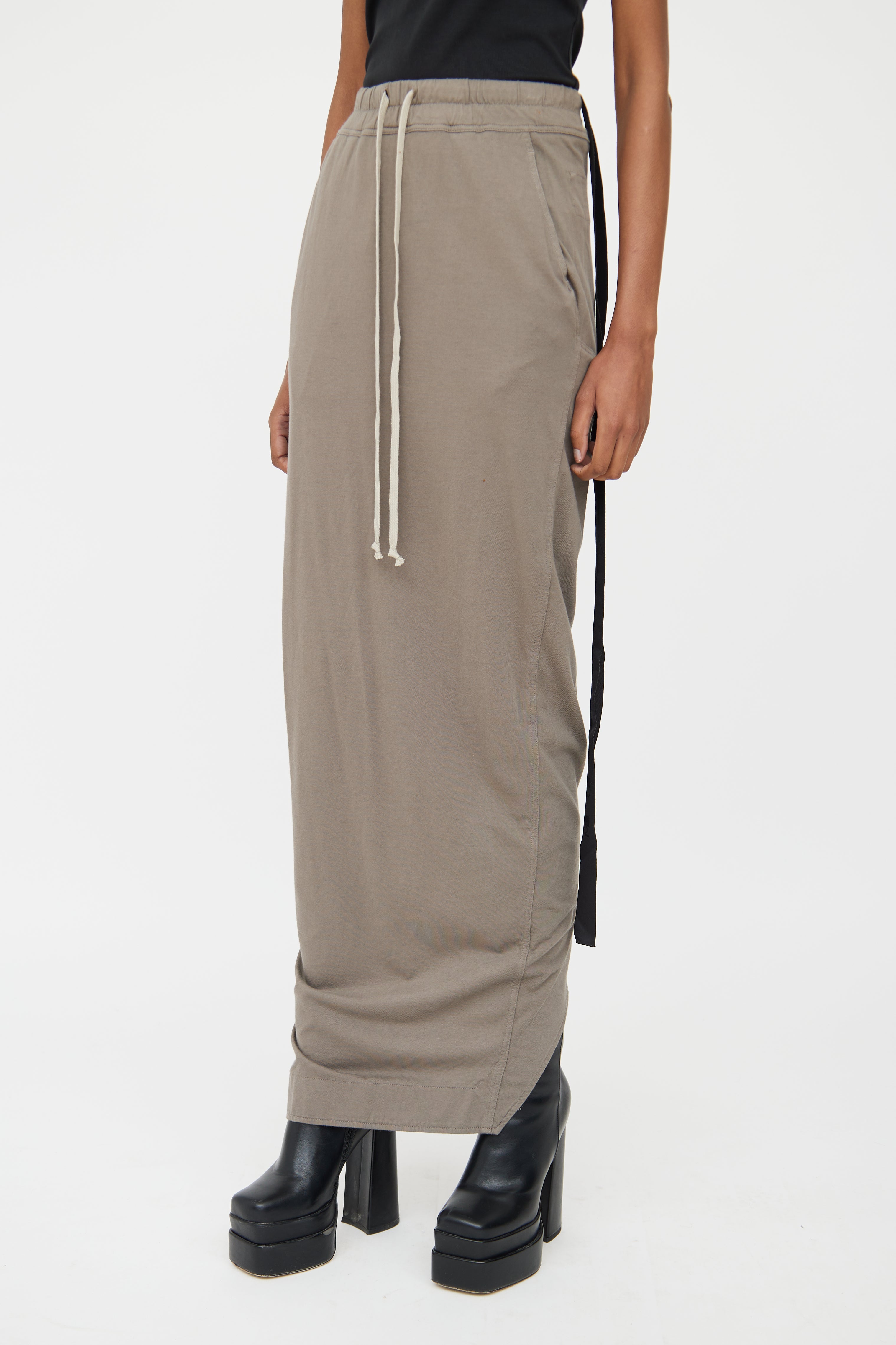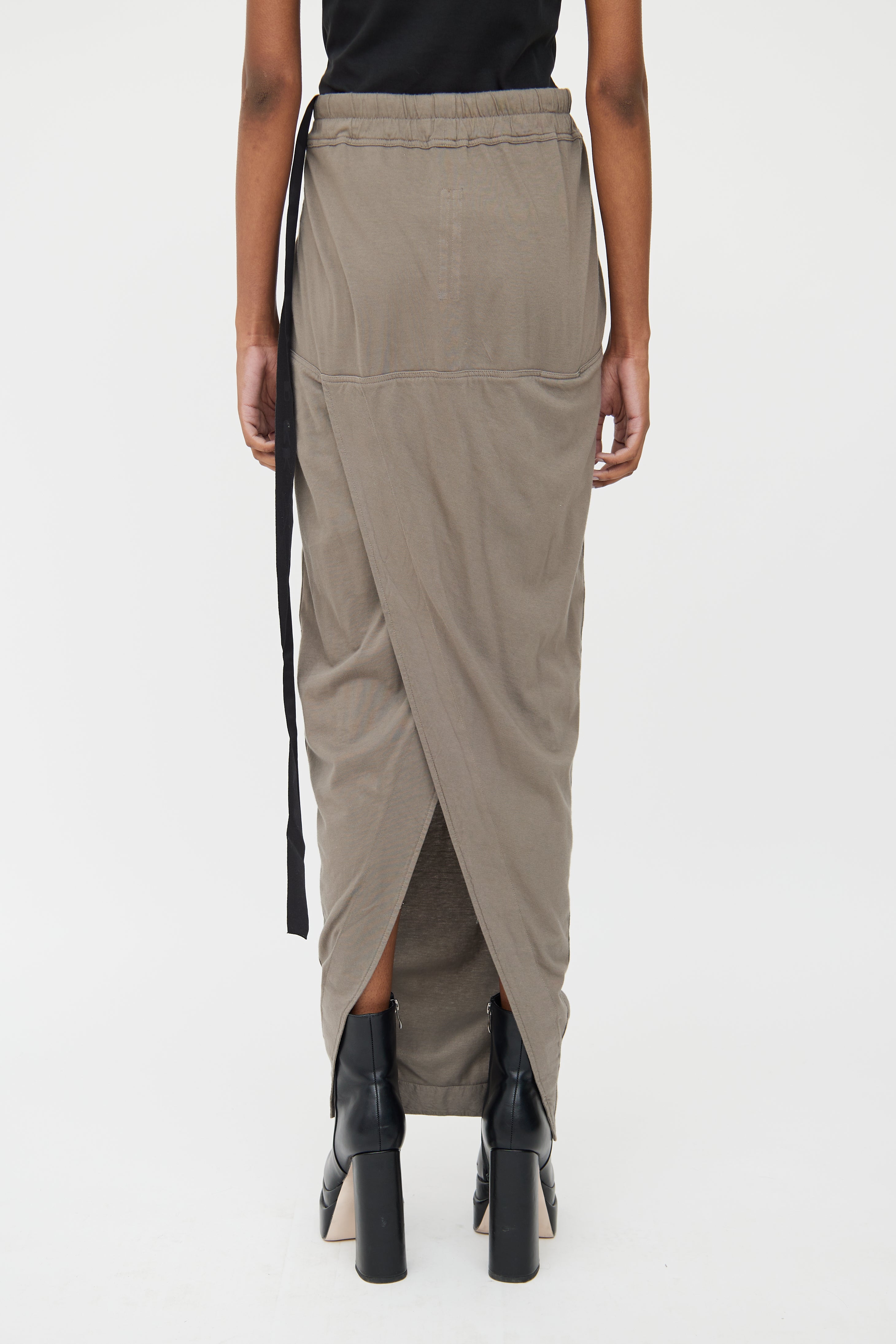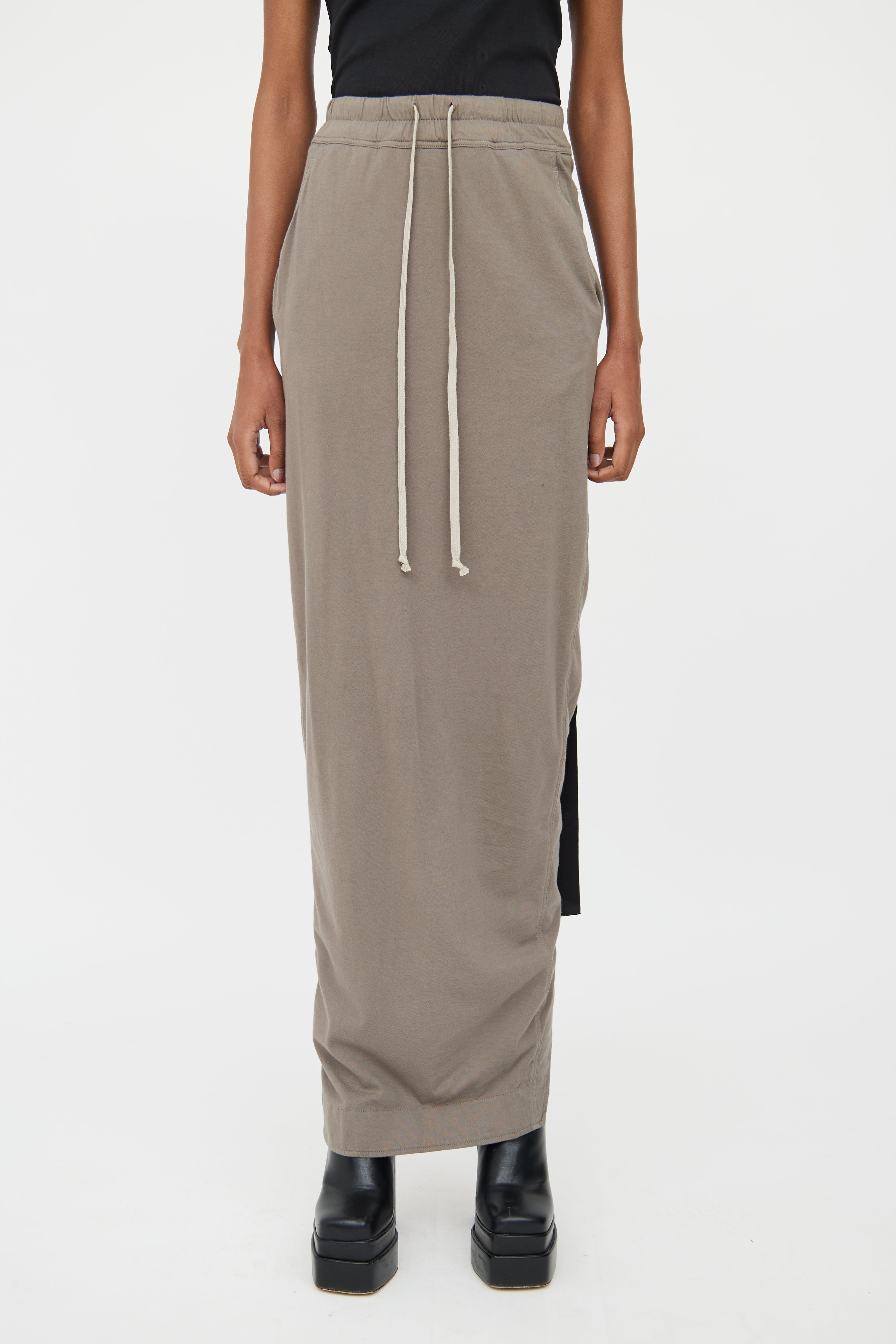 Pre-owned Rick Owens brown DRKSHDW cotton skirt featuring elasticated waistline with exaggerated drawstring at front, slip pockets, tapered styling with asymmetrical back slit detail.