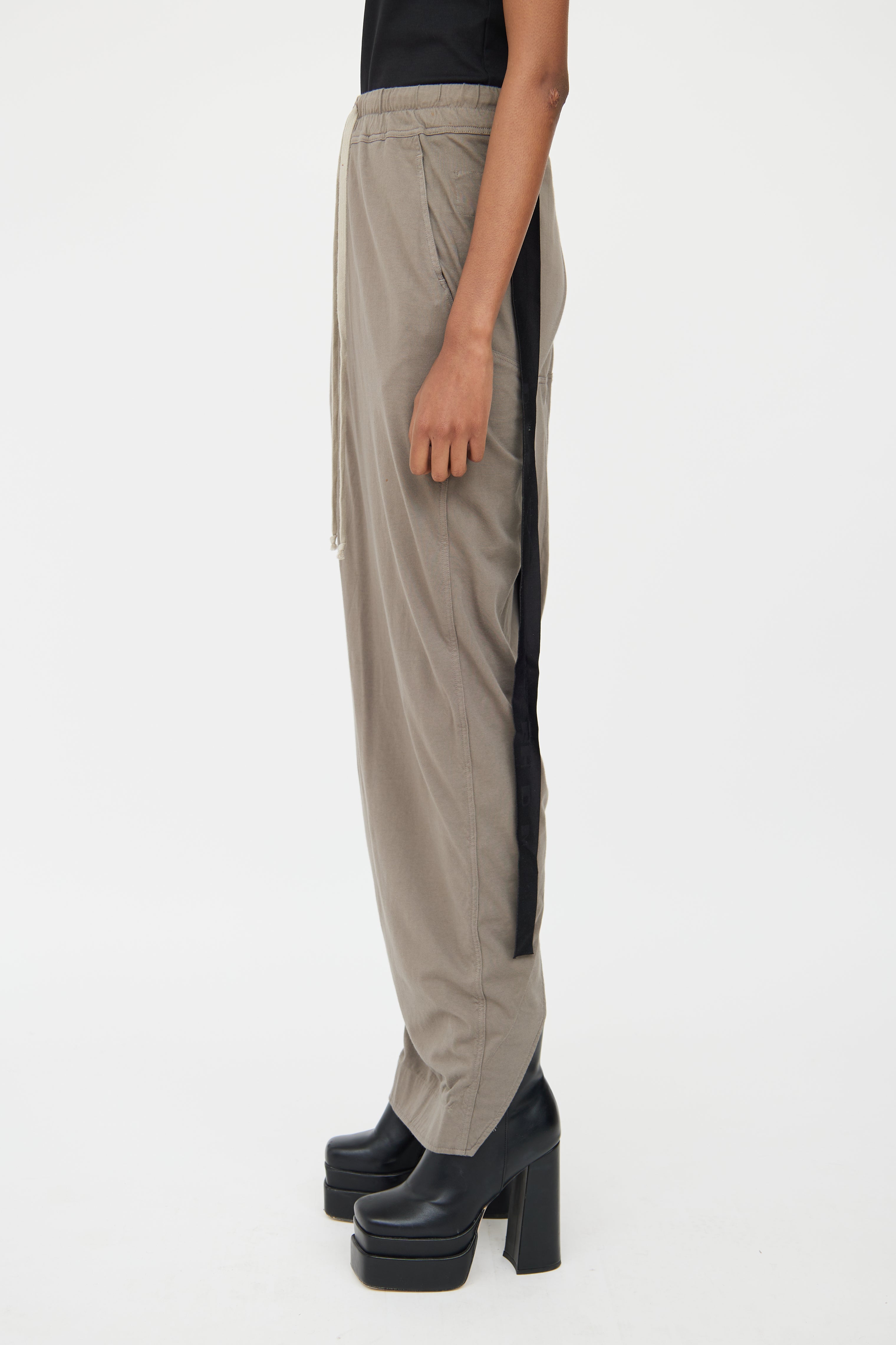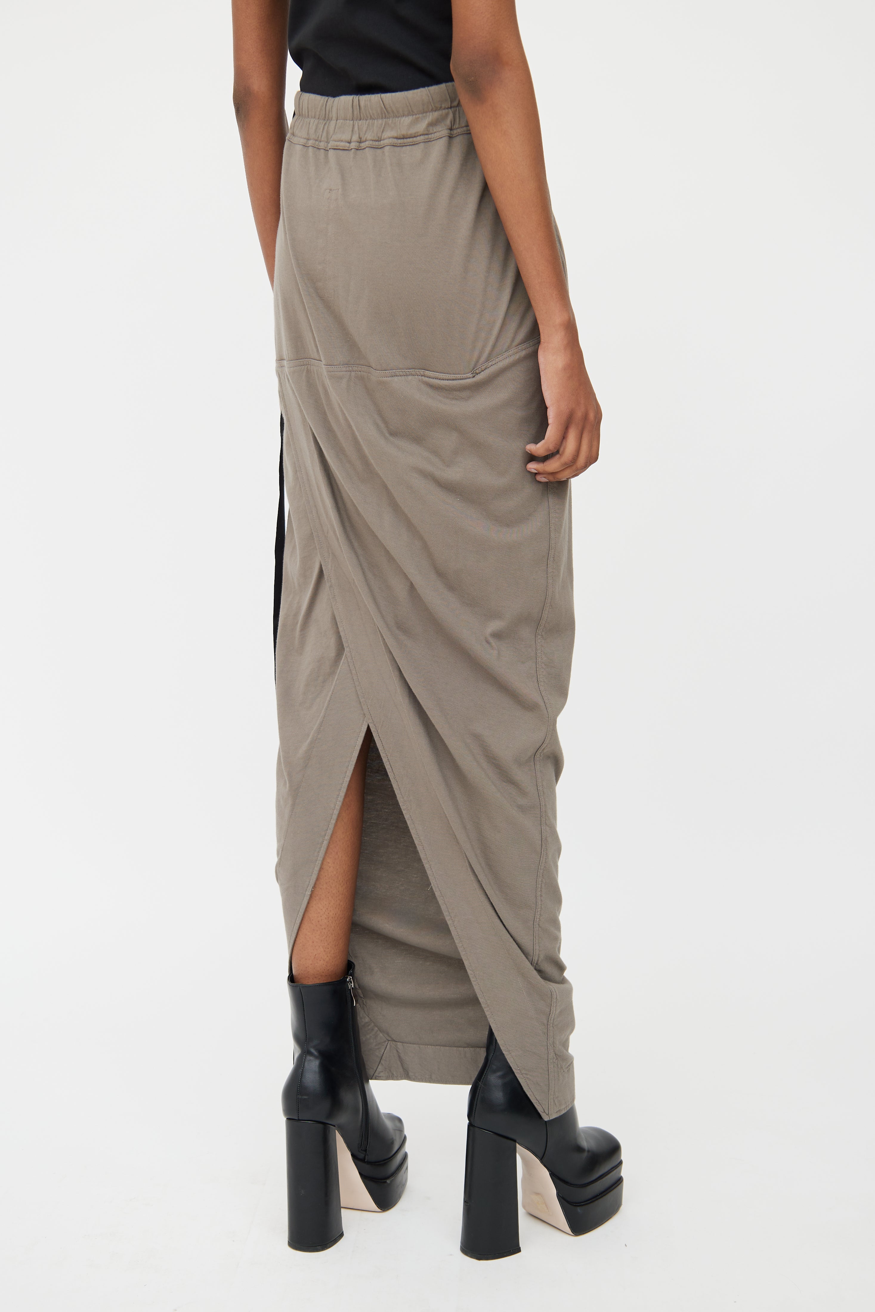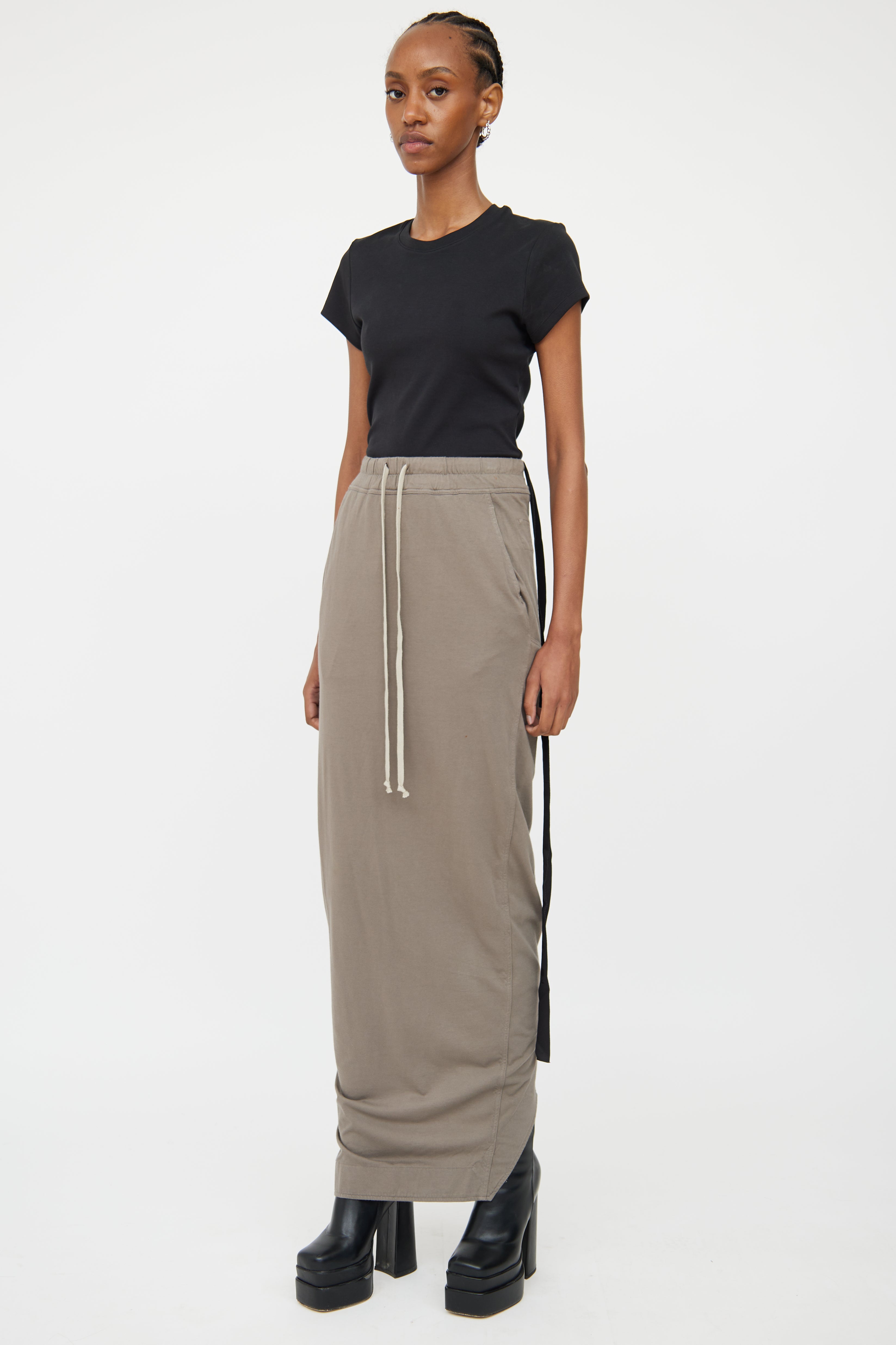 Pre-owned Rick Owens brown DRKSHDW cotton skirt featuring elasticated waistline with exaggerated drawstring at front, slip pockets, tapered styling with asymmetrical back slit detail.