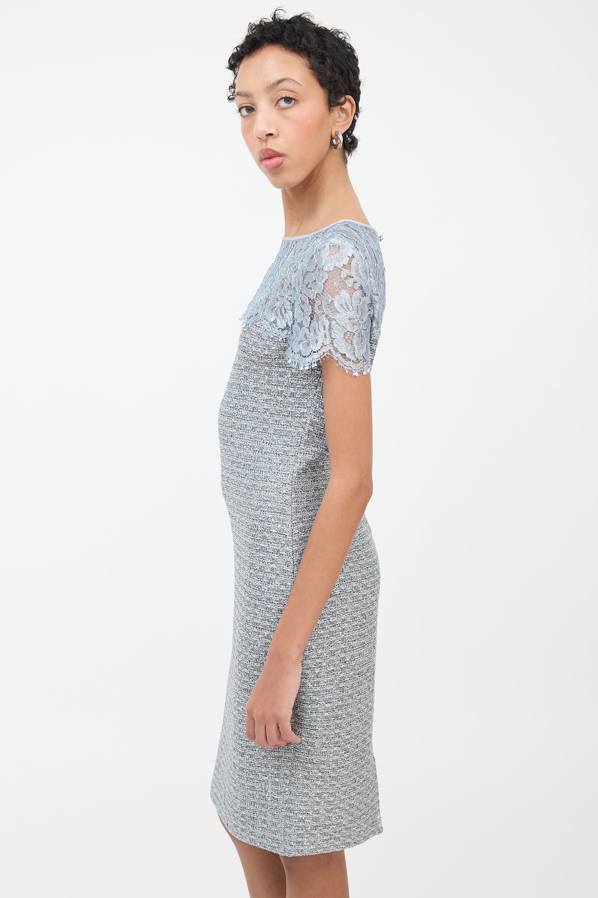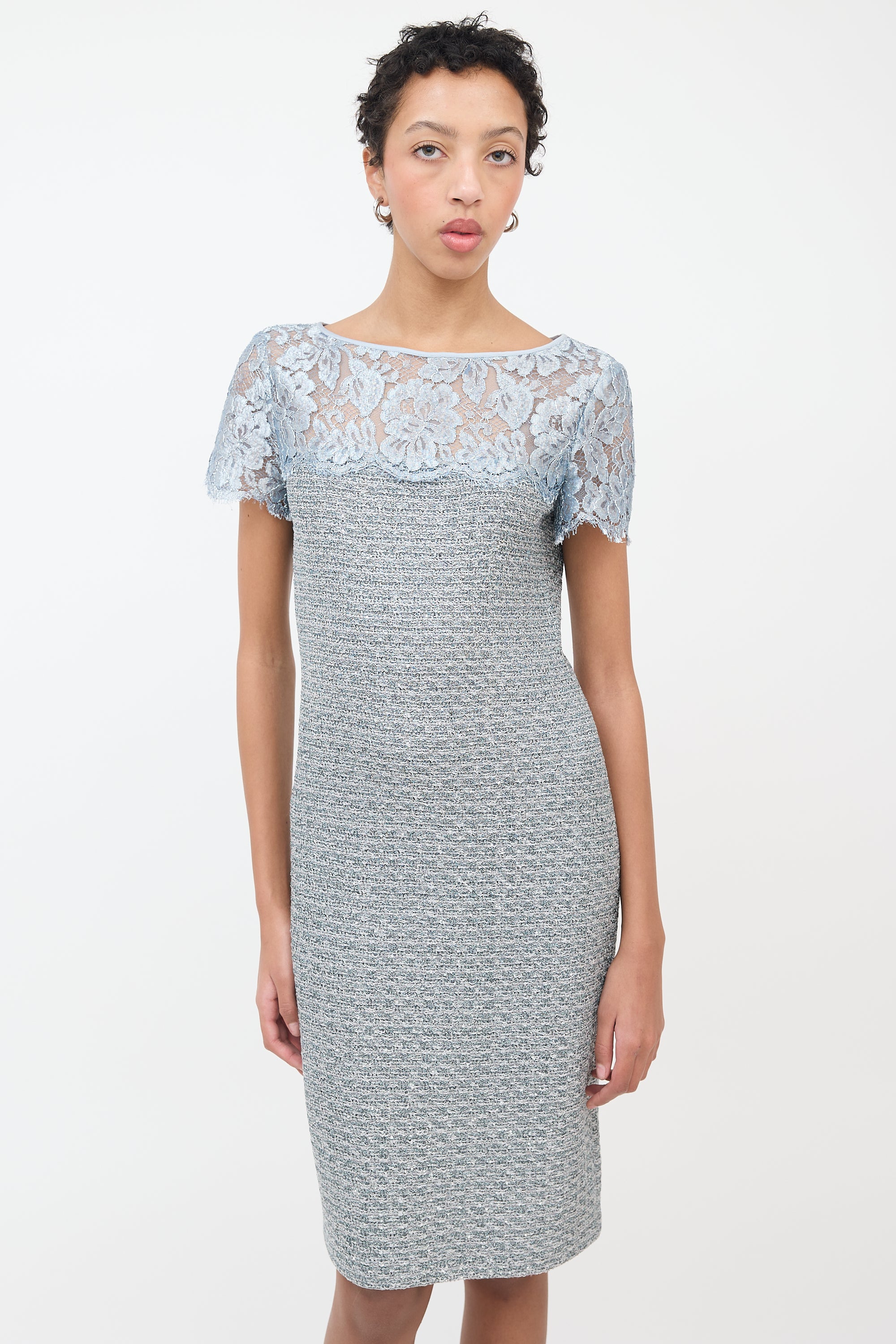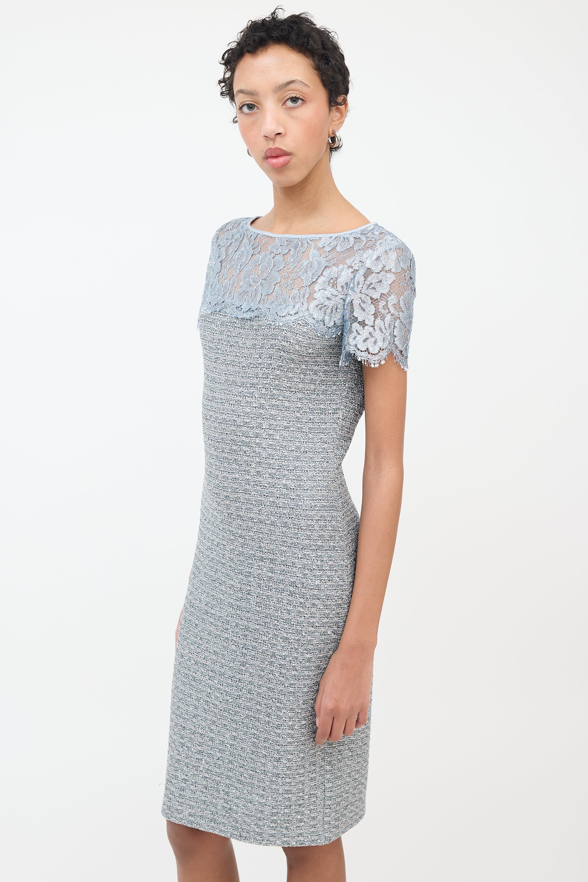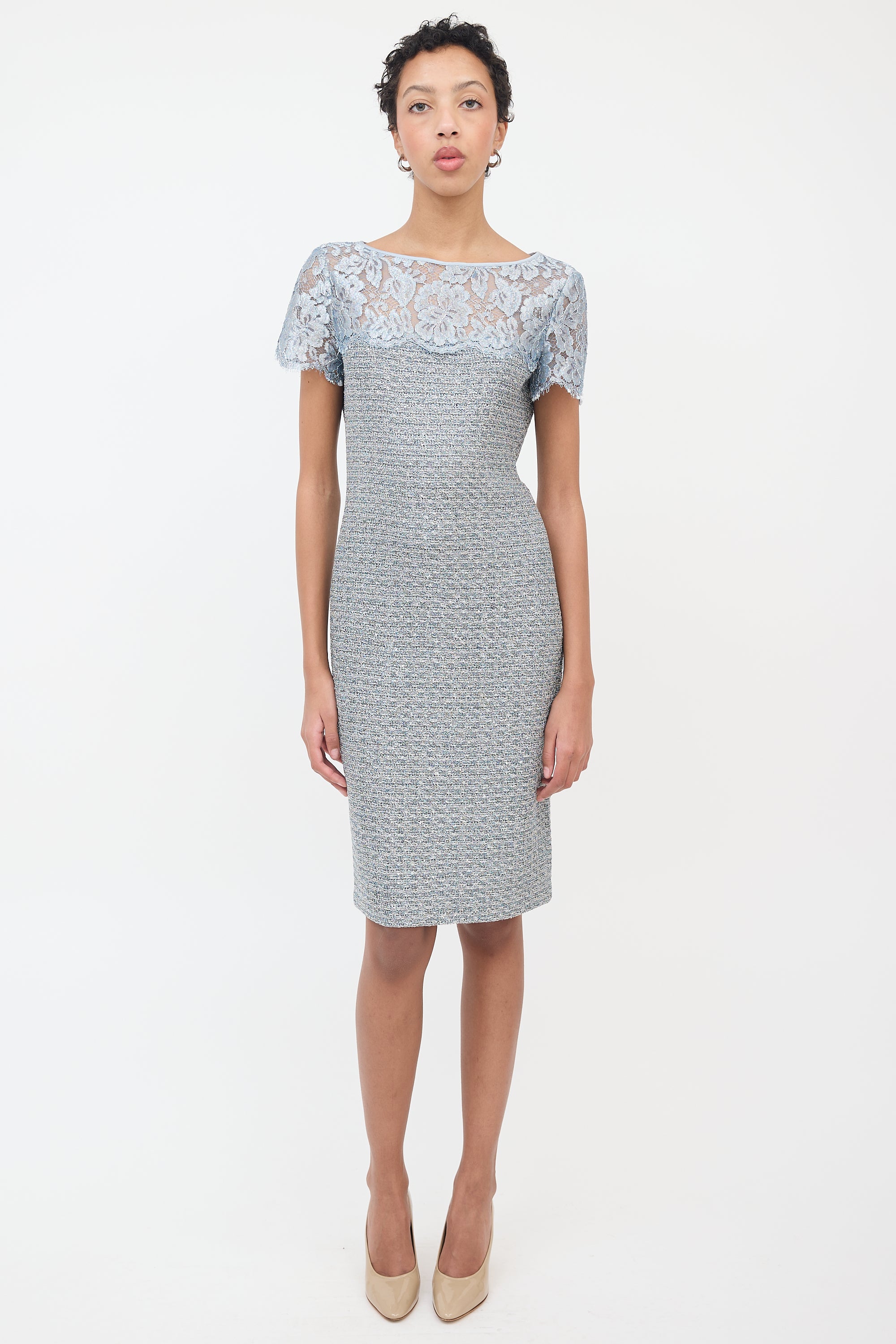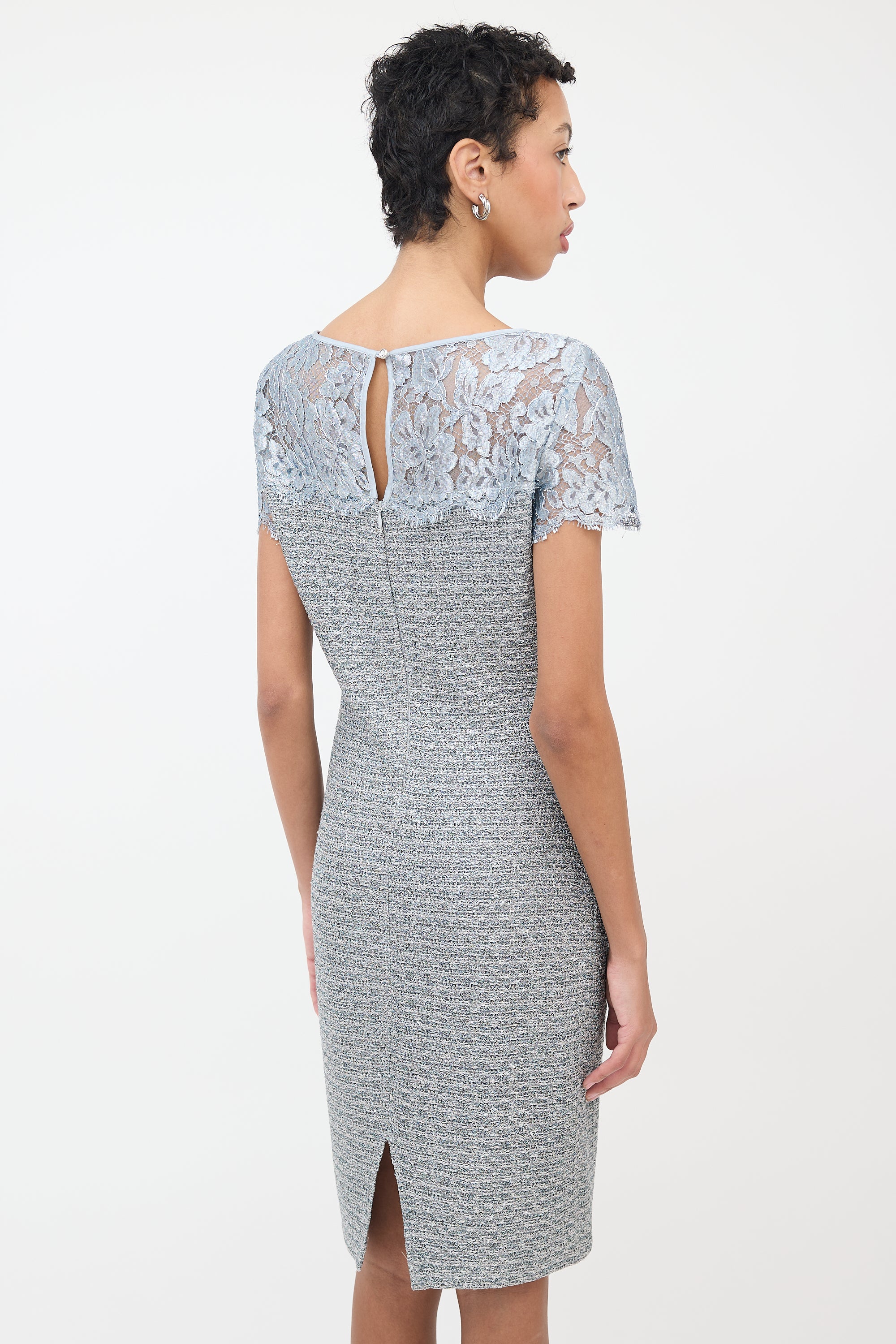 Pre-owned St. John light blue tweed dress featuring rounded lace collar and short sleeves, sequin embellishments throughout, back keyhole with zip closure, and back vent.