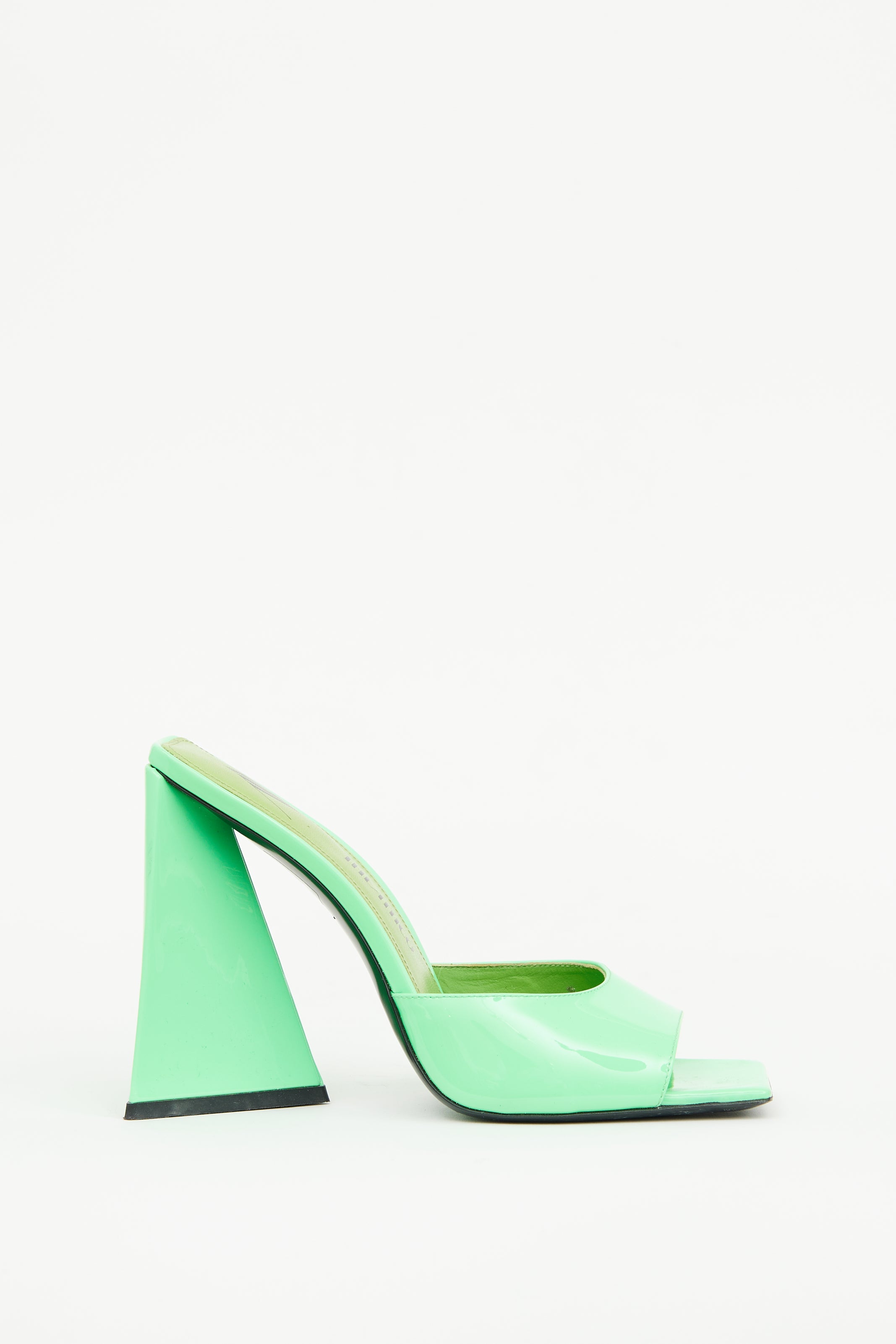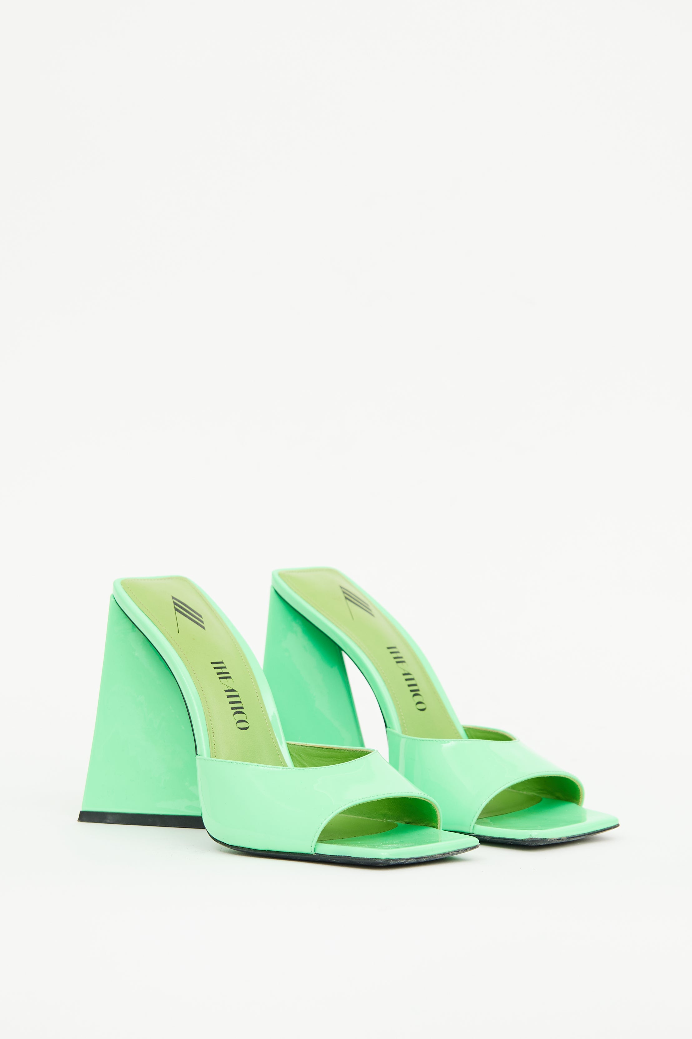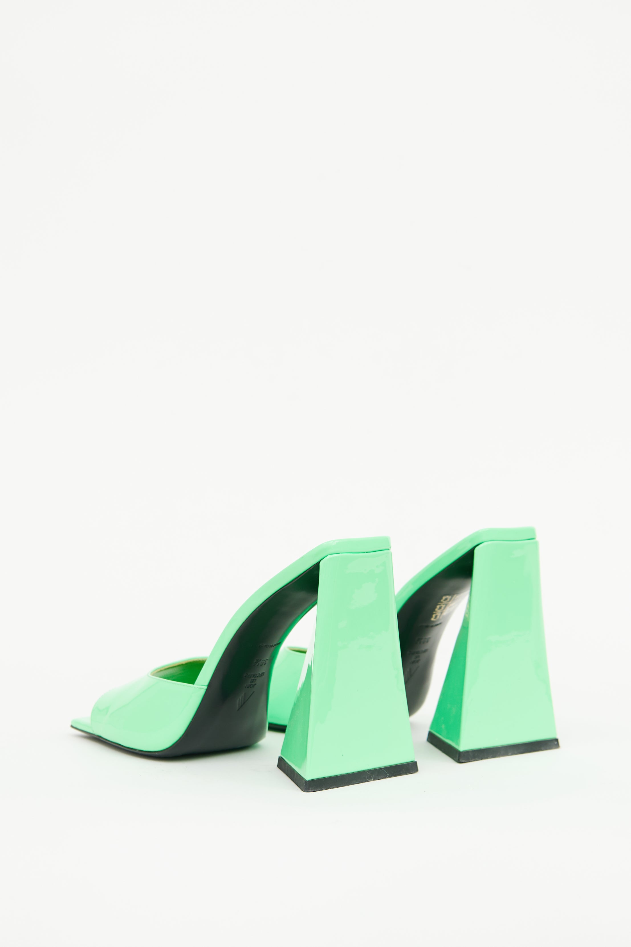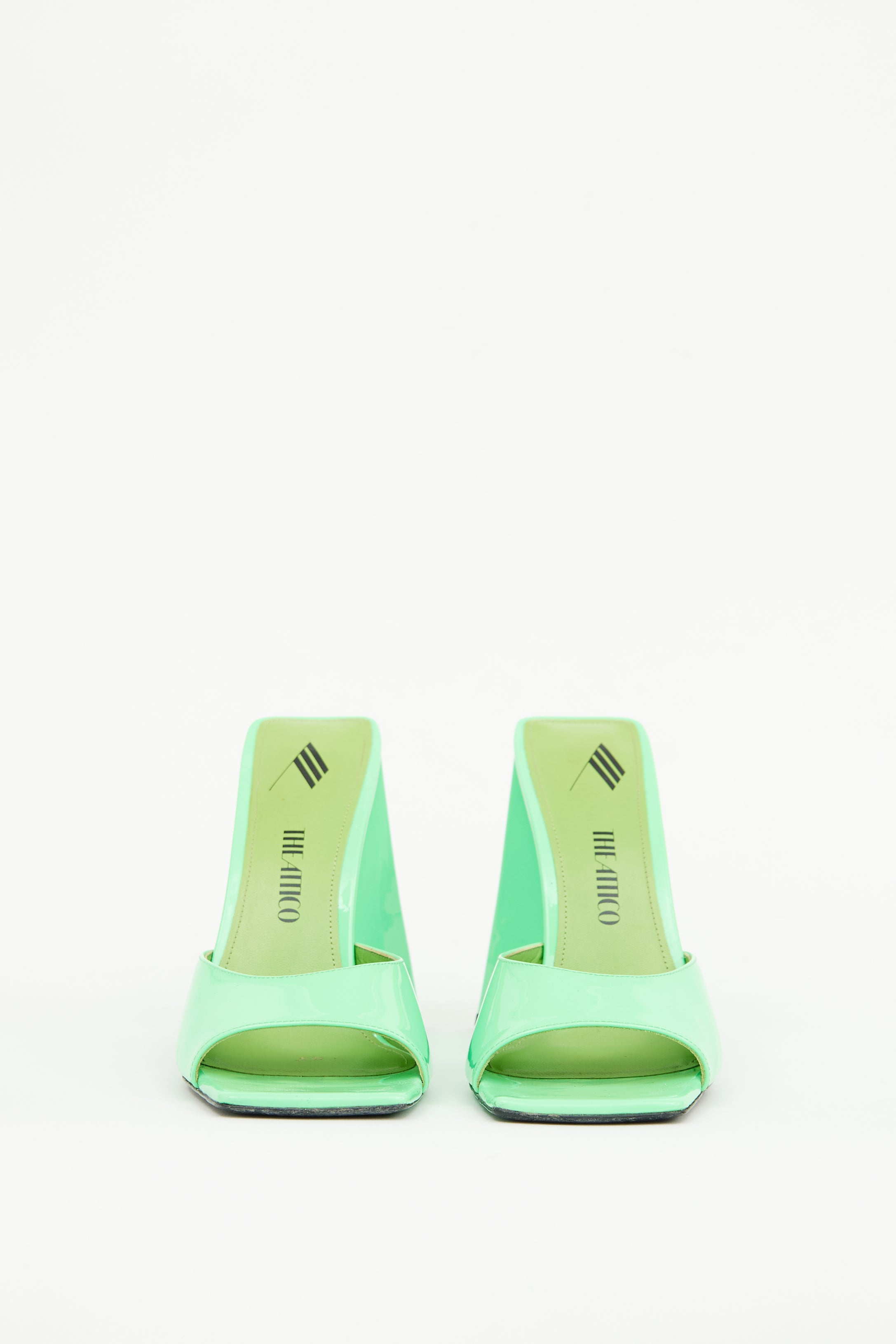 Pre-owned The Attico green patent leather Devon mules featuring square toe, strap on upper and geometric block heel.