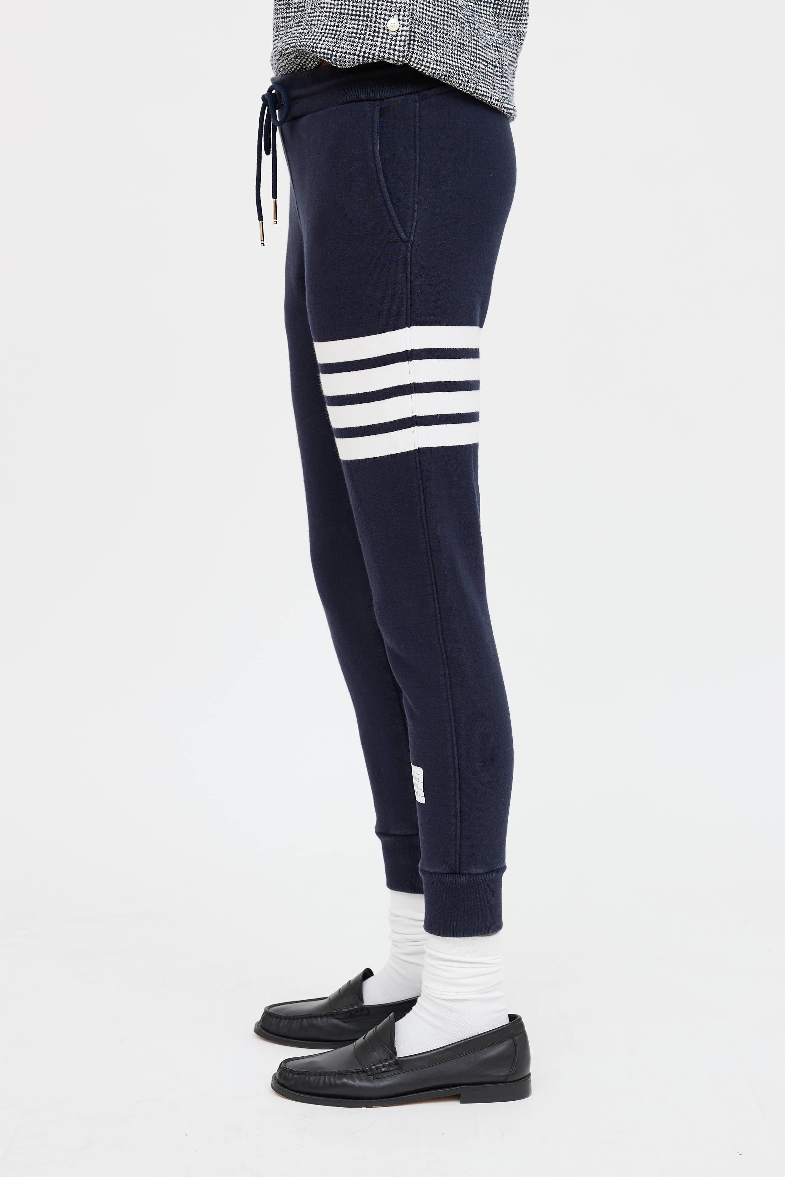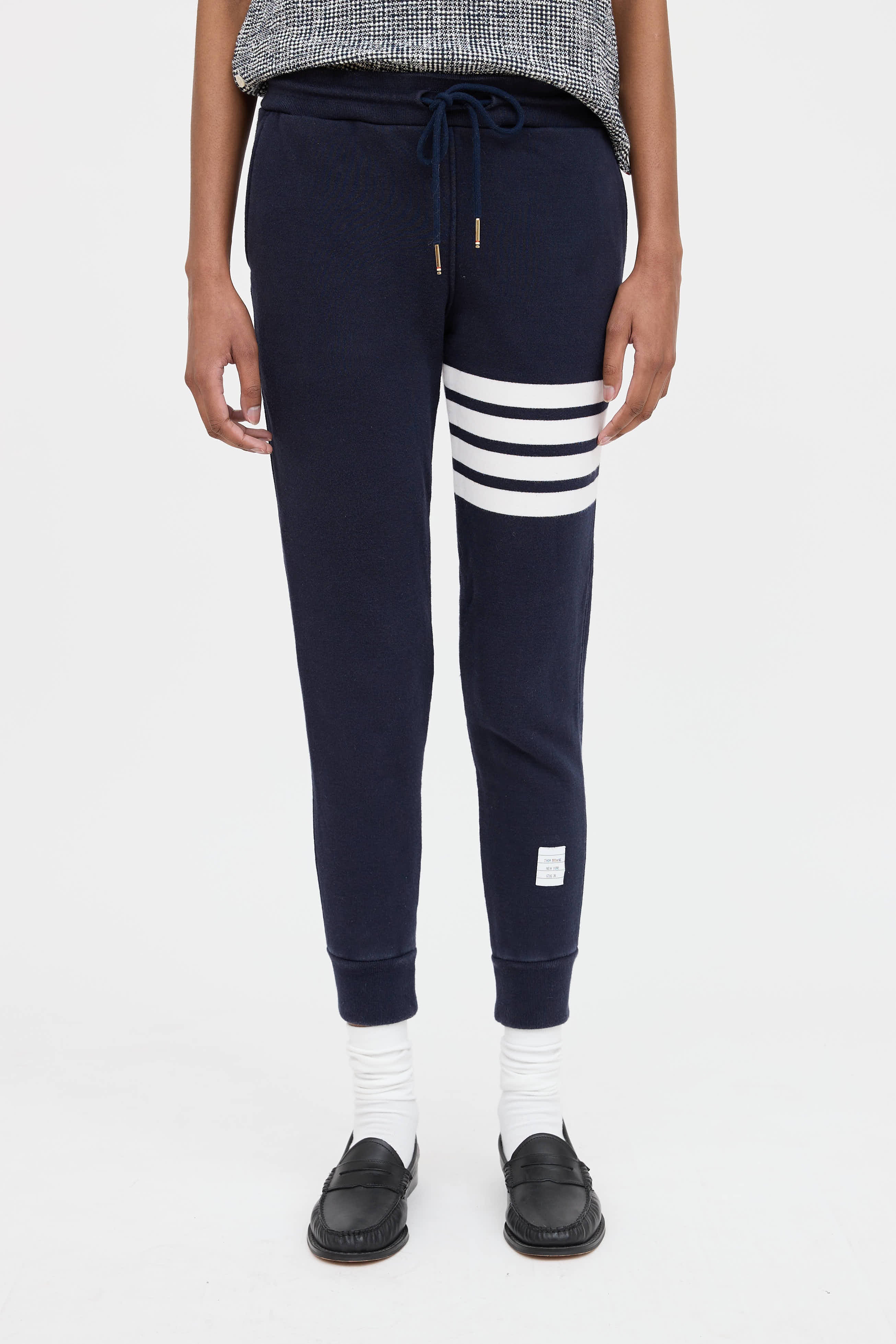 Pre-owned Thom Browne navy 4-Bar joggers featuring elastic waistband with drawstring, dual slip pockets on hip, white striping mid left thigh, and logo tag near ankle, ribbed ankle cuffs