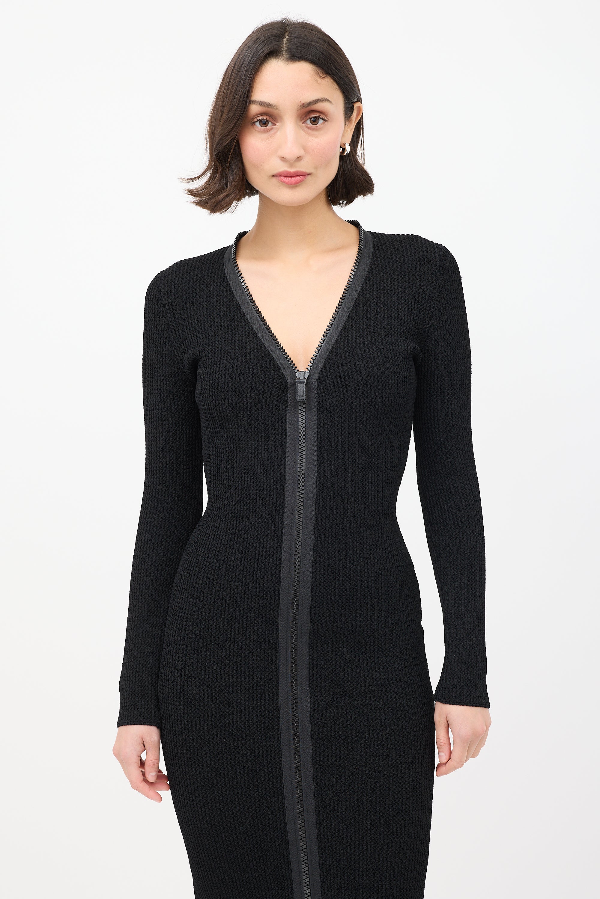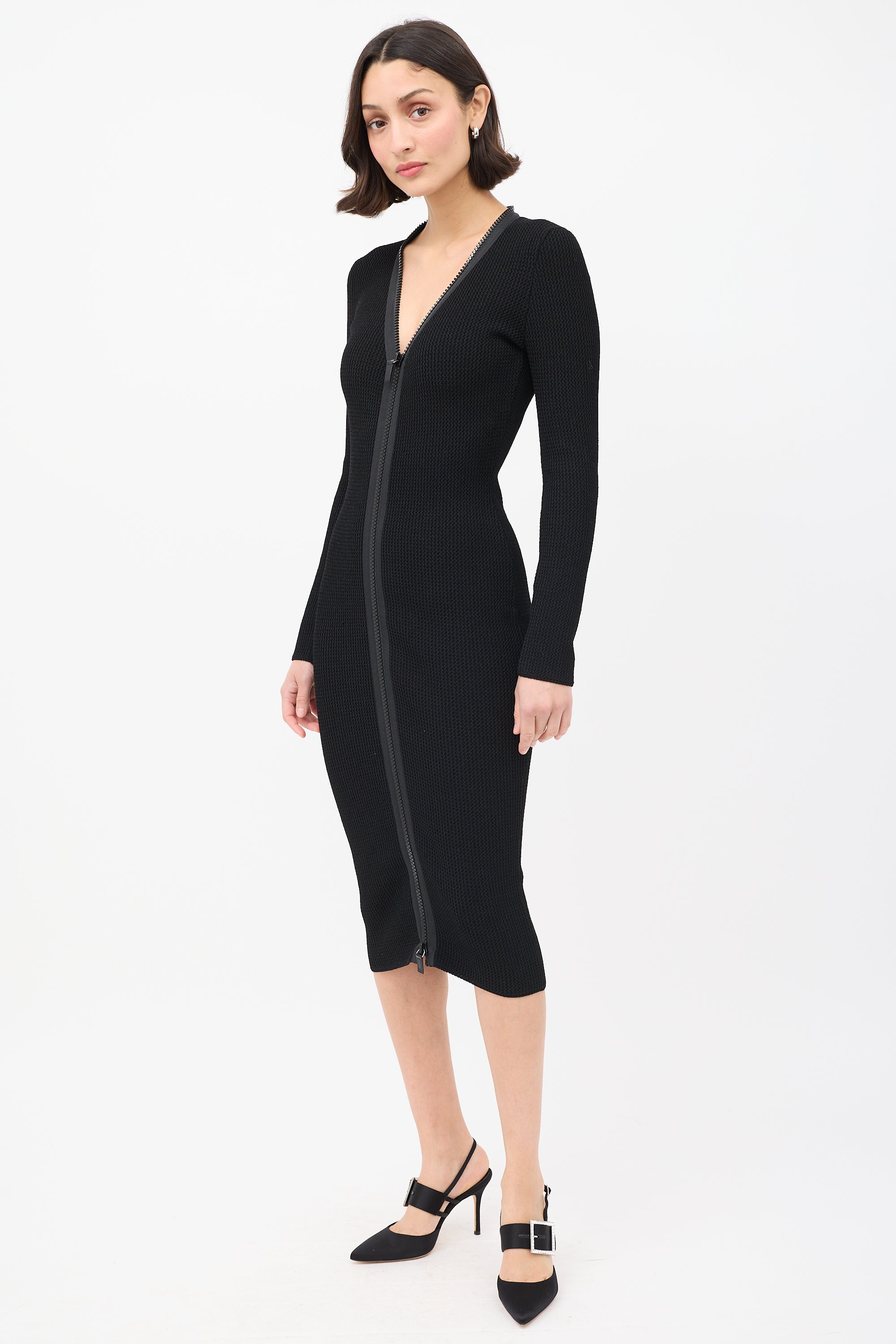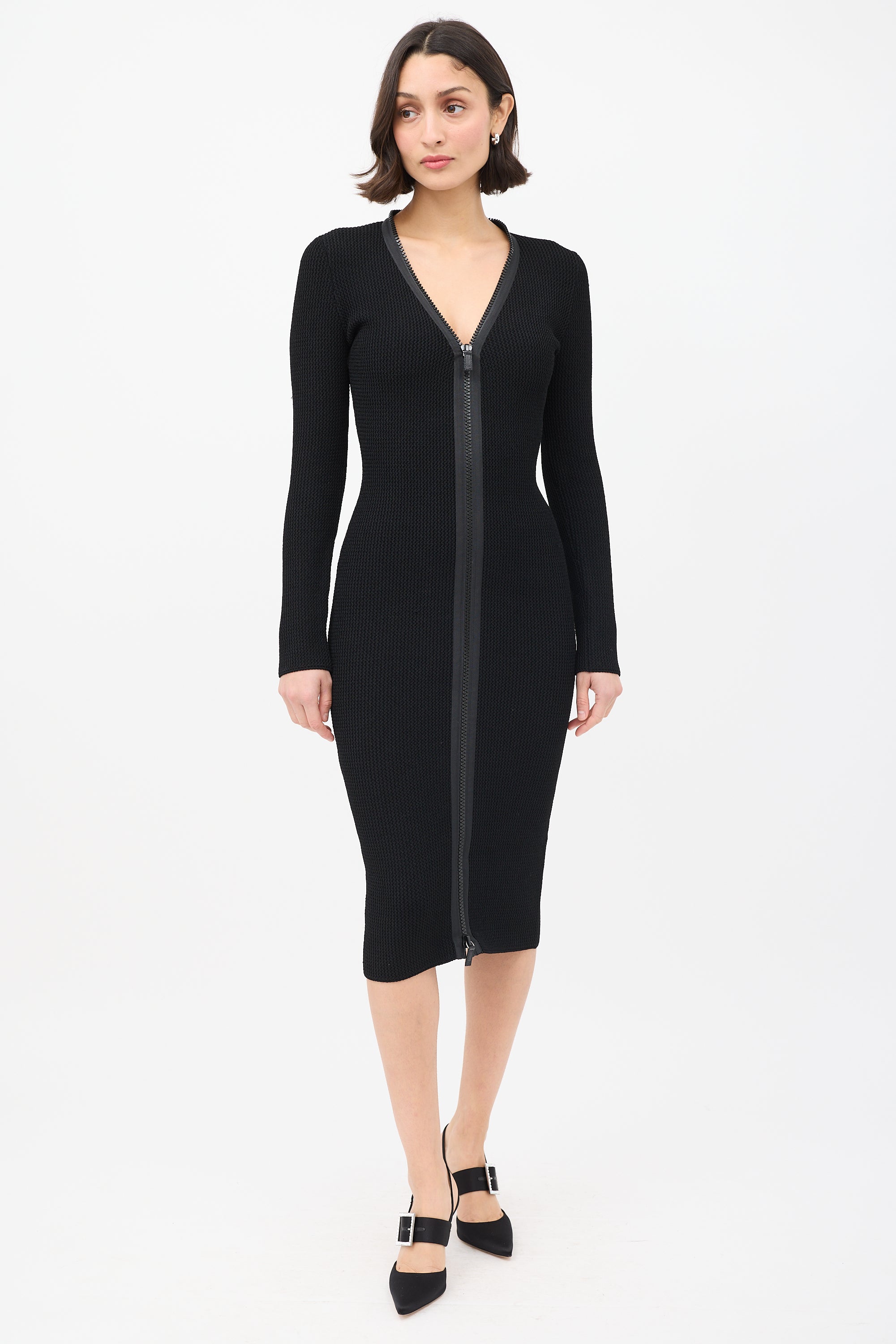 Pre-owned Tom Ford black knit midi dress featuring a V-neckline, full front double zip closure, and long sleeves.