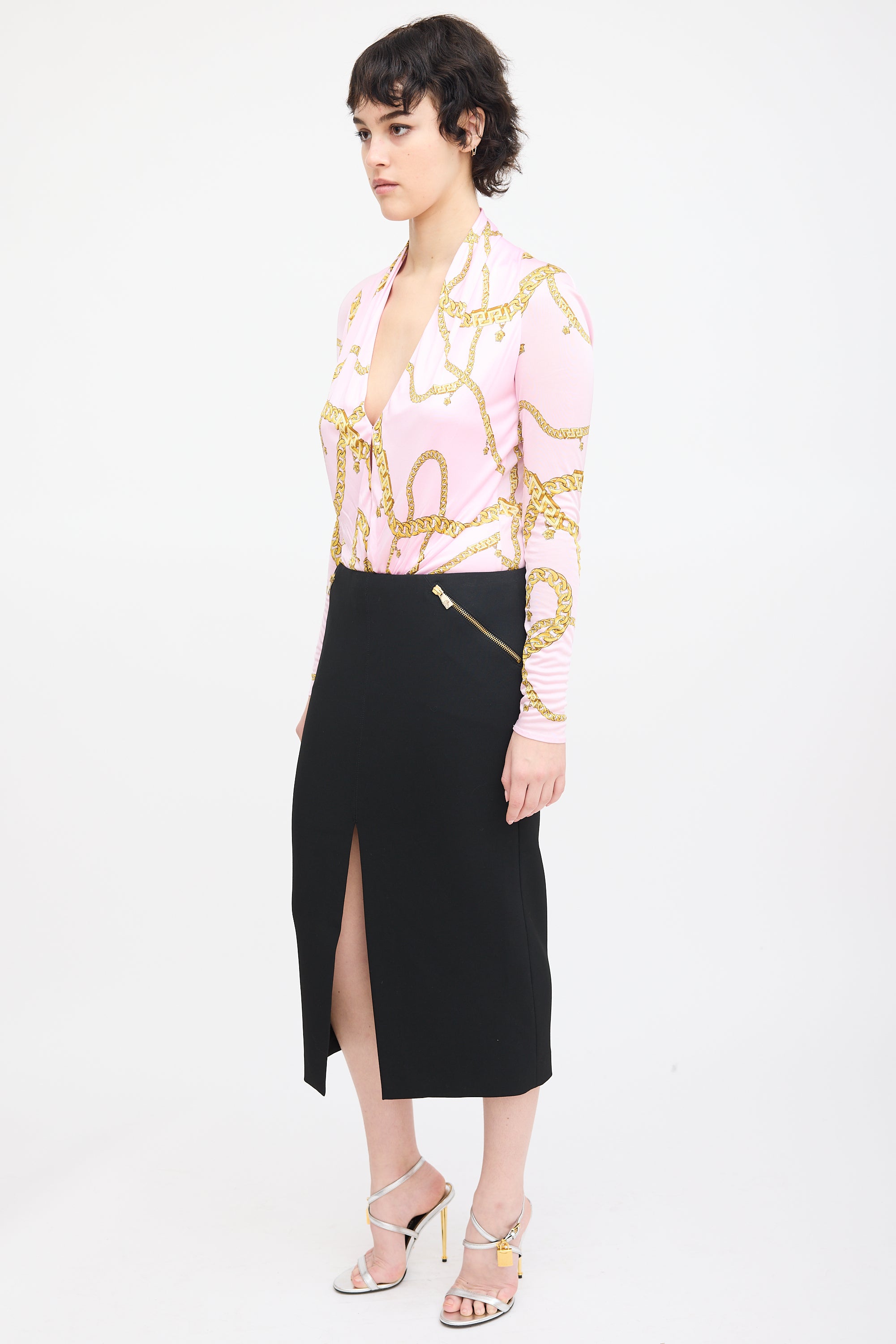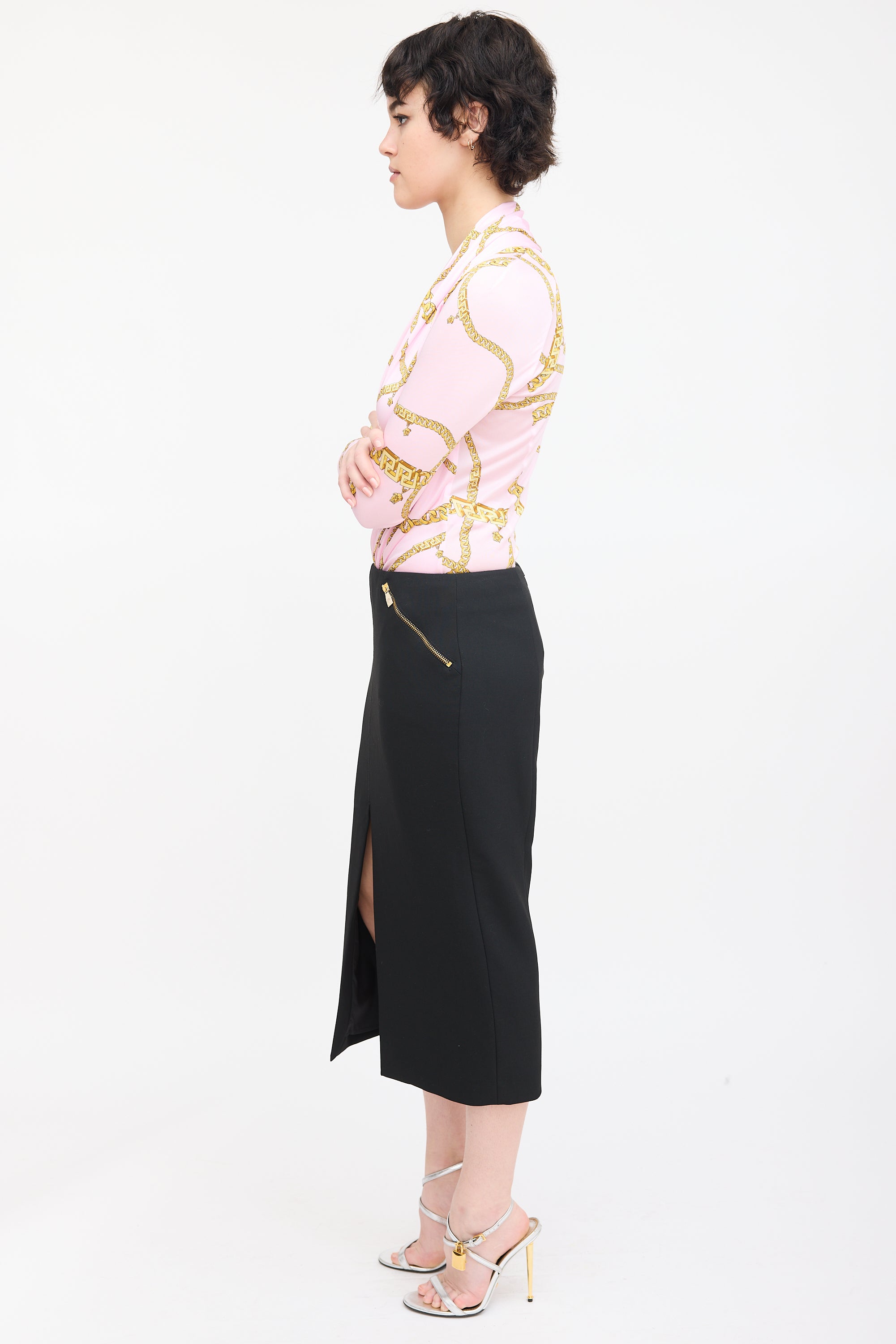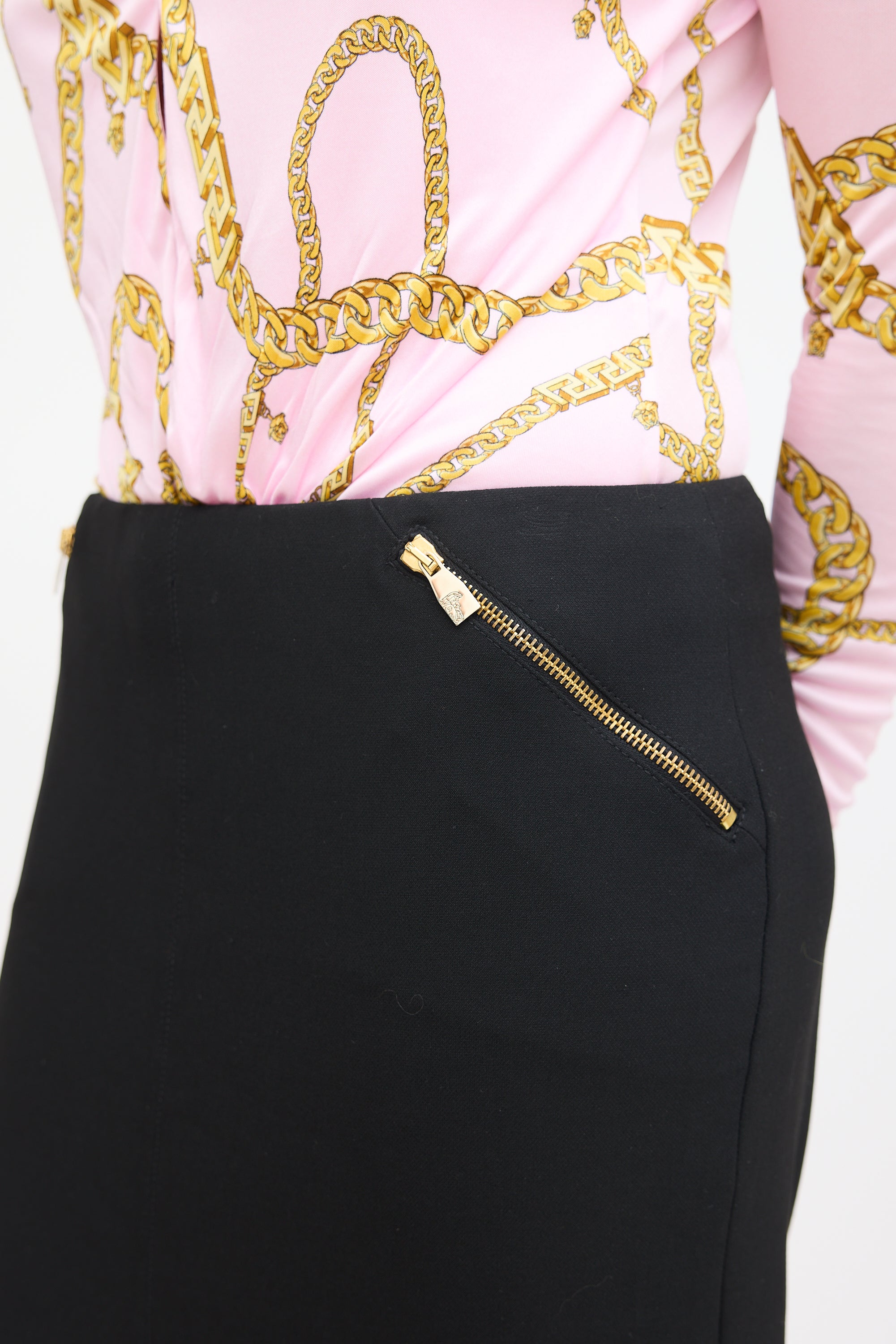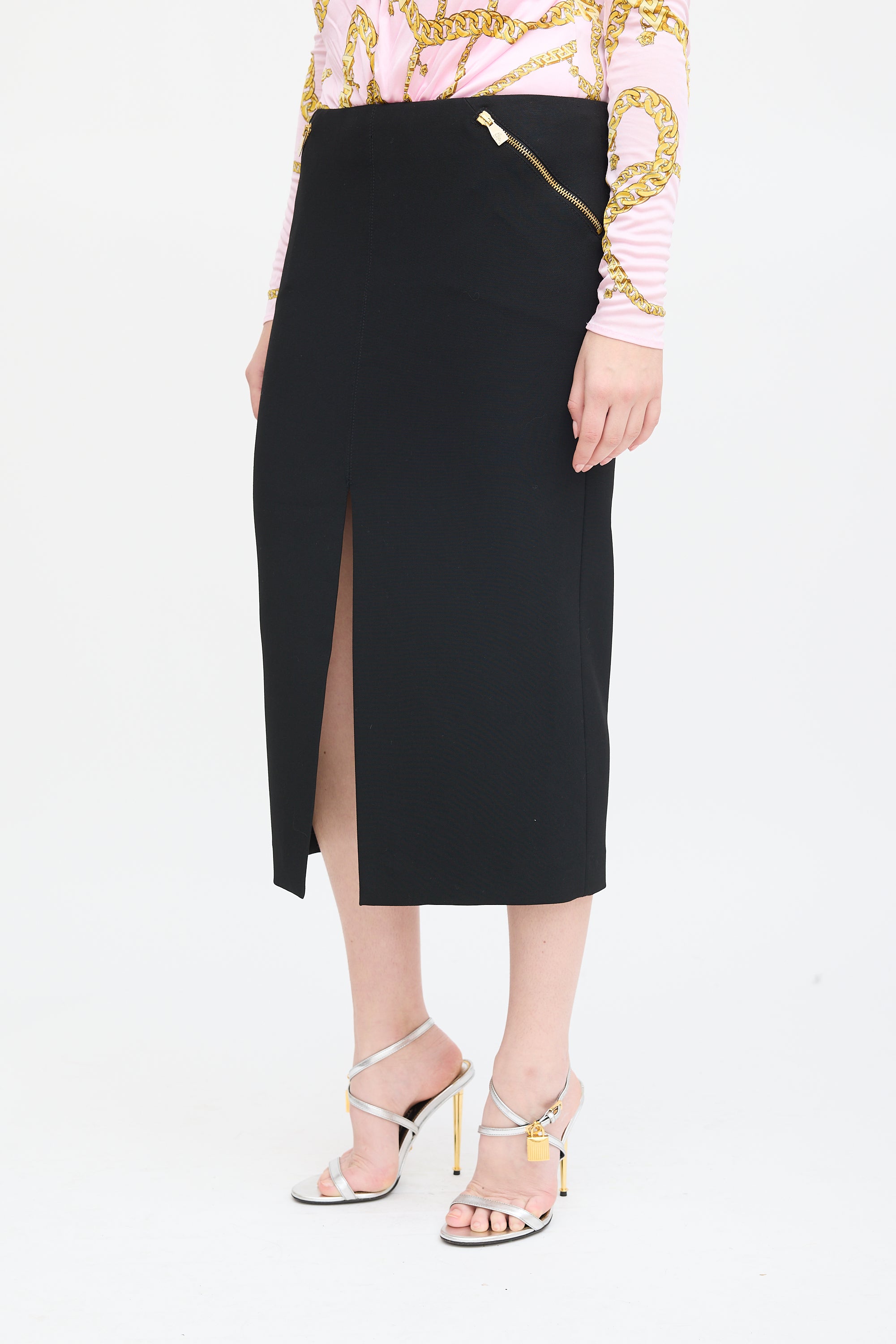 Pre-owned Versace Collection black midi pencil skirt featuring a high waist, front slit, two gold tone zip pockets at front waist, and concealed back zip closure. Lined.