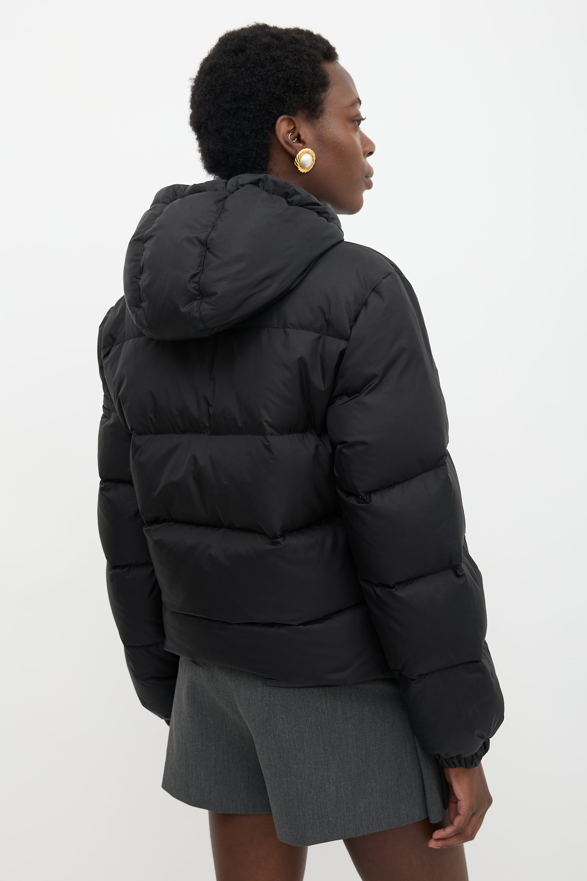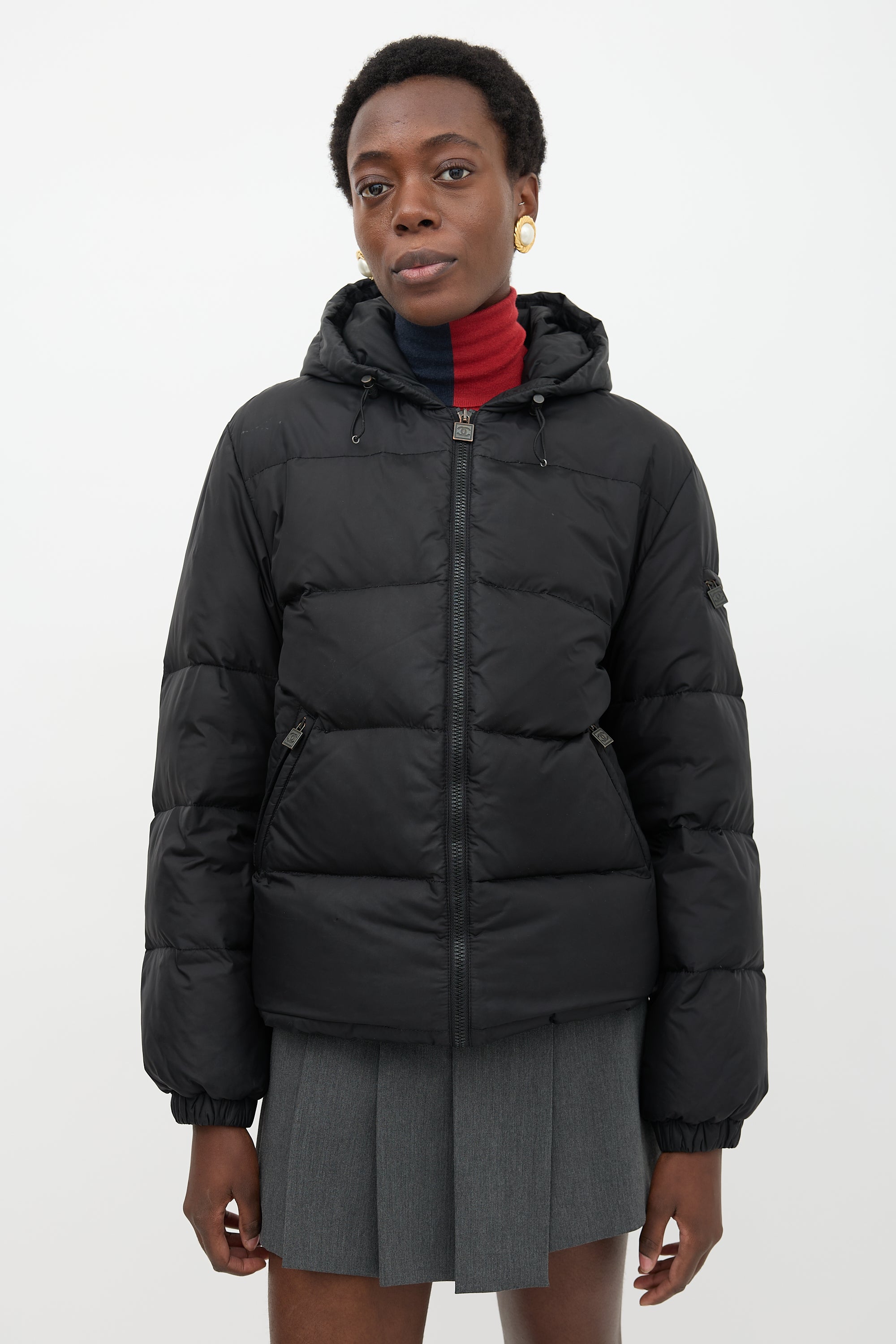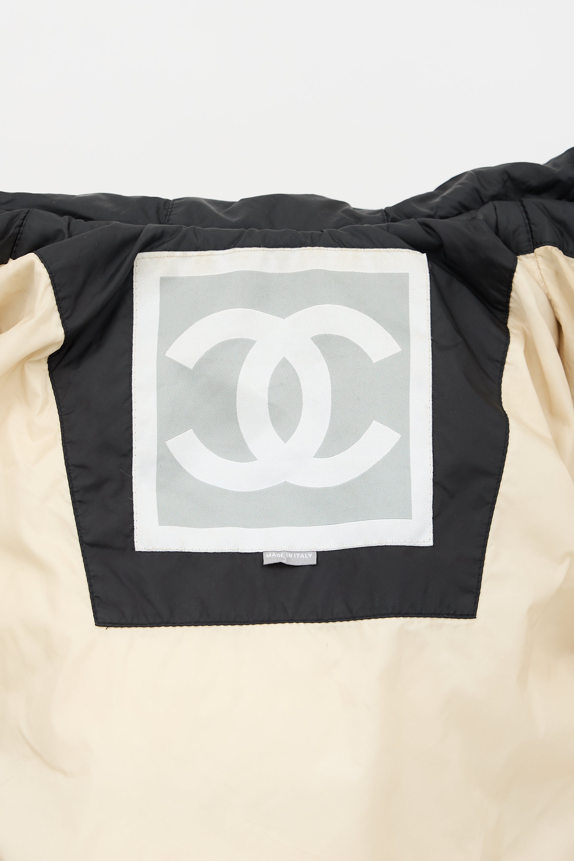 Pre-owned Chanel Fall 2005 black puffer jacket featuring drawcord hood, zip up front, two front zip pockets, two interior zip pockets, zip pocket at left arm, and elasticized hem and cuffs. Padded and lined.