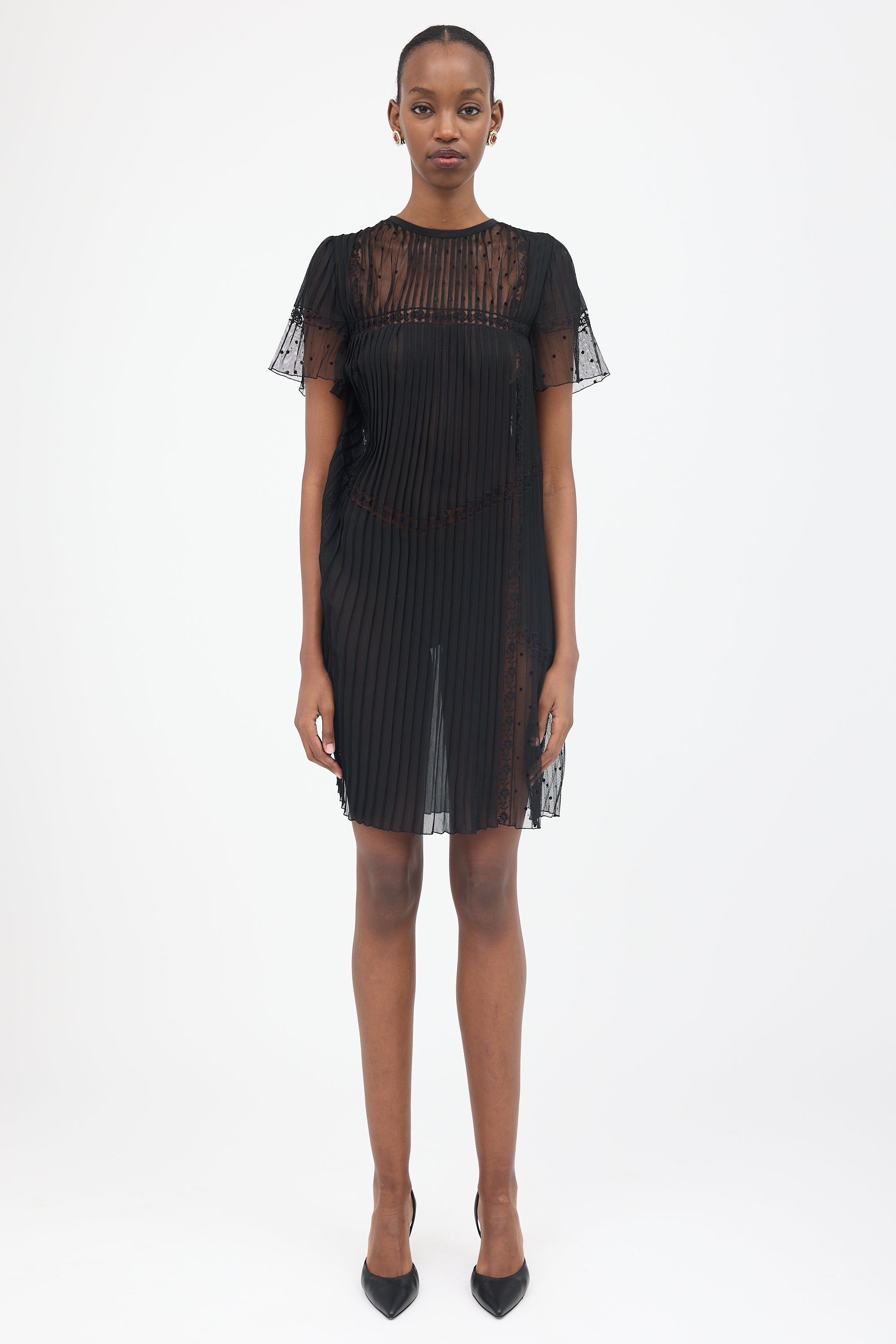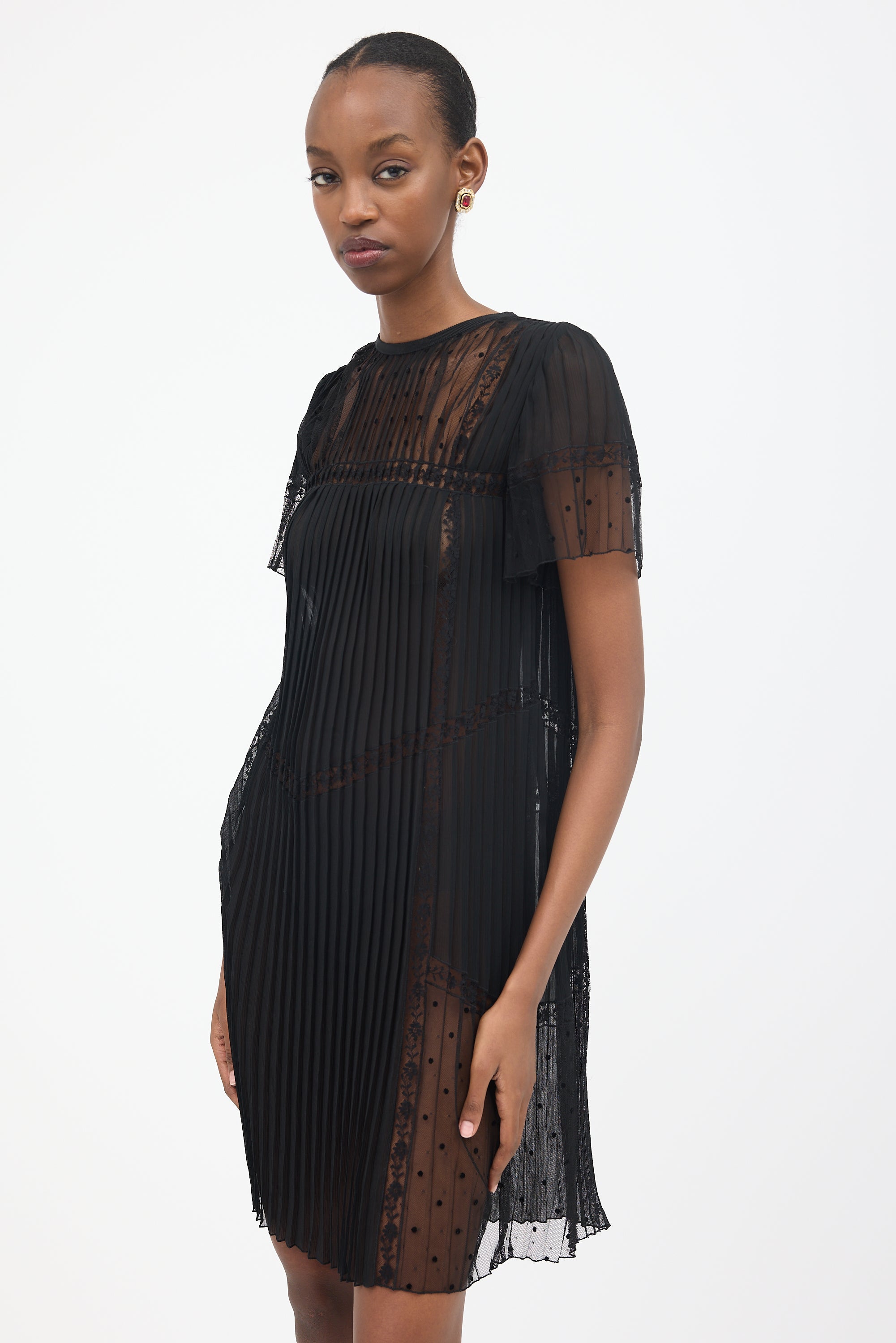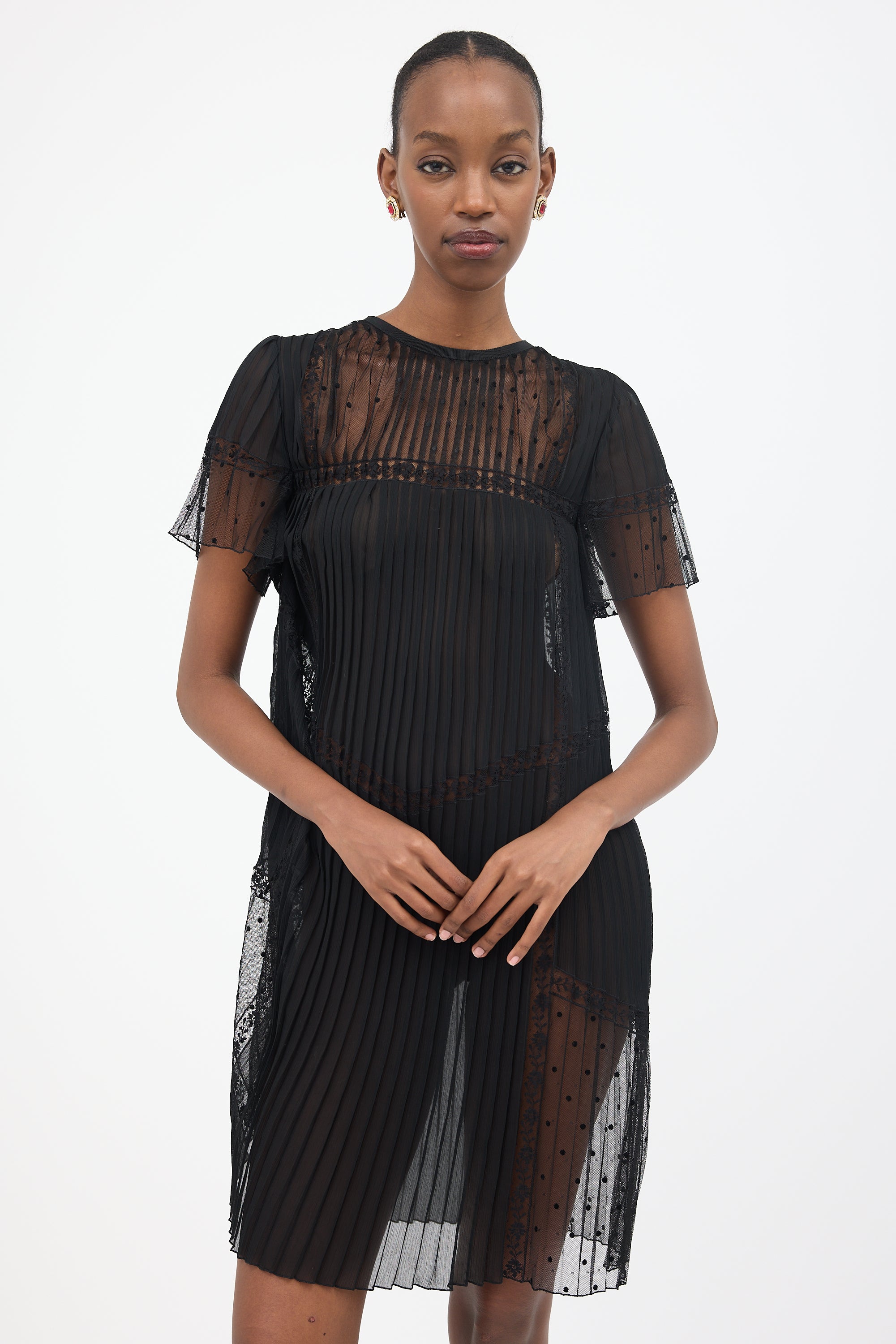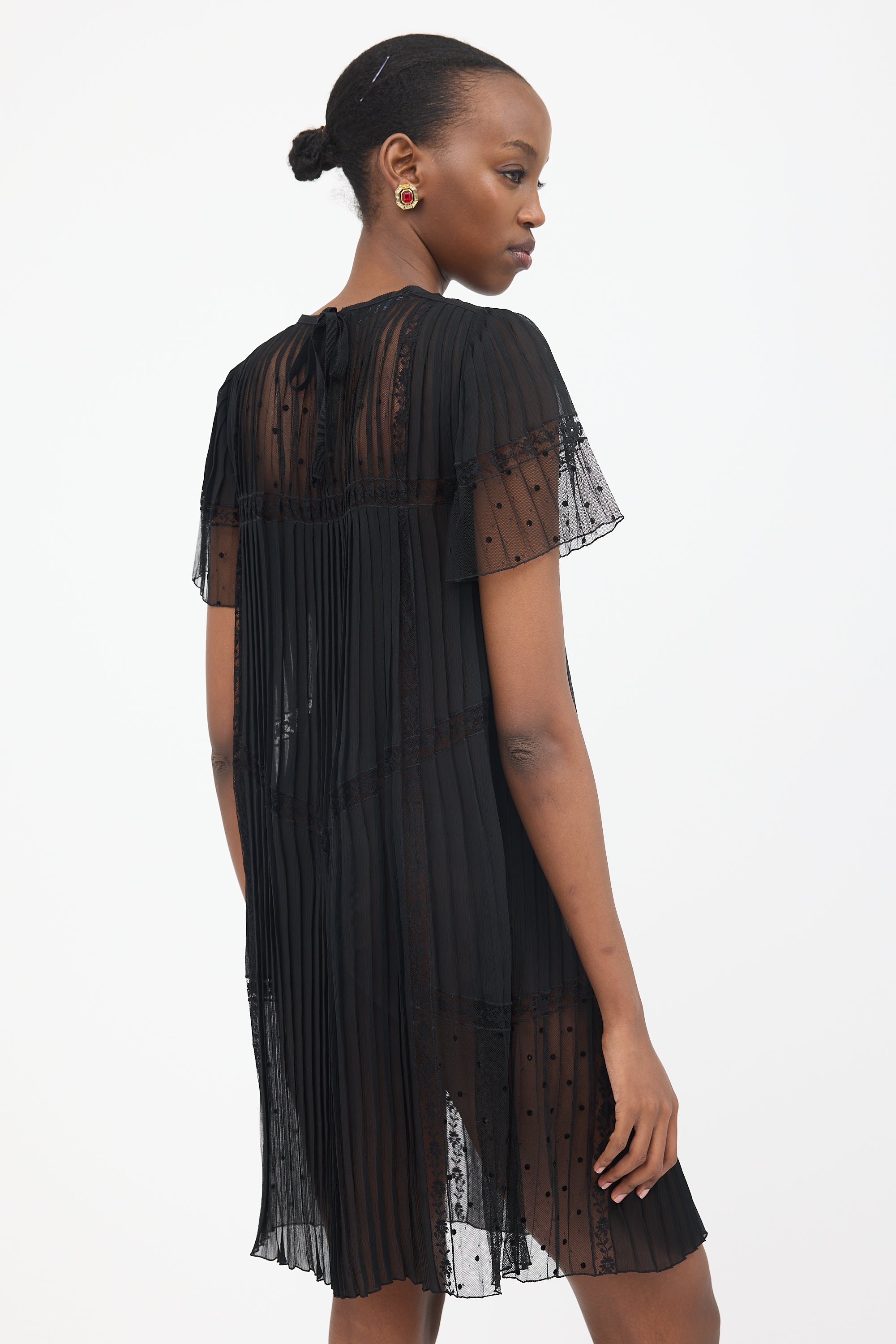 Pre-owned Prada black sheer pleated dress featuring a round neckline, grosgrain trims, self-tie back collar, and lace and polka dot jacquard panels. Unlined.