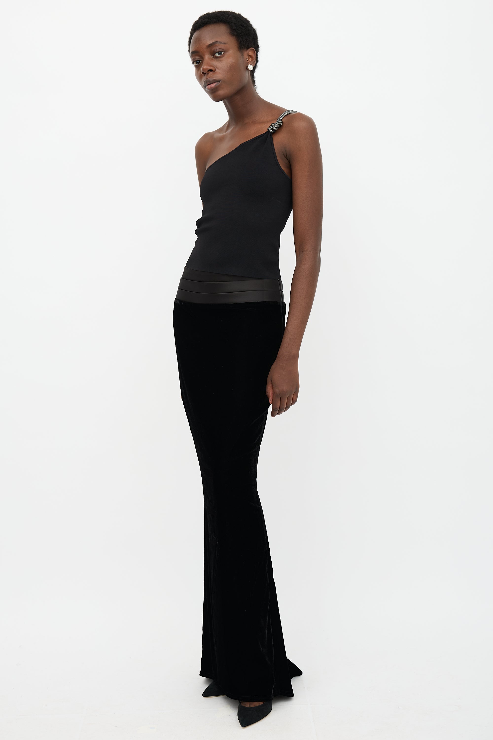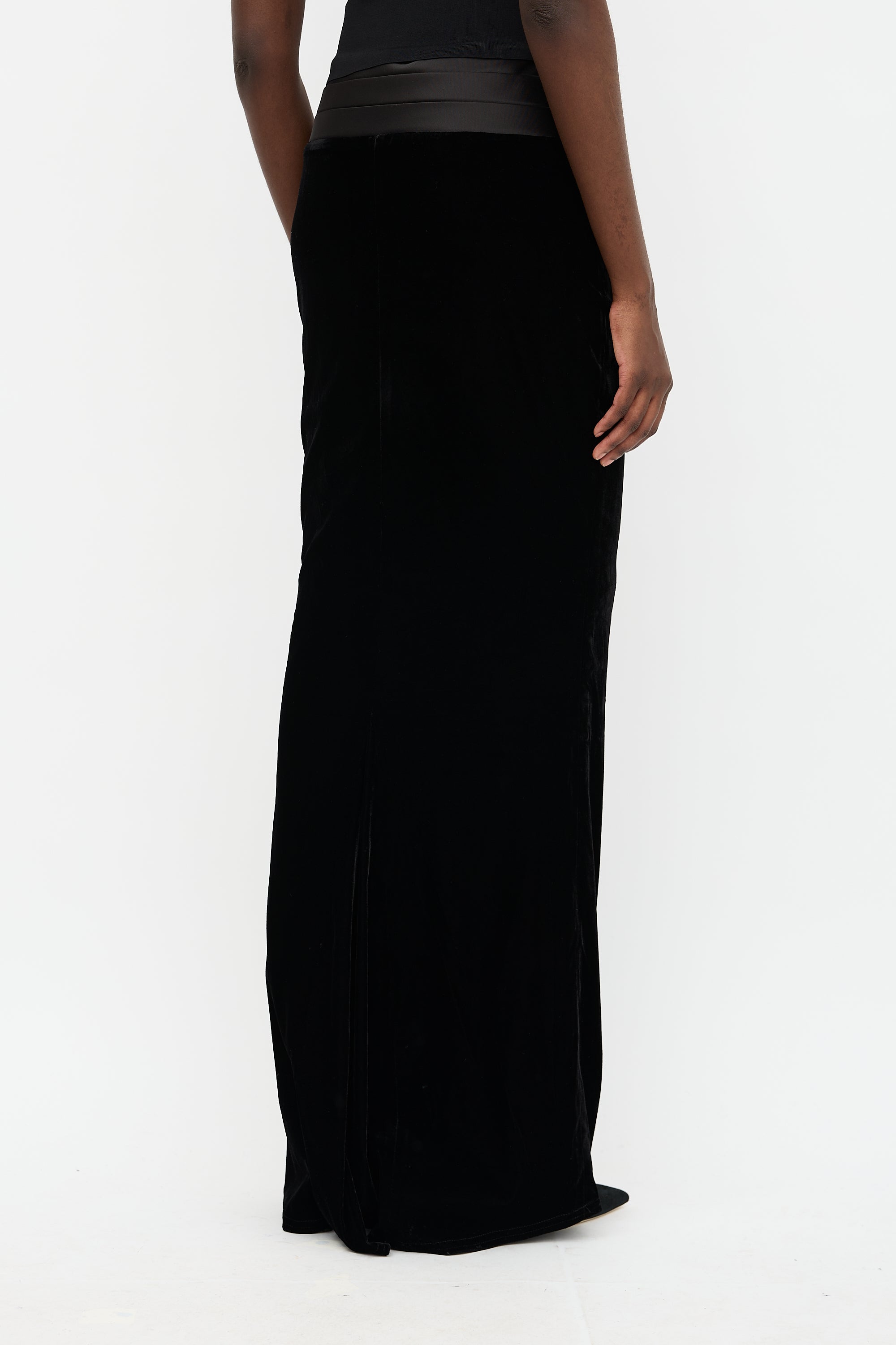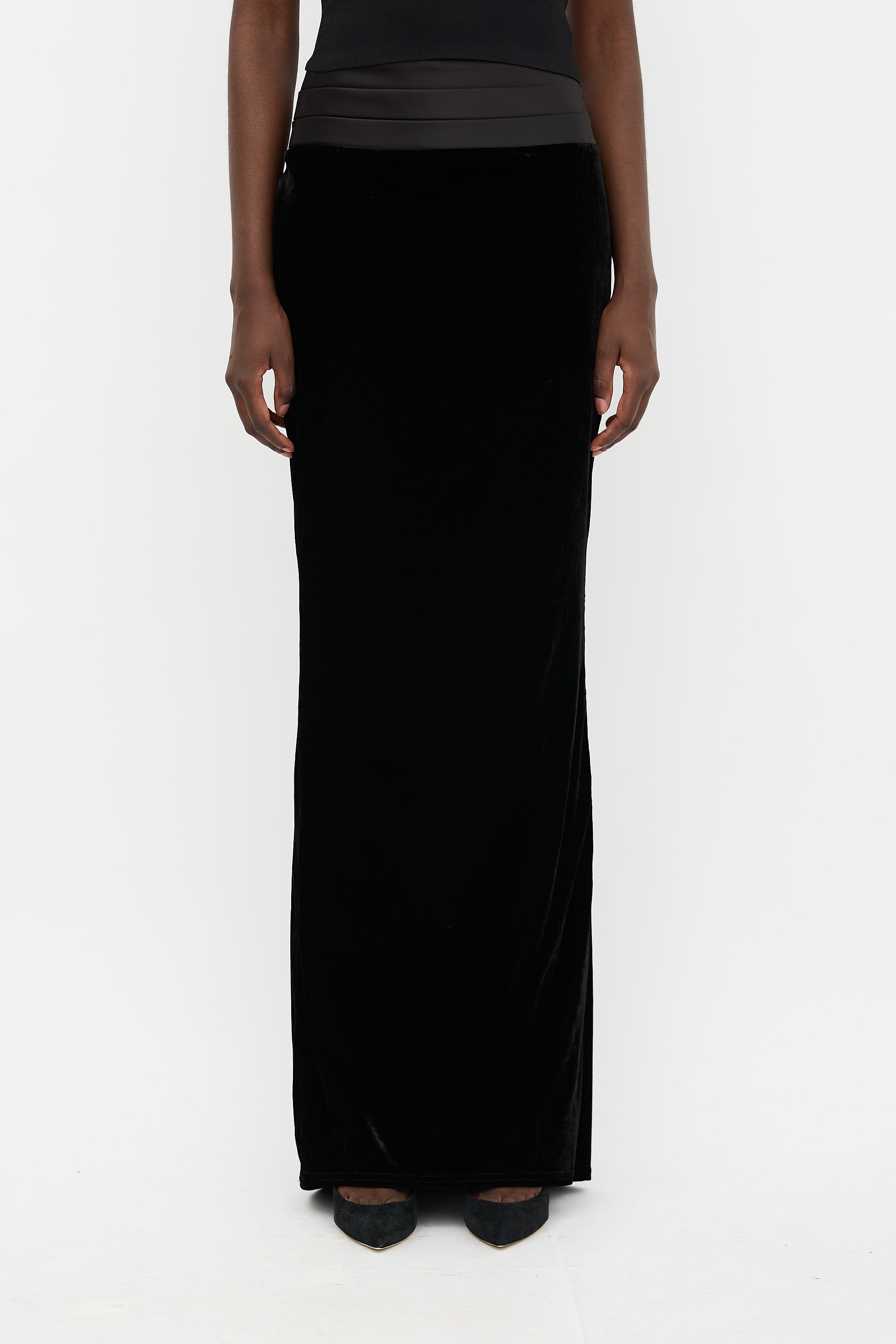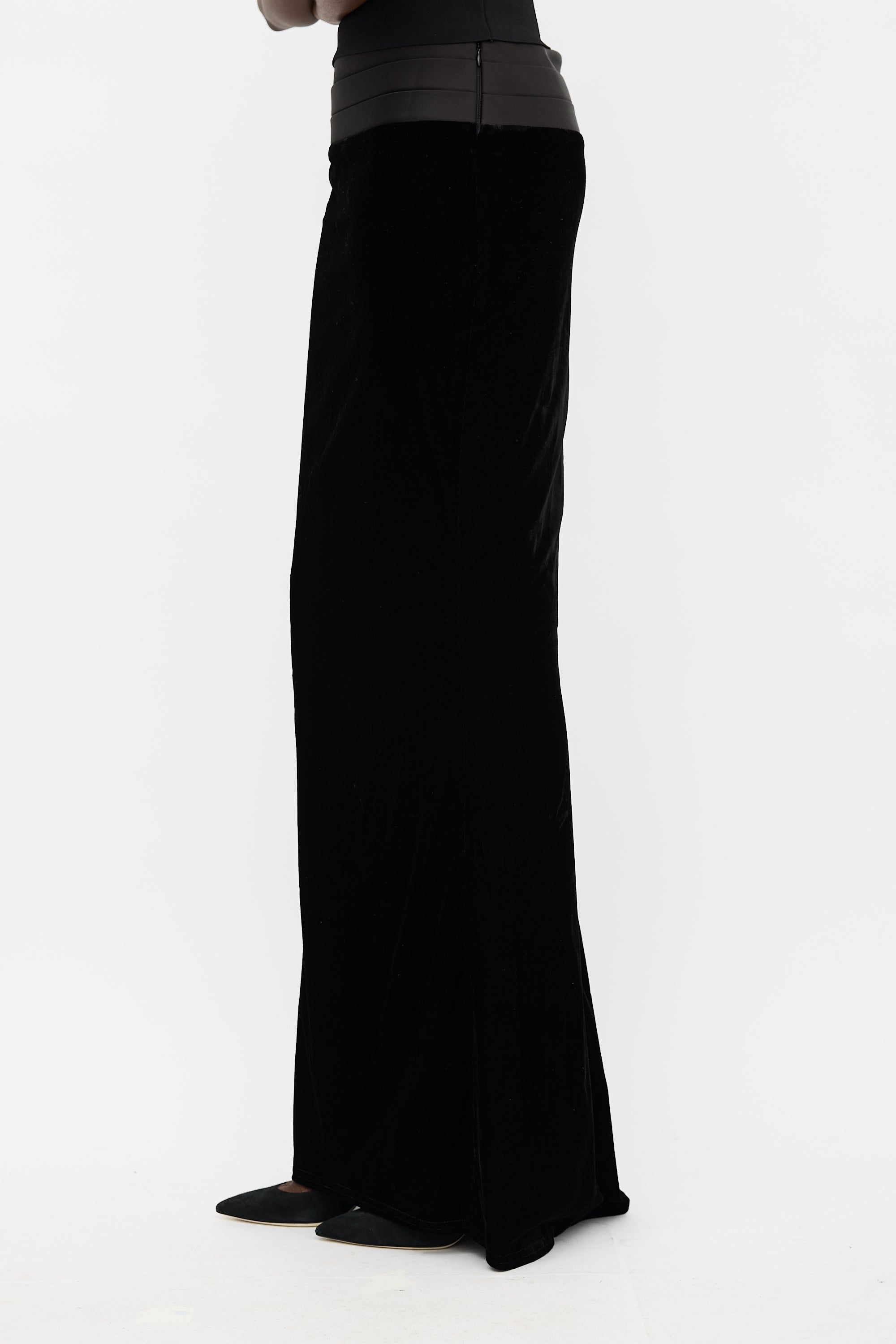 Pre-owned Retrofête black velvet maxi skirt featuring a tonal satin panelled waistband and concealed side zip. Lined.