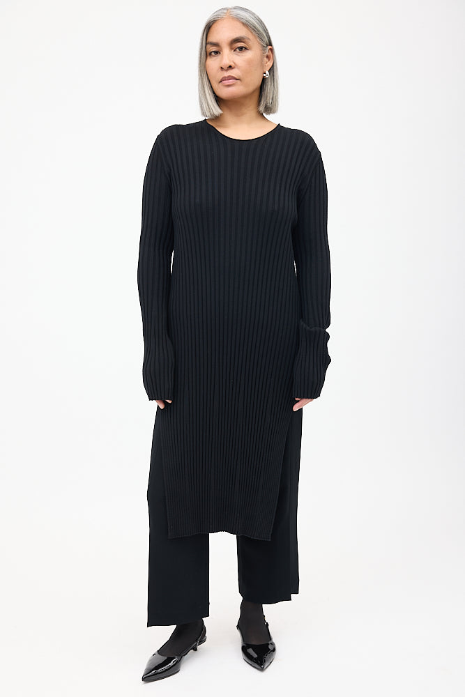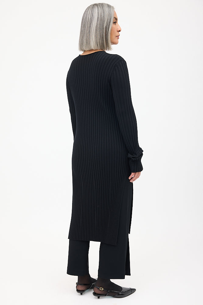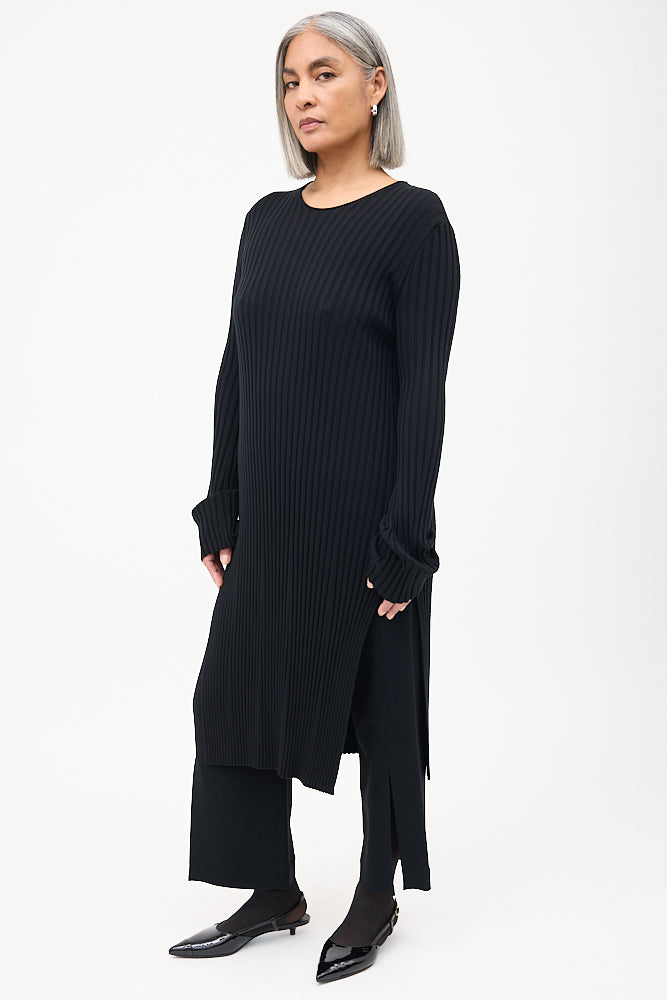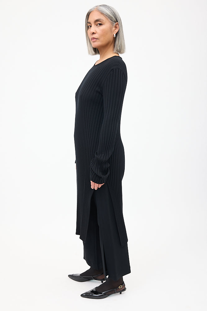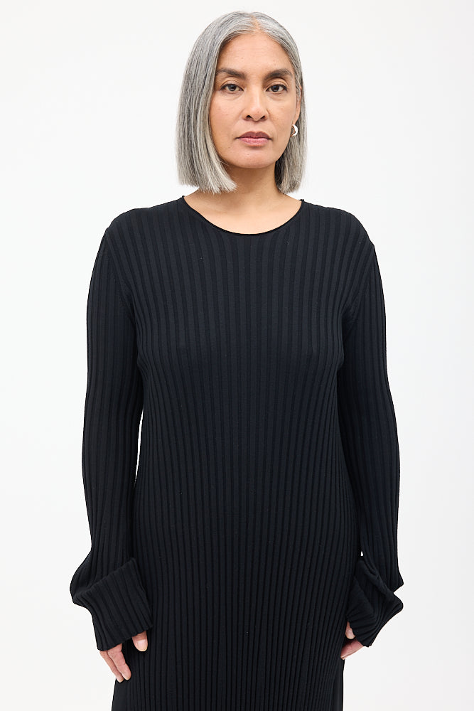 Pre-owned The Row black wool ribbed knit midi dress featuring a round neckline, long sleeves, and side vents.