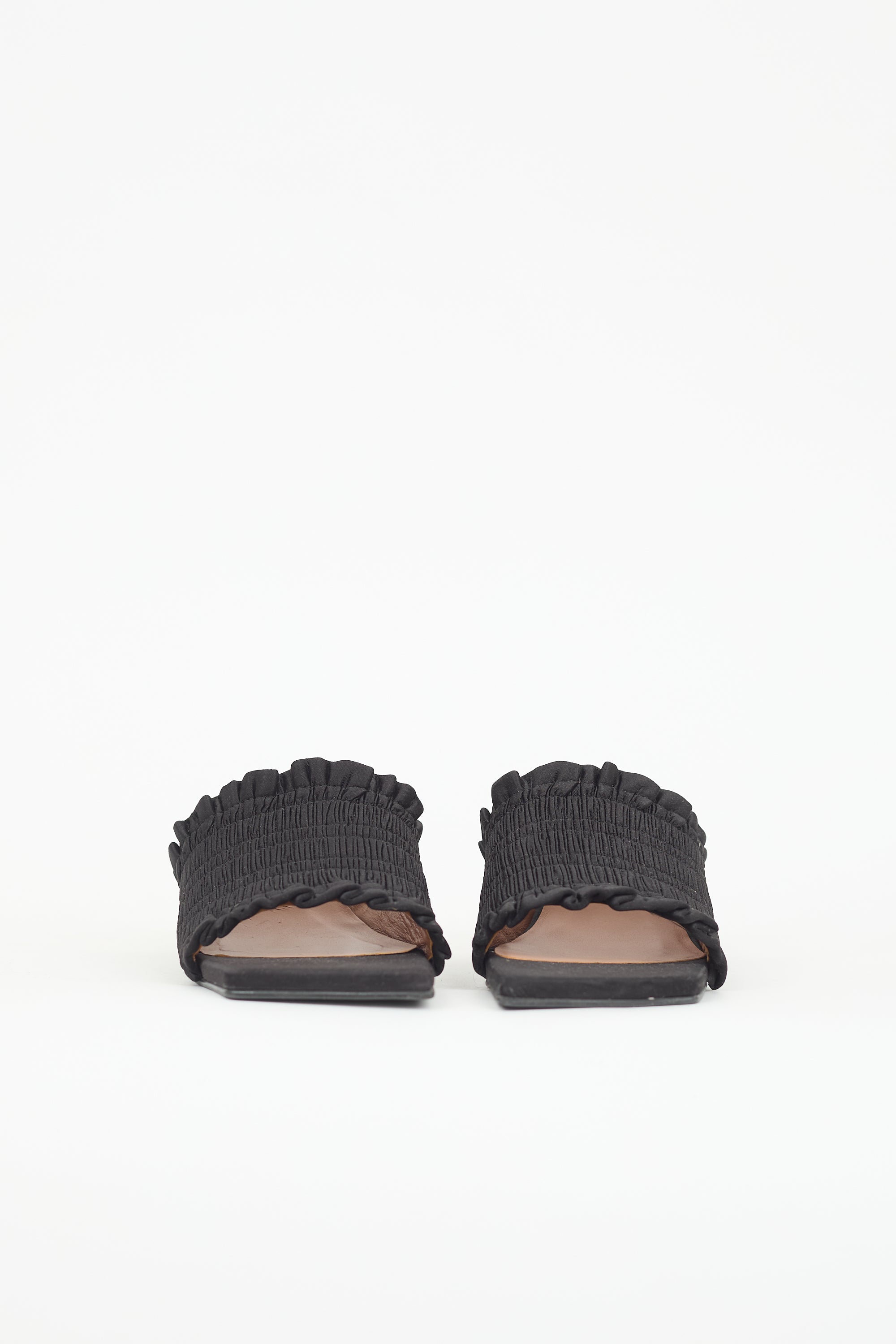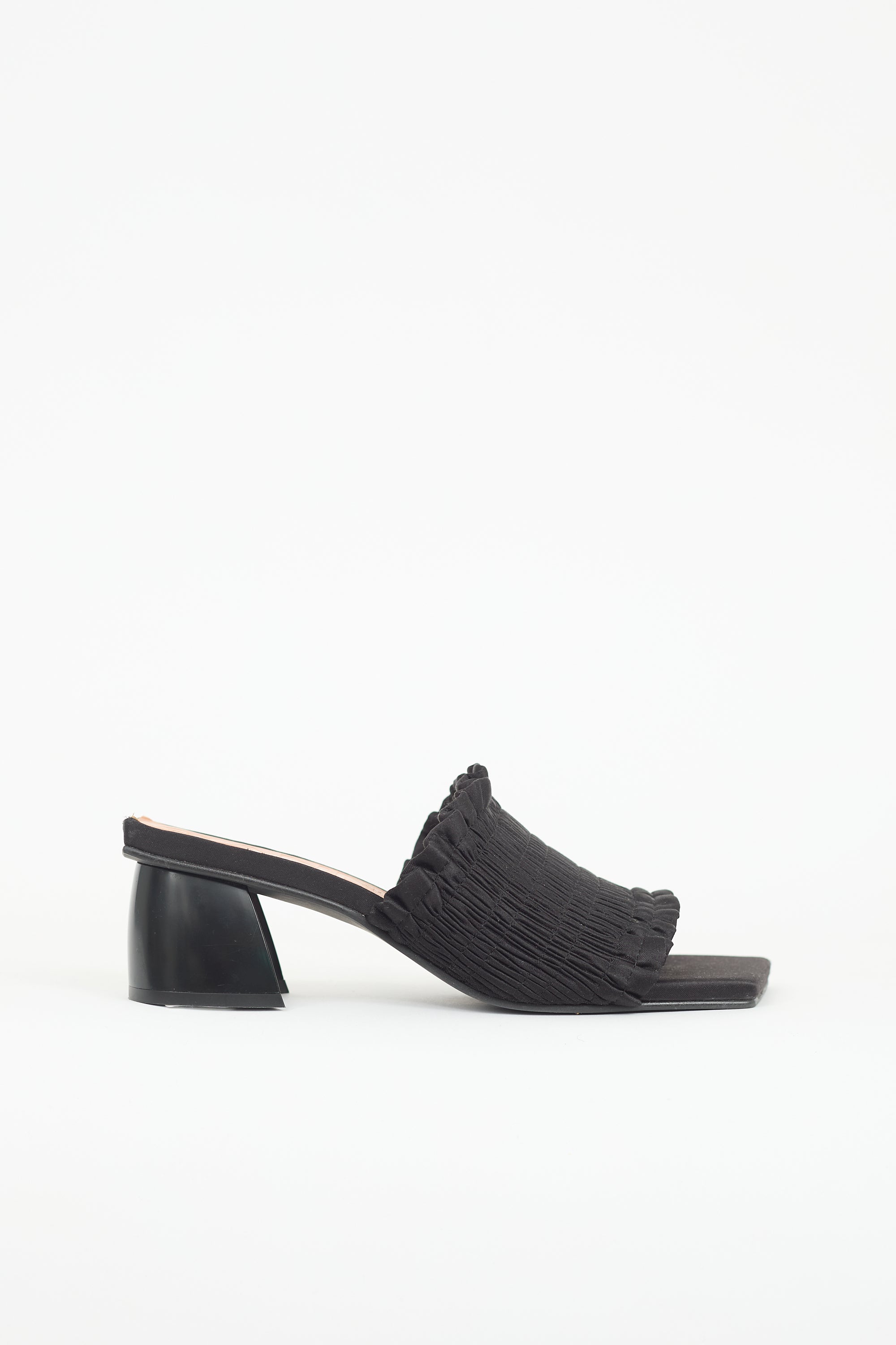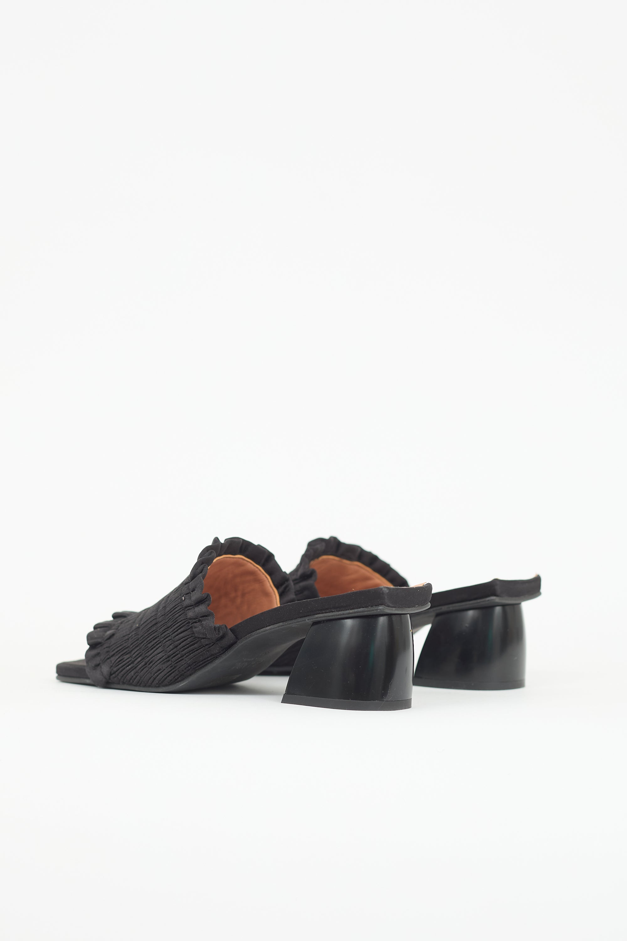 Pre-owned Ganni black satin Smock sandal featuring an open square toe, smocked strap across vamp with ruffled edges, slip on entry, and a curved block heel.