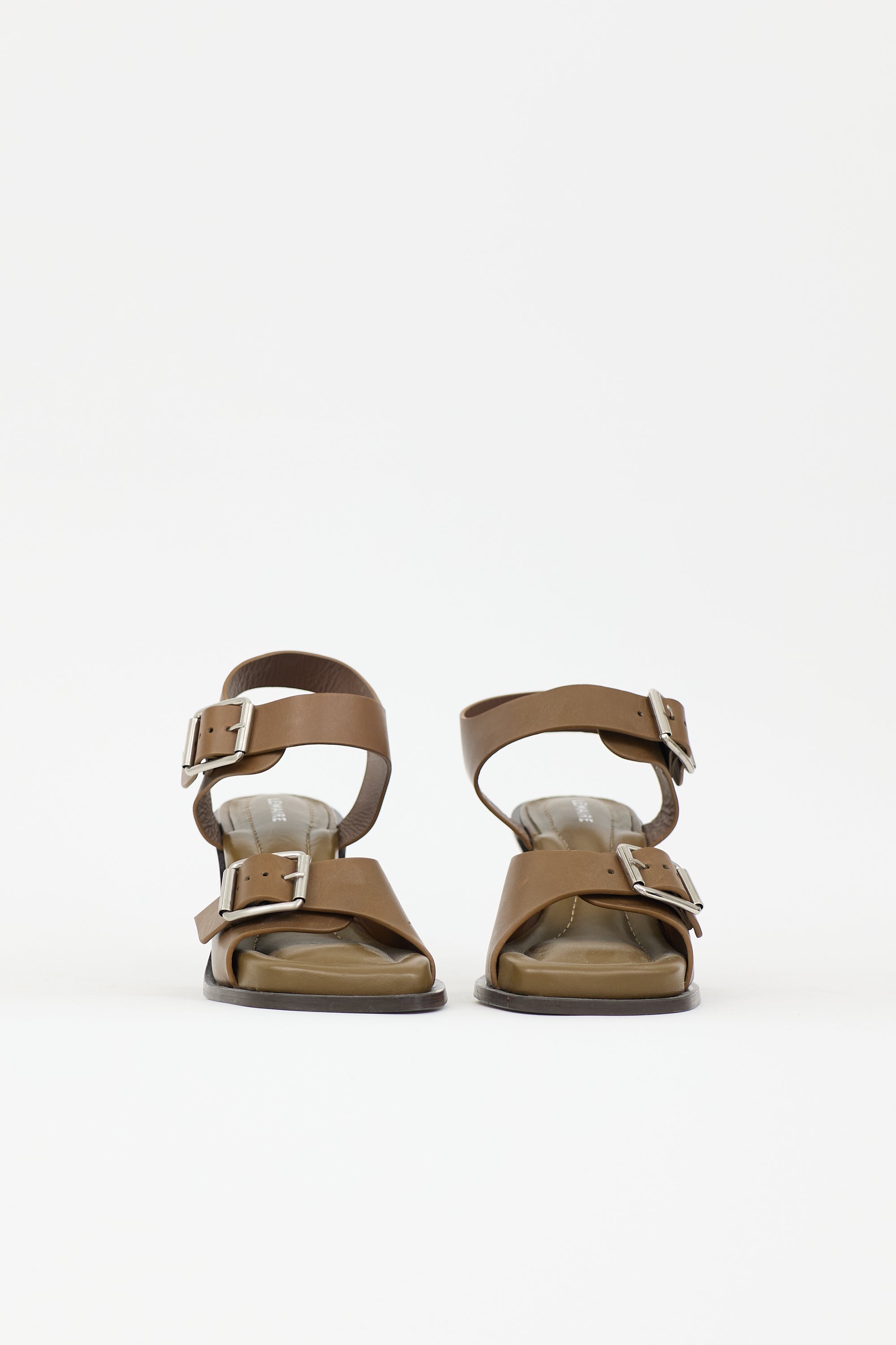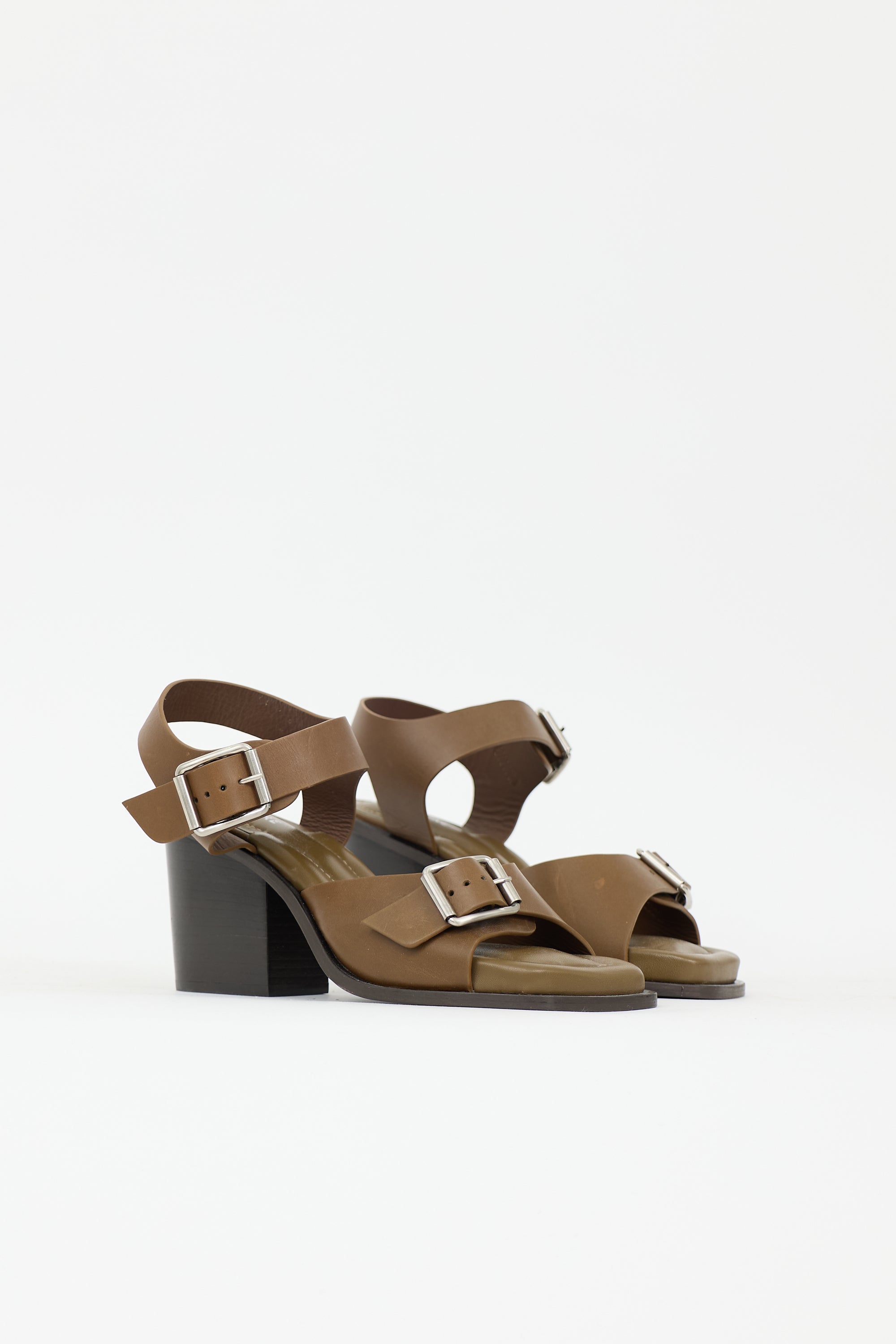 Pre-owned Lemaire brown leather sandal featuring squared toe, silver tone hardware, strap across vamp and around ankle with buckle fastening, and a stacked block heel. Comes with original dust bag.