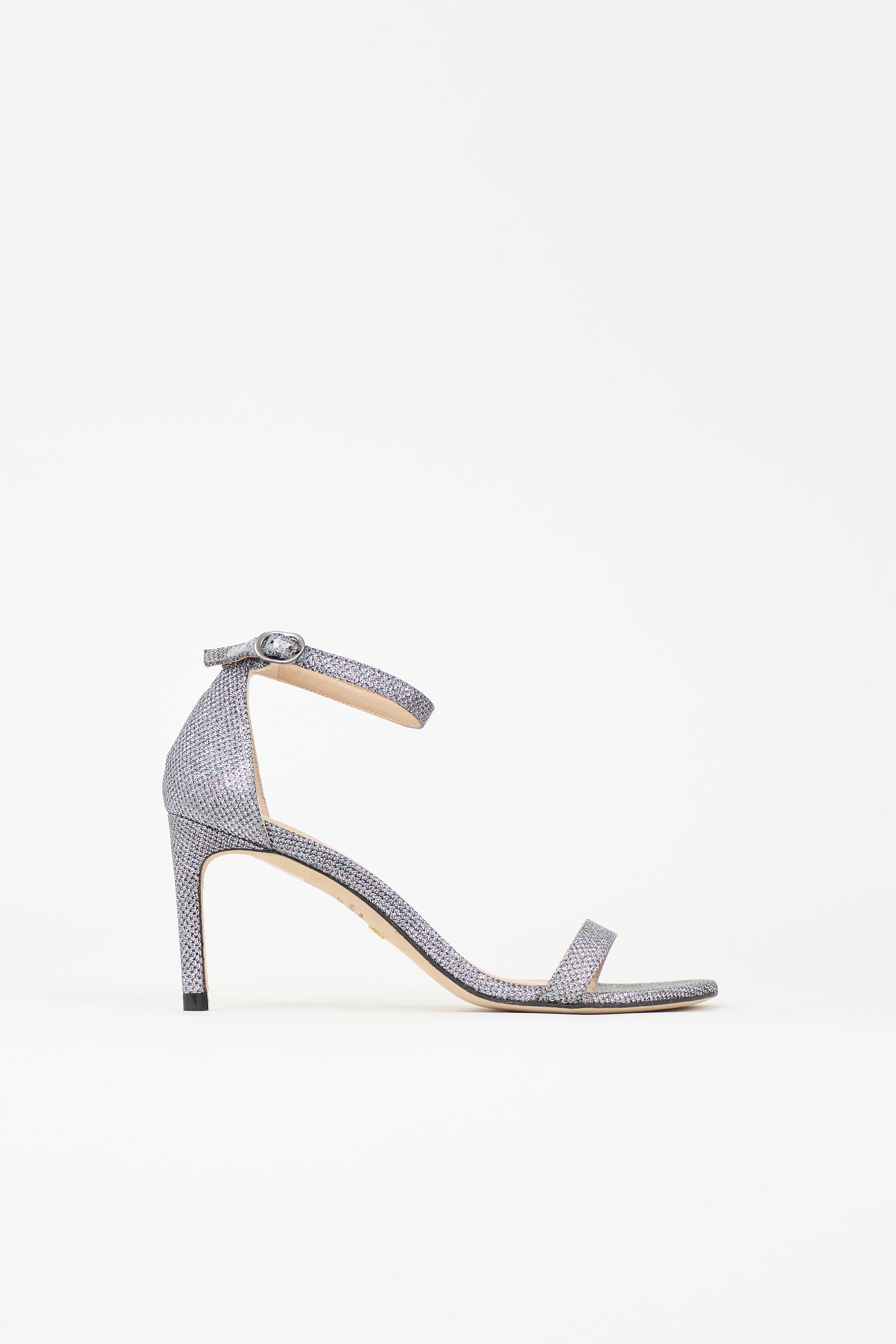 Pre-owned Stuart Weitzman silver glitter Nudist sandals featuring open rounded toe, adjustable ankle strap, and stiletto heel. Includes original dust bag.
