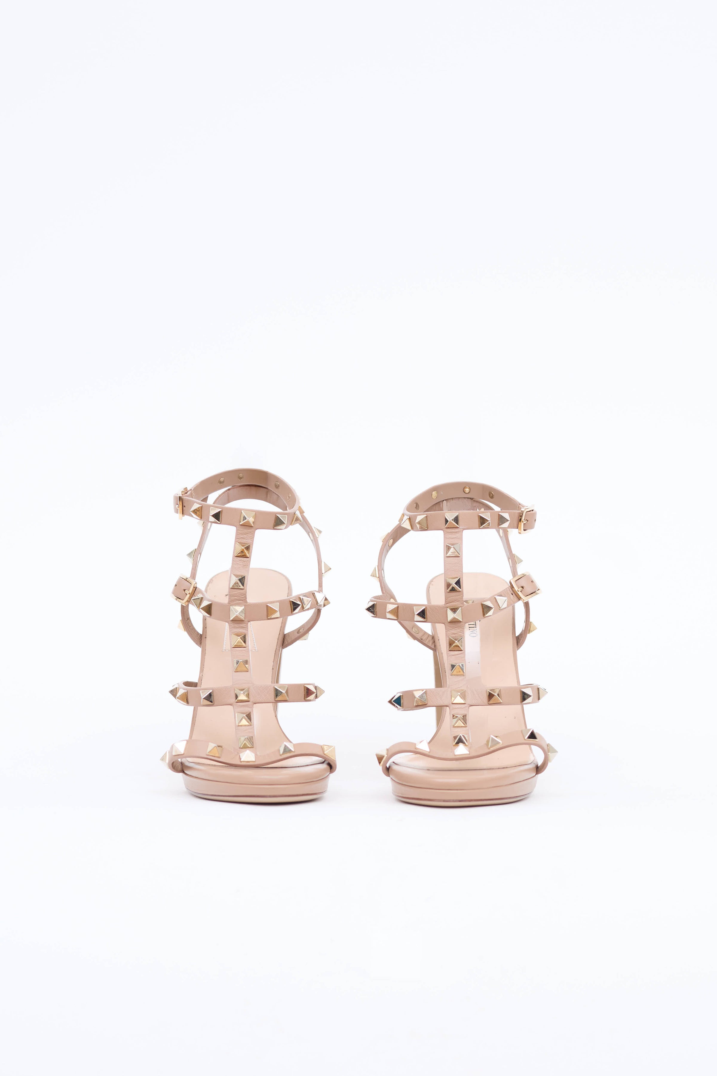 Pre-owned Valentino beige leather sandals featuring an open round toe, gold tone Rockstud embellished cage straps, dual adjustable ankle straps, and covered block heel.