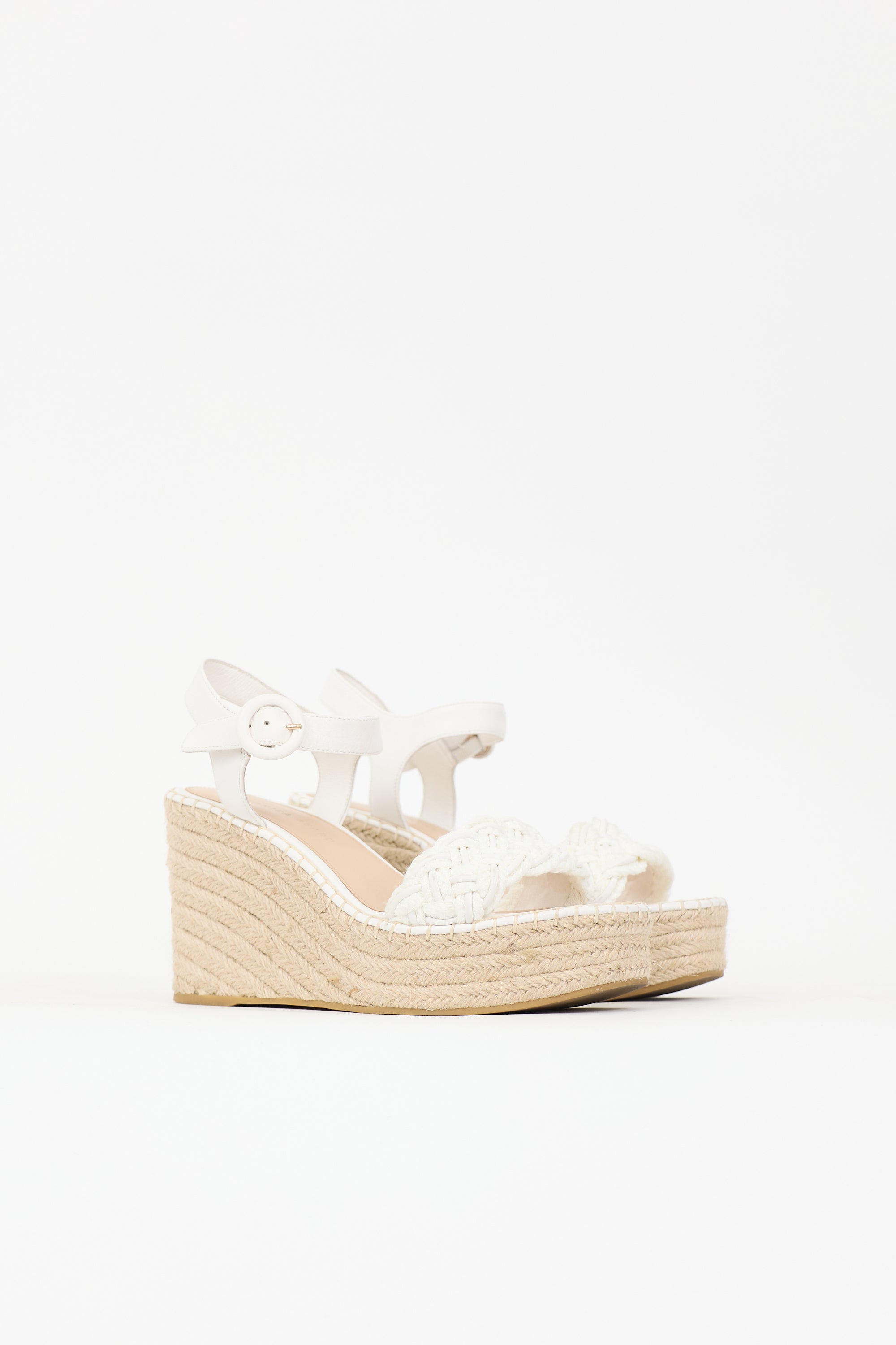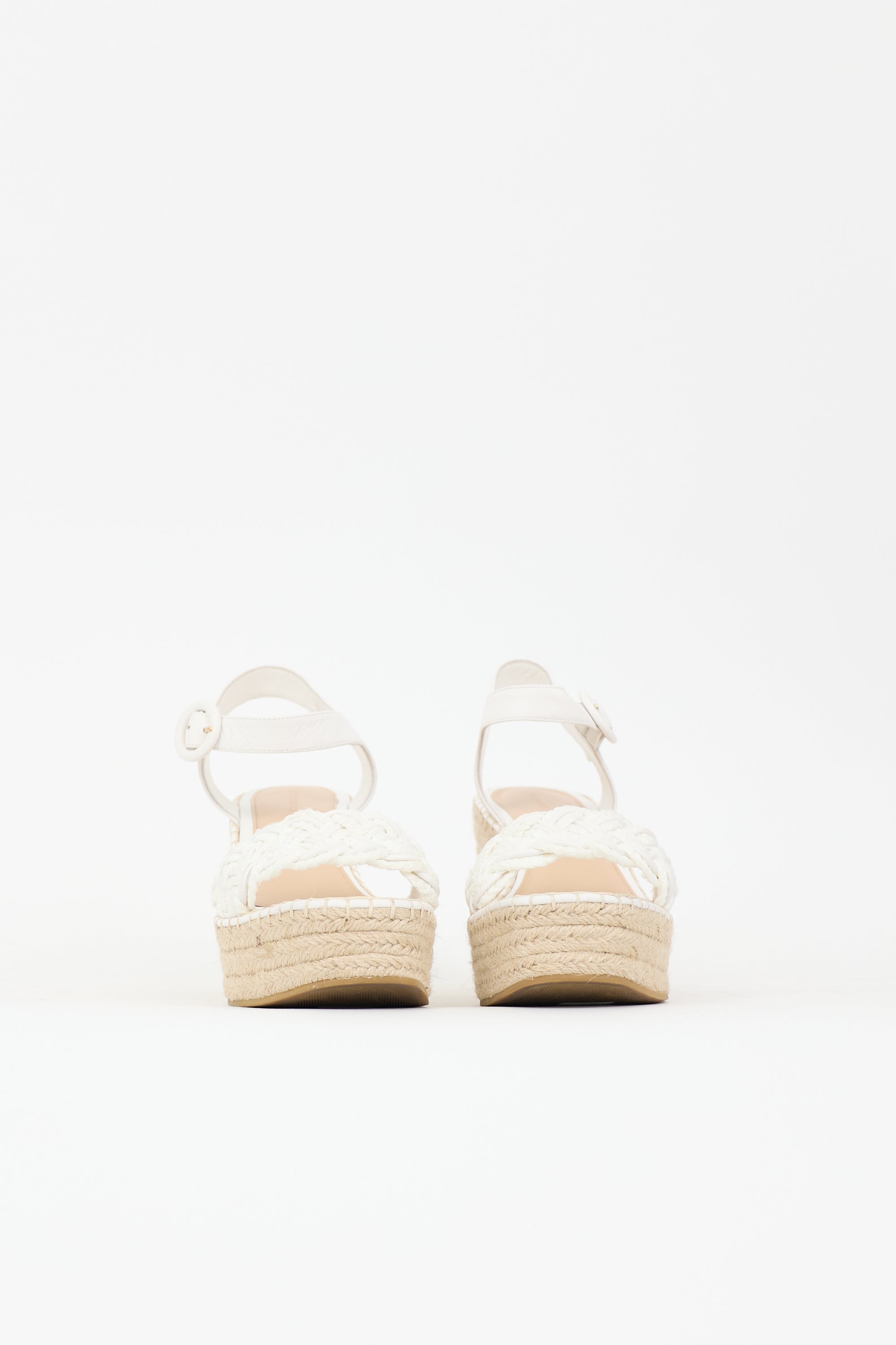 Pre-owned Veronica Beard white leather Reema espadrille sandal featuring a squared toe, braided strap across vamp, adjustable strap at ankle, and braided jute wedge heel.