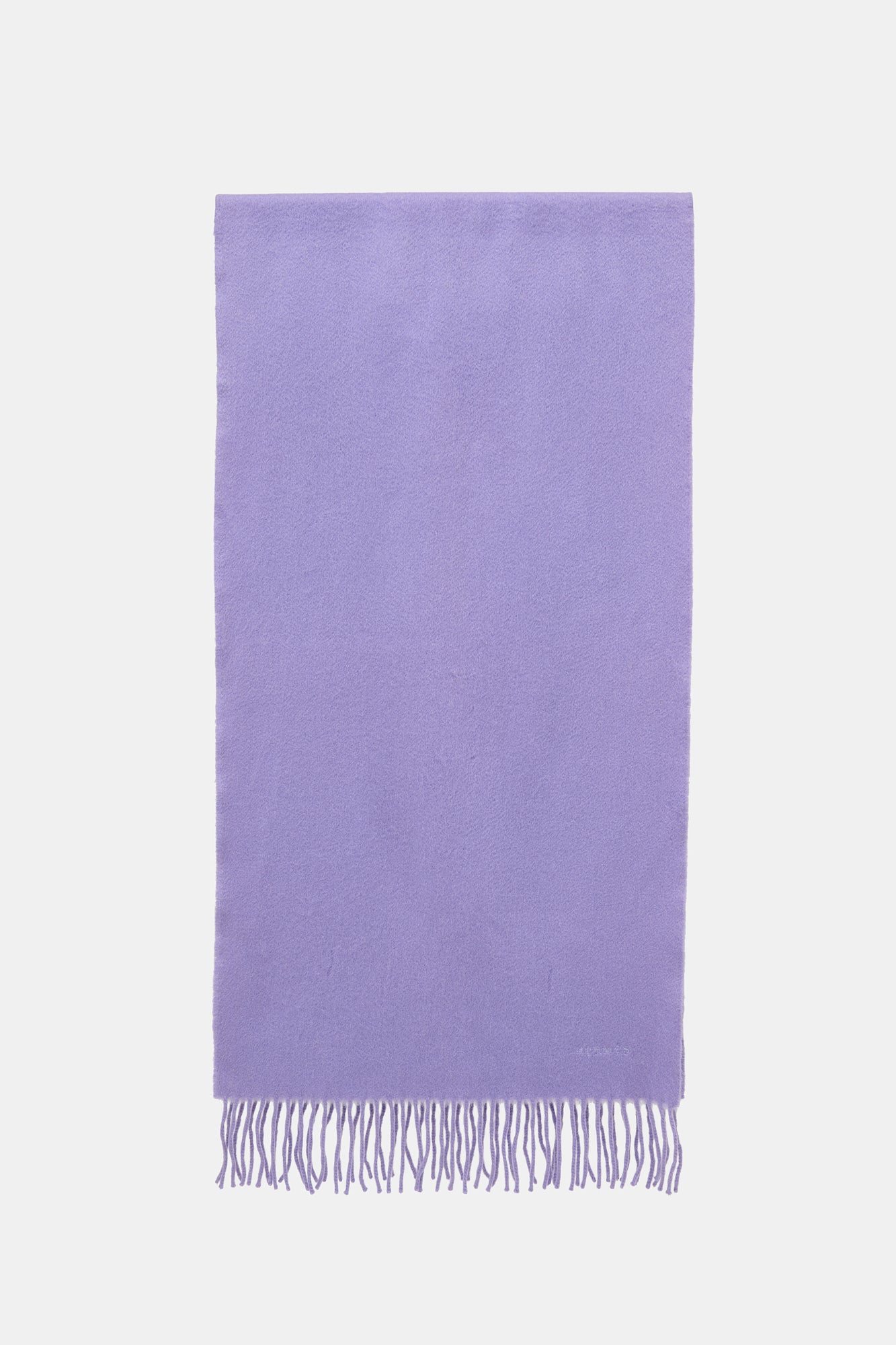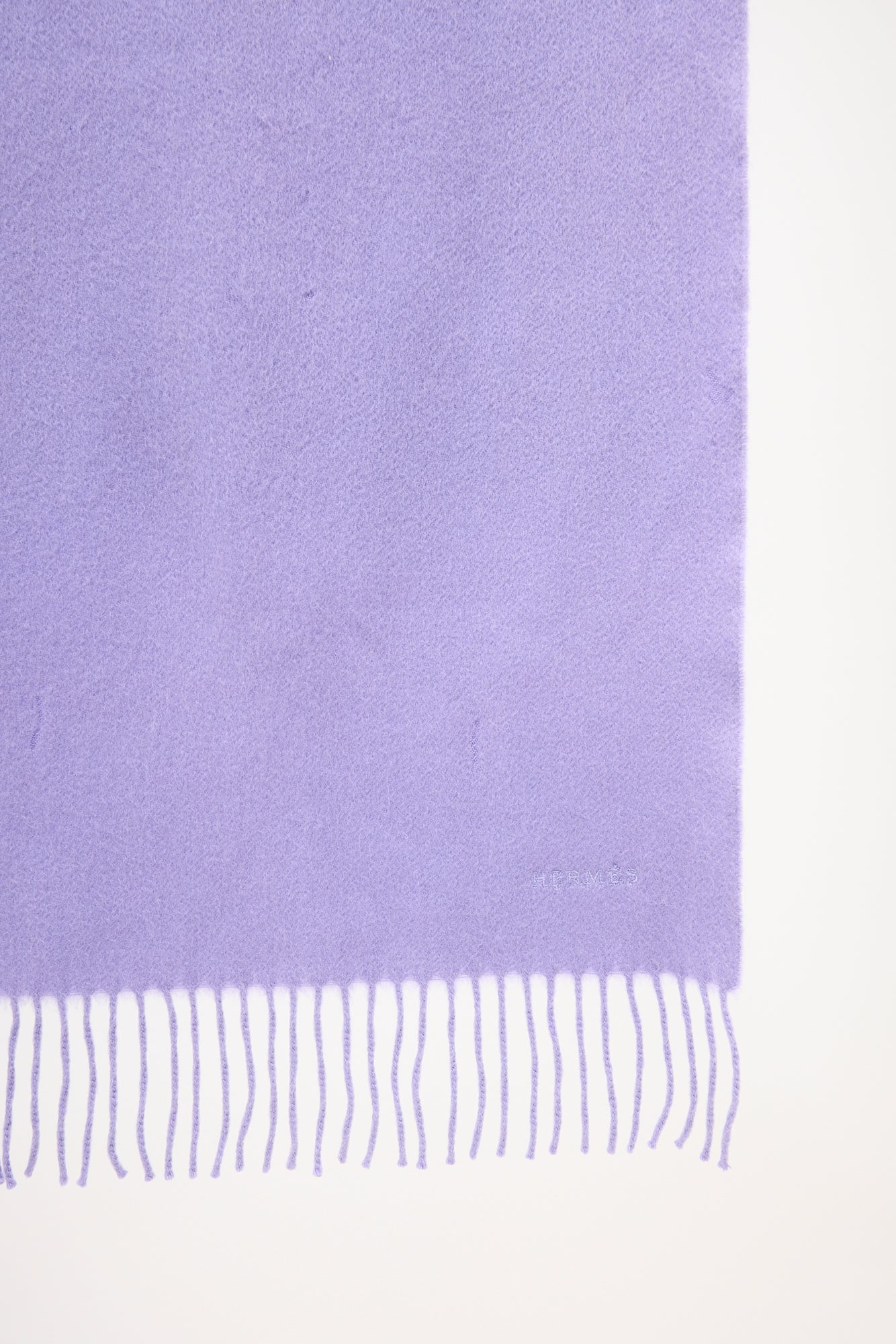 Pre-owned Hermès purple cashmere scarf featuring tonal embroidered logo at one end, fringe at both ends, and logo tab at reverse.