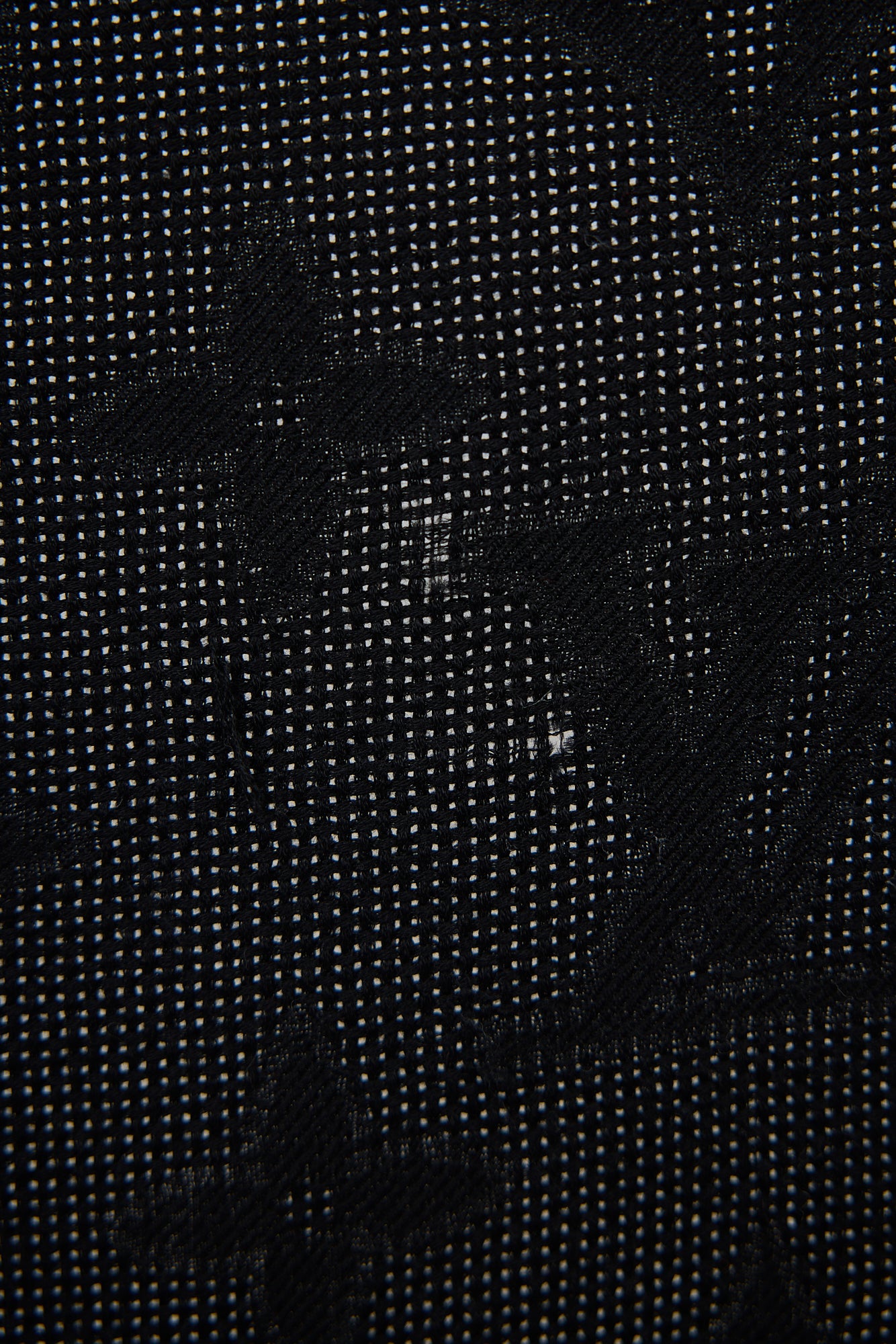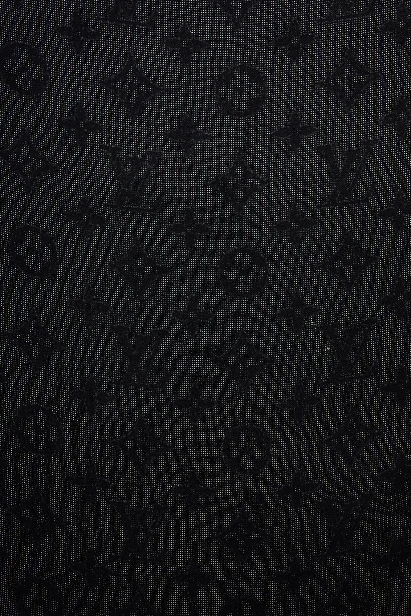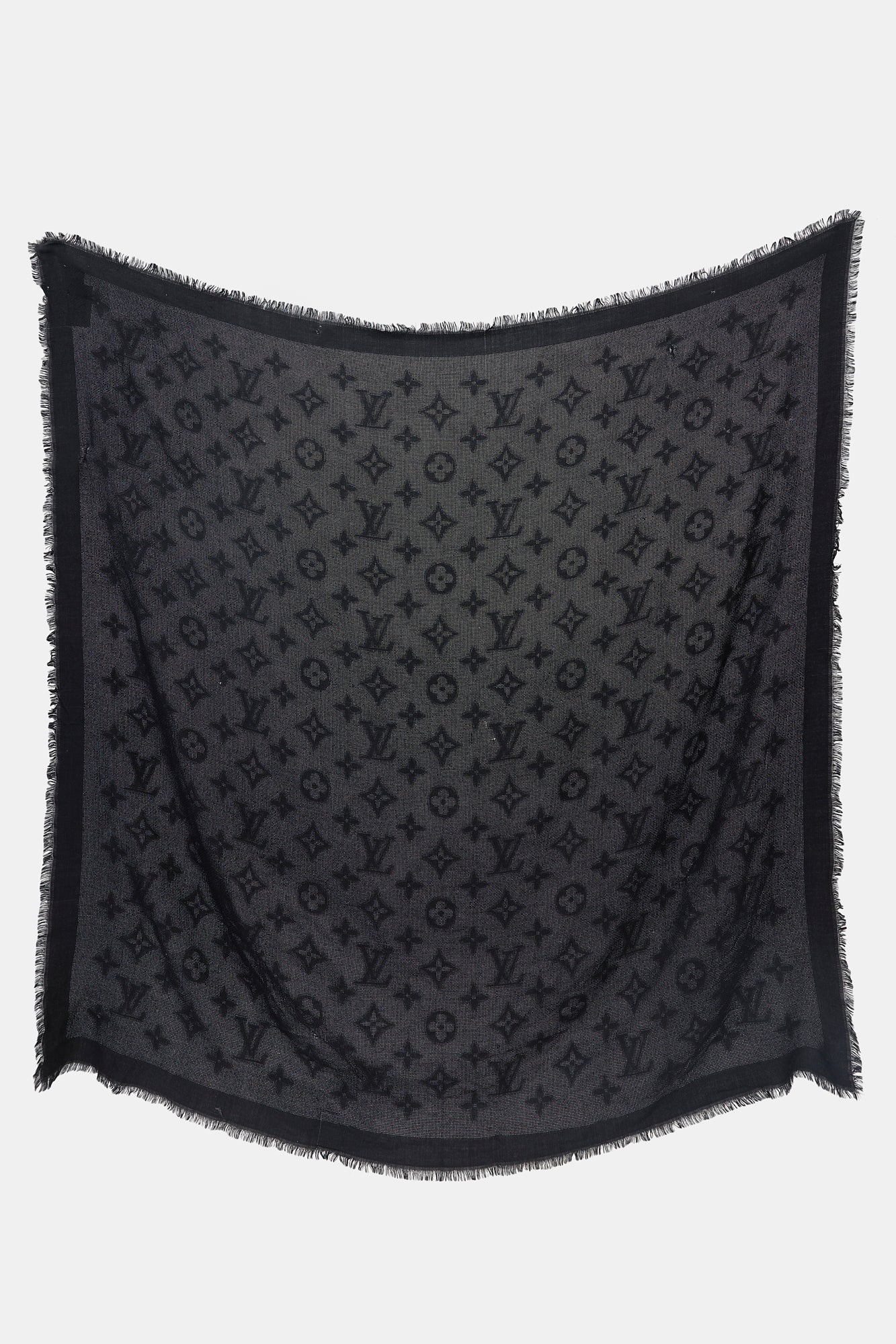 Pre-owned Louis Vuitton black wool and silk scarf featuring monogram jacquard, fringe ends, and logo tab at reverse.