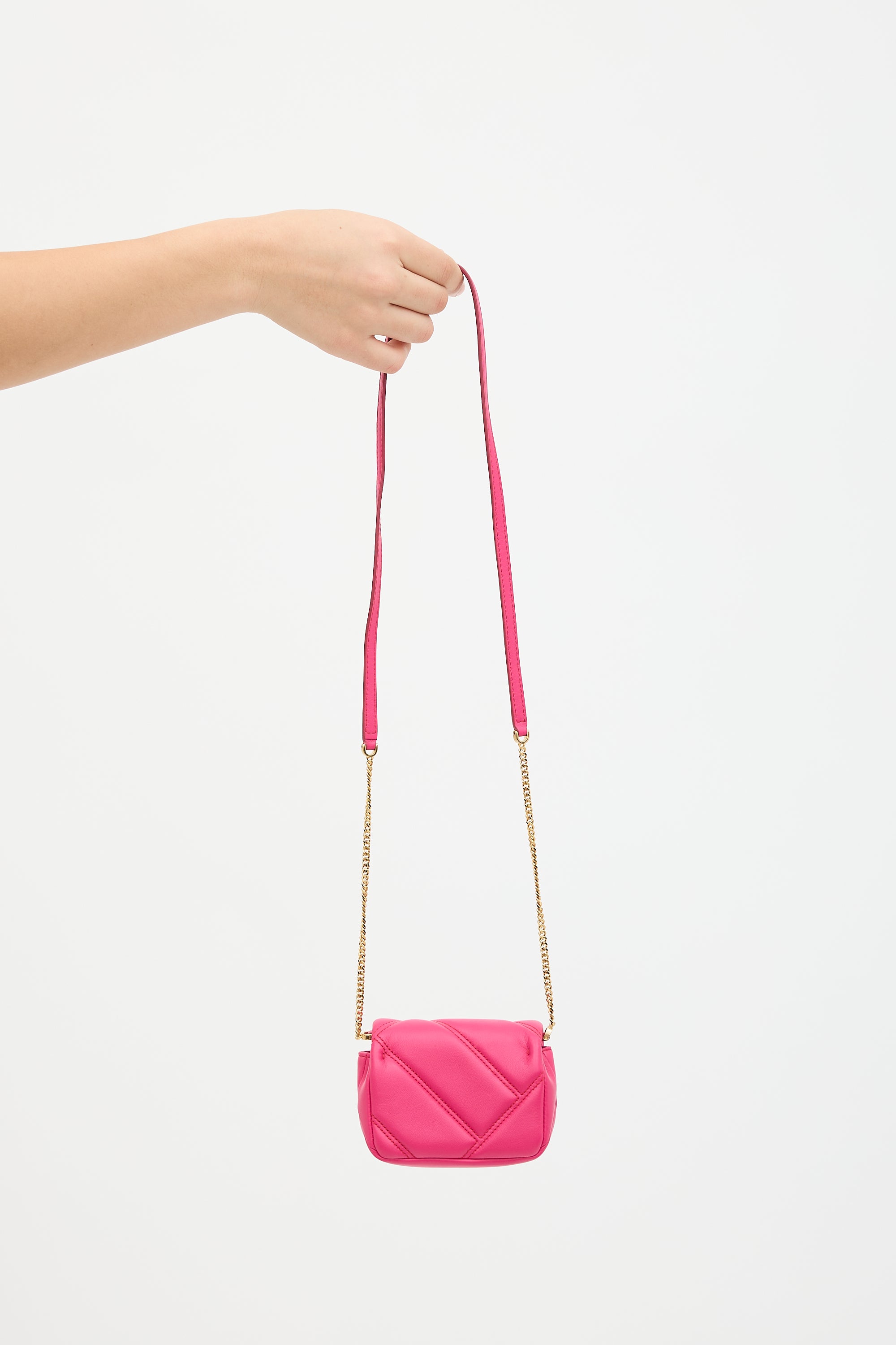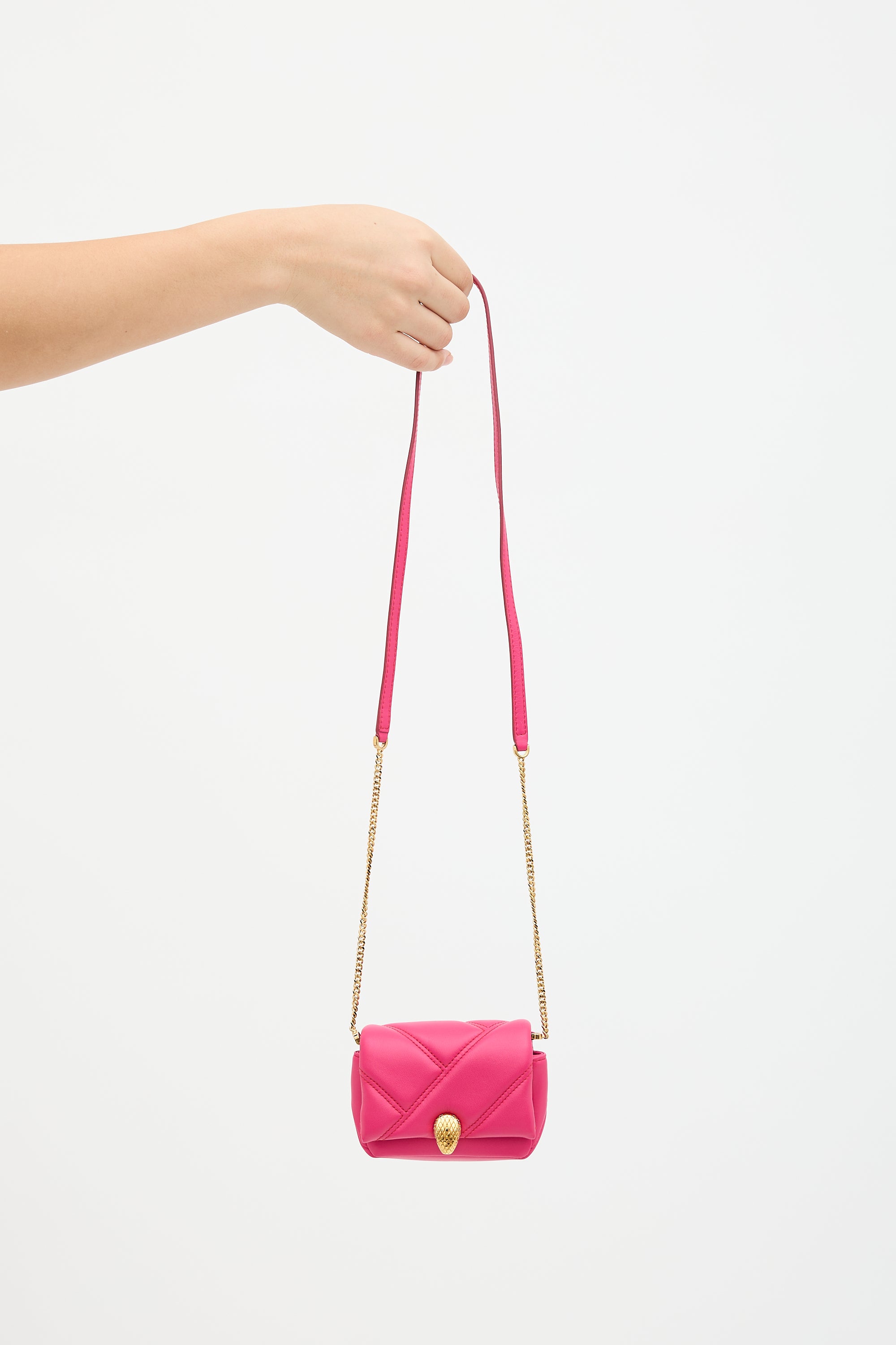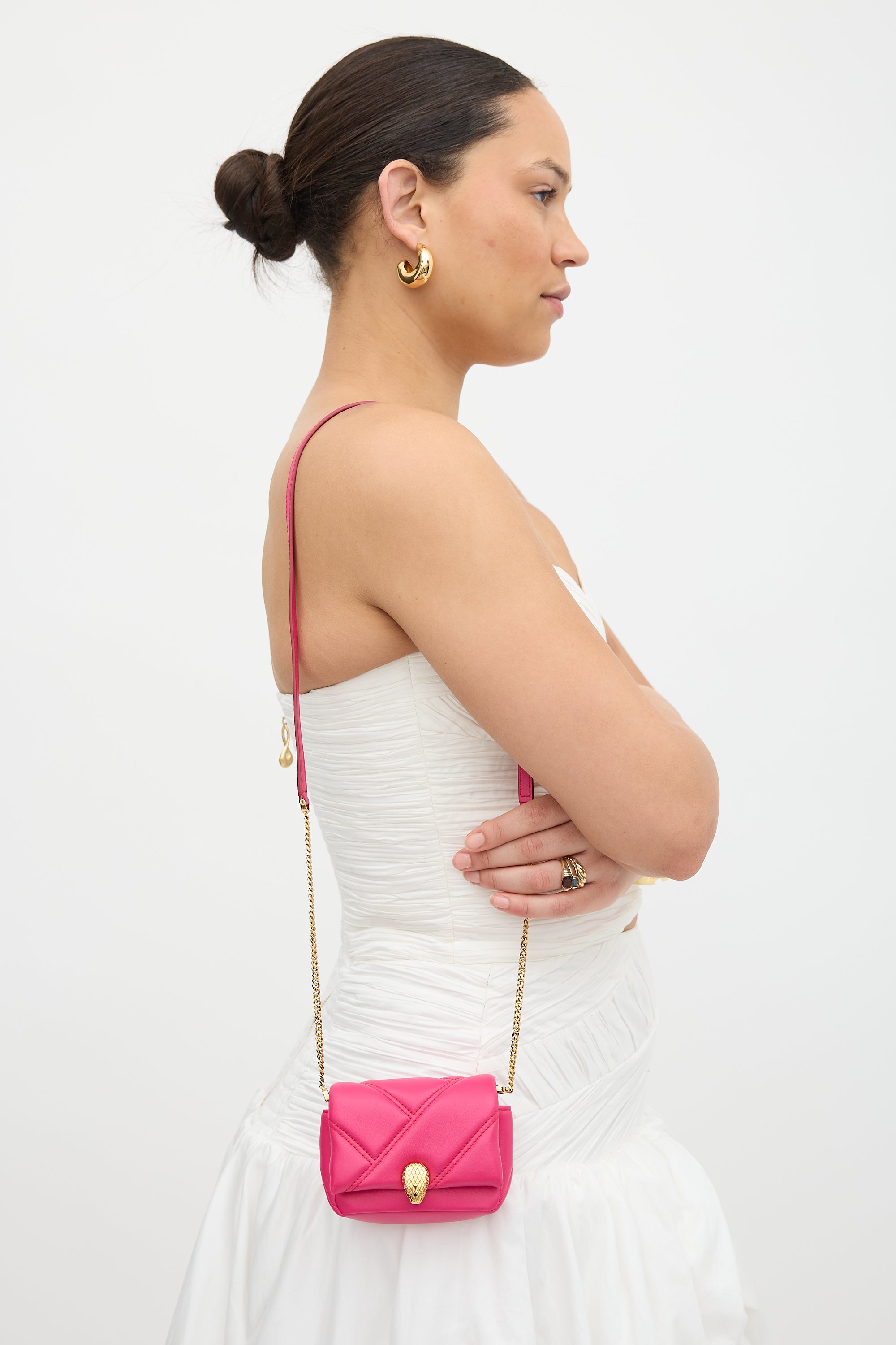 Pre-owned Bvlgari pink leather Serpenti Cabochon micro bag featuring gold tone hardware, chain link shoulder strap with leather handle, quilted body with top flap, snake head hardware and magnetic snap closure, and one main compartment with one card slot.