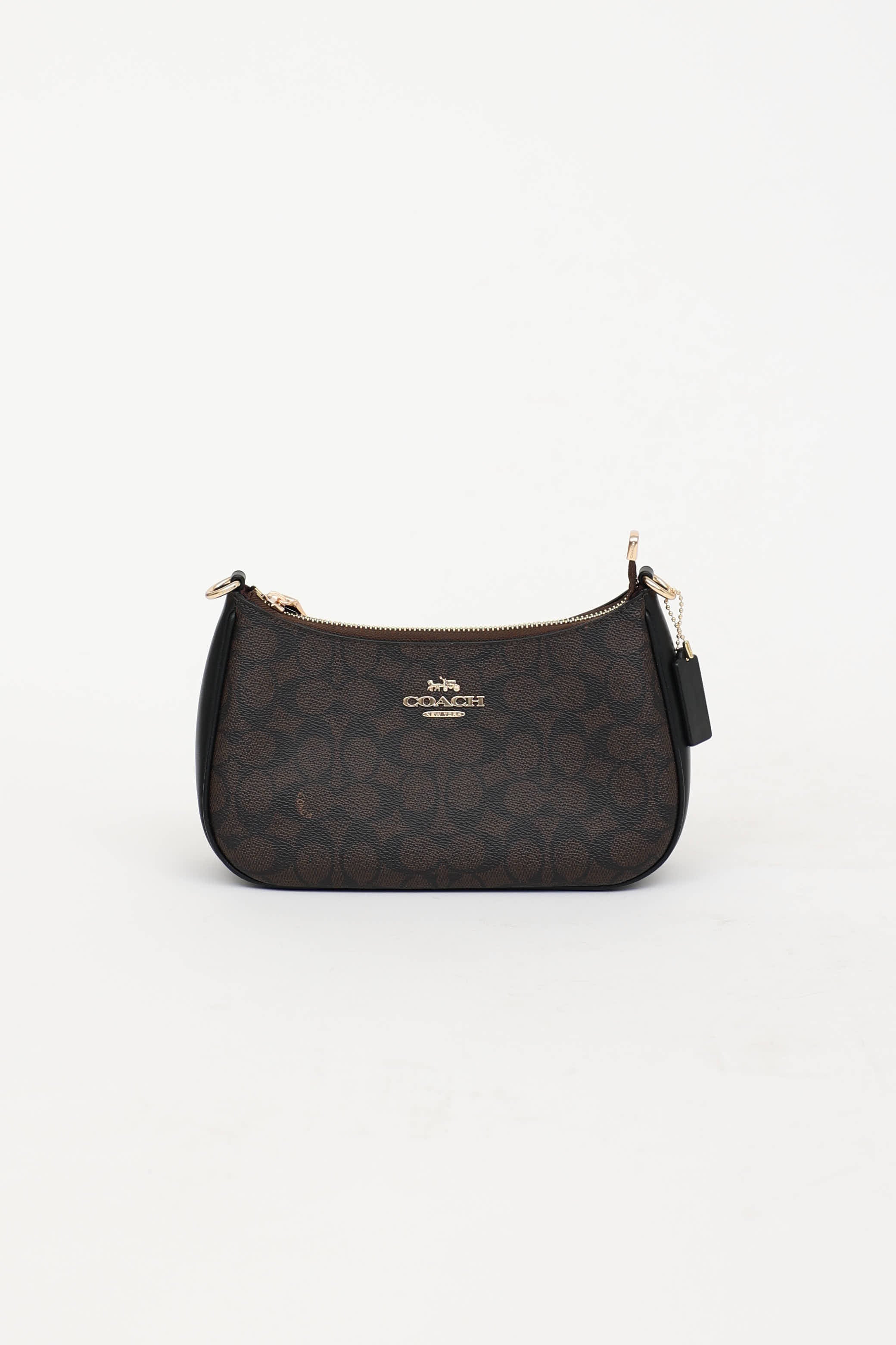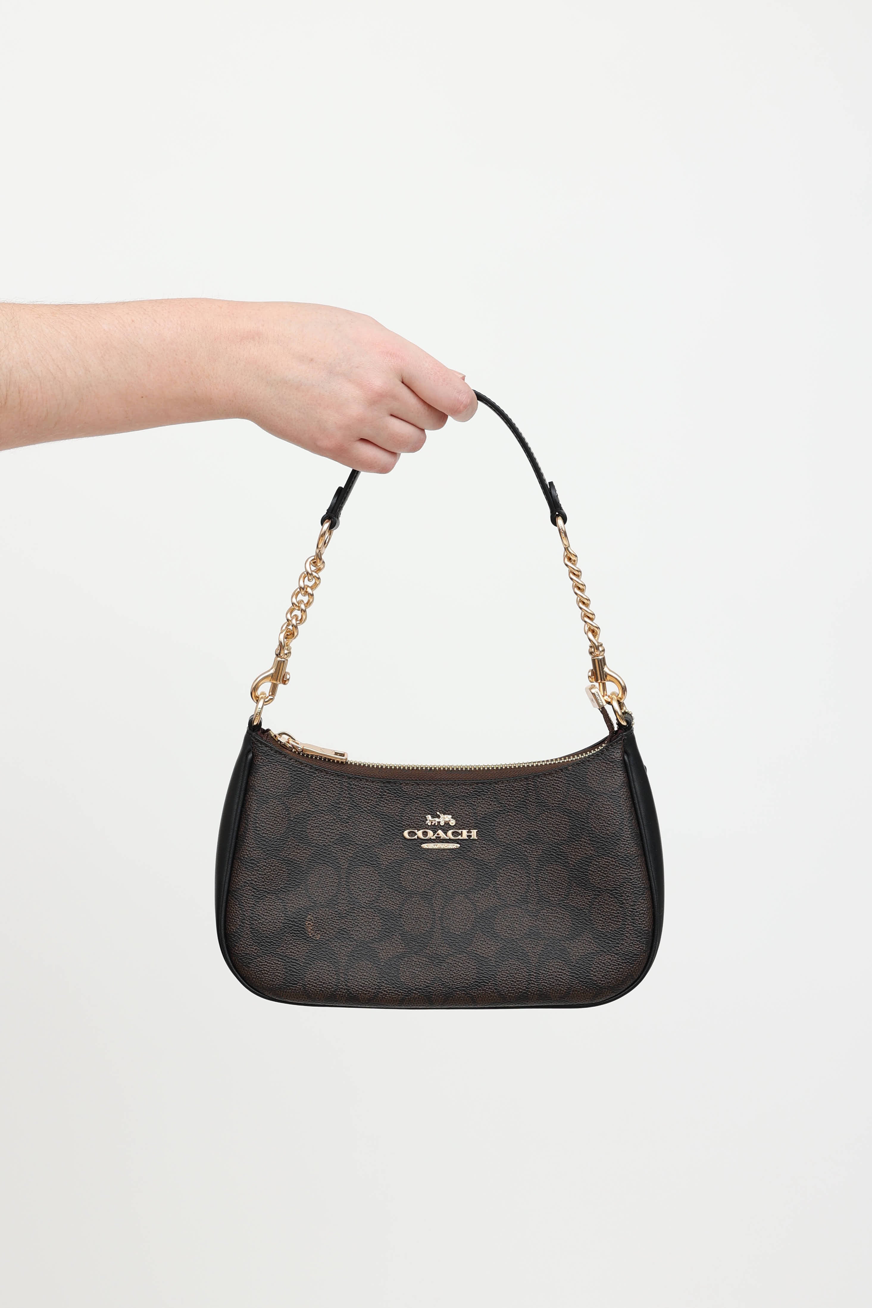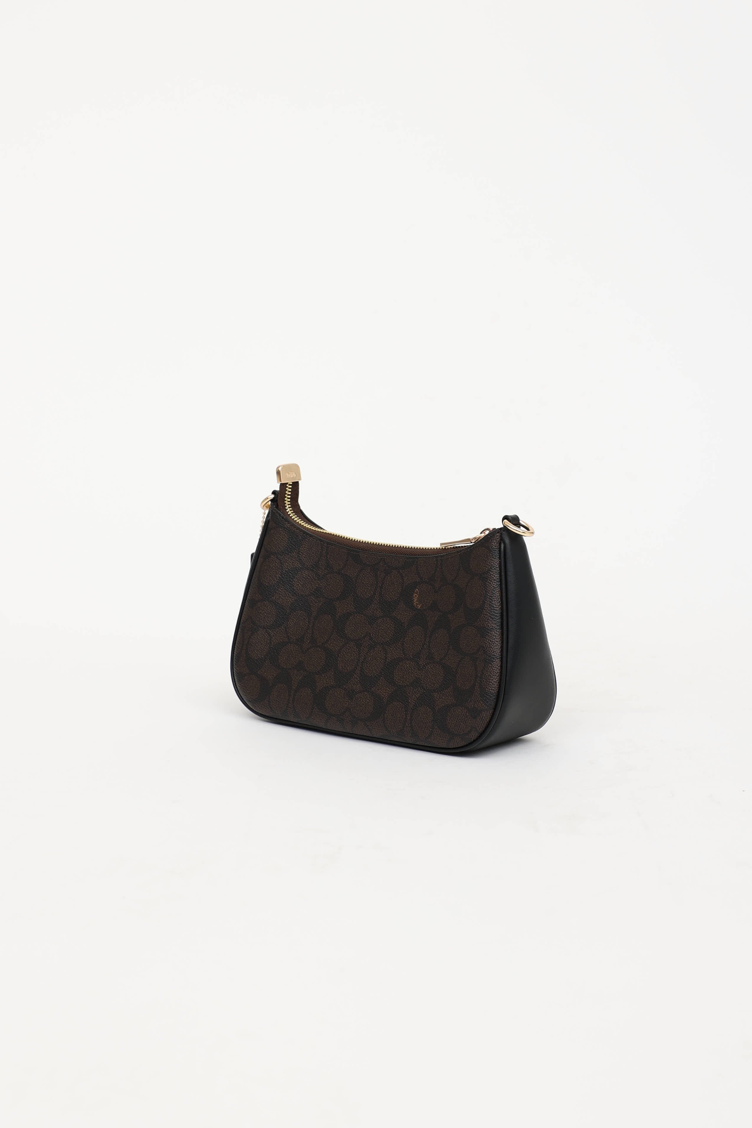 Pre-owned Coach brown Teri shoulder bag featuring monogram upper, detachable shoulder strap, gold tone hardware, logo hardware at front, detachable top handle and crossbody strap, top zip closure with one main compartment, and one slip pocket.
