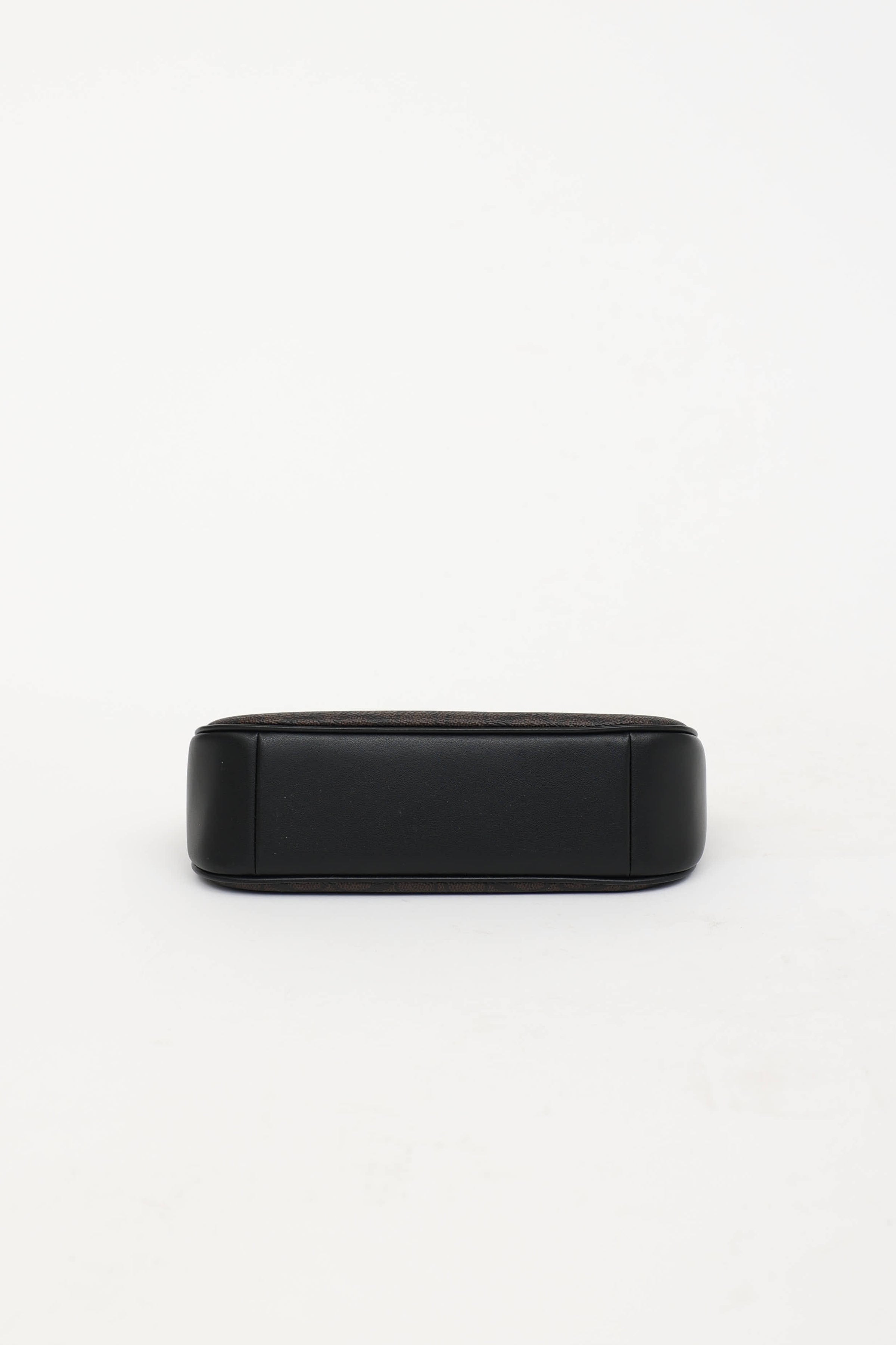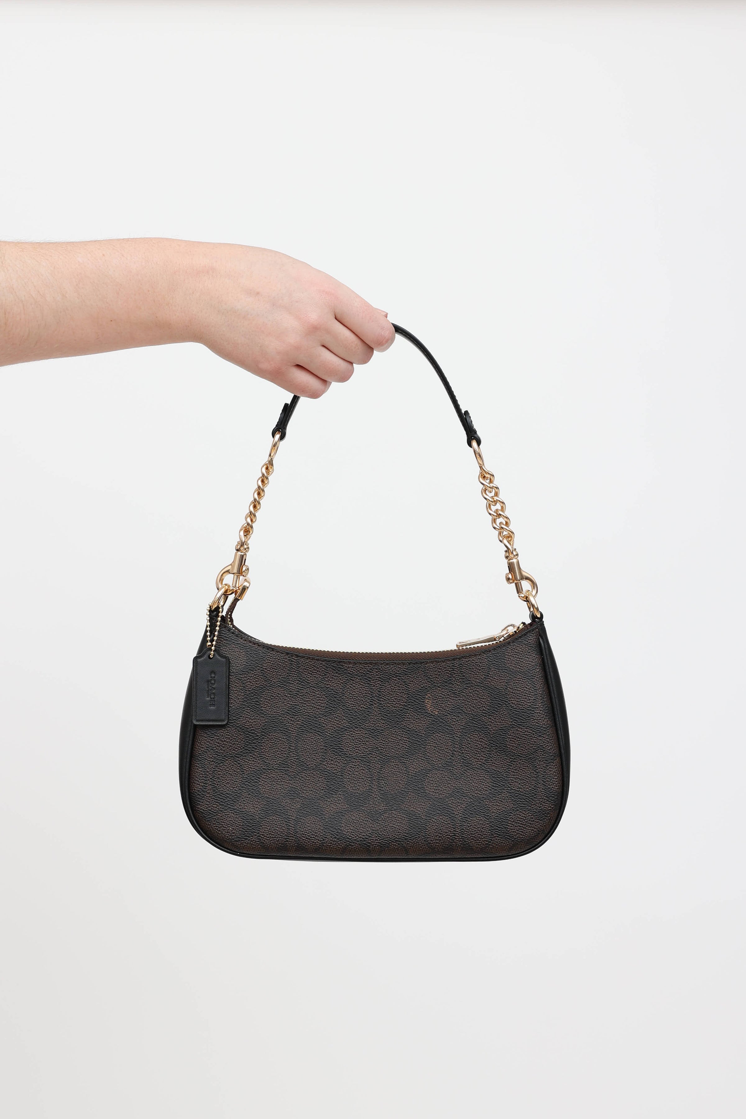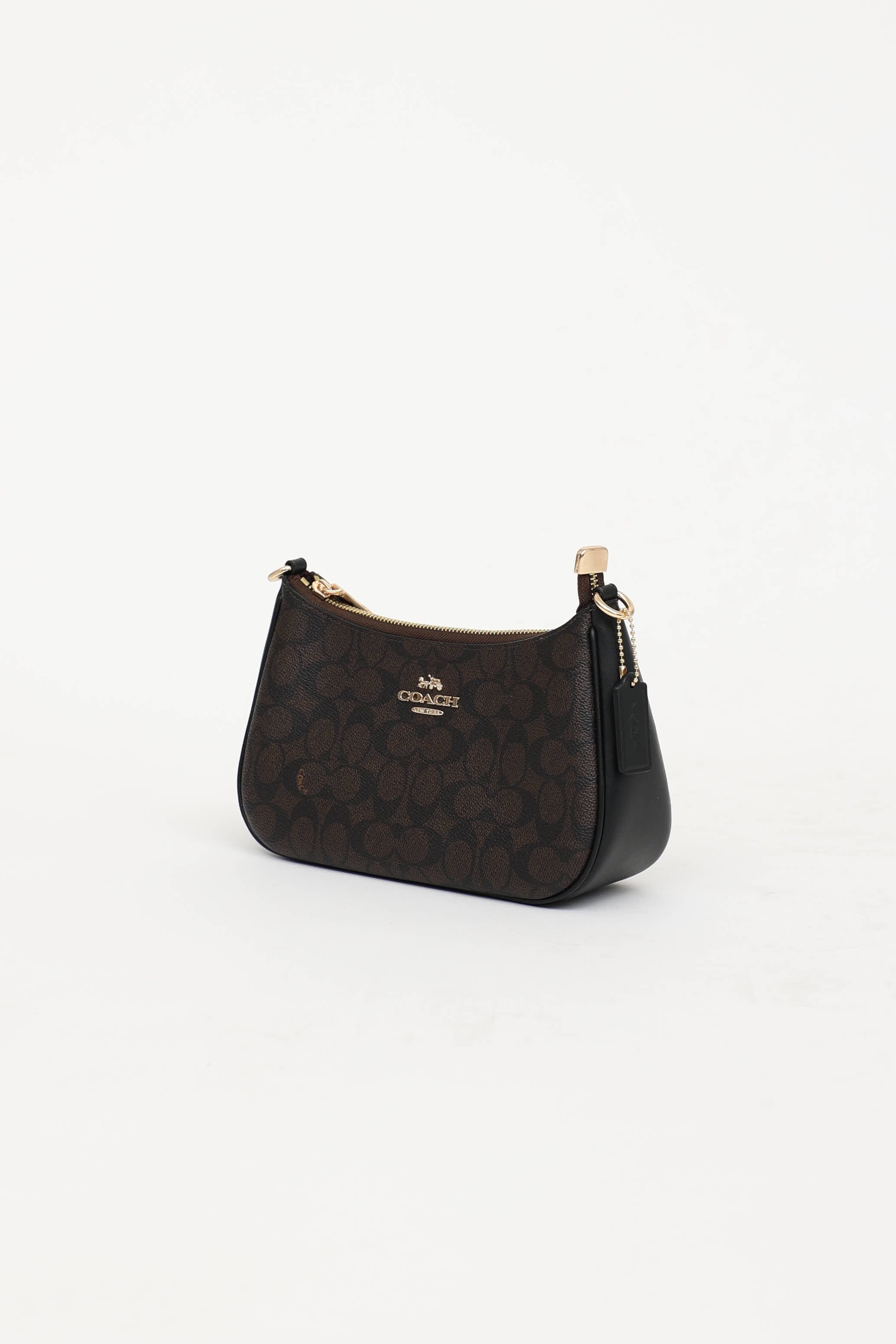 Pre-owned Coach brown Teri shoulder bag featuring monogram upper, detachable shoulder strap, gold tone hardware, logo hardware at front, detachable top handle and crossbody strap, top zip closure with one main compartment, and one slip pocket.