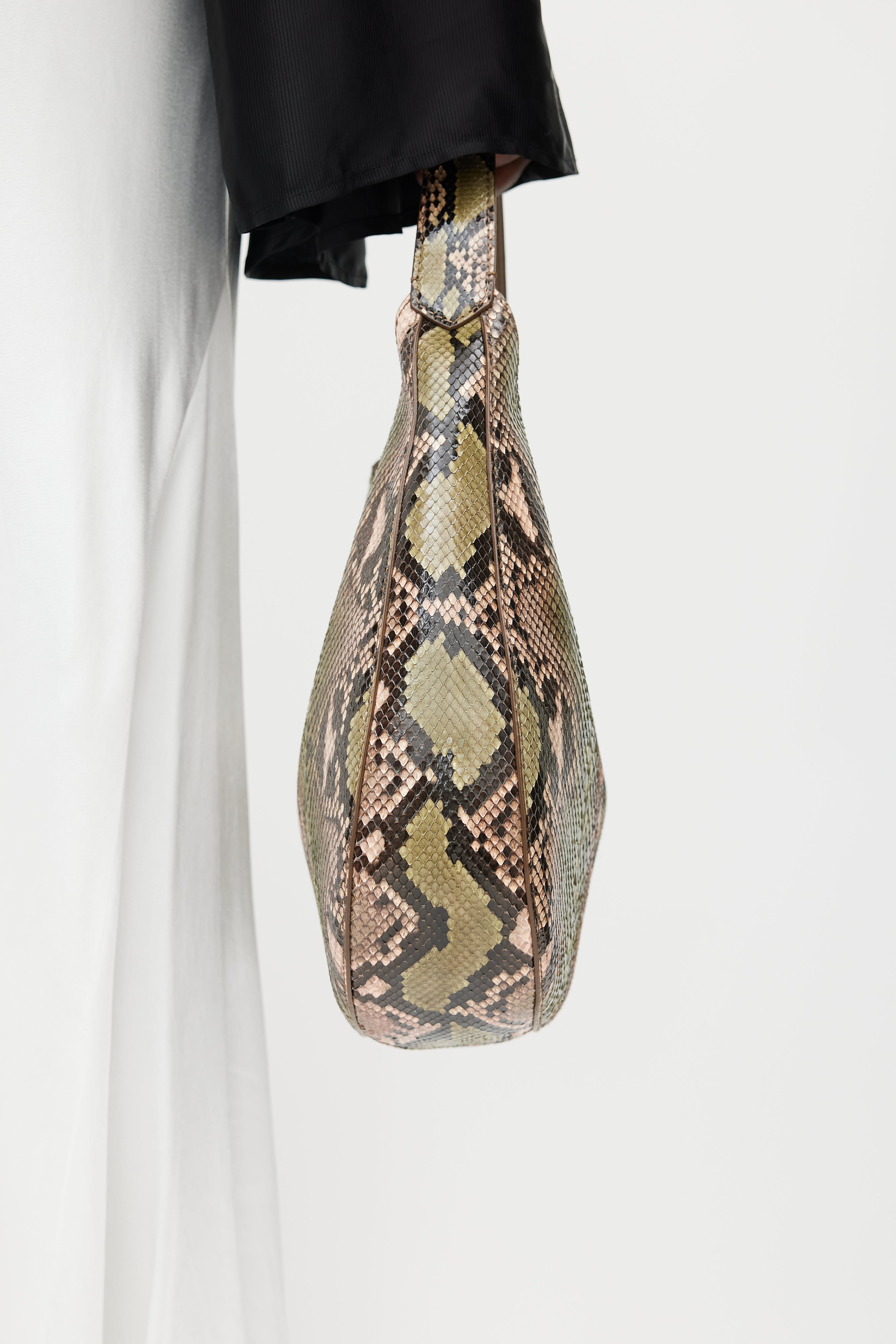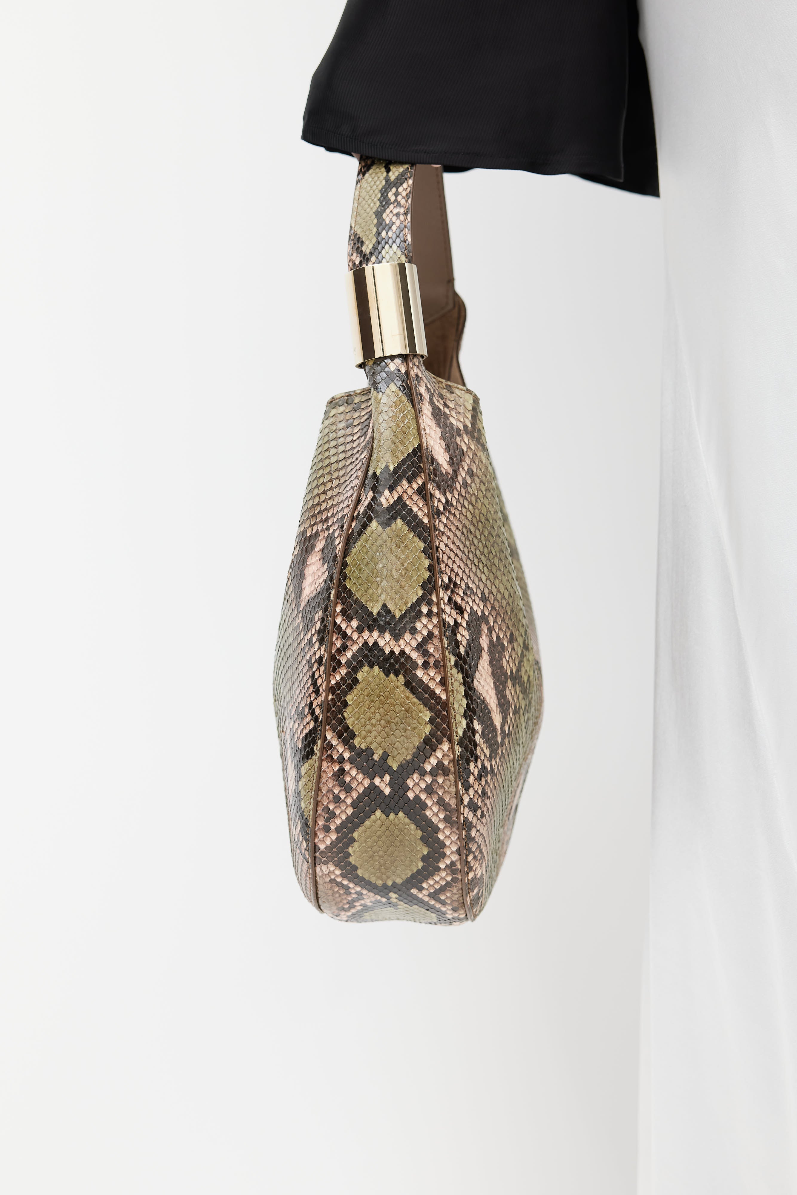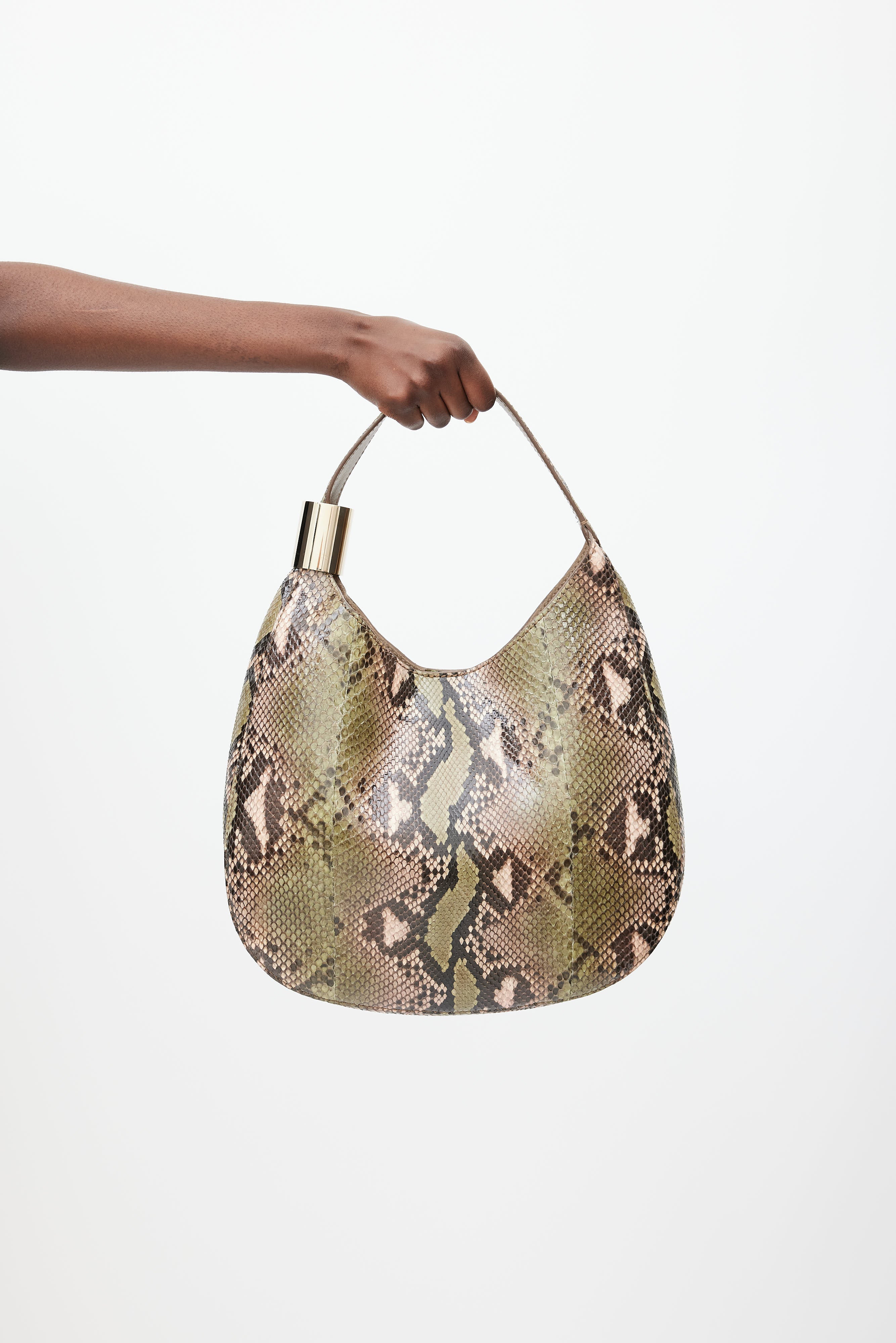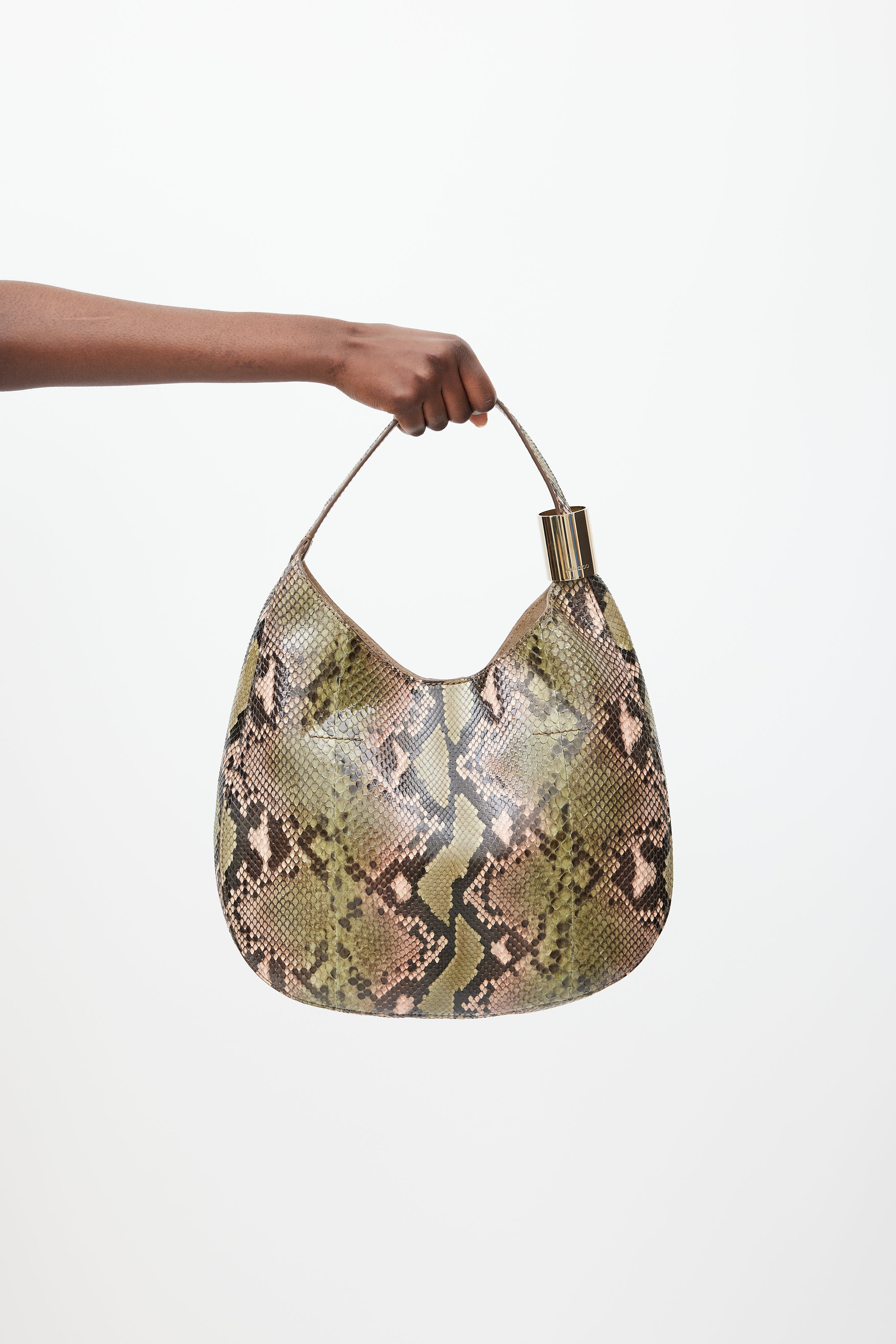 Jimmy Choo beige Stevie python bag featuring a green embossed pattern throughout, top handle with gold tone hardware, one main compartment with one slip pocket, and top snap closure. Comes with original dust bag.