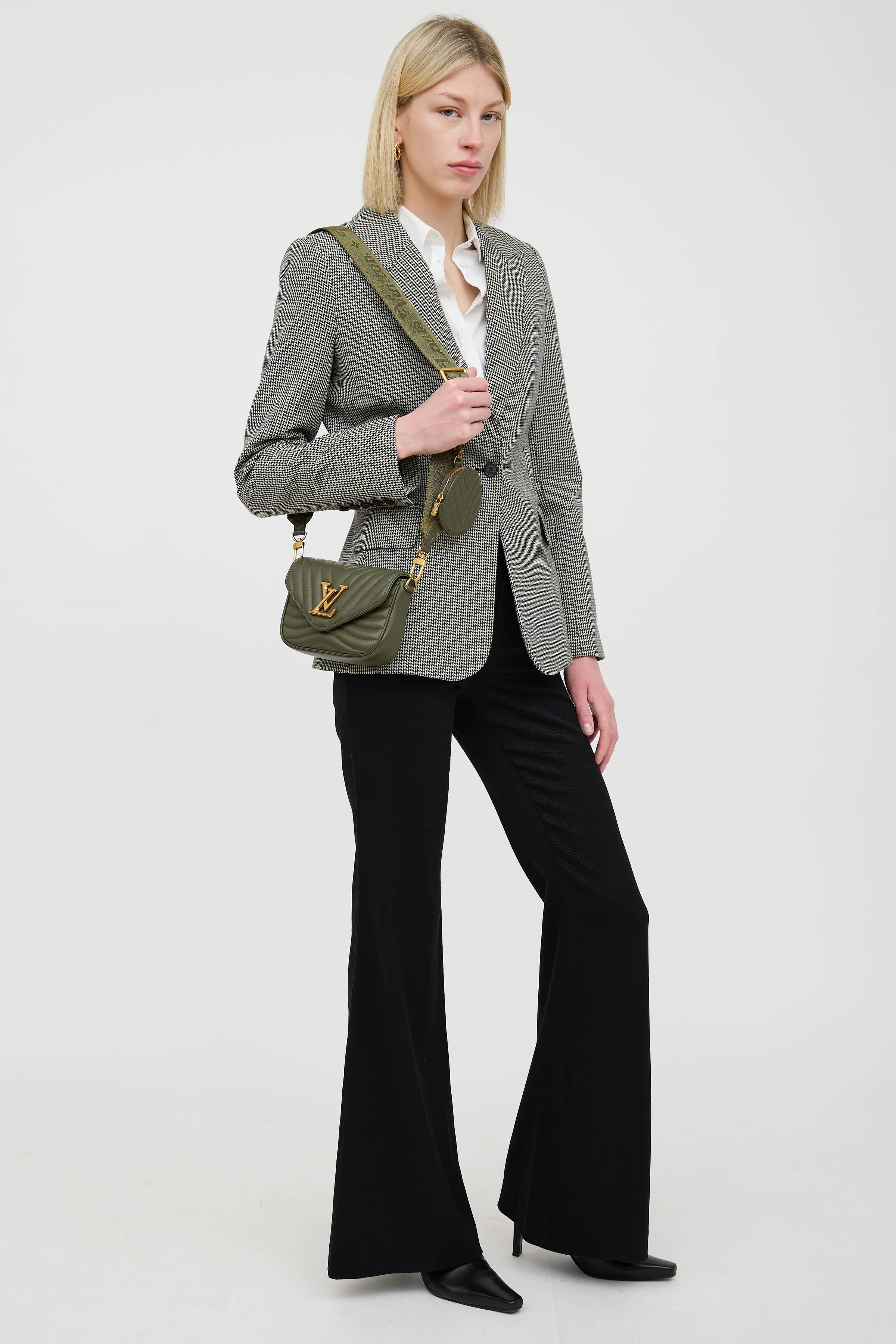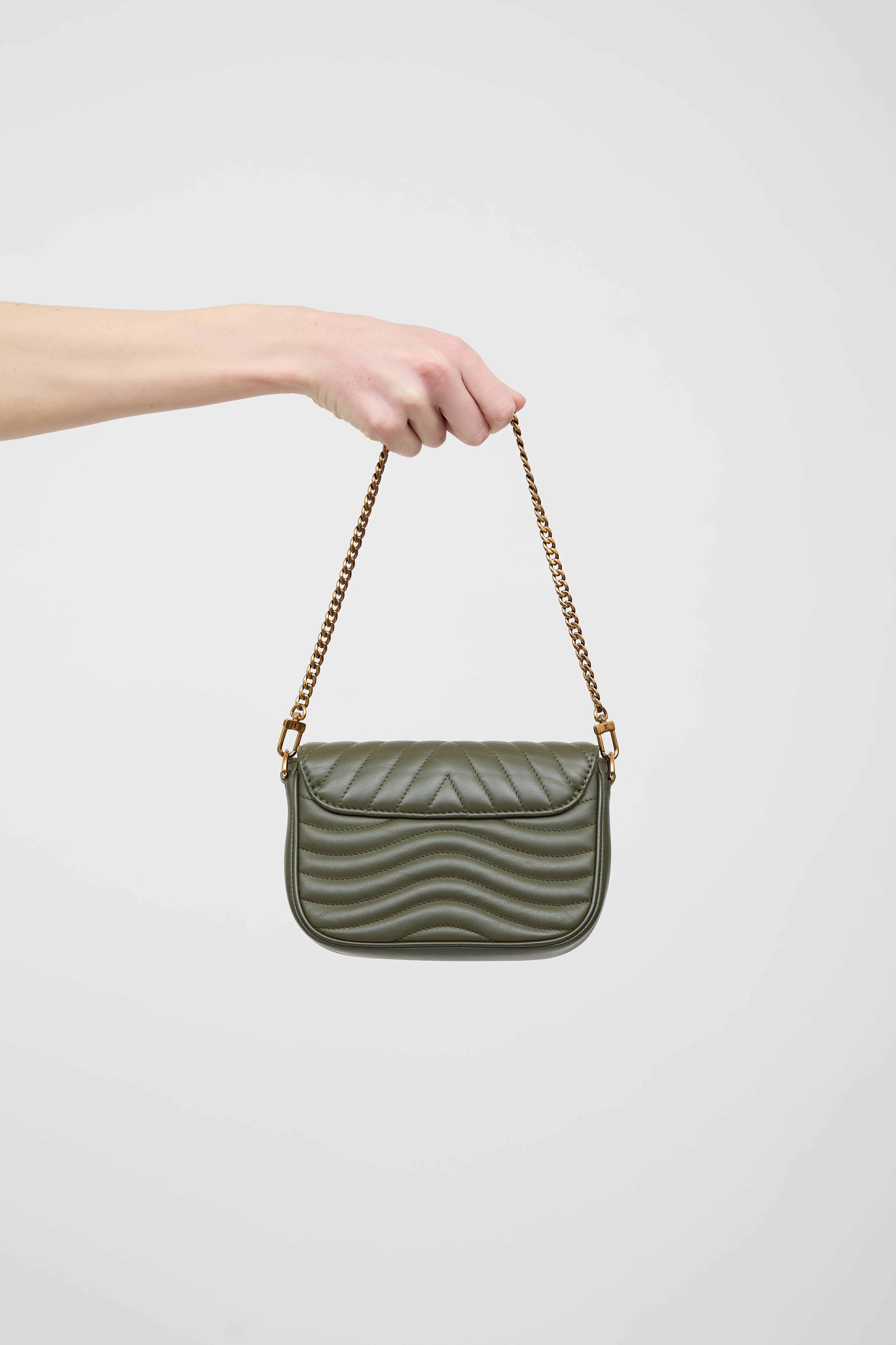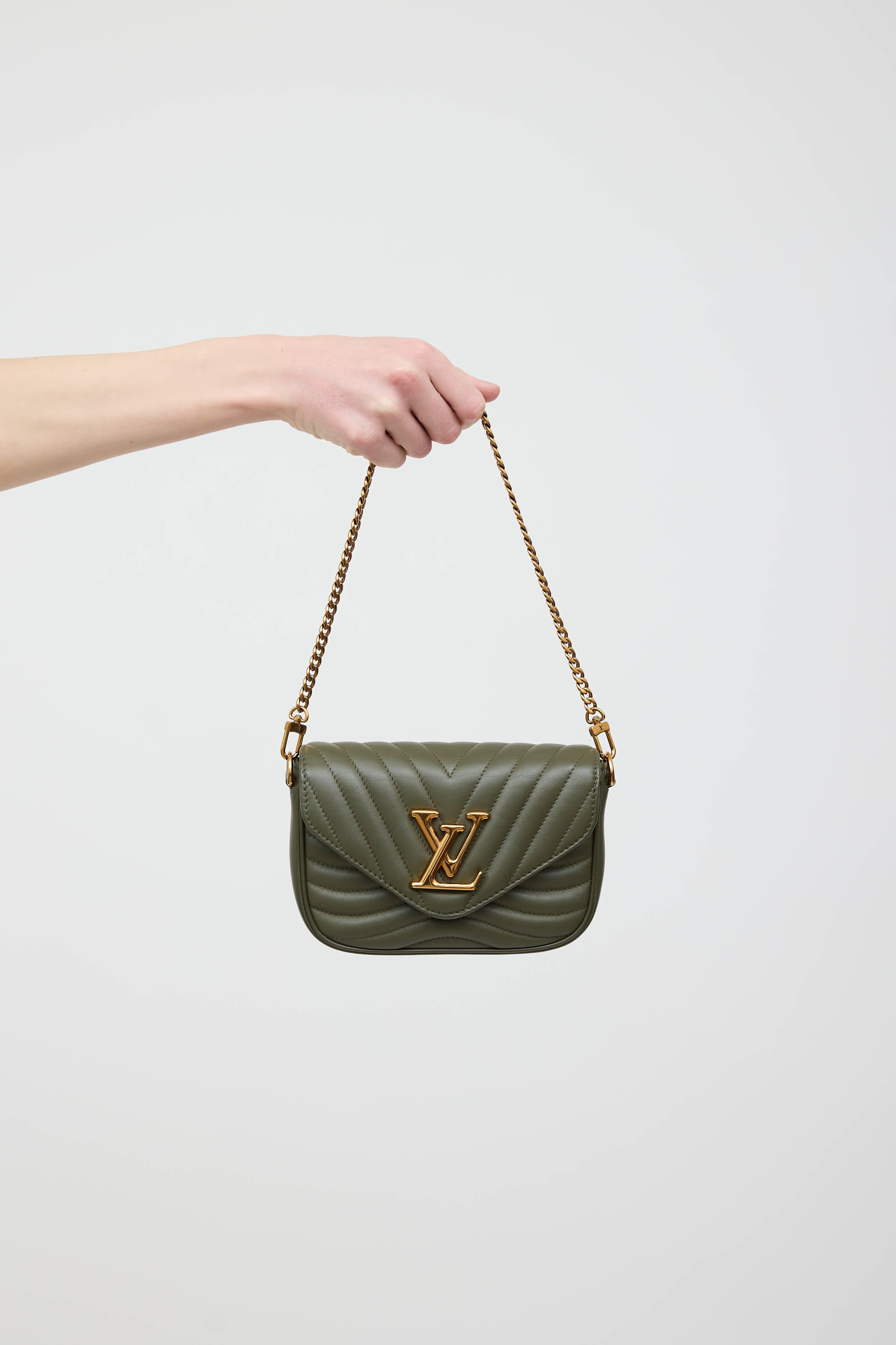 Pre-owned Louis Vuitton green New Wave leather pochette bag in quilted leather featuring a top flap, one main compartment with one slip pocket, removable chainlink top handle, removable webbed logo shoulder strap, removable circular pouch, and gold tone logo snap closure. Includes original dust bag.