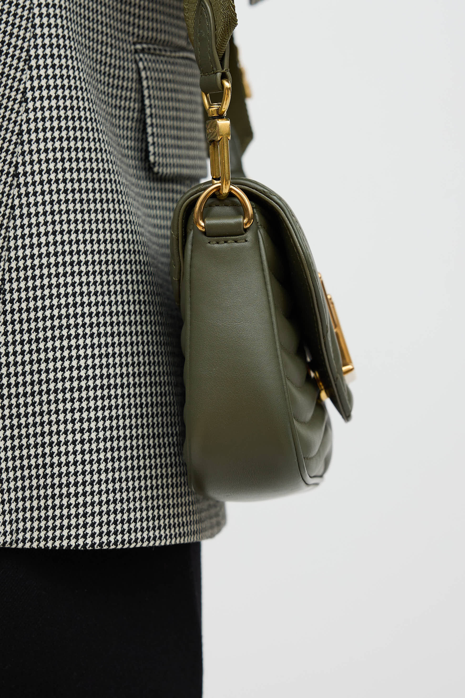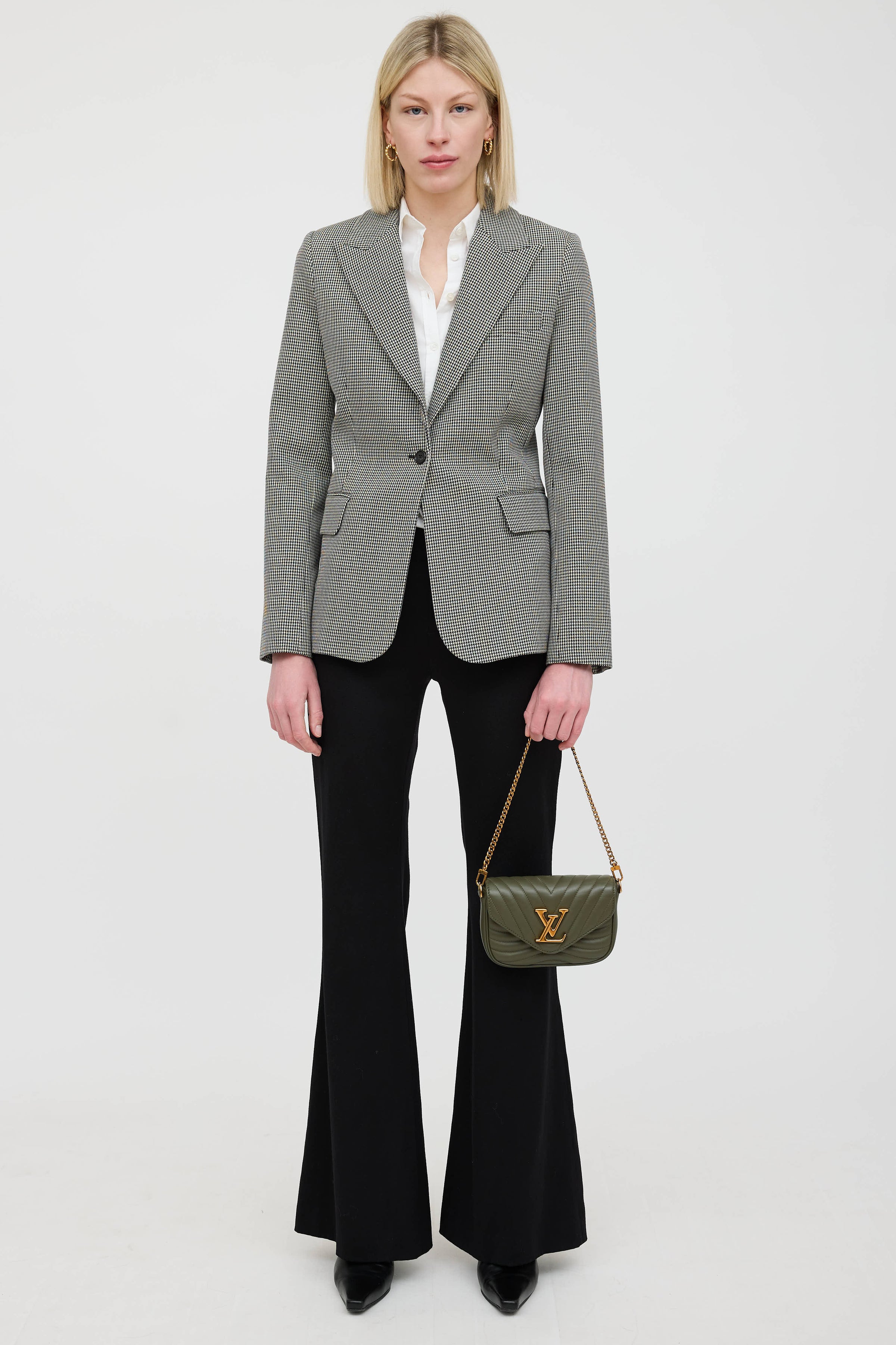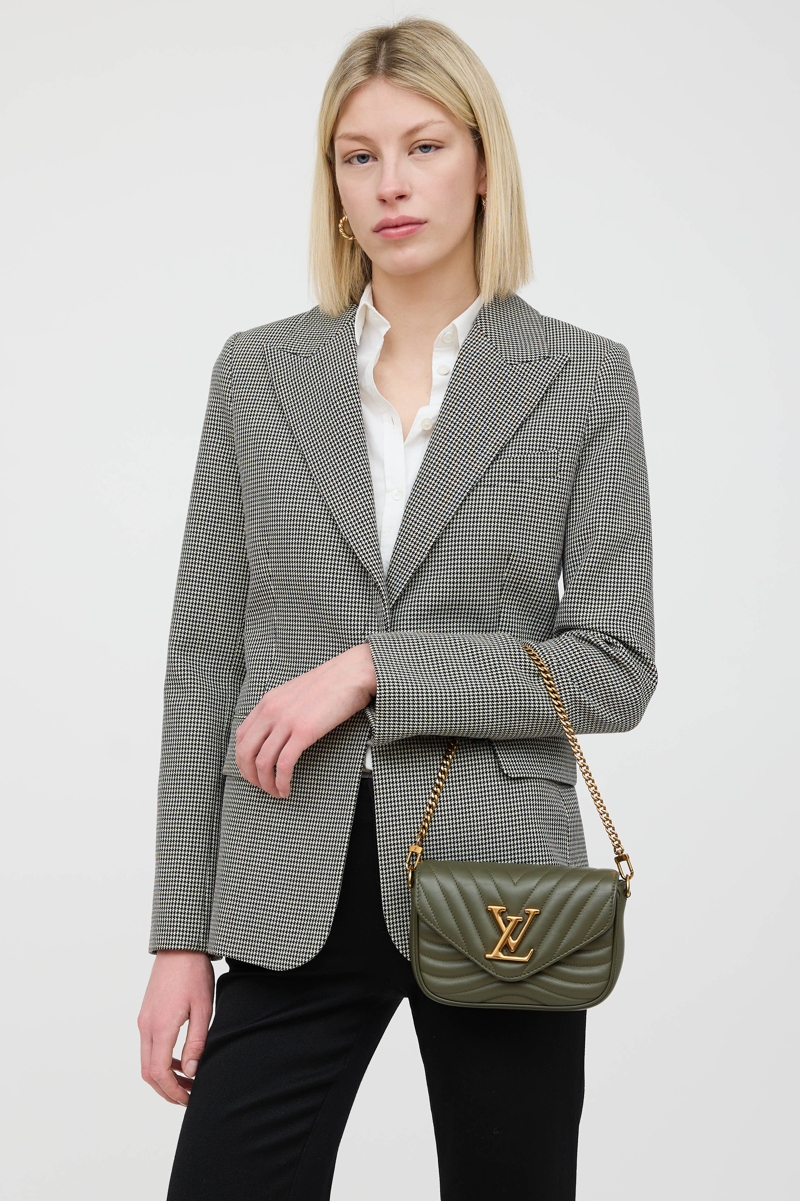 Pre-owned Louis Vuitton green New Wave leather pochette bag in quilted leather featuring a top flap, one main compartment with one slip pocket, removable chainlink top handle, removable webbed logo shoulder strap, removable circular pouch, and gold tone logo snap closure. Includes original dust bag.