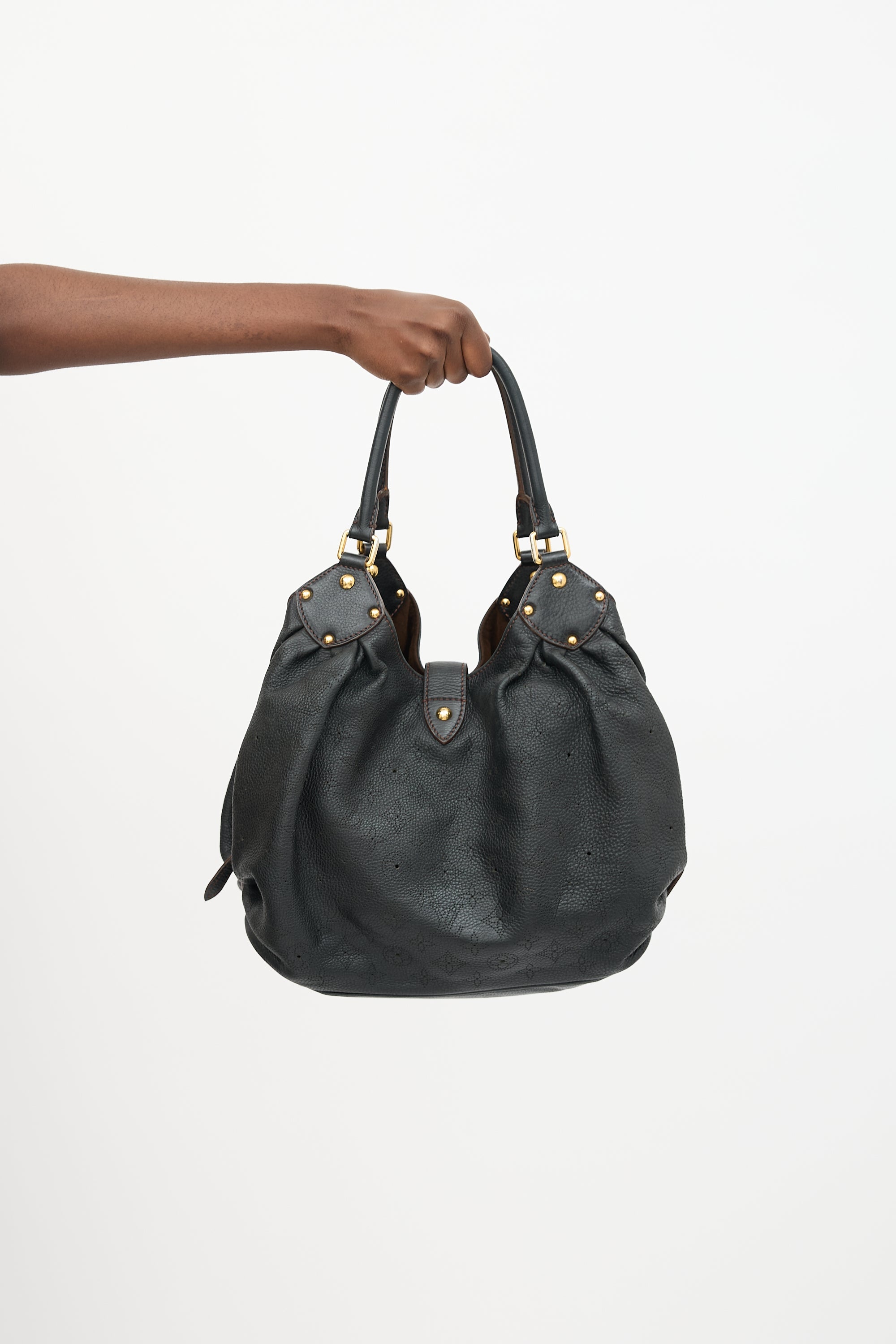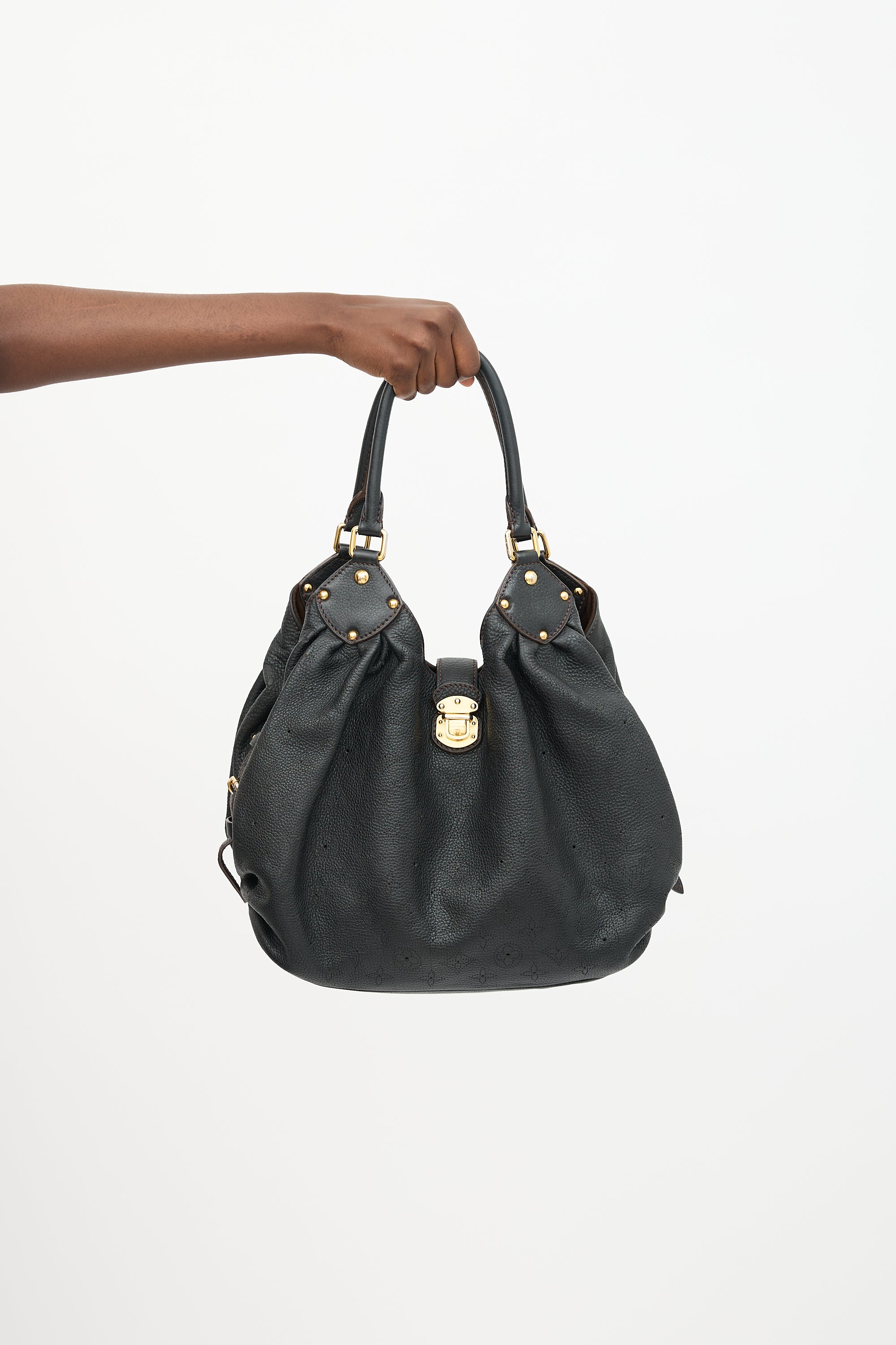 Pre-owned Louis Vuitton black Mahina Leather L Hobo bag featuring signature perforated monogram throughout, gold tone hardware, dual rolled top handles, four feet at base, ruched sides, open top with with tuck lock closure, and one lined main compartment with one zip pocket. Comes with original dust bag.