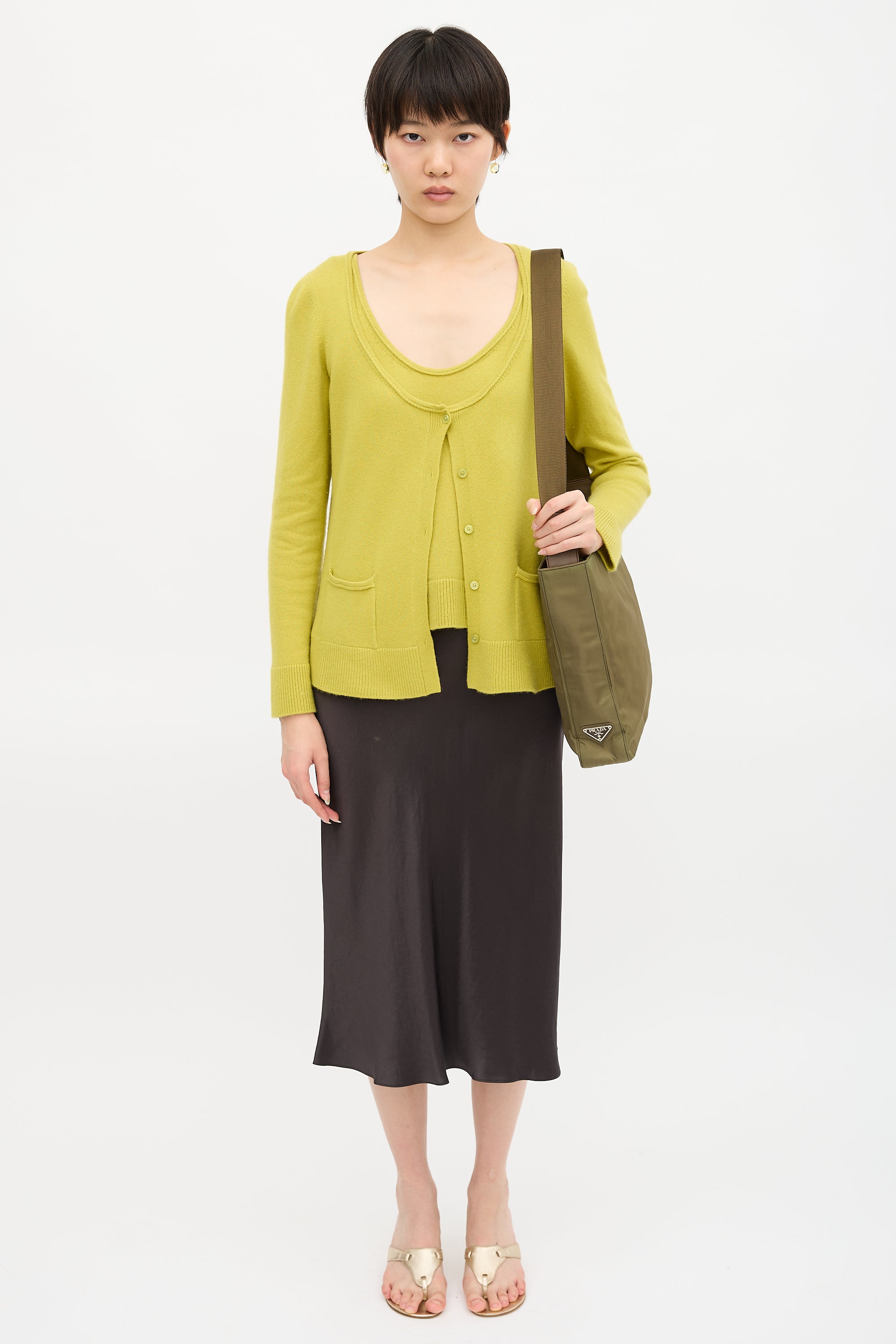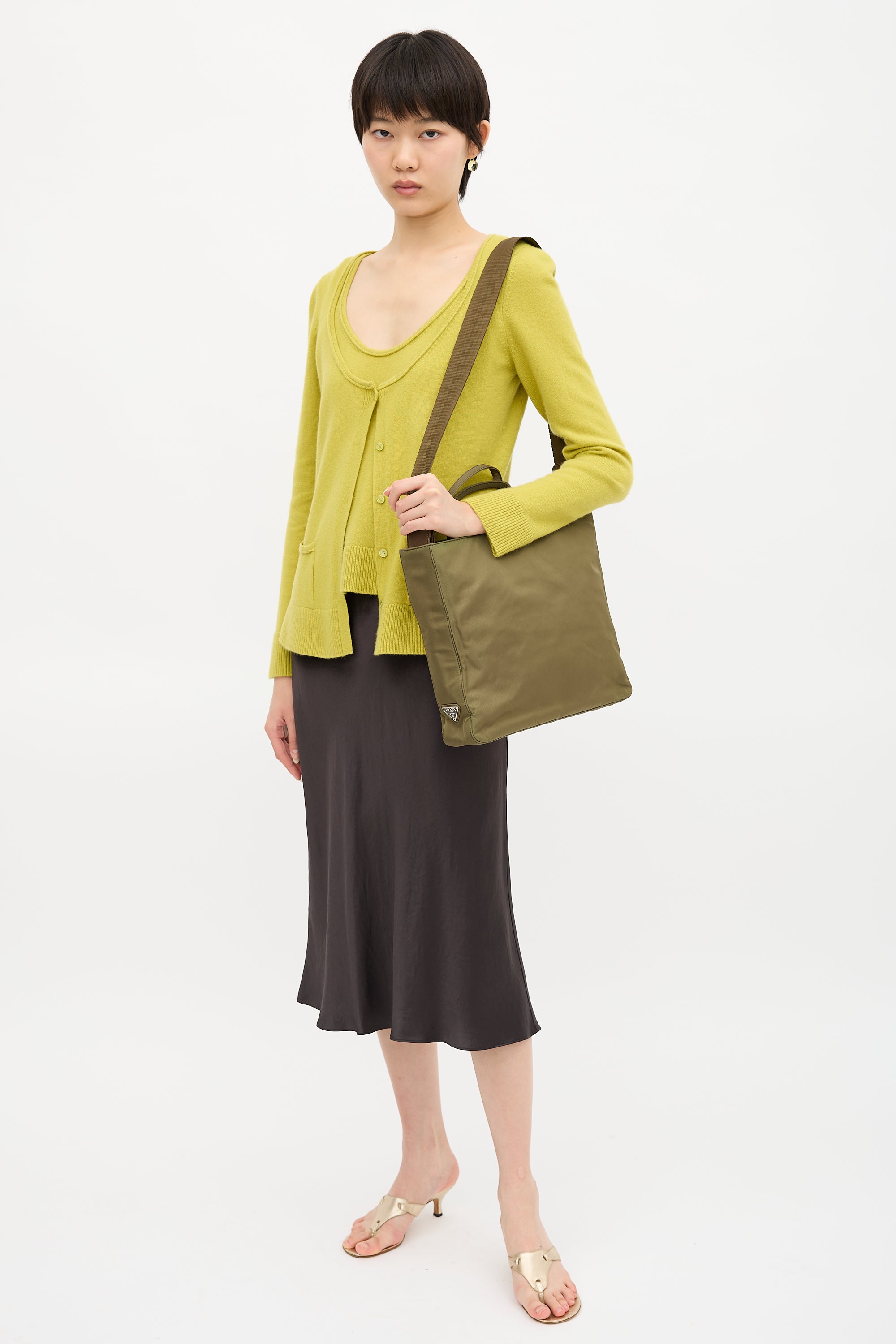 Pre-owned Prada green nylon Messenger bag featuring brown leather trim, dual retractable top handles, detachable canvas shoulder strap, signature triangle logo plaque at side, open top with interior flap, and three main compartments with optional pouch.