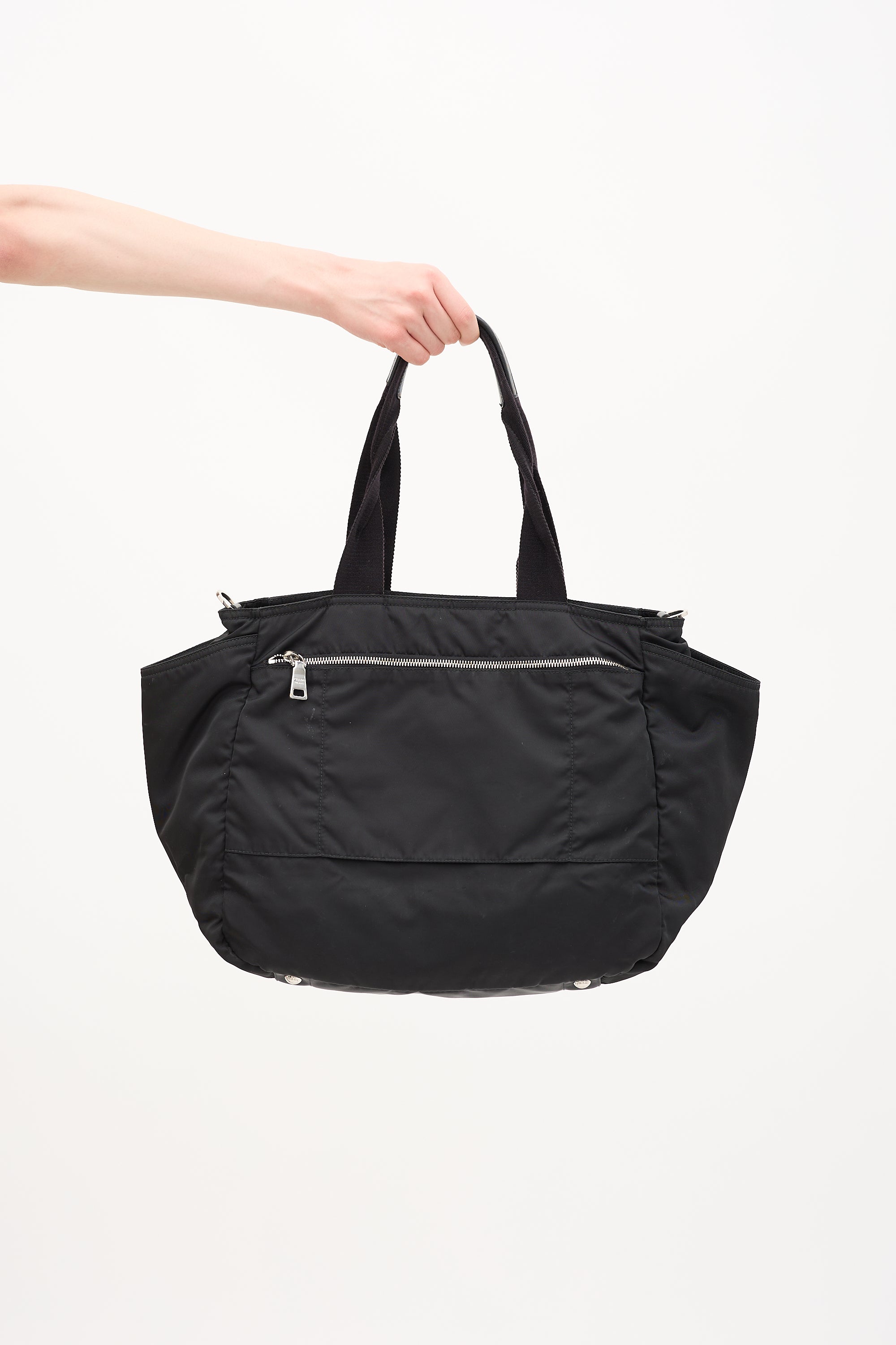 Pre-owned Prada black nylon tessuto diaper bag featuring four feet, signature triangle logo plaque at front, front zip compartment, back zip pocket, slip pockets at sides, dual webbed top handles, removable and adjustable shoulder strap, top zip closure, and one lined main compartment with one zip pocket and two slip pockets.