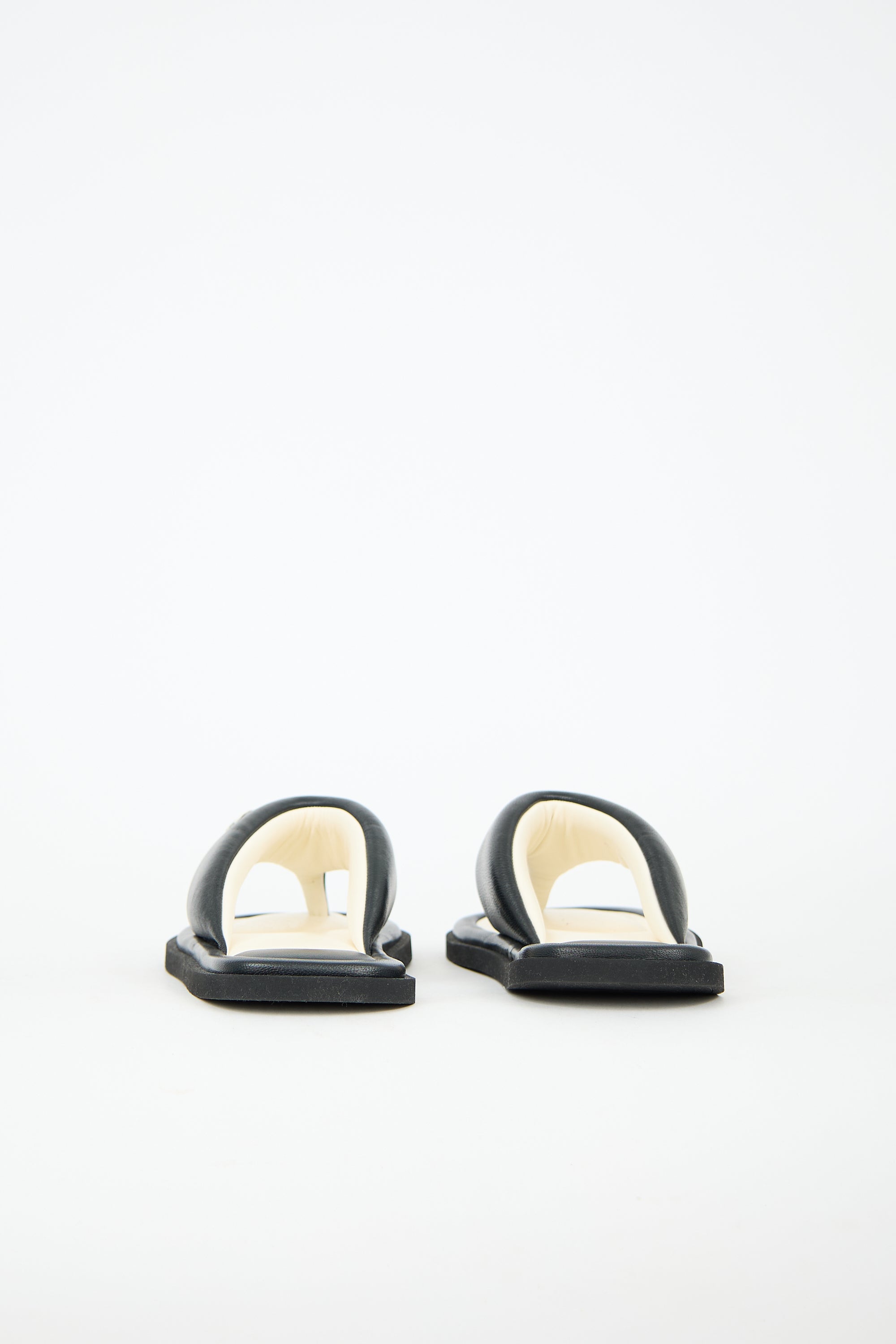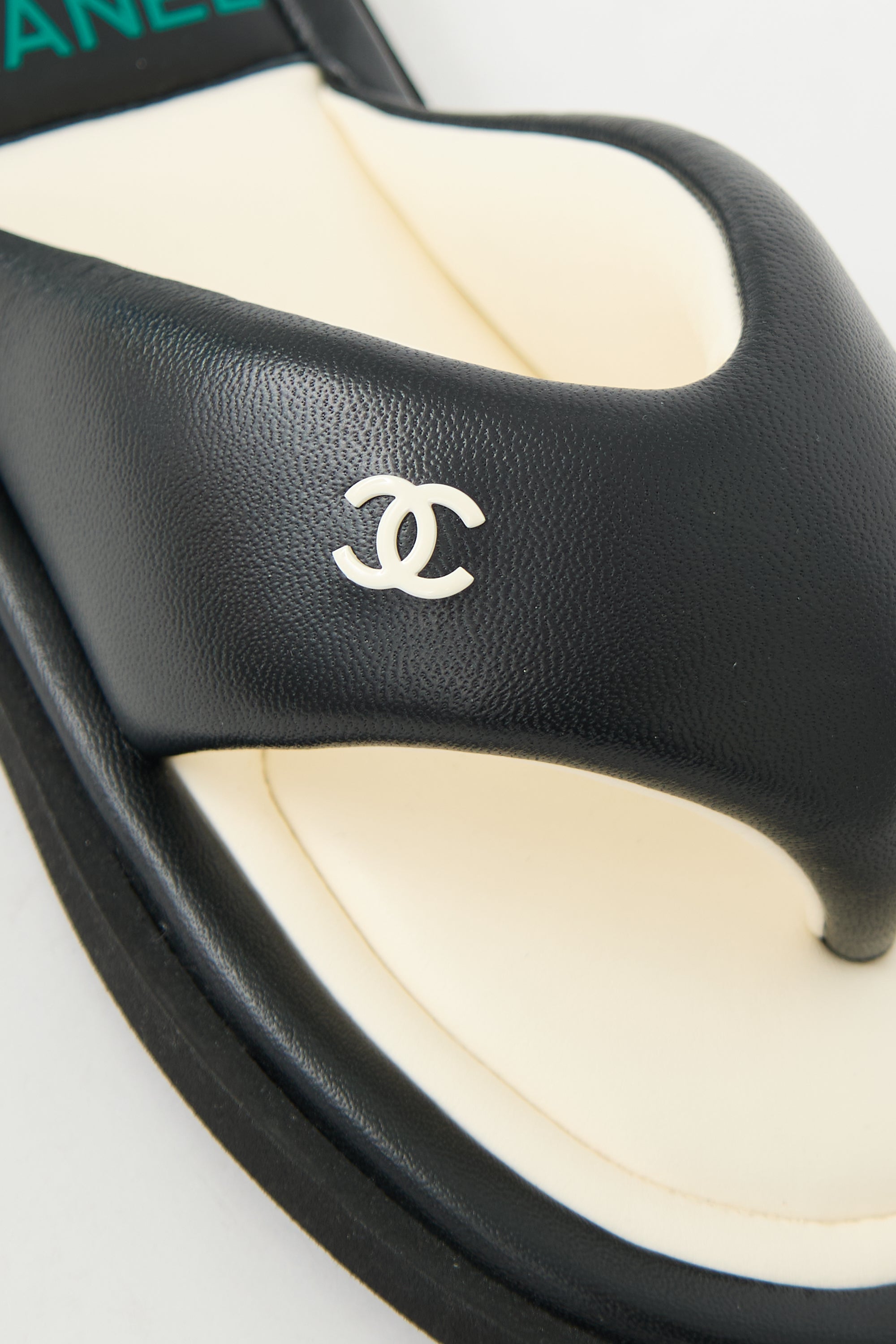 Pre-owned Chanel black leather slides featuring an open rounded toe, padded leather T-strap with white CC logo embellishment, green stamped logo at insole, and slip on entry.