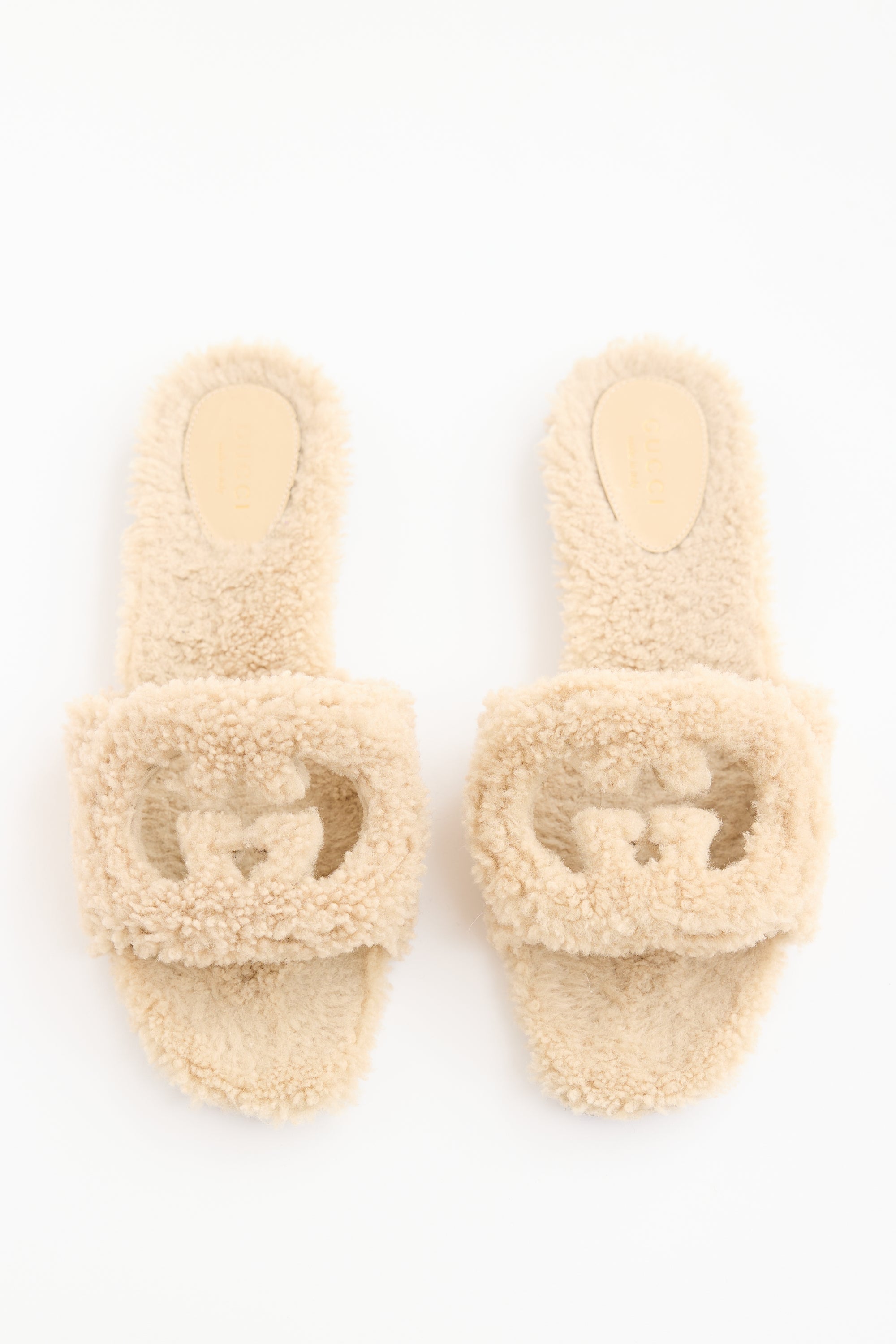Pre-owned Gucci beige shearling slides featuring tapered square toe, interlocking GG logo at vamp, and slip on entry.