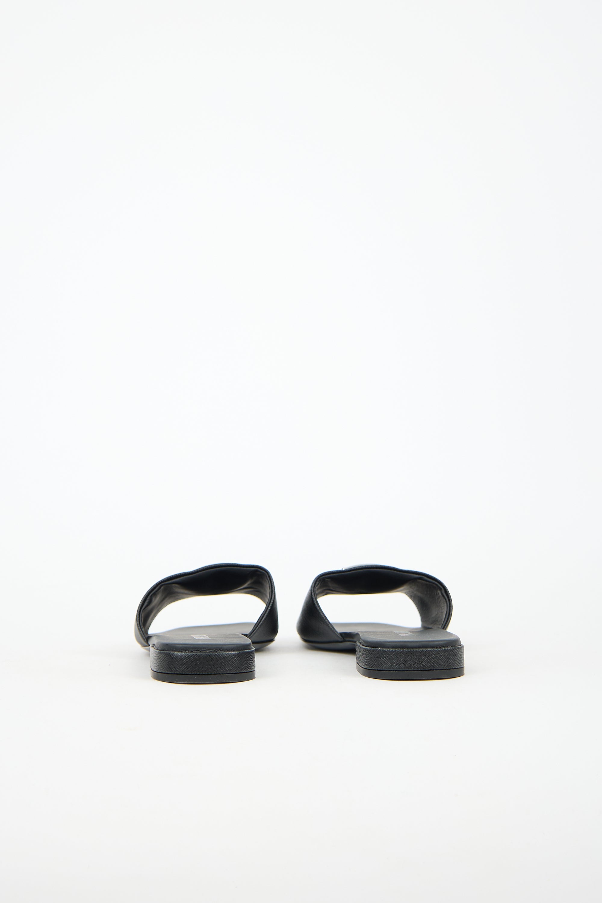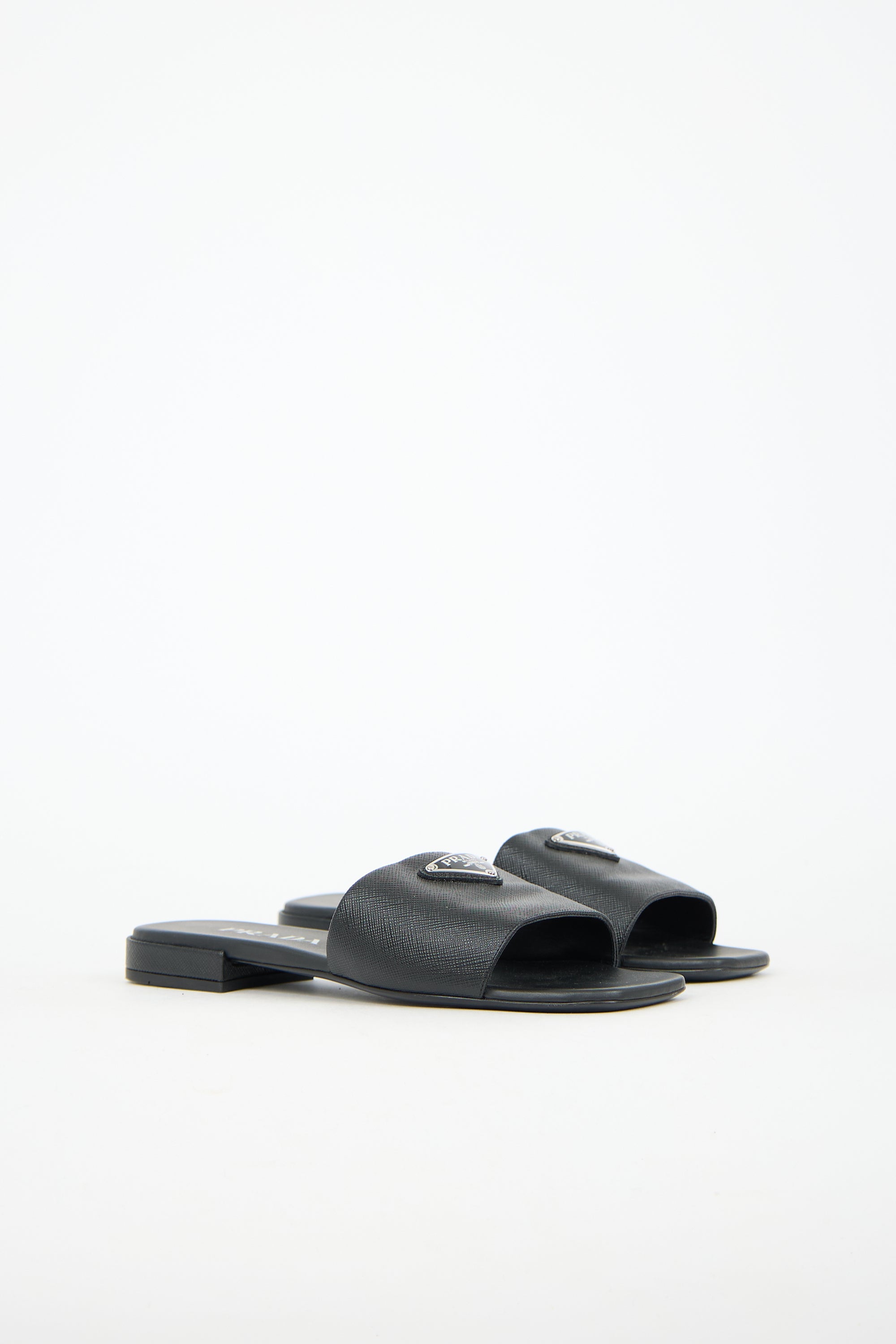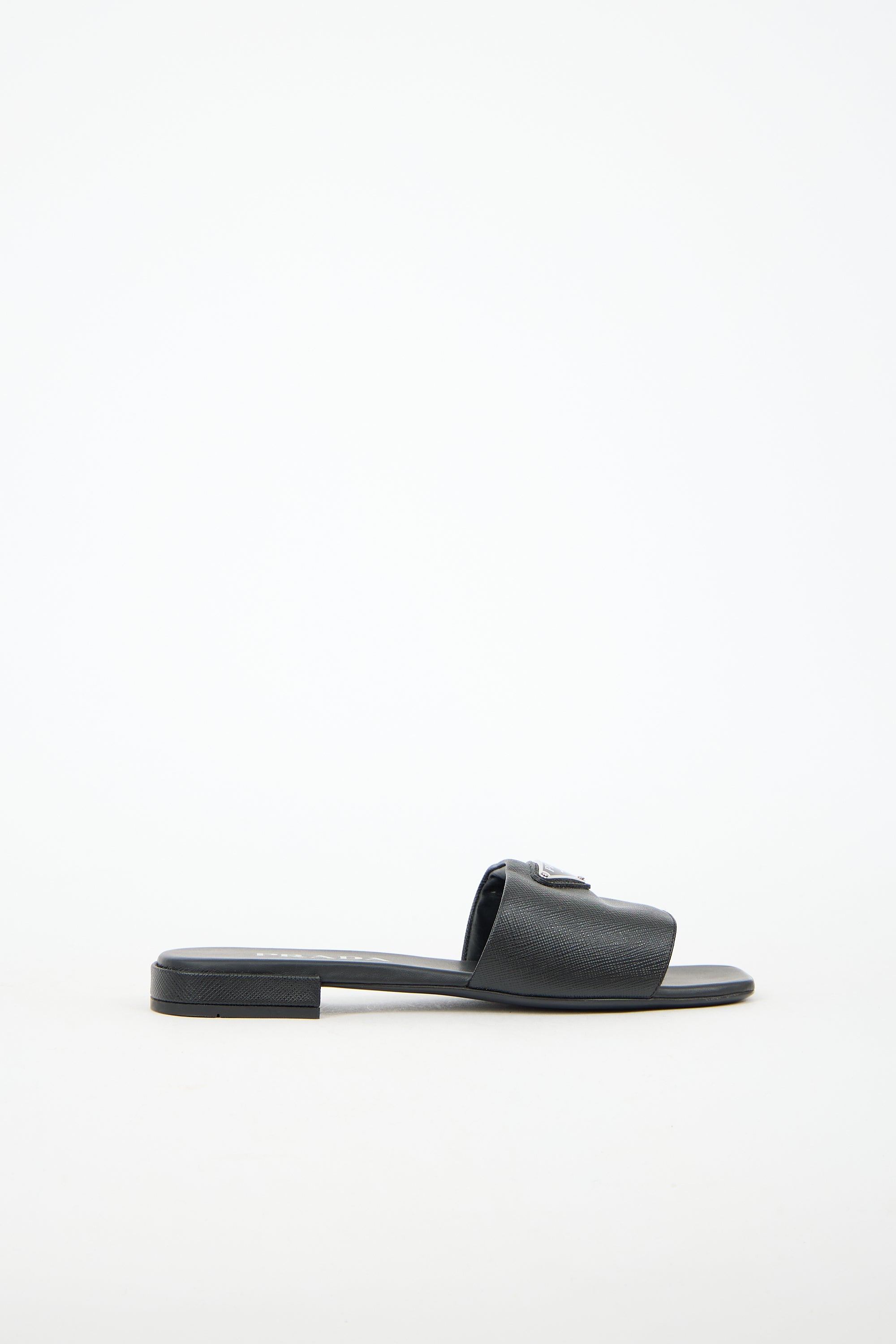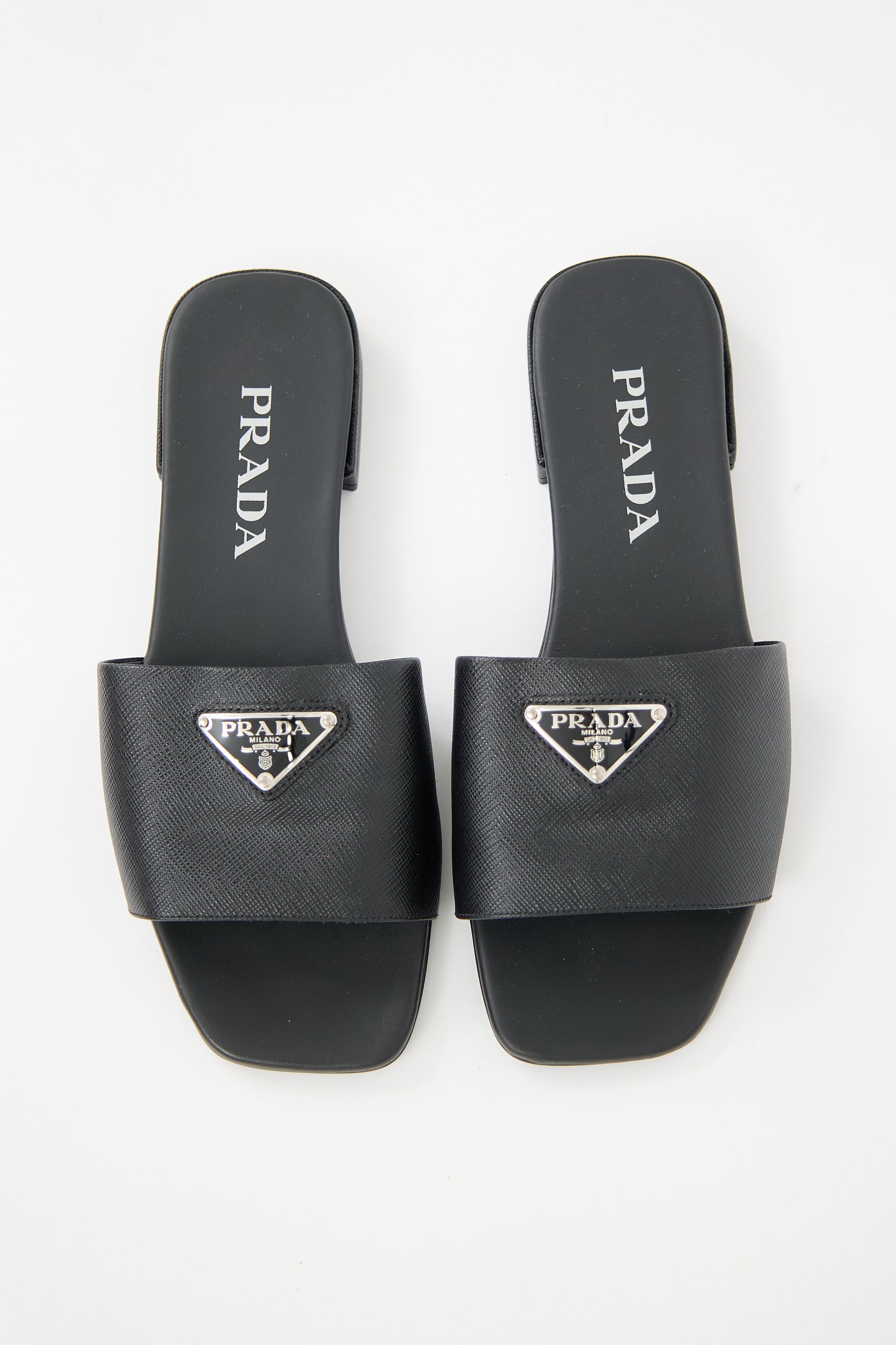 Pre-owned Prada black Saffiano leather sides featuring an open square toe, signature triangle logo embellishment at vamp, and slip on entry.