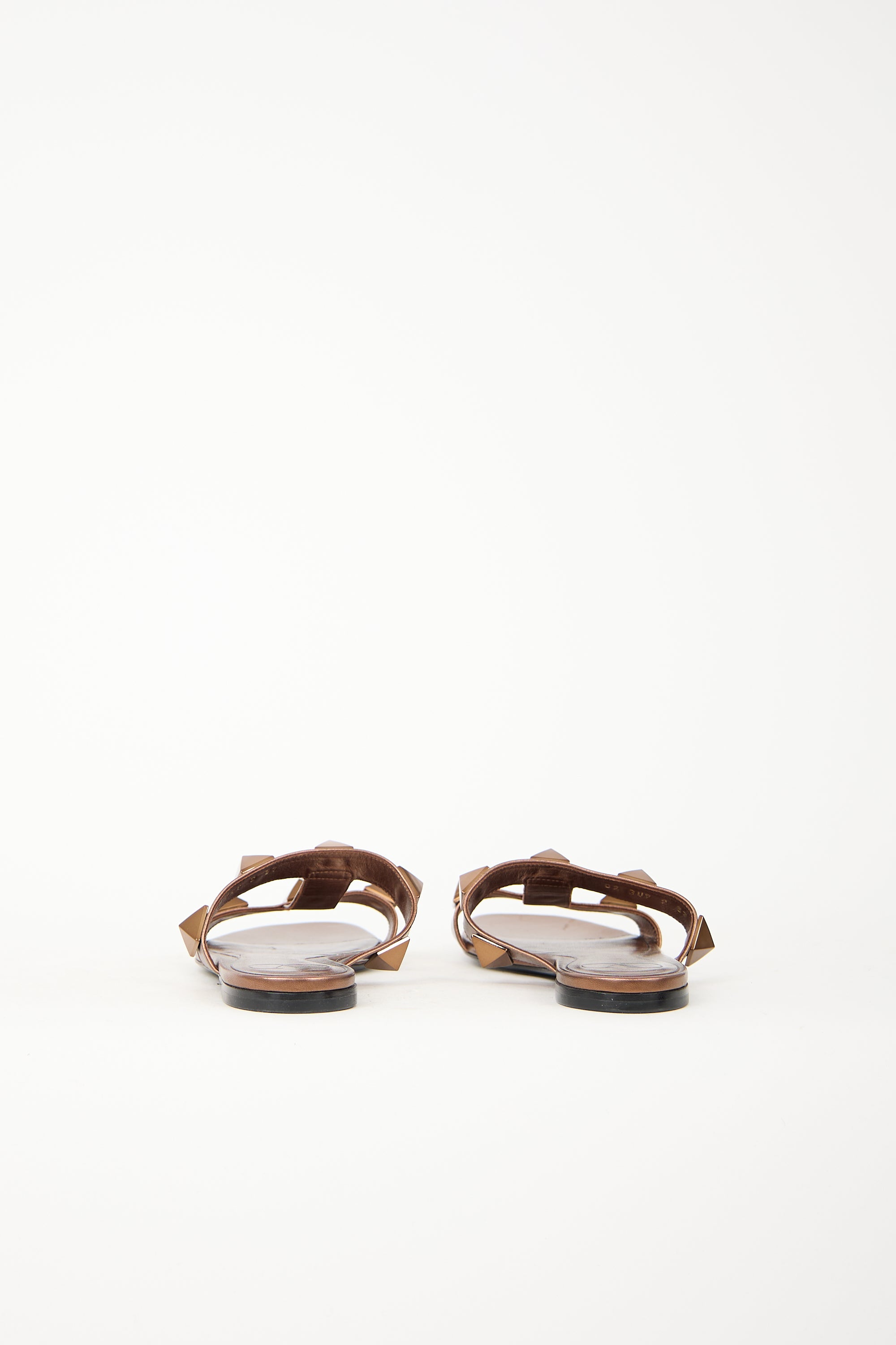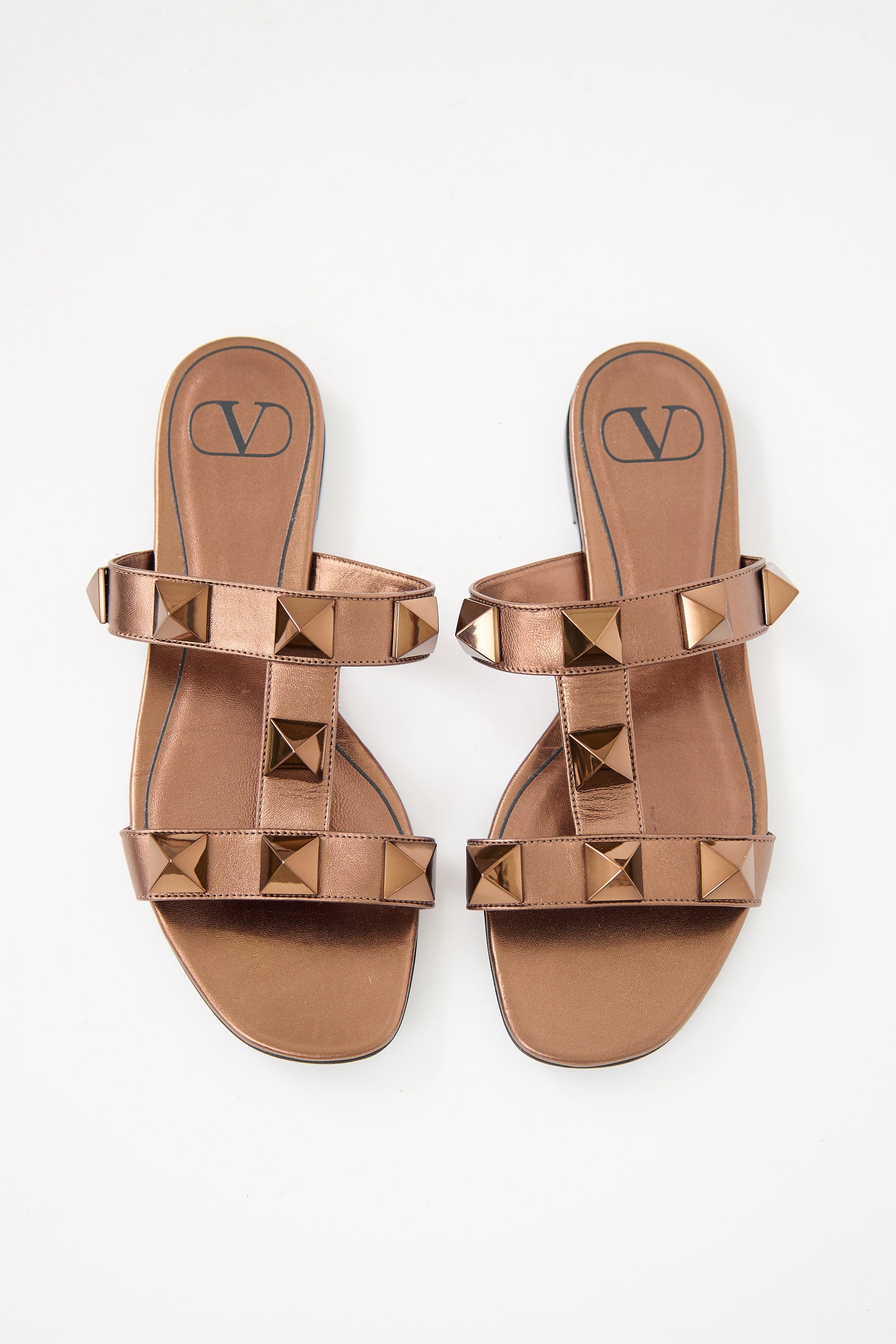 Pre-owned Valentino bronze leather slides featuring open square toe, bronze tone Roman stud embellished vamp strap, and short block heel.