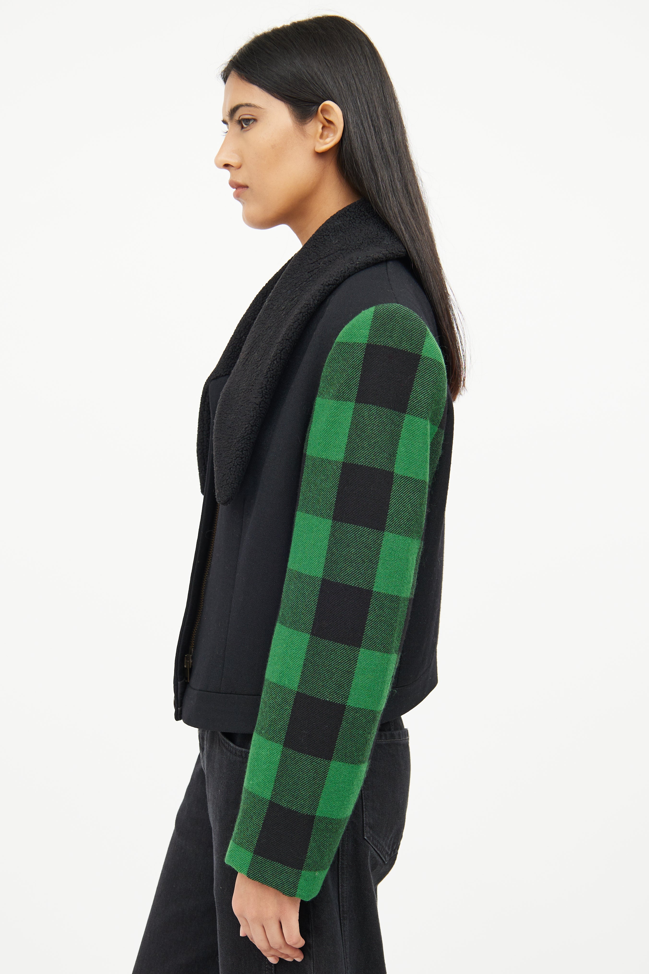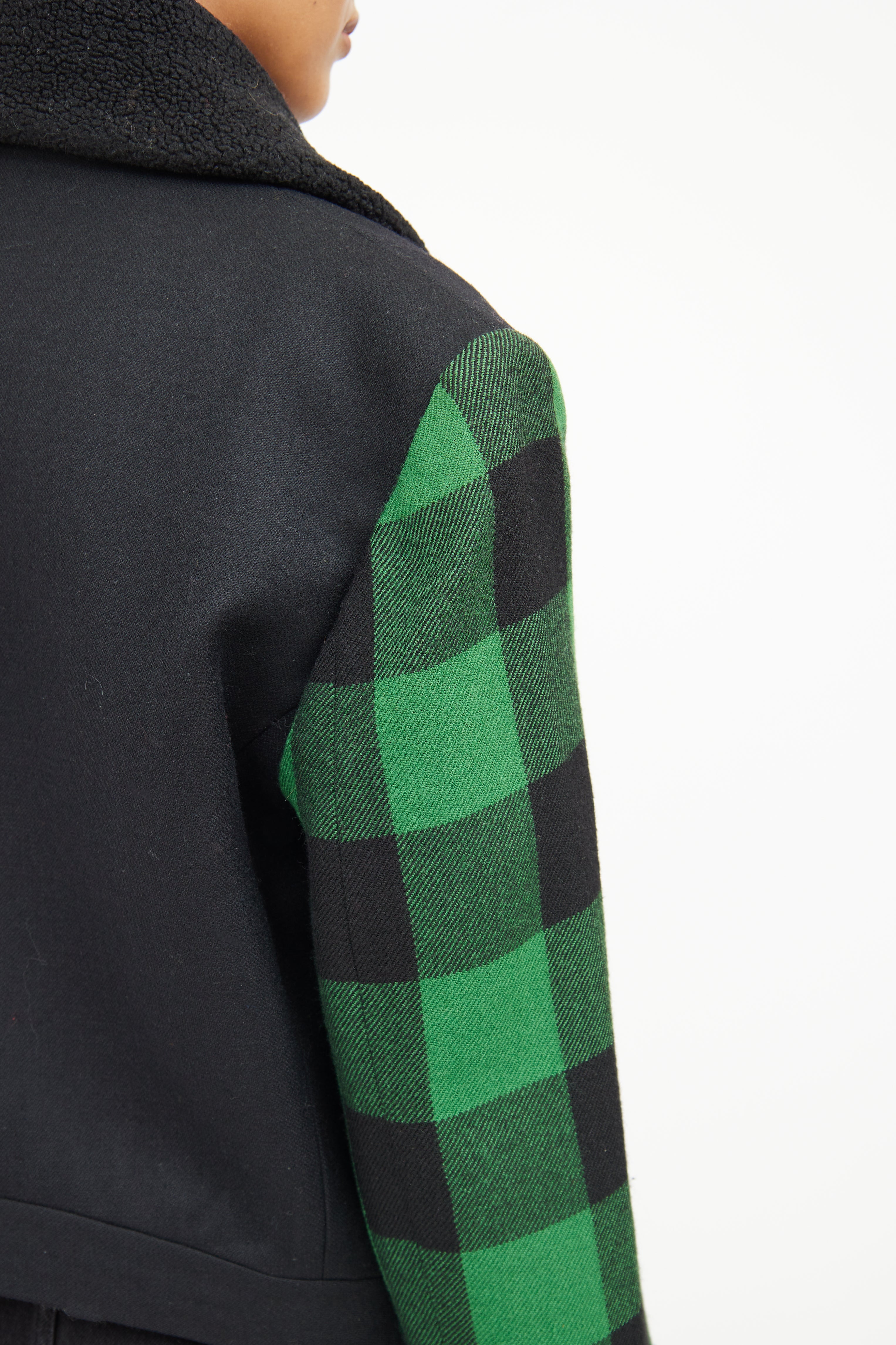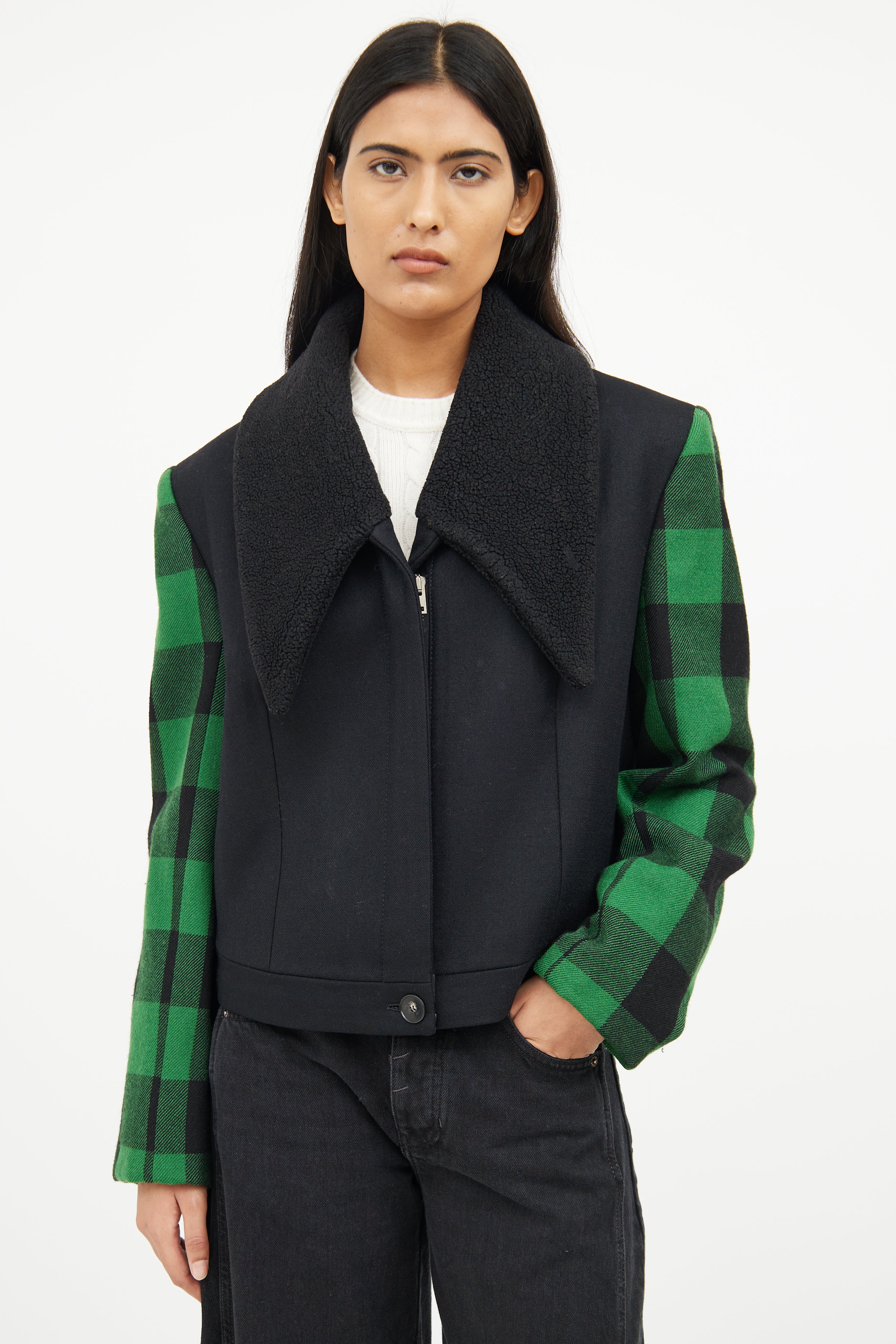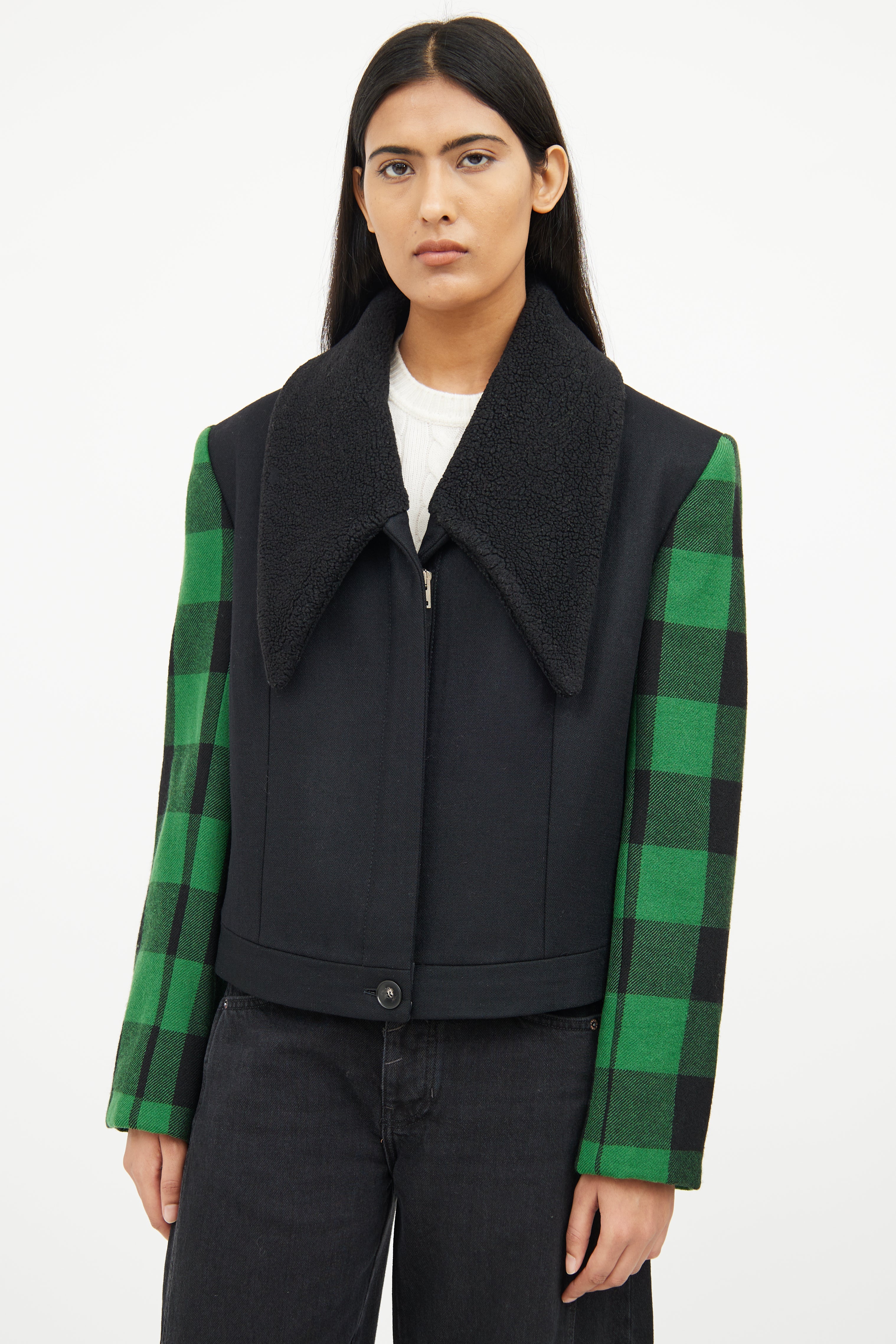 Pre-owned Stella McCartney black and green long sleeve jacket featuring exaggerated point collar, padded shoulders, green plaid sleeves, concealed zip and button front and crop fit.