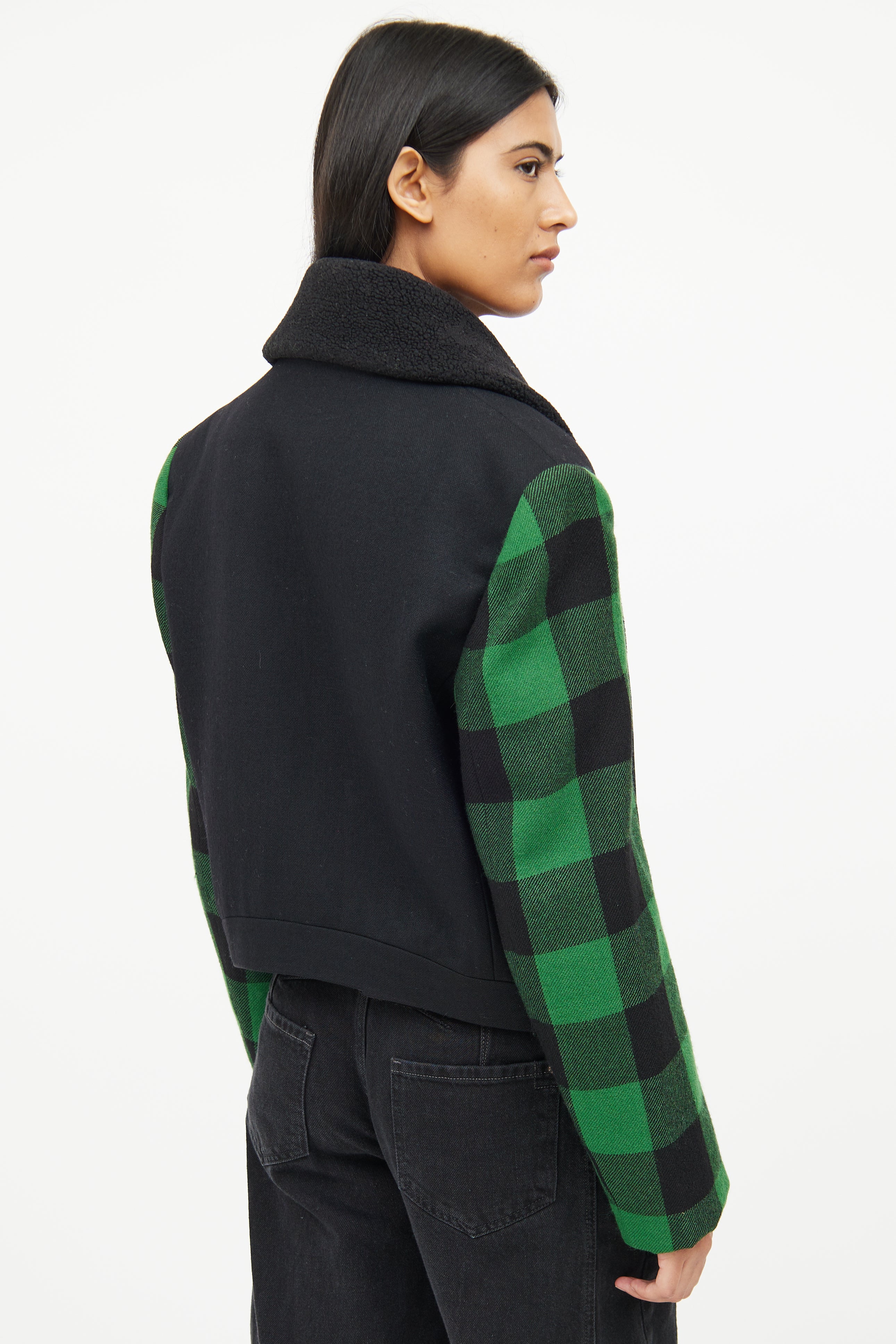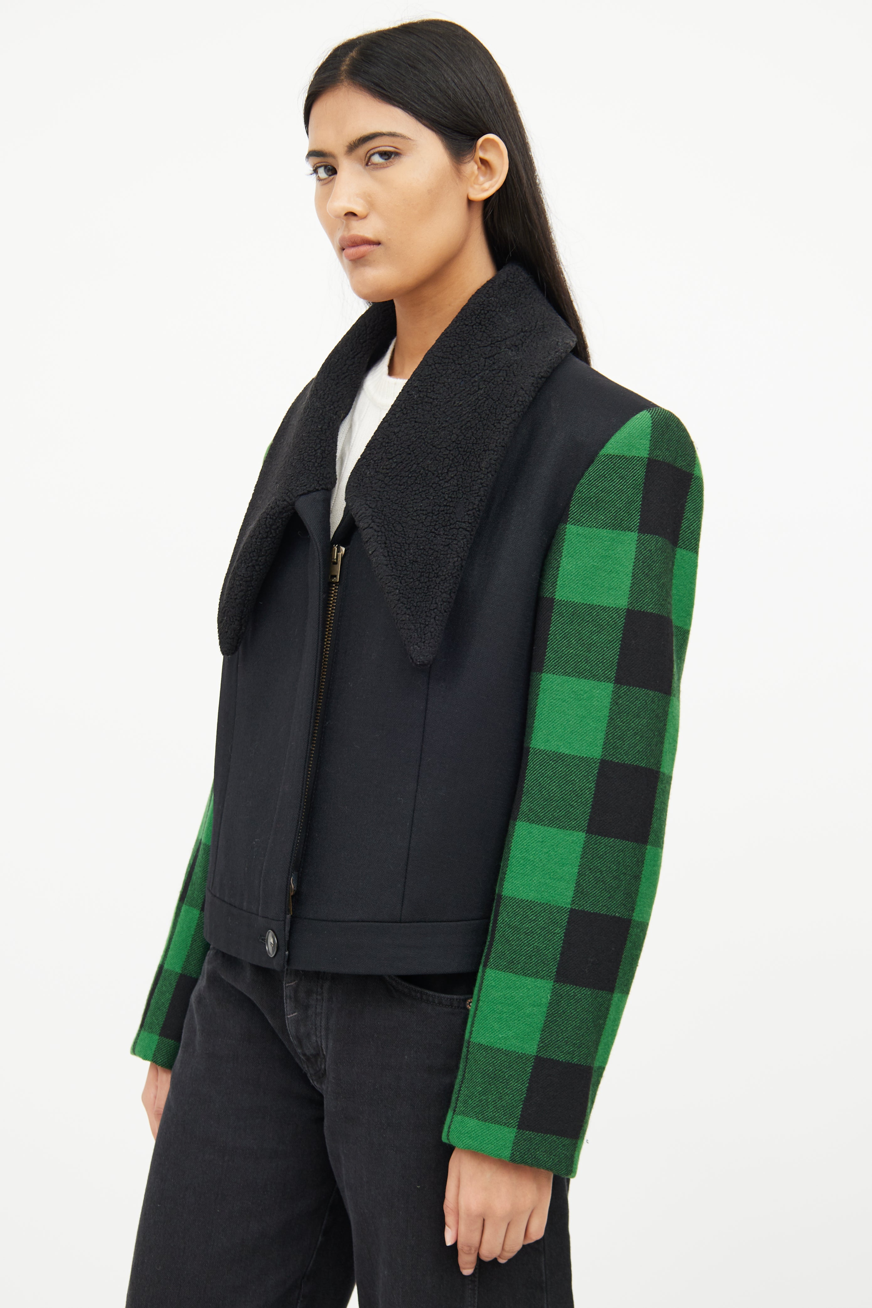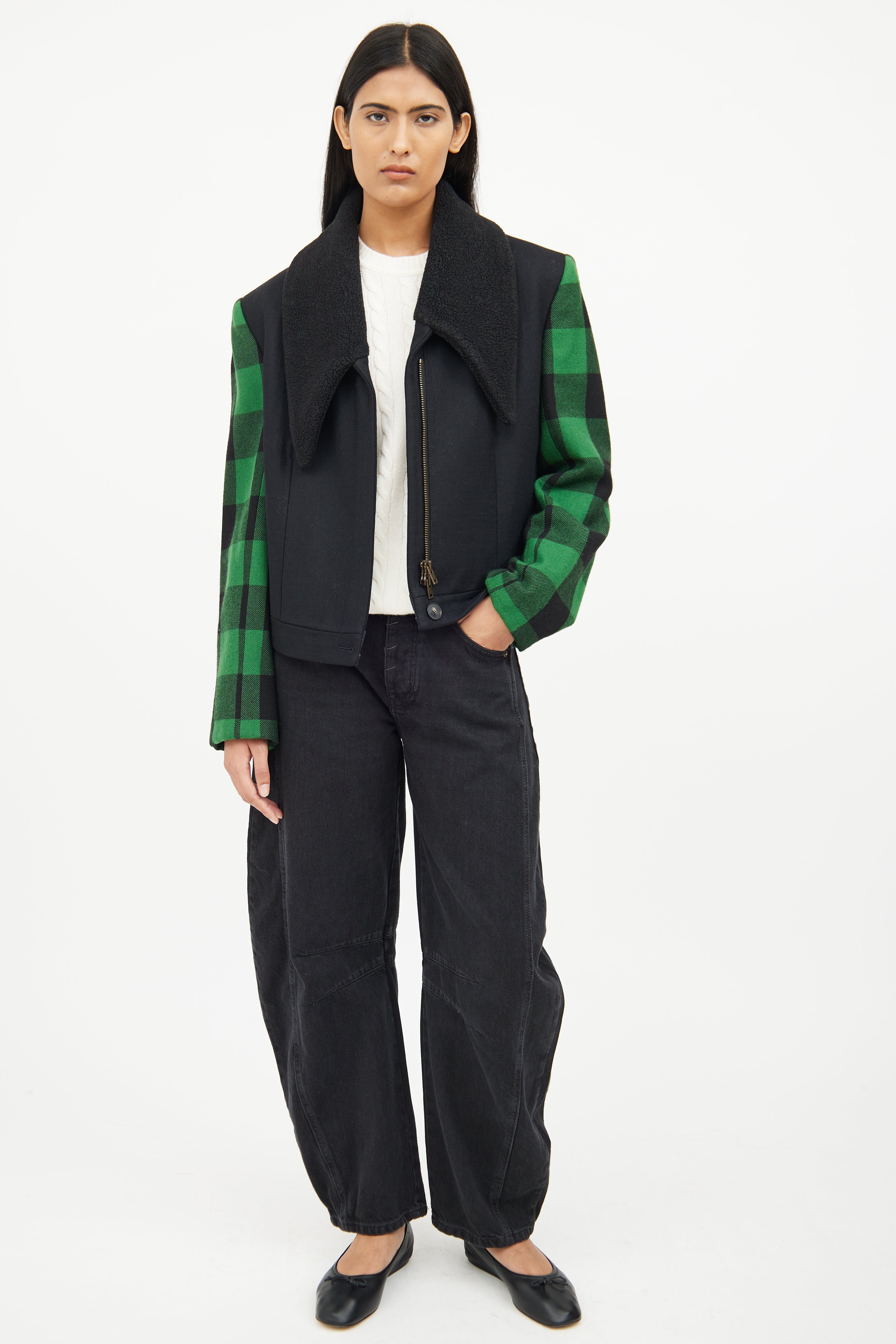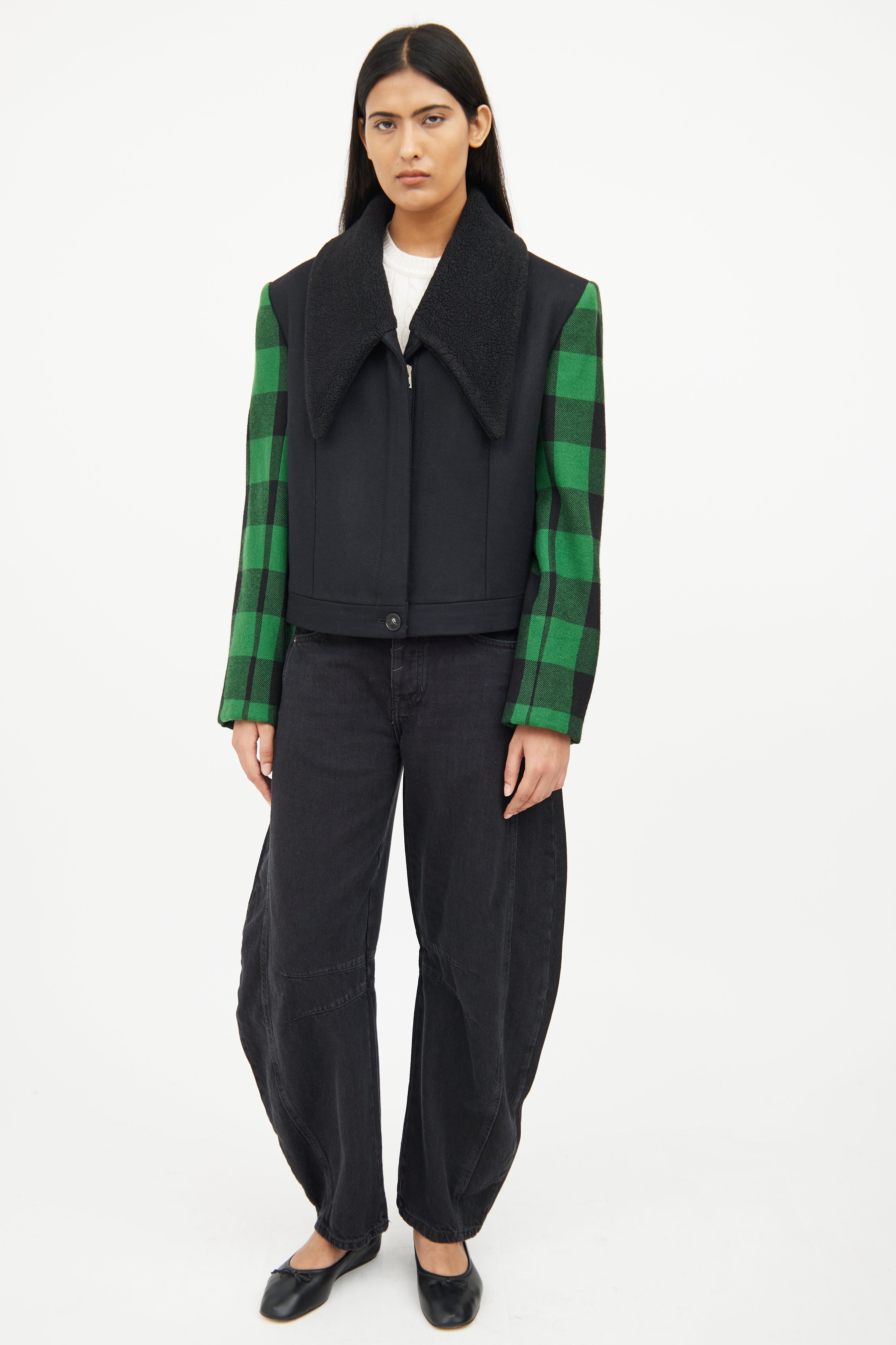 Pre-owned Stella McCartney black and green long sleeve jacket featuring exaggerated point collar, padded shoulders, green plaid sleeves, concealed zip and button front and crop fit.