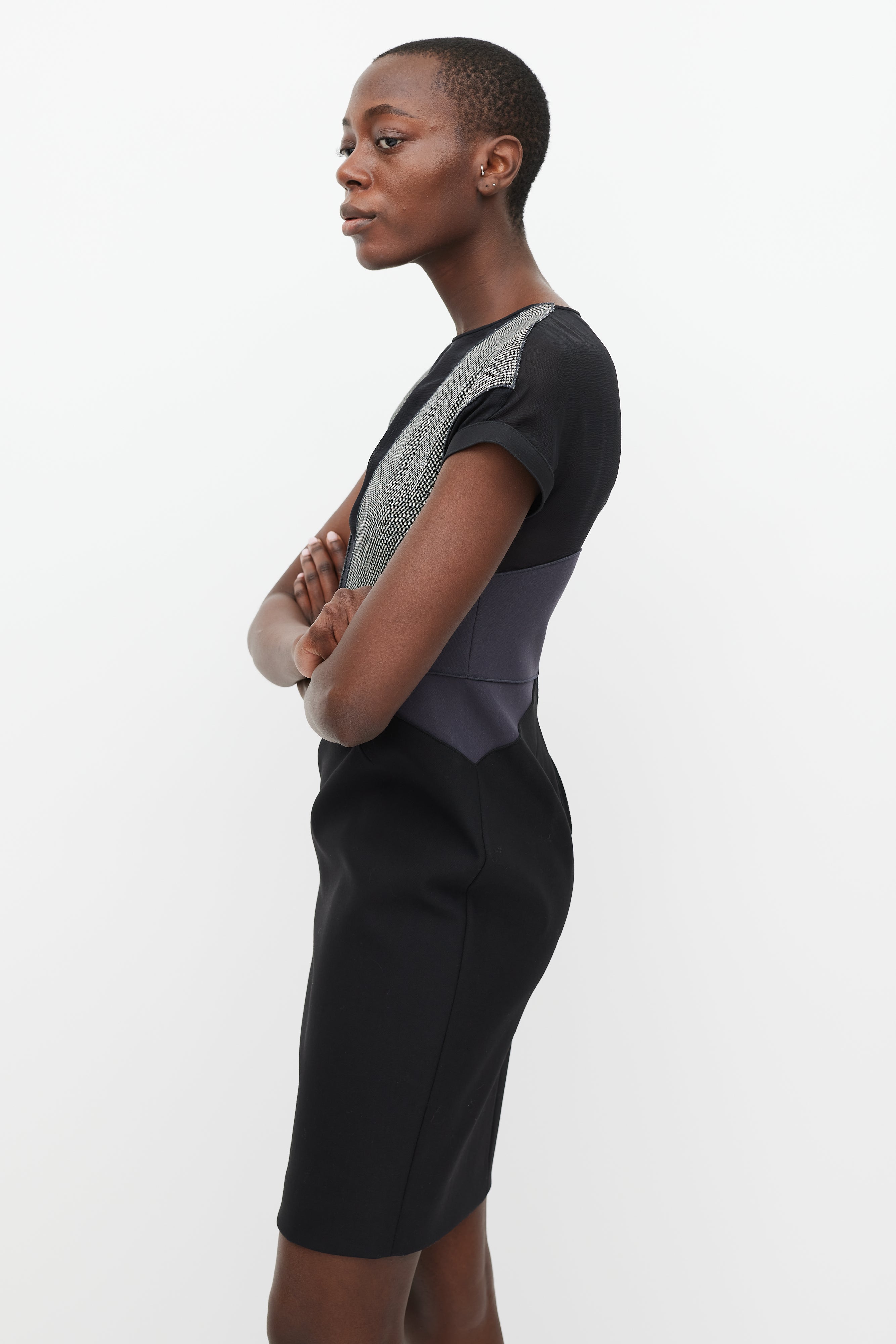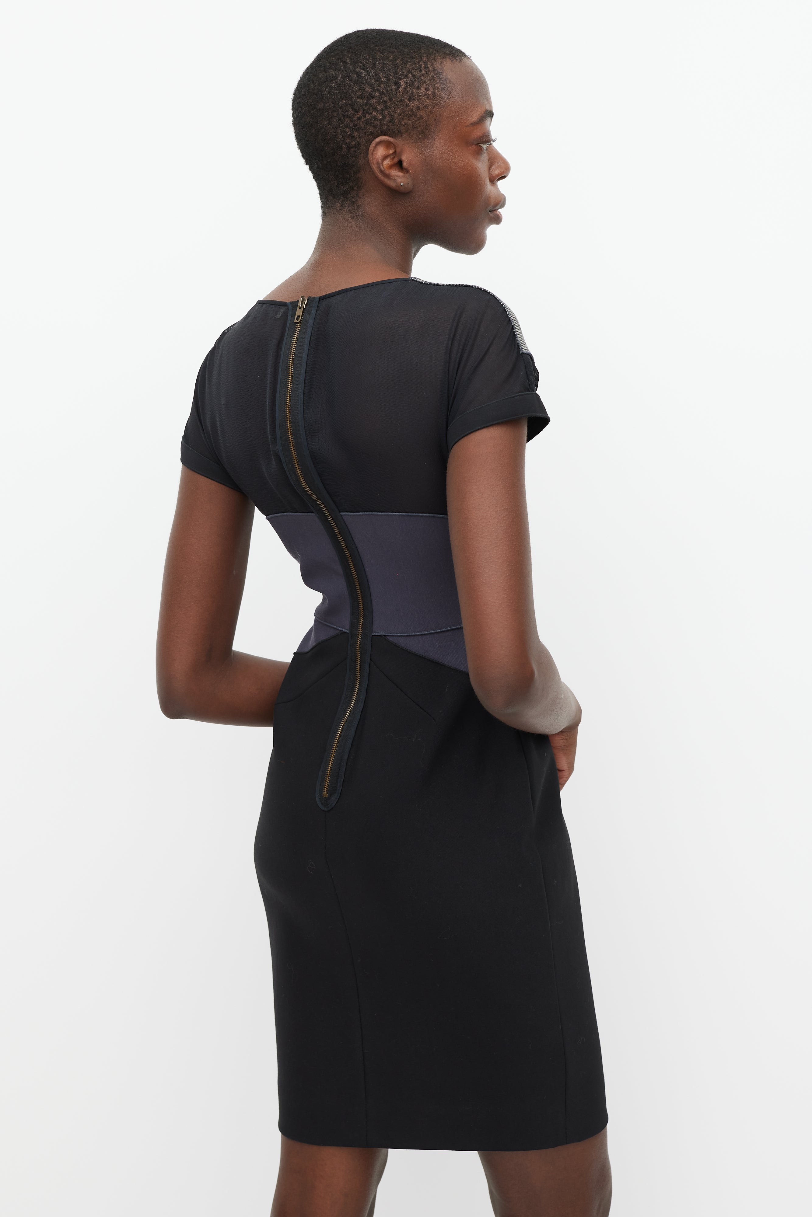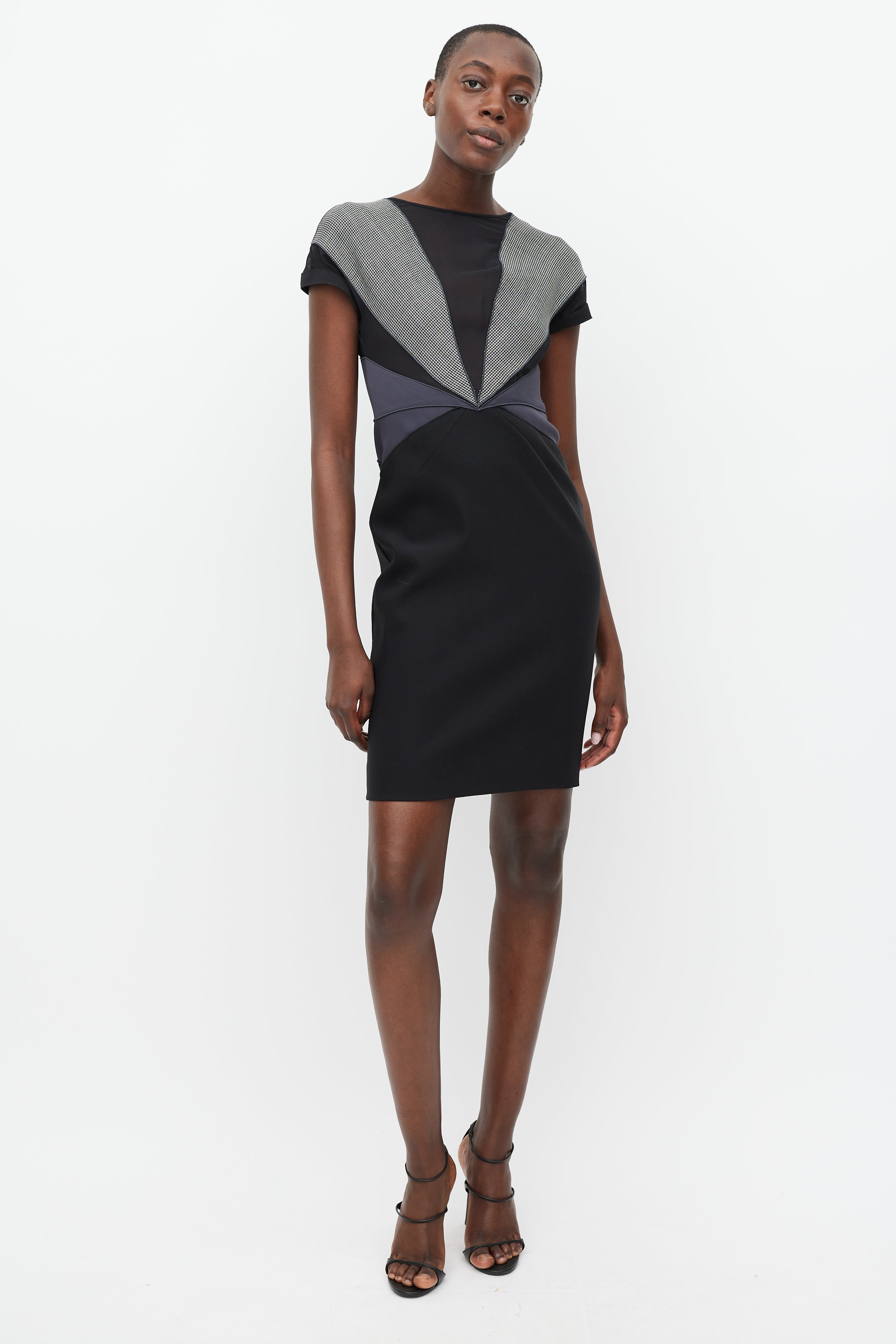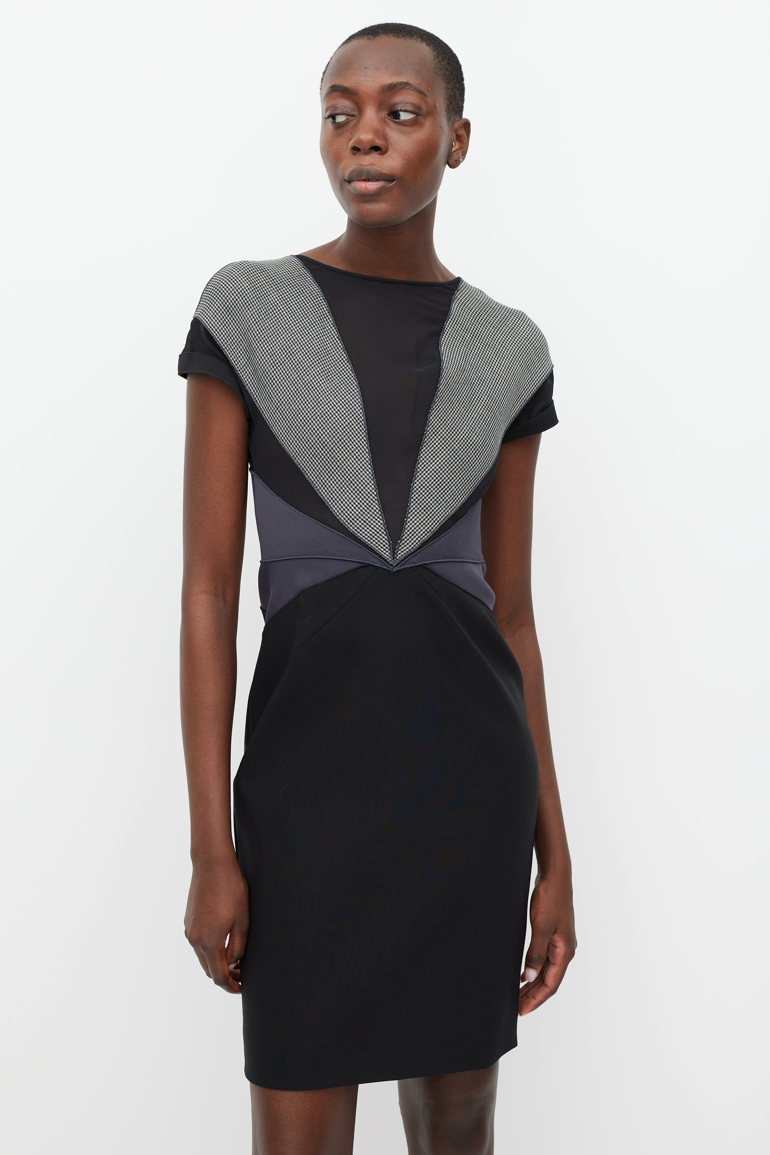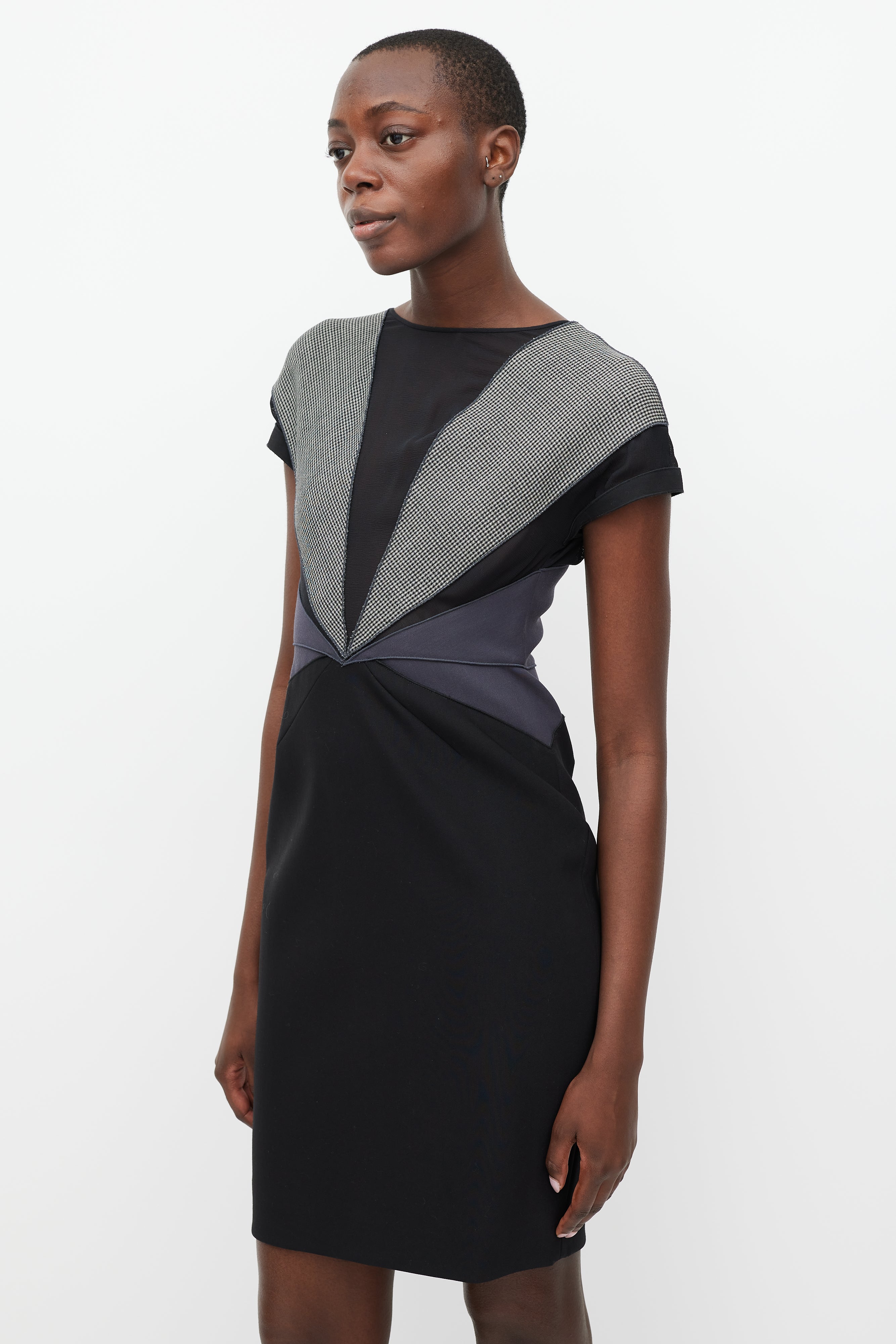 Pre-owned Stella McCartney black and grey midi dress featuring houndstooth, mesh, and contrast fabric panels, a rounded neckline, short sleeves, and a gold tone back zip.