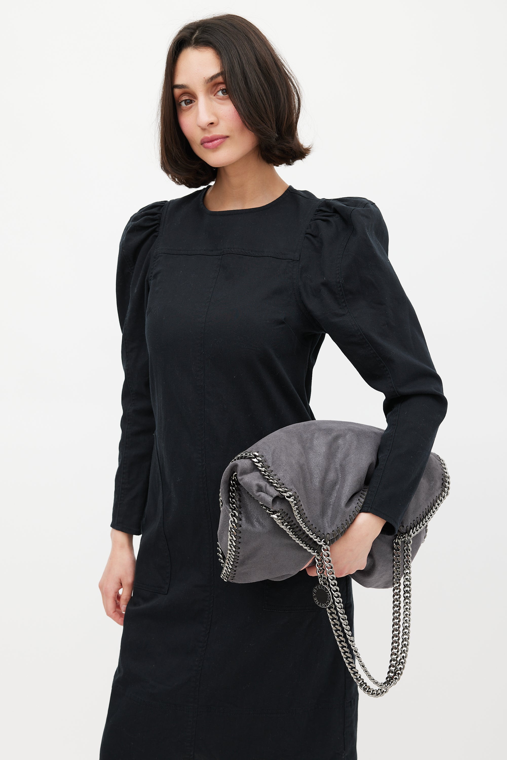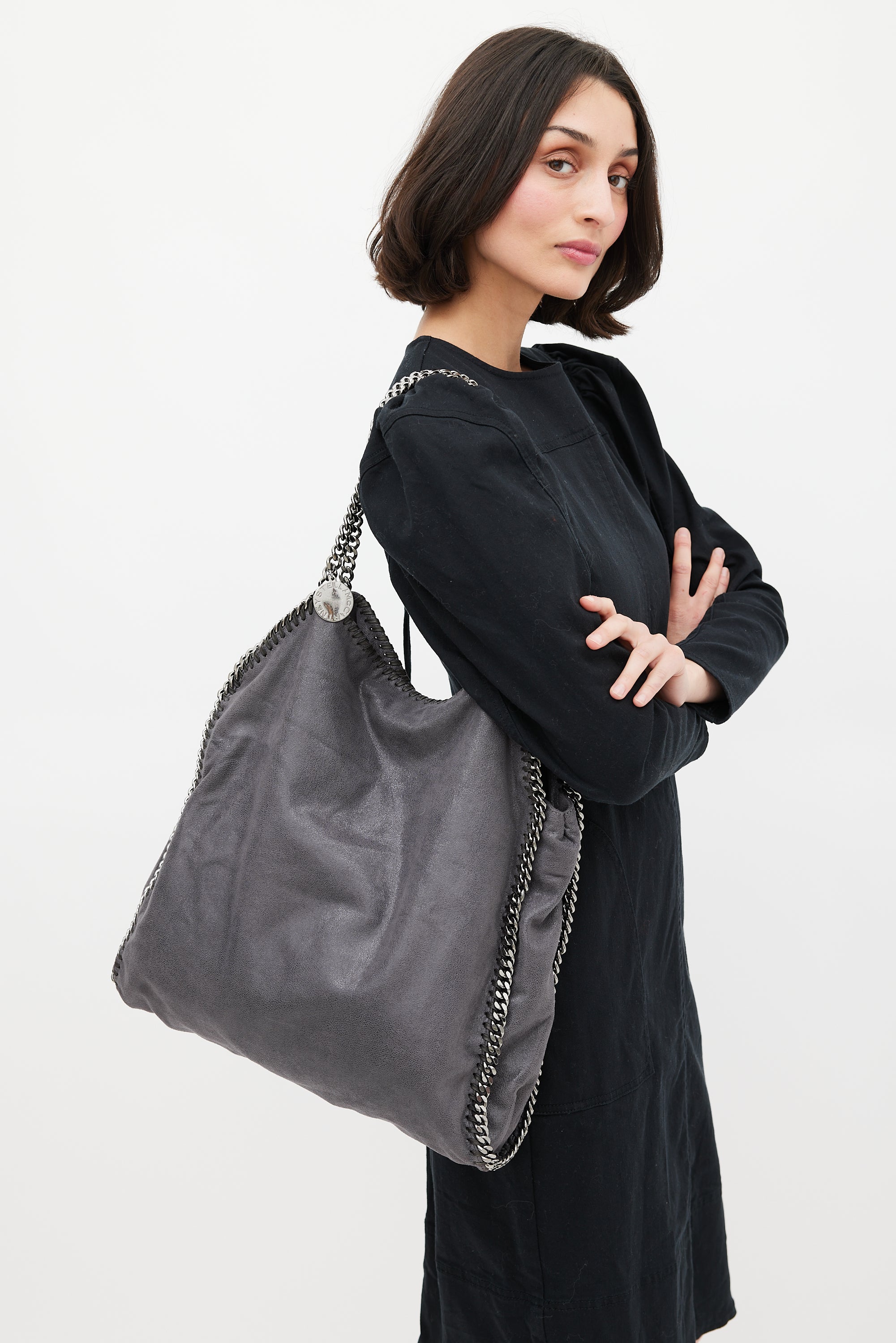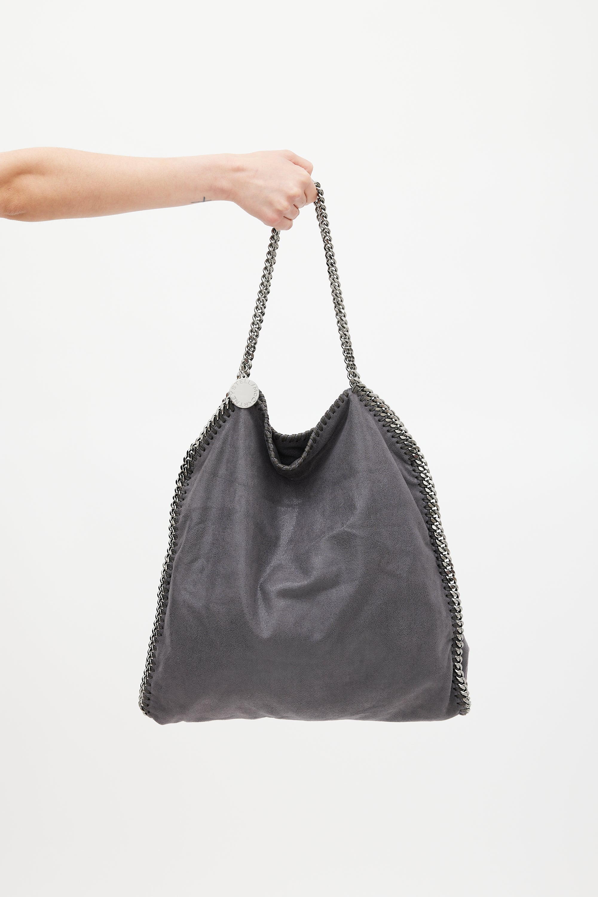Pre-owned Stella McCartney grey Falabella tote bag featuring vegan Shaggy Deer exterior, gunmetal tone hardware, braided leather and chain link trim, two fixed chain shoulder strap with logo charm, snap button closure, lined main compartment, detachable zip pouch, and one zip and phone pocket inside. Comes with original dust bag.