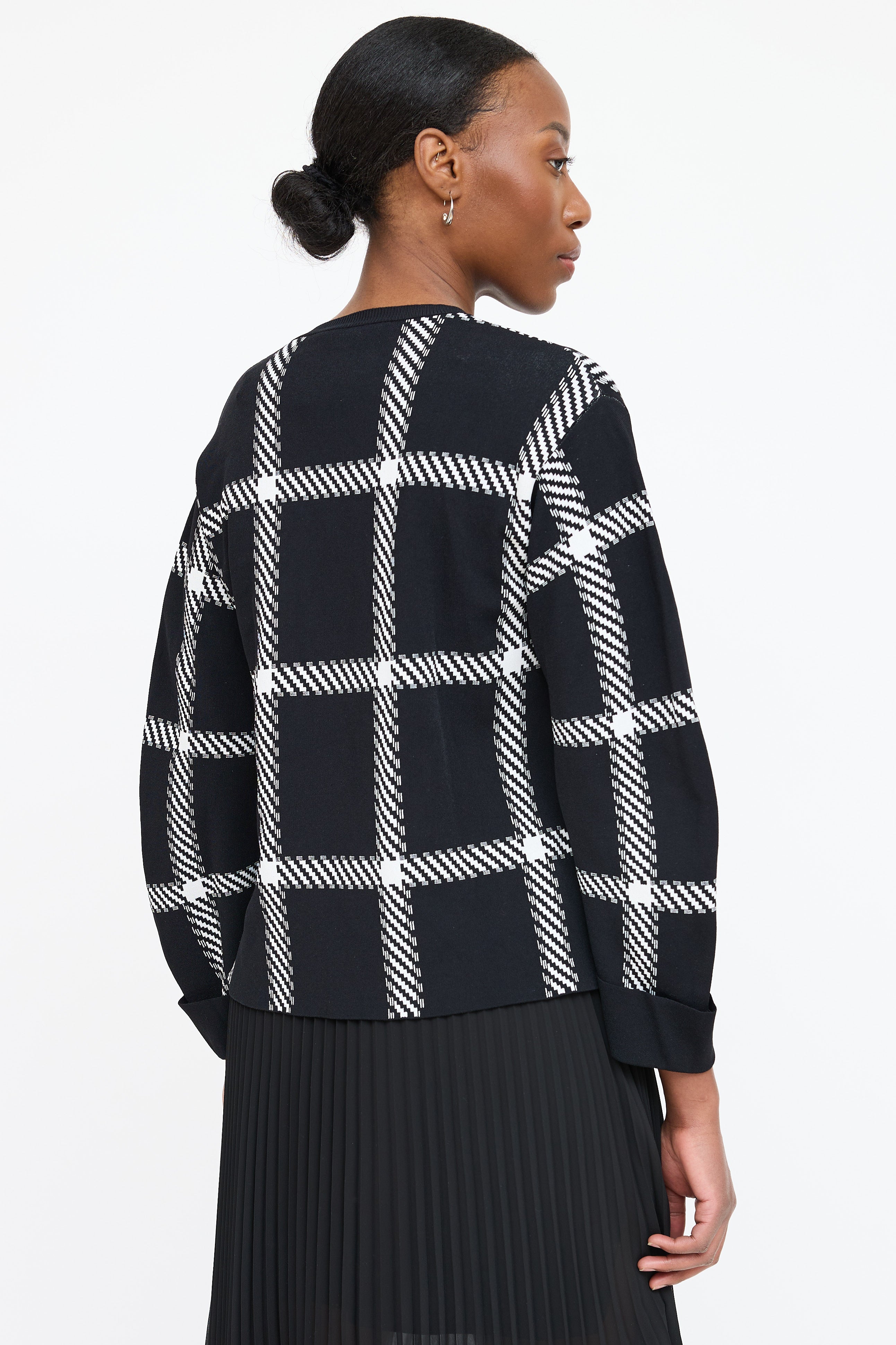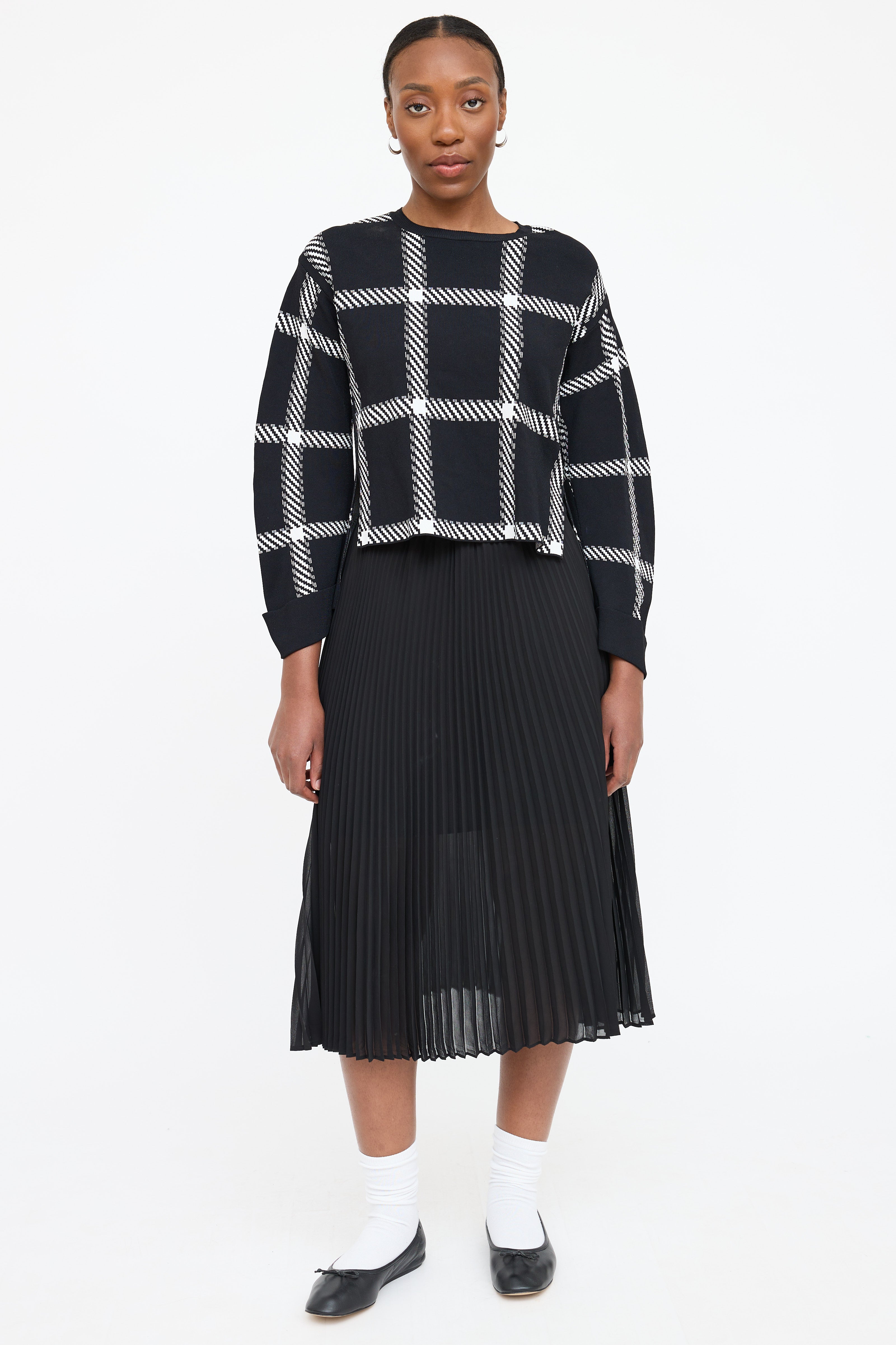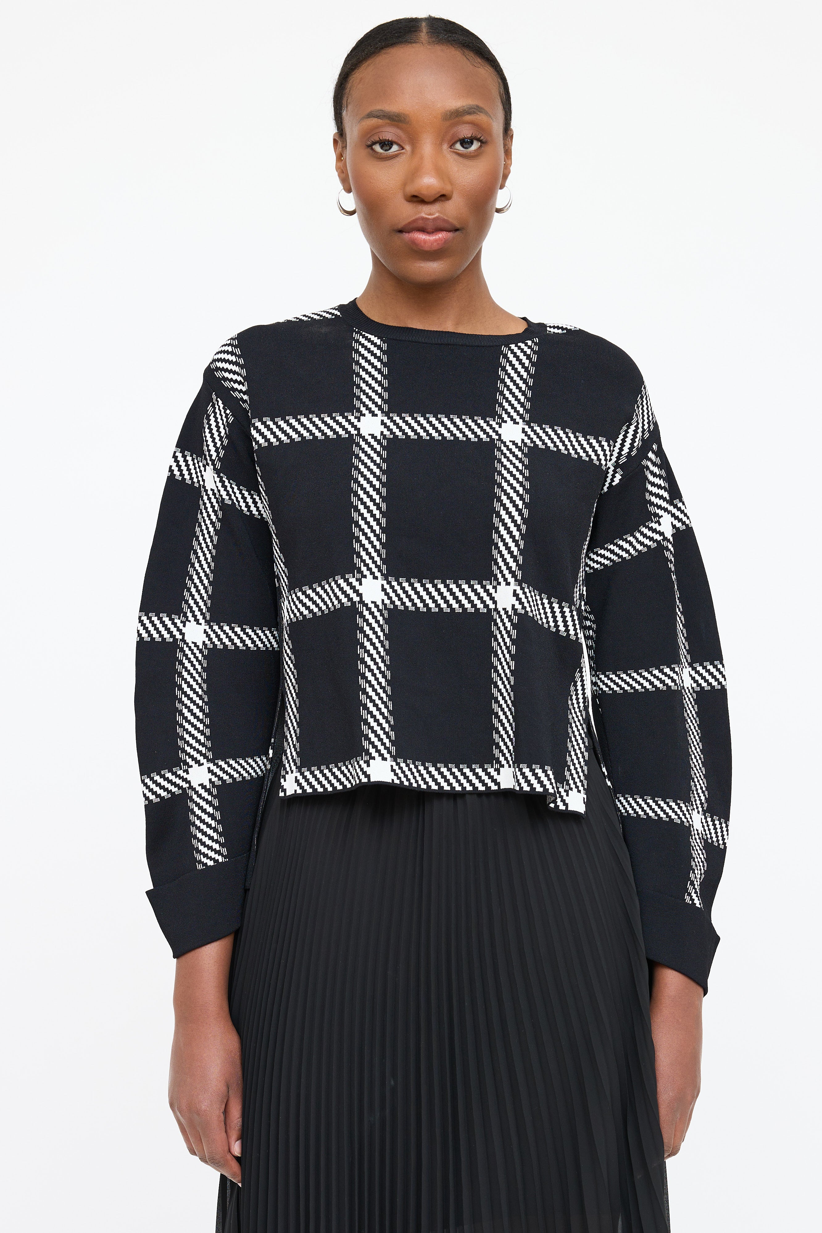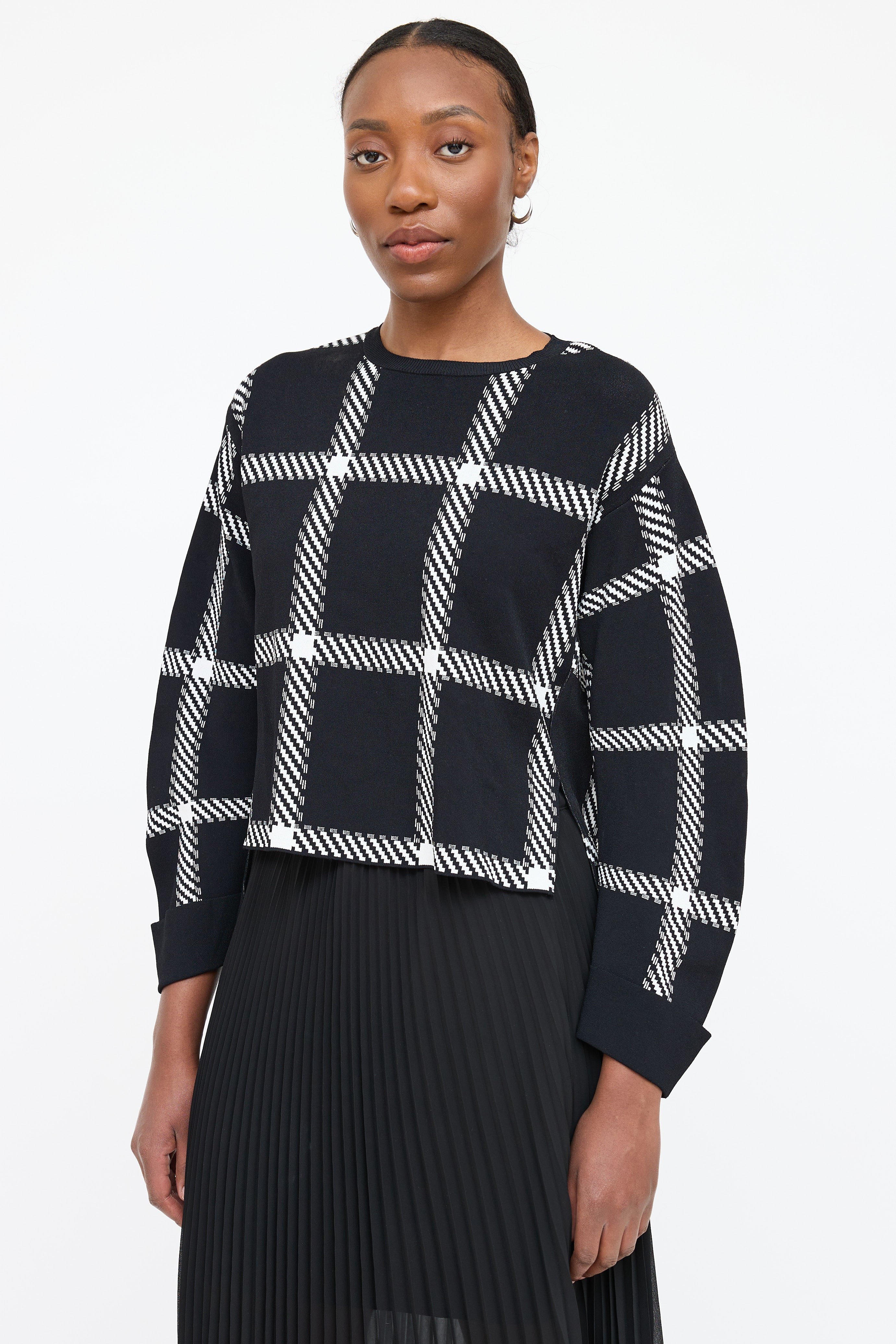 Pre-owned Stella McCartney white and black knit long sleeve top featuring ribbed round collar, side vents, high low hemline and cuffed sleeves.