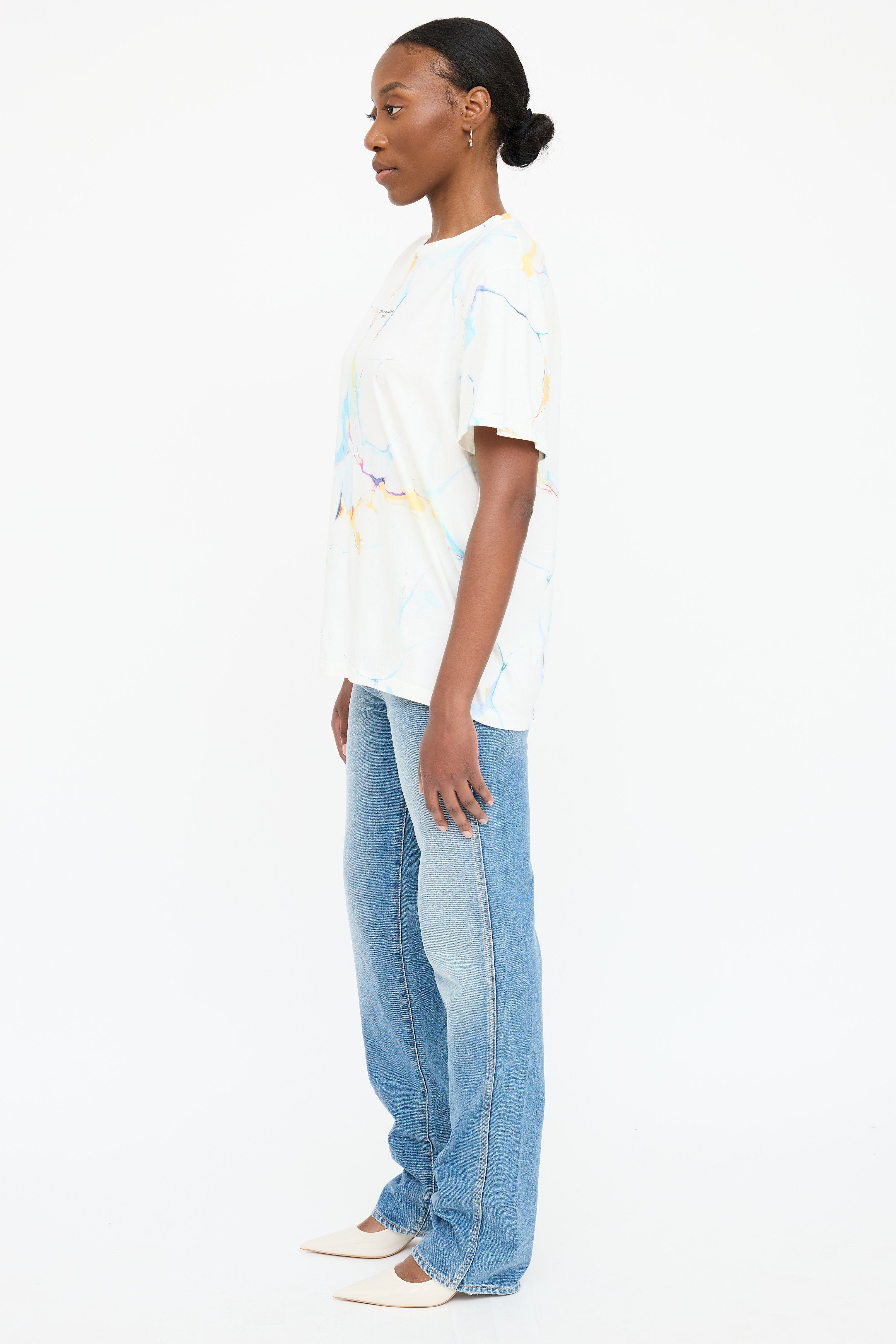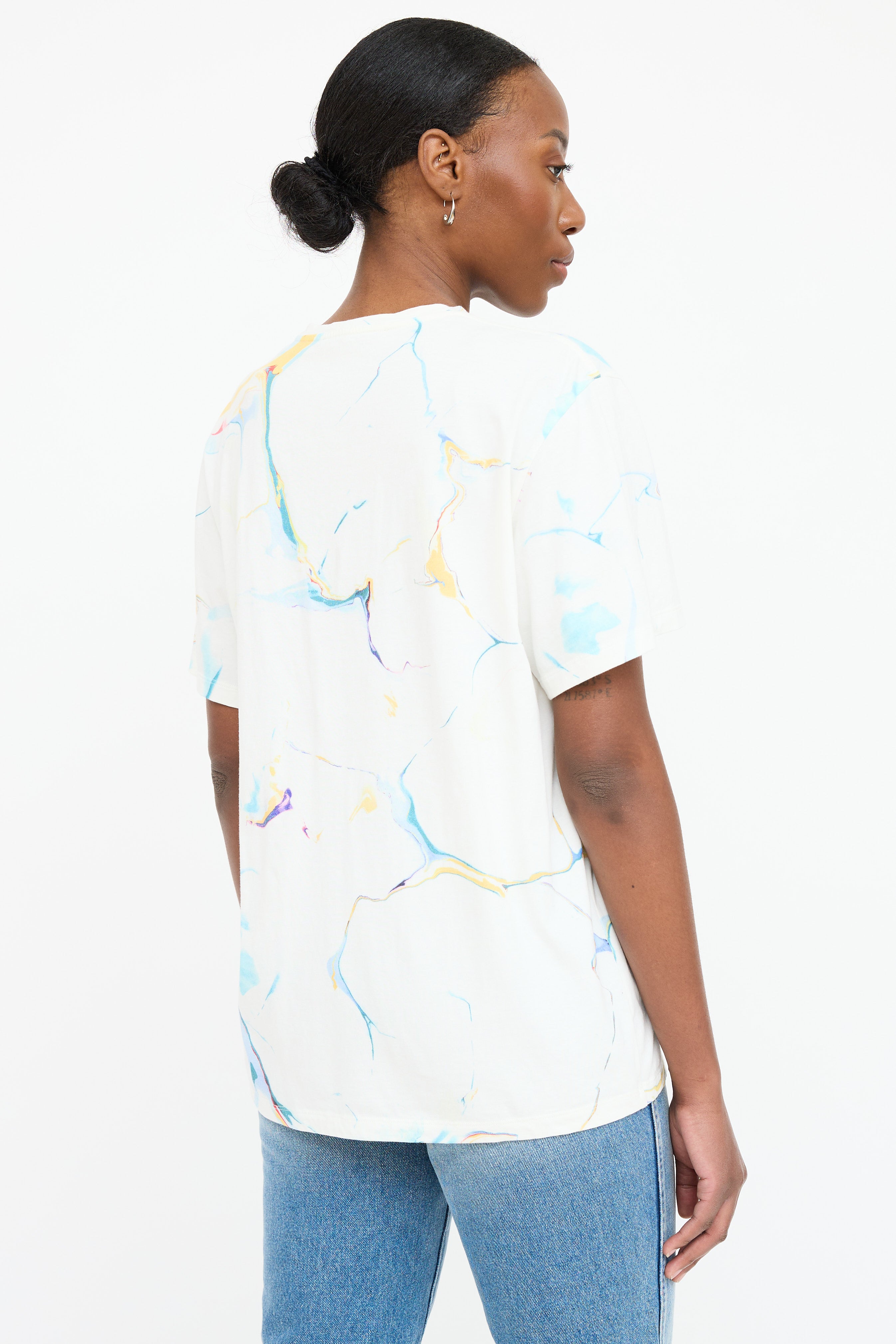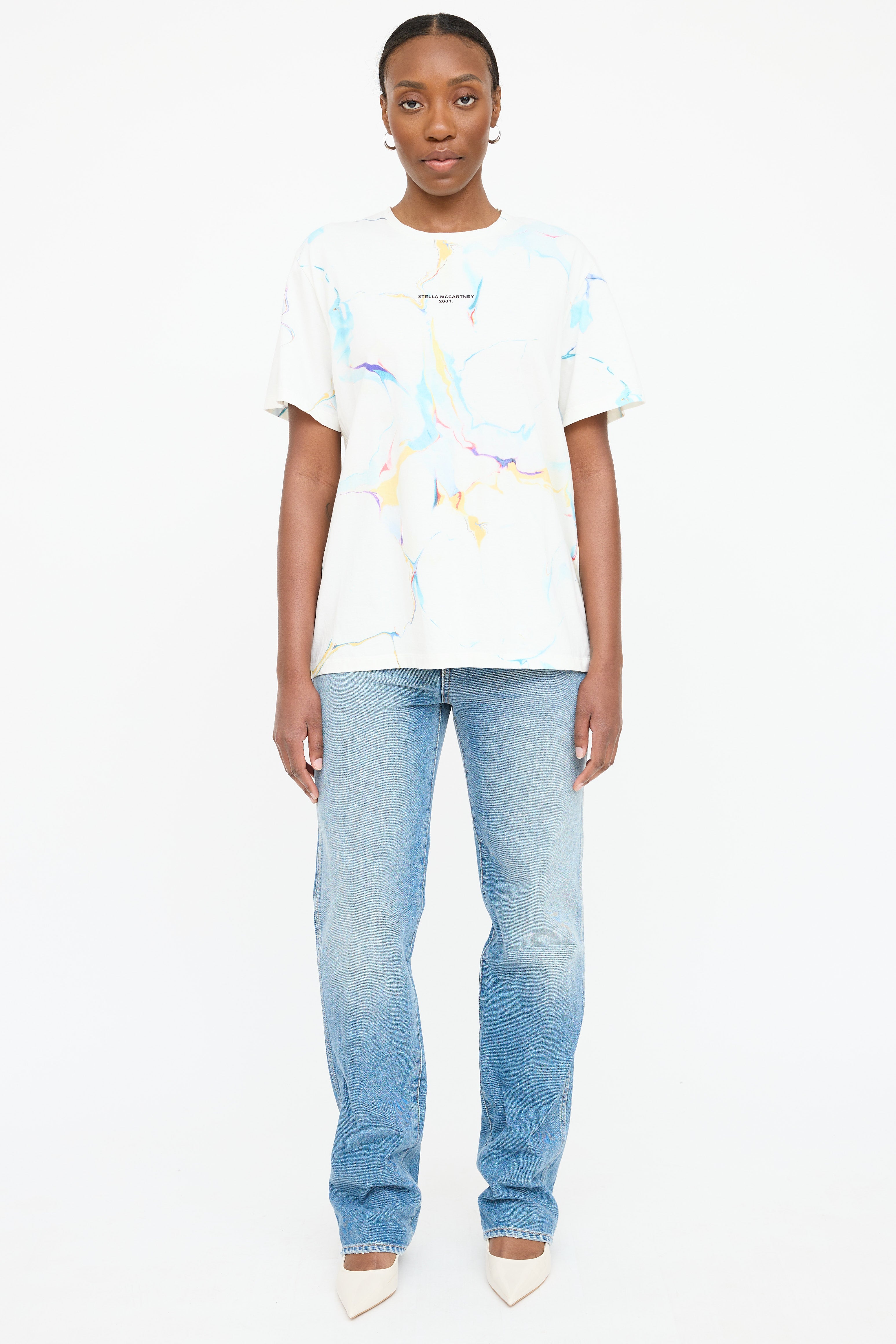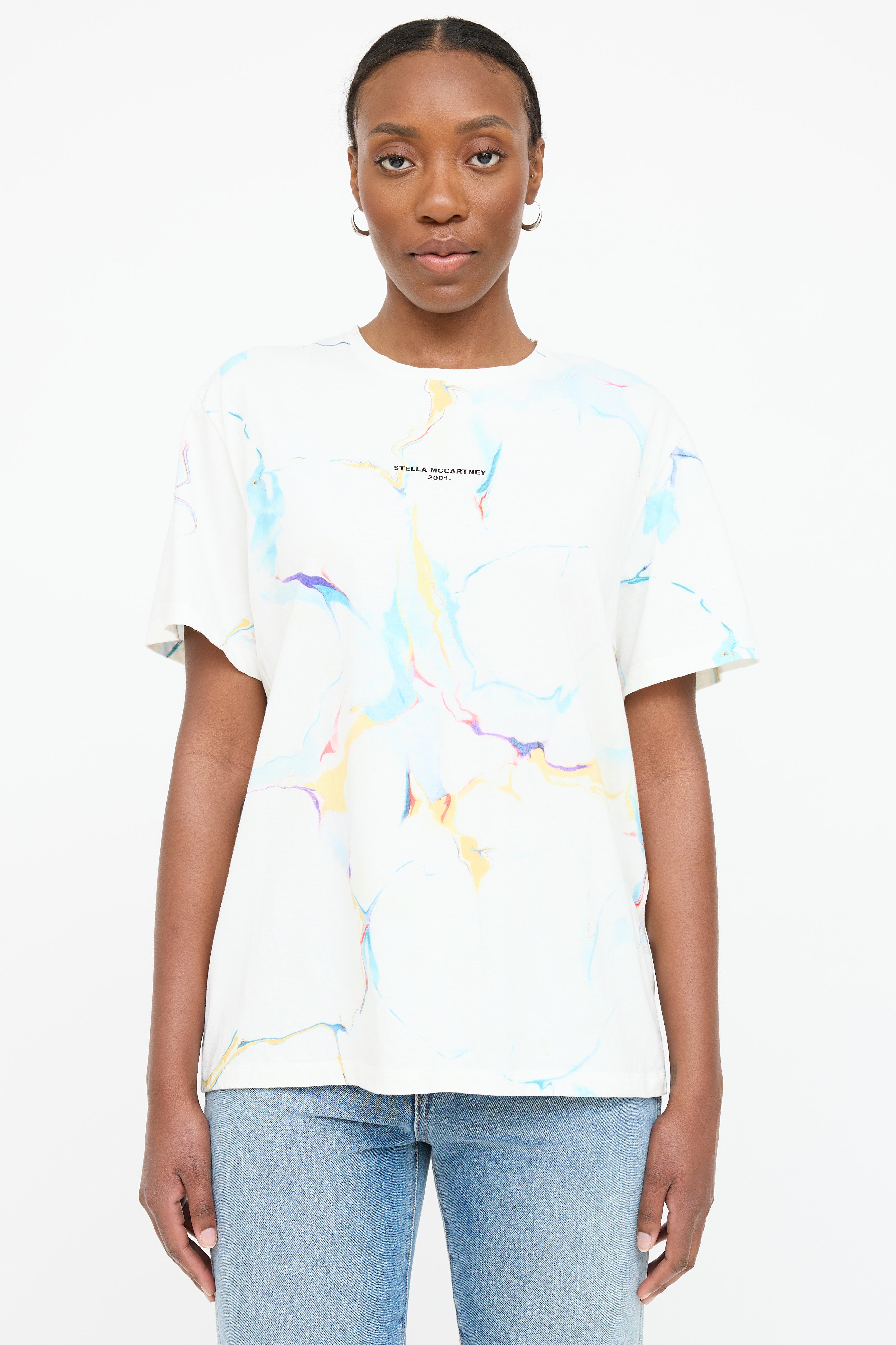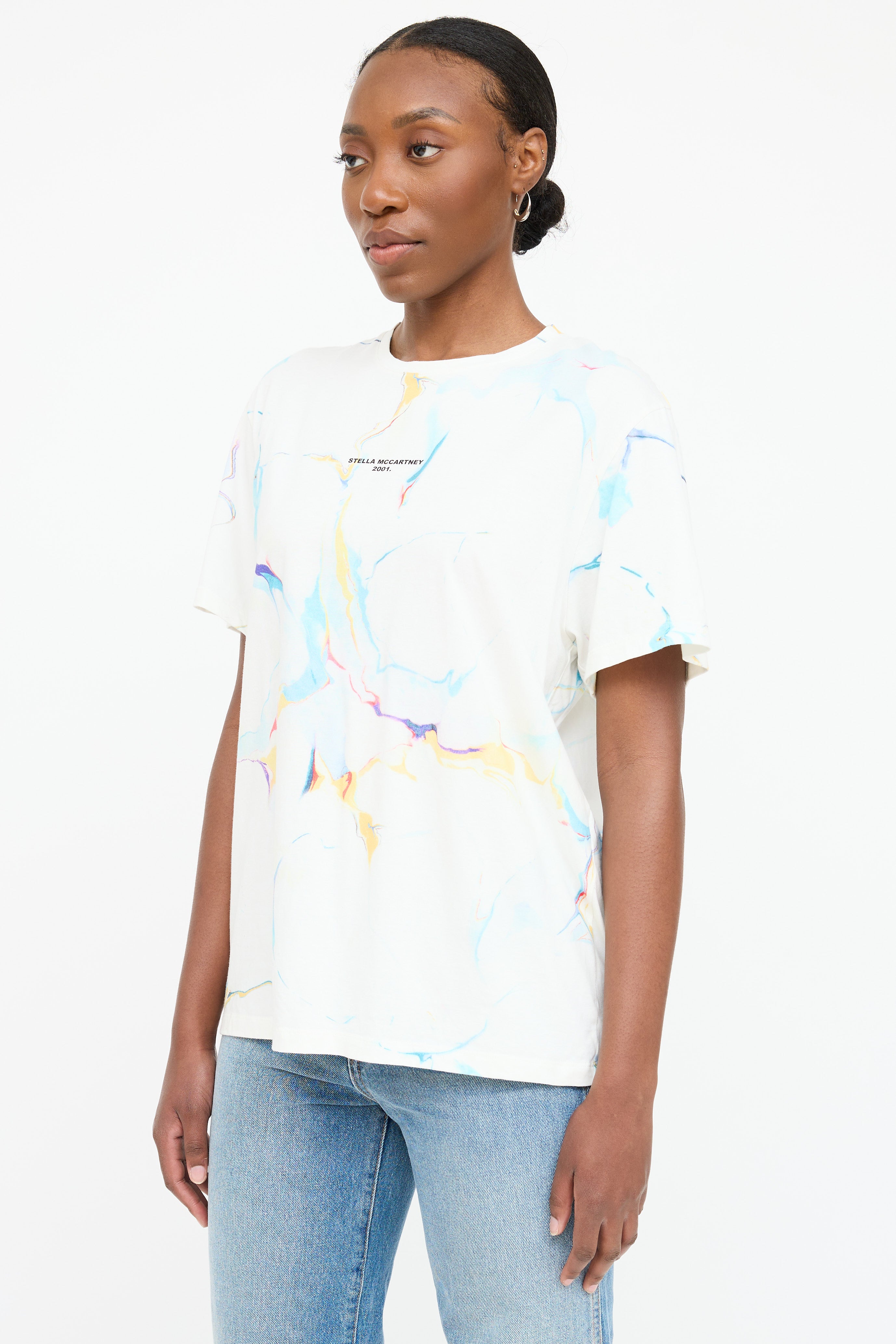 Pre-owned Stella McCartney white T-shirt featuring a multicolour marbled pattern throughout, round neckline, black printed 2001 logo at chest, and short sleeves.