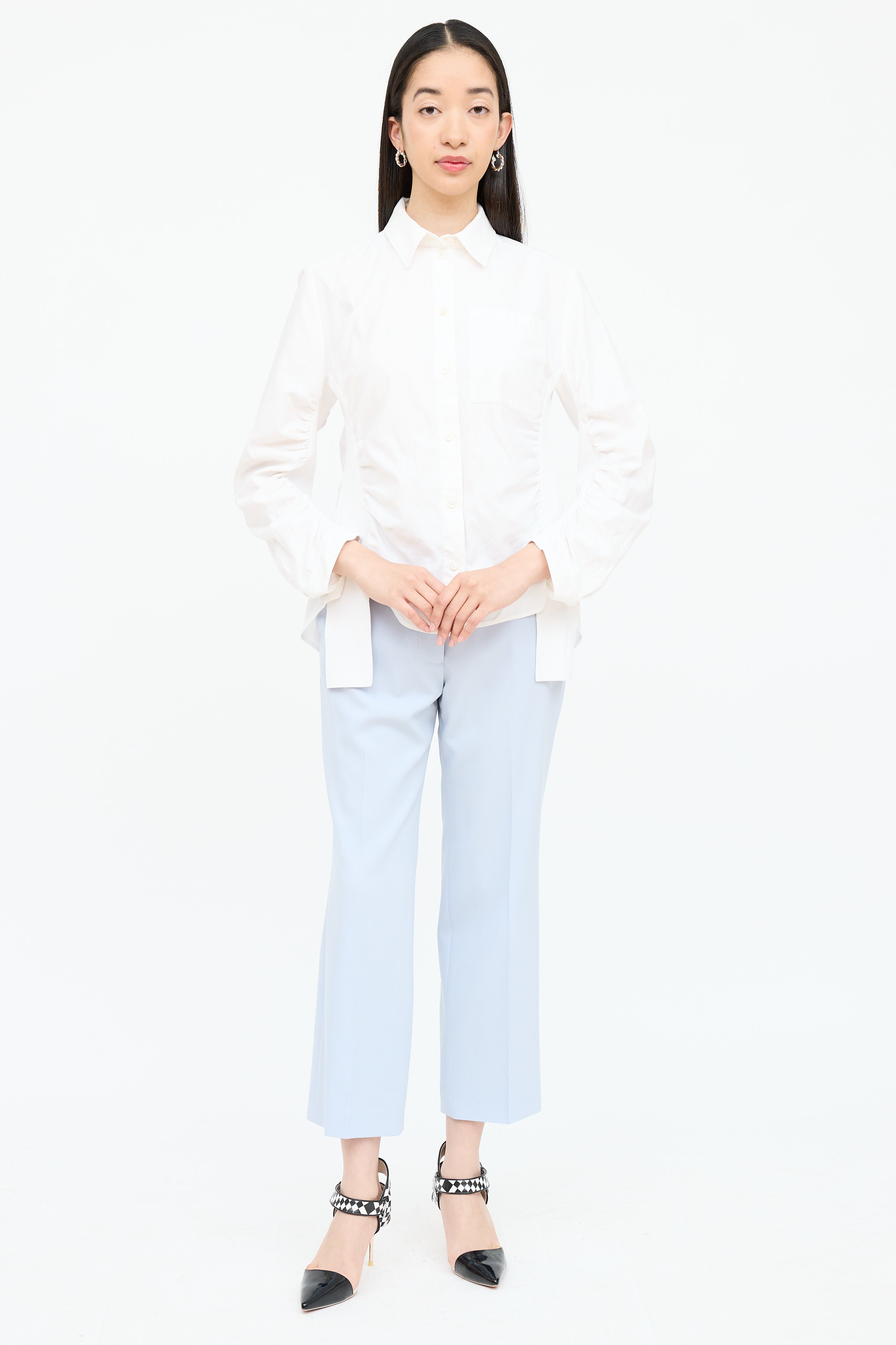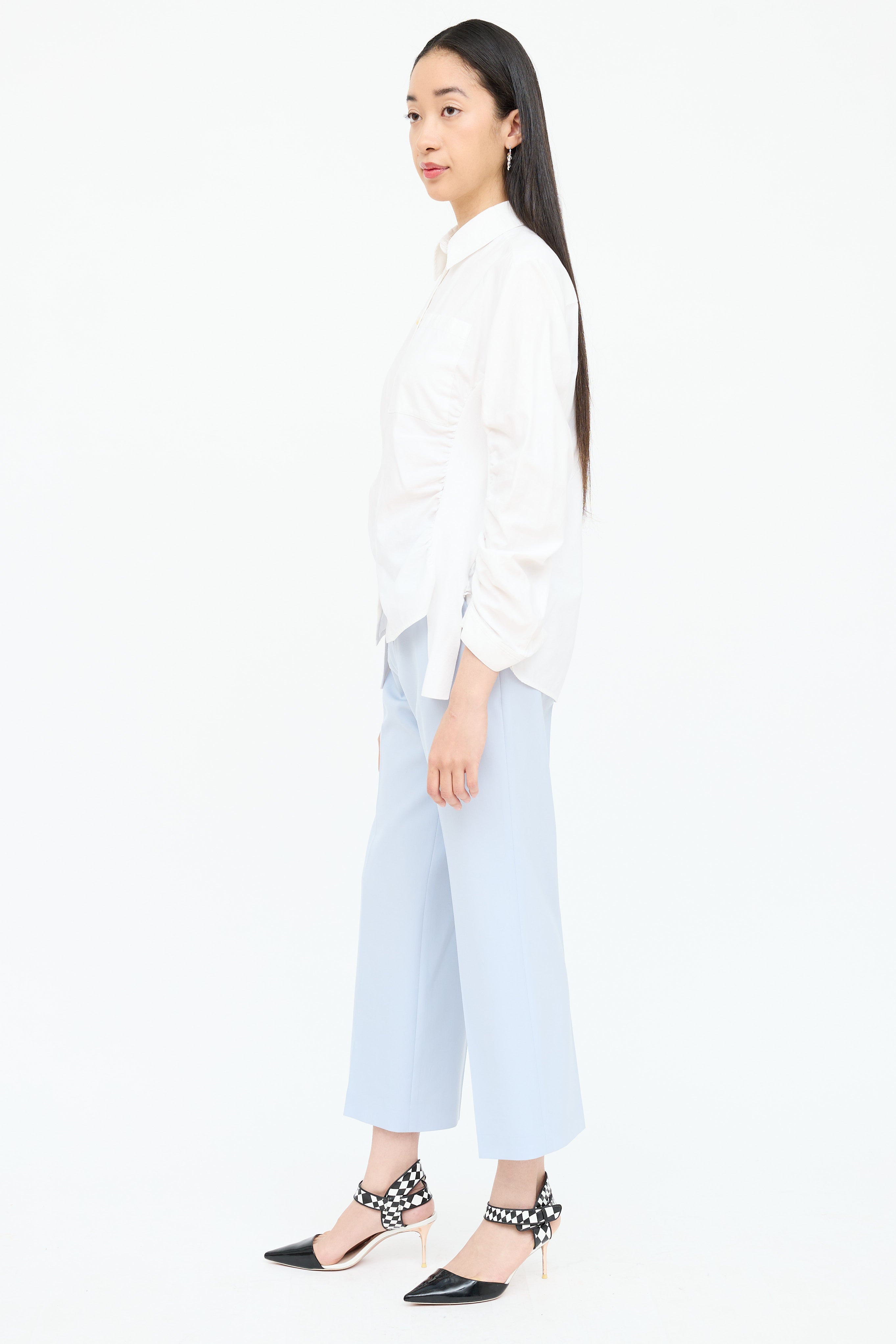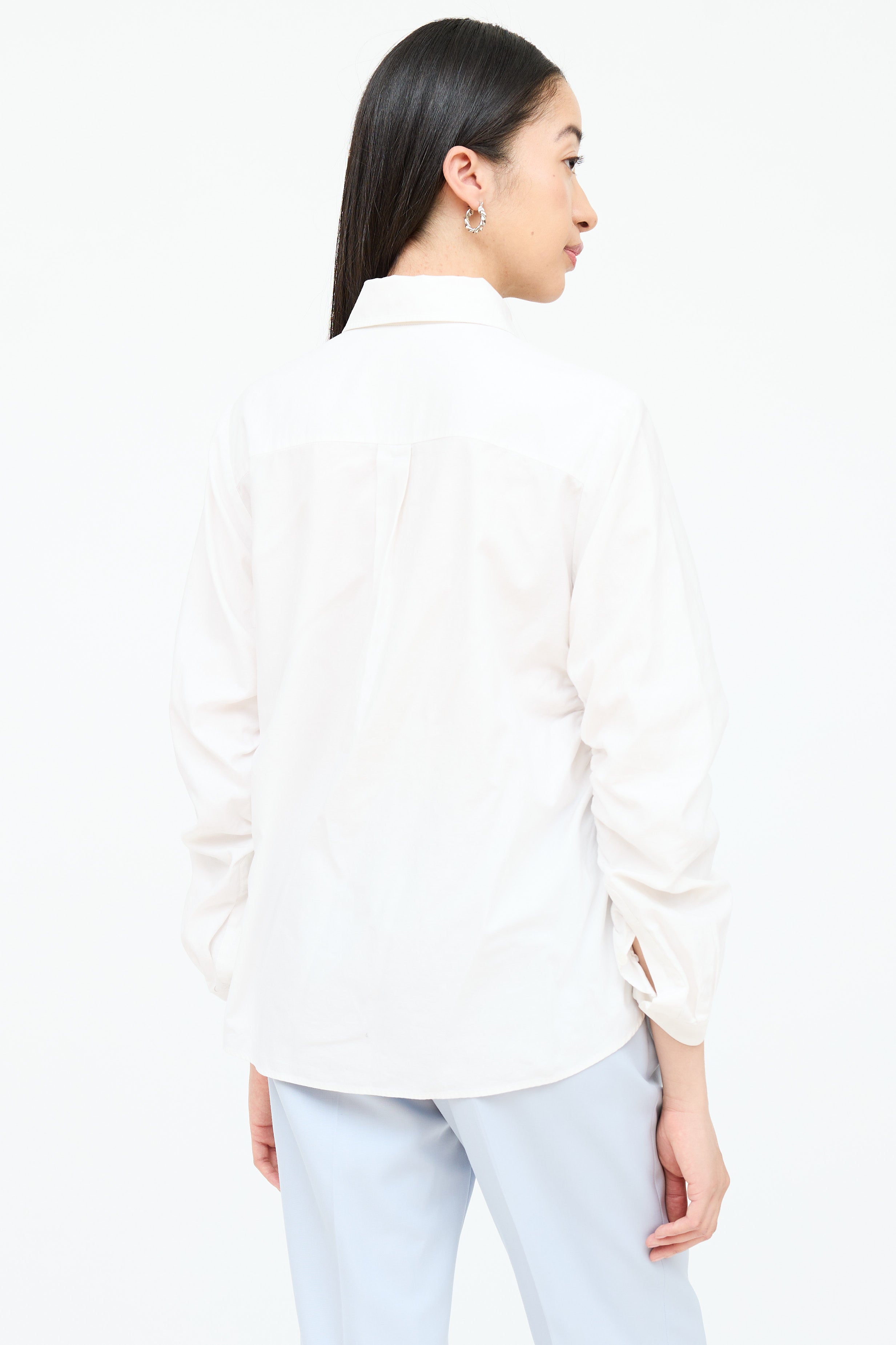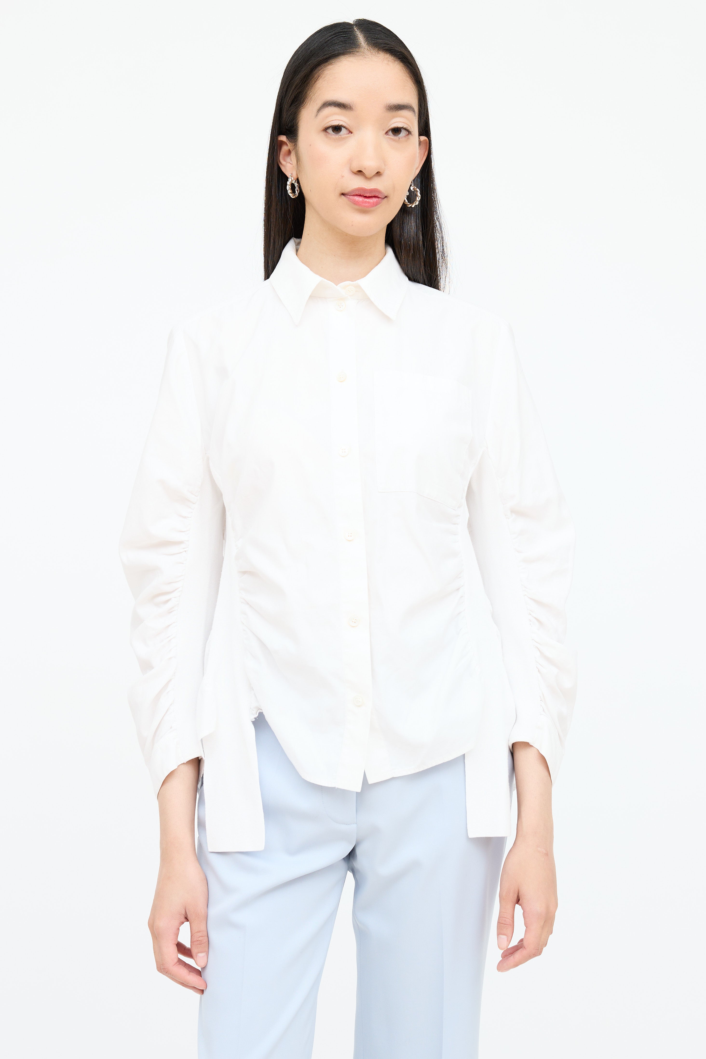 Pre-owned Stella McCartney white button up shirt featuring pointed collar, single slip pocket at chest, extended knit ribbed panels at sleeves and sides with ruching, button up closure and hi-lo hemline.