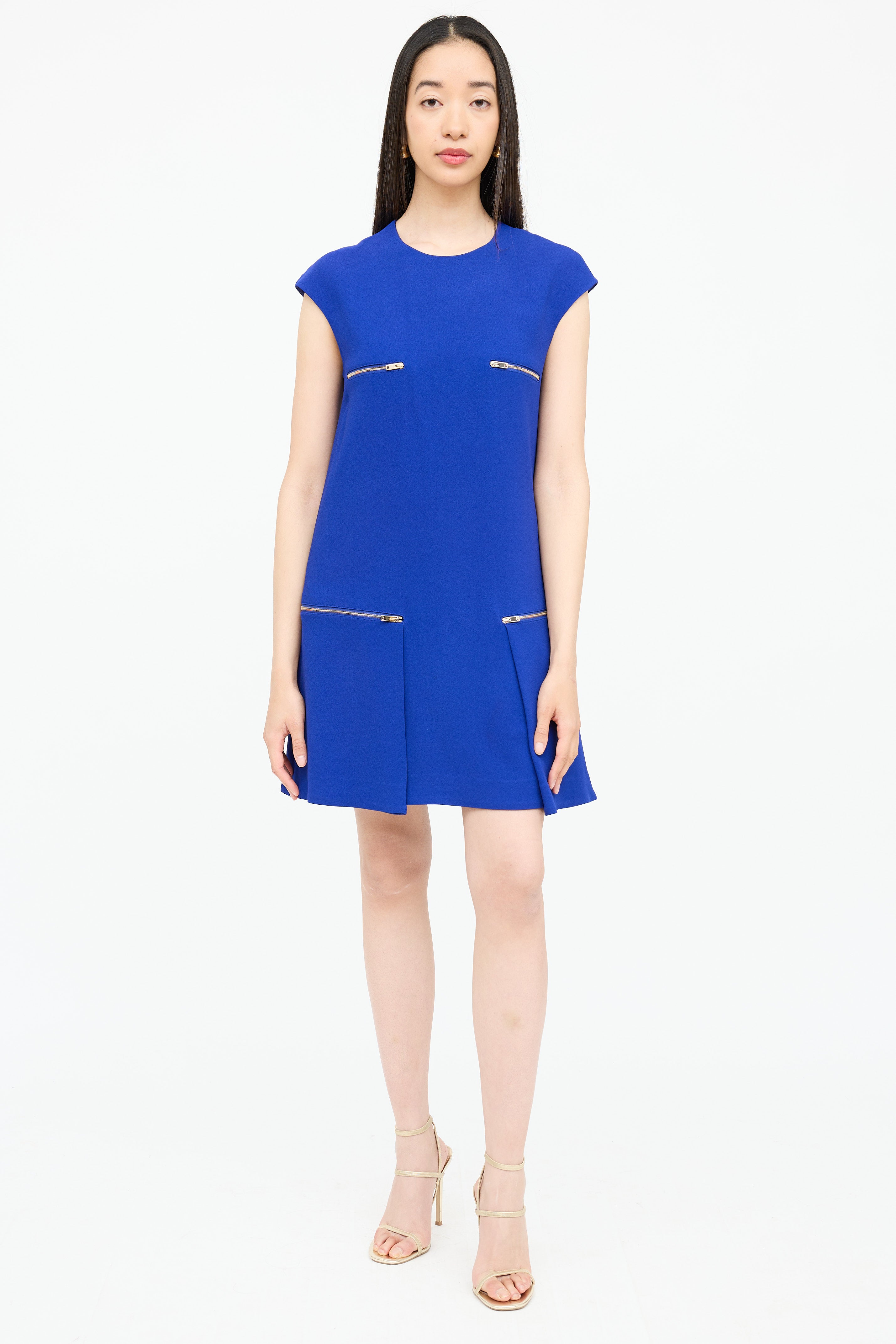 Pre-owned Stella McCartney blue zip panel dress featuring a rounded neck, cap sleeves, shift silhouette, two faux zip pockets at chest, two zip pockets at waist with pleated paneling and concealed zip closure at back. Fully lined.