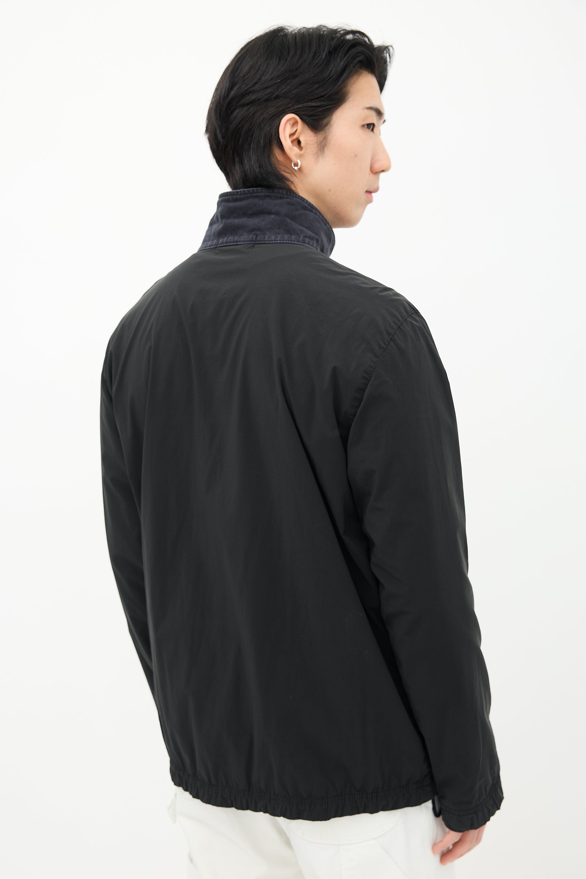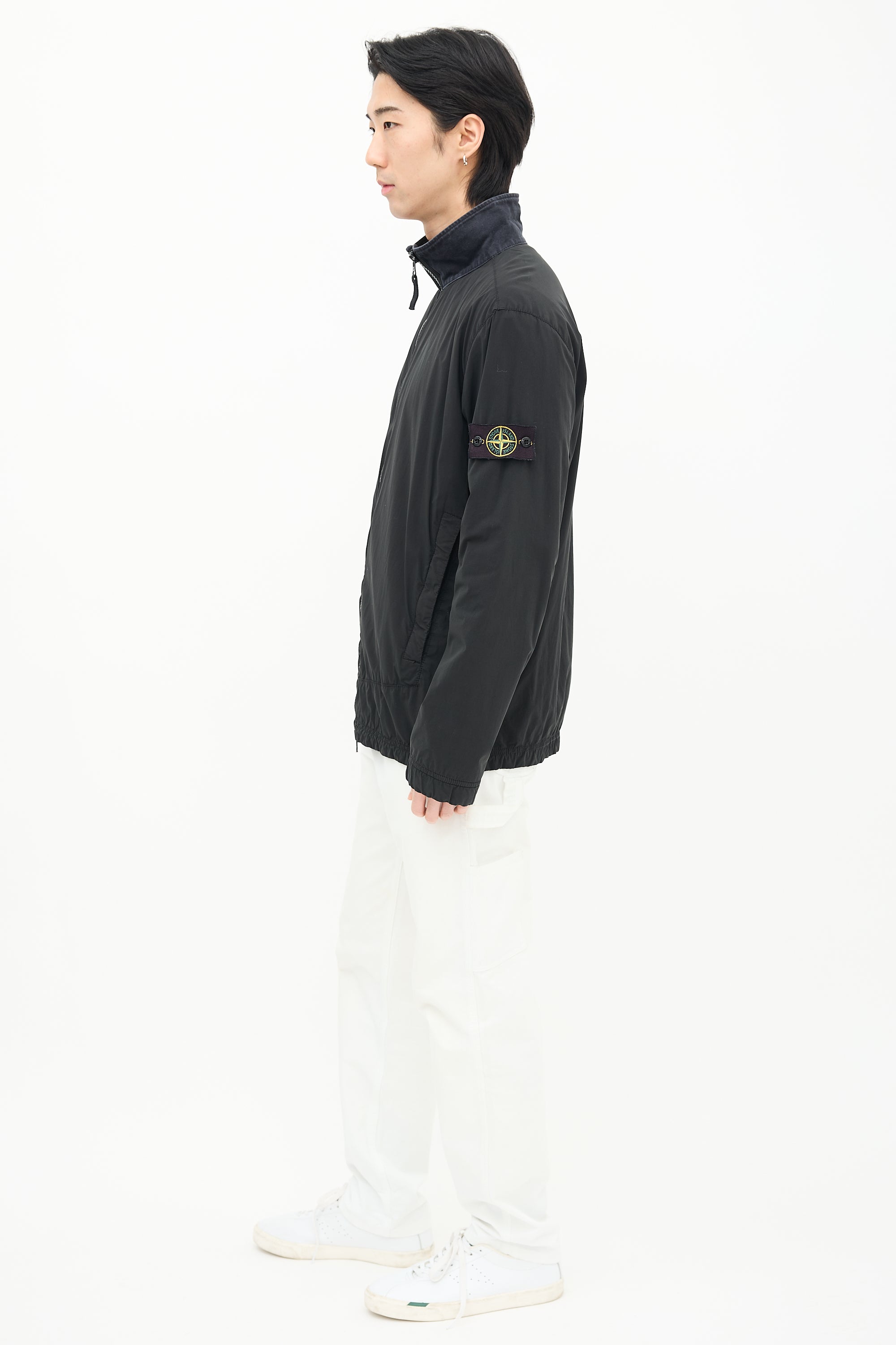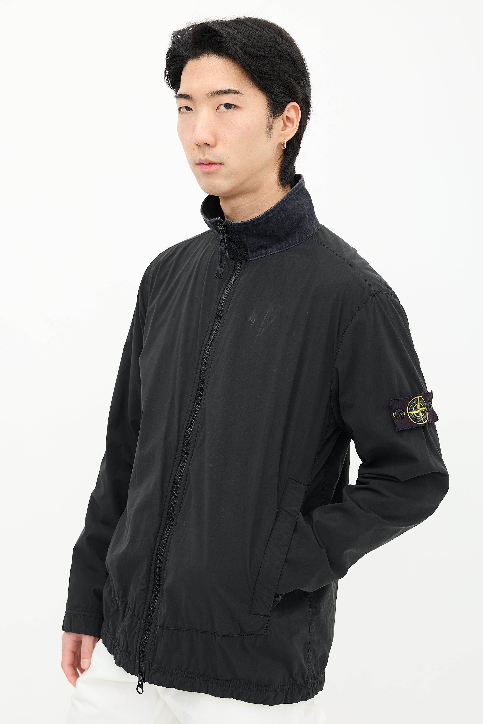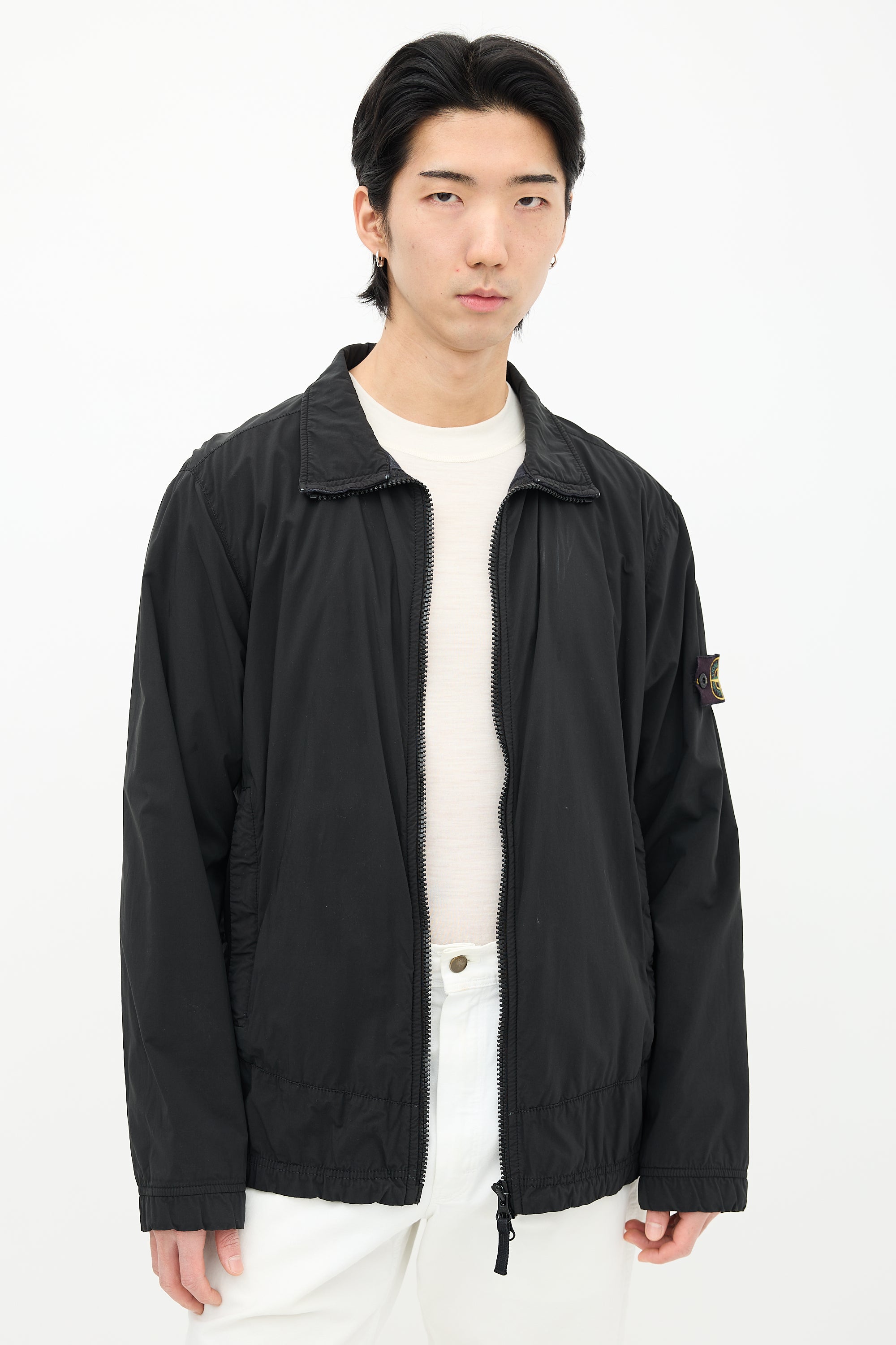 Pre-owned Stone Island black nylon jacket featuring convertible collar, zip up front, signature detachable embroidered logo patch at shoulder, two zip pockets at waist, elasticized button strap at inner cuff, and drawstring hem. Lined.