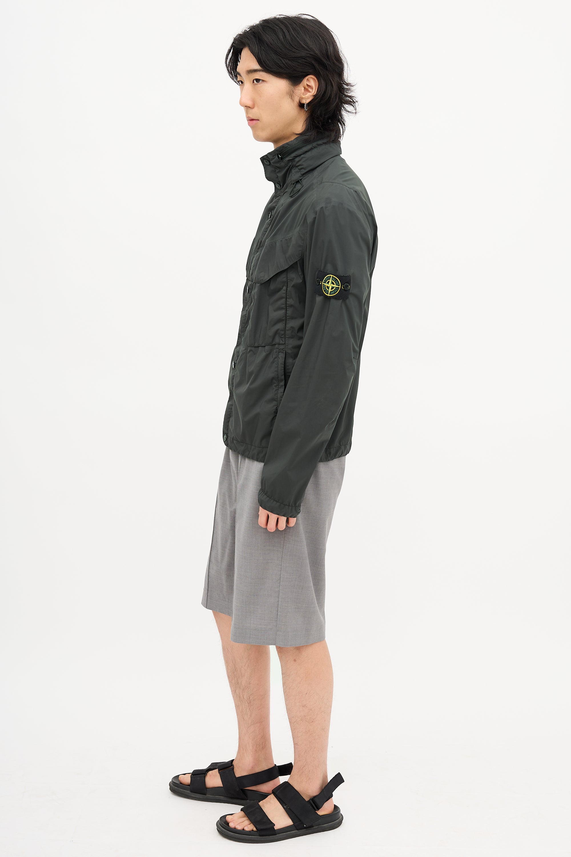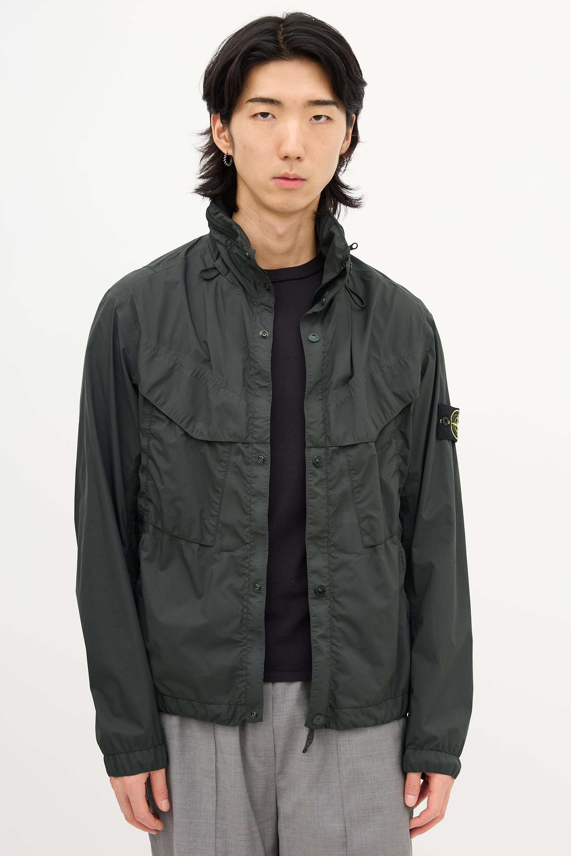Pre-owned Stone Island black nylon jacket featuring stand collar with packable hood, zip front, snap button placket, four front pockets, drawcord hem, underarm vents, removable signature logo patch at left arm, and snap buttoned cuffs.