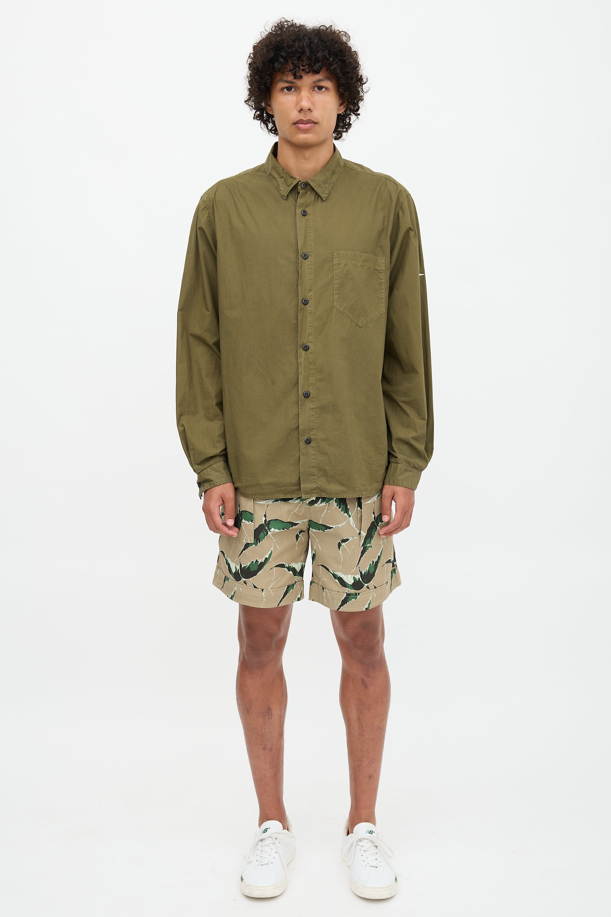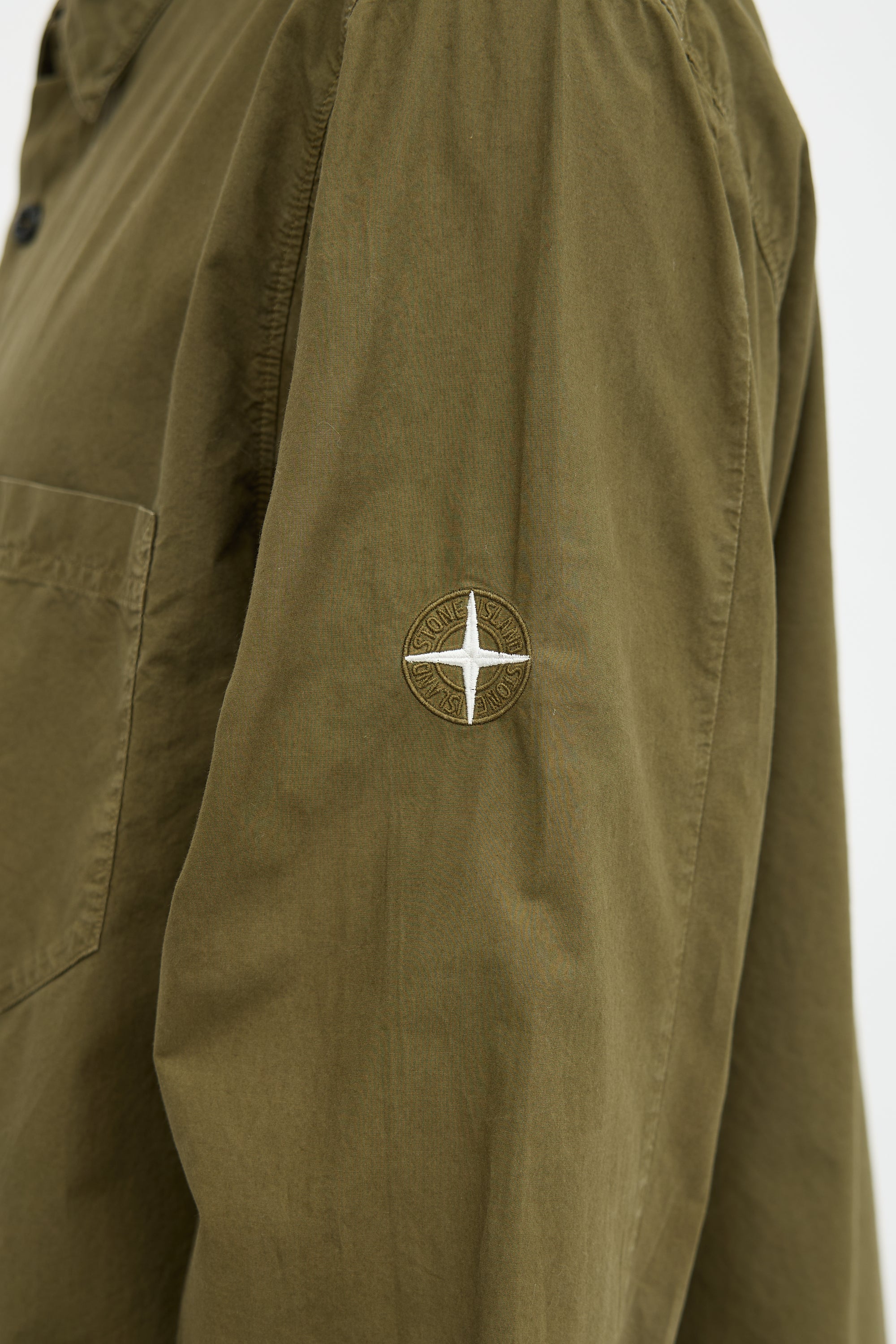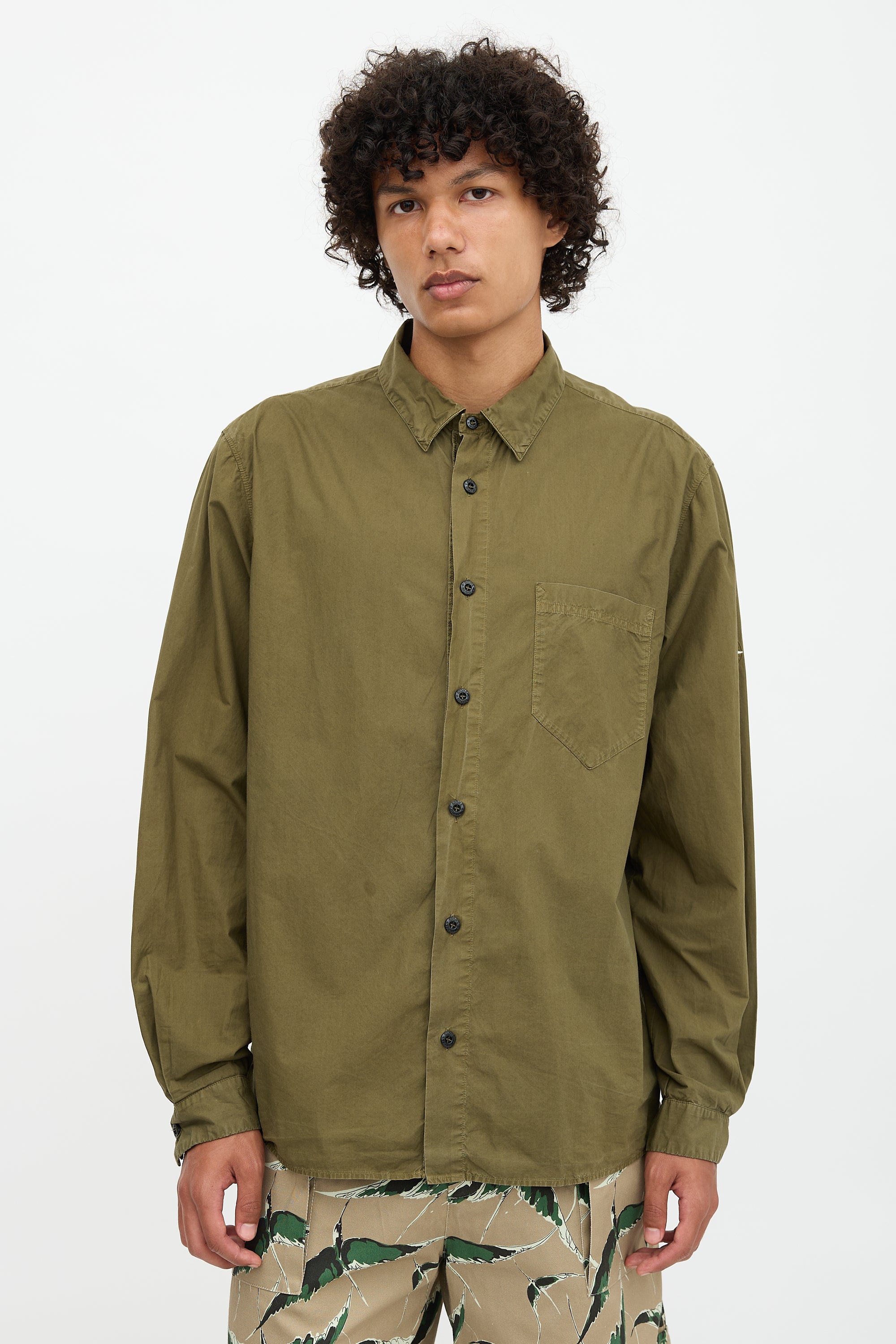 Pre-owned Stone Island green shirt featuring straight collar, button up front, patch pocket at left chest, embroidered logo at left arm, and buttoned cuffs.