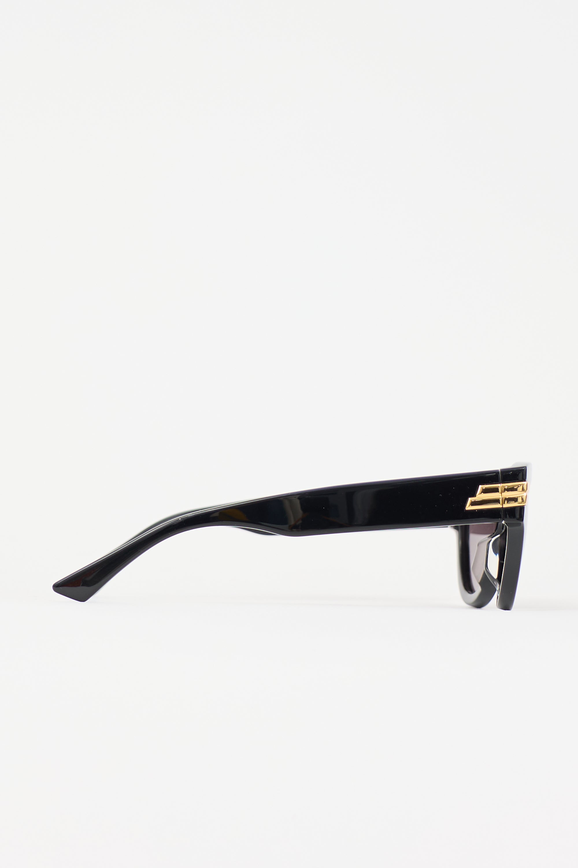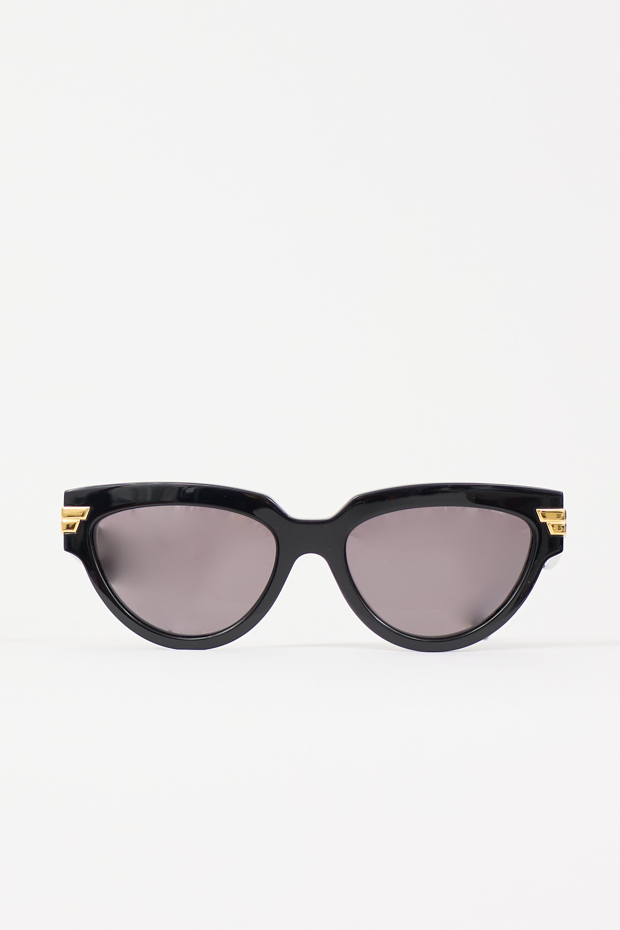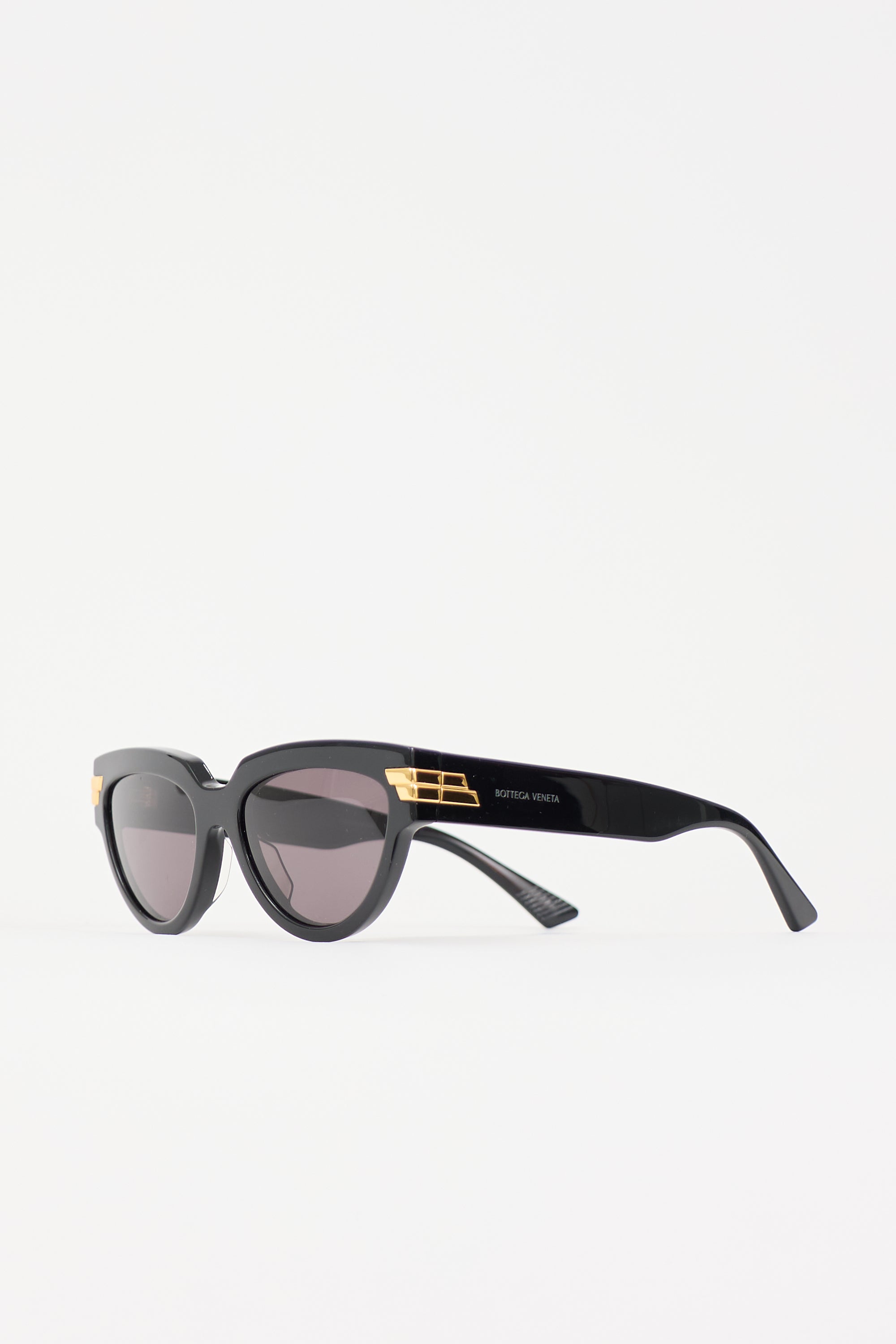 Pre-owned Bottega Veneta black BV1035S sunglasses featuring cateye frame, nose saddle bridge, and gold tone metal accent. Includes original box and case.