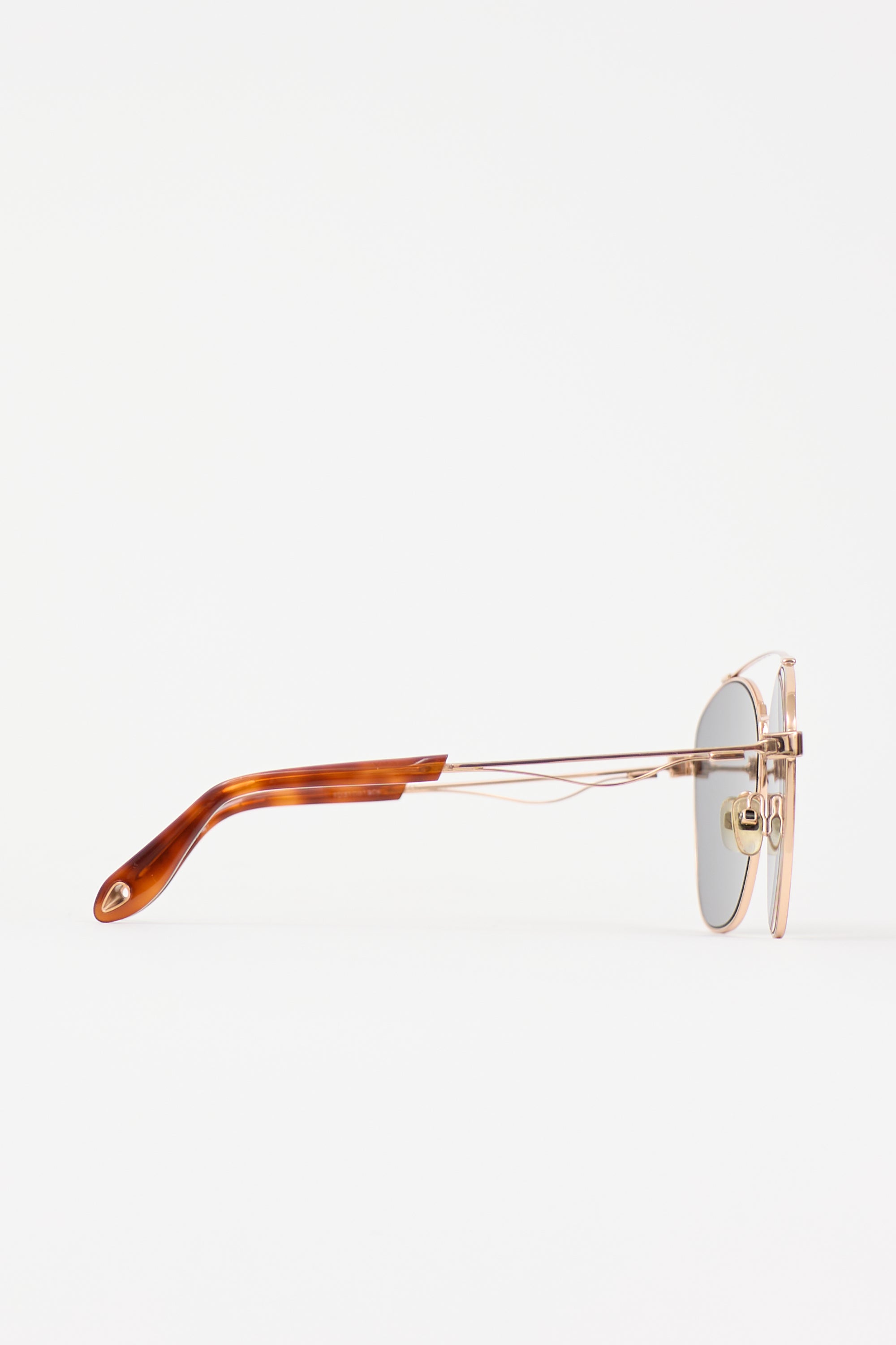 Pre-owned Givenchy DDBEL sunglasses featuring gold tone aviator frame, black tinted lens, nose pads, and tortoise shell temple tips. Includes original case.